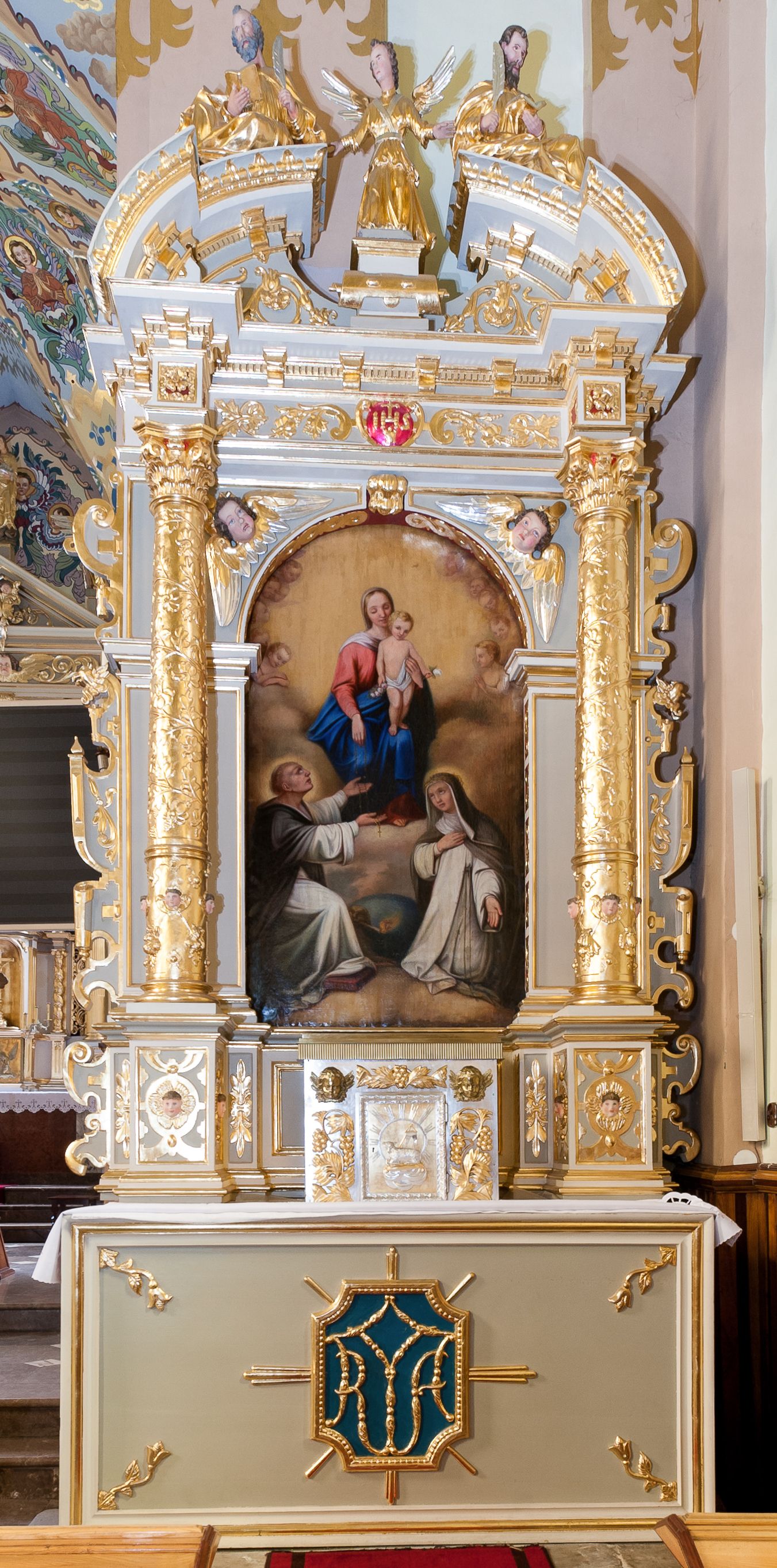 Ołtarz architektoniczny, jednoosiowy, jednokondygnacyjny ze zwieńczeniem. Antepedium z prostokątną ramą o ćwierćkoliście wyciętych narożach z promienimi i monogramem MARIA. Na mensie prostopadłościenne tabernakulum z drzwiczkami wypełnionymi płaskorzeźbionym barankiem apokaliptycznym. Wokół drzwiczek winna latorośl a w narożach uskrzydlone główki aniołków. Kompozycja nastawy wykorzystuje schemat łuku triumfalnego z arkadą zamknietą półkoliście flankowaną kolumnami stojącymi na postumentach, z kompozytowymi kapitelami dźwigającymi belkowanie. Nad belkowaniem przerwany i wyłamujący się ponad kolumnami, segmentowy przyczółek. W arkadzie obraz z Matką Boską Różąńcową ze św. Katarzyną Sieneńską i św. Dominikiem. Na zwieńczeniu dwie siedzące figury Ewangelistów (?), brodatych, ubranych w długie suknie i płaszcze, z otwartą księgą i piórem w dłoniach. W partii przerwanego przyczółka stoi na postumencie anioł z rozwartymi rękami, ubrany w długą suknię, z rozpostartymi skrzydłami.