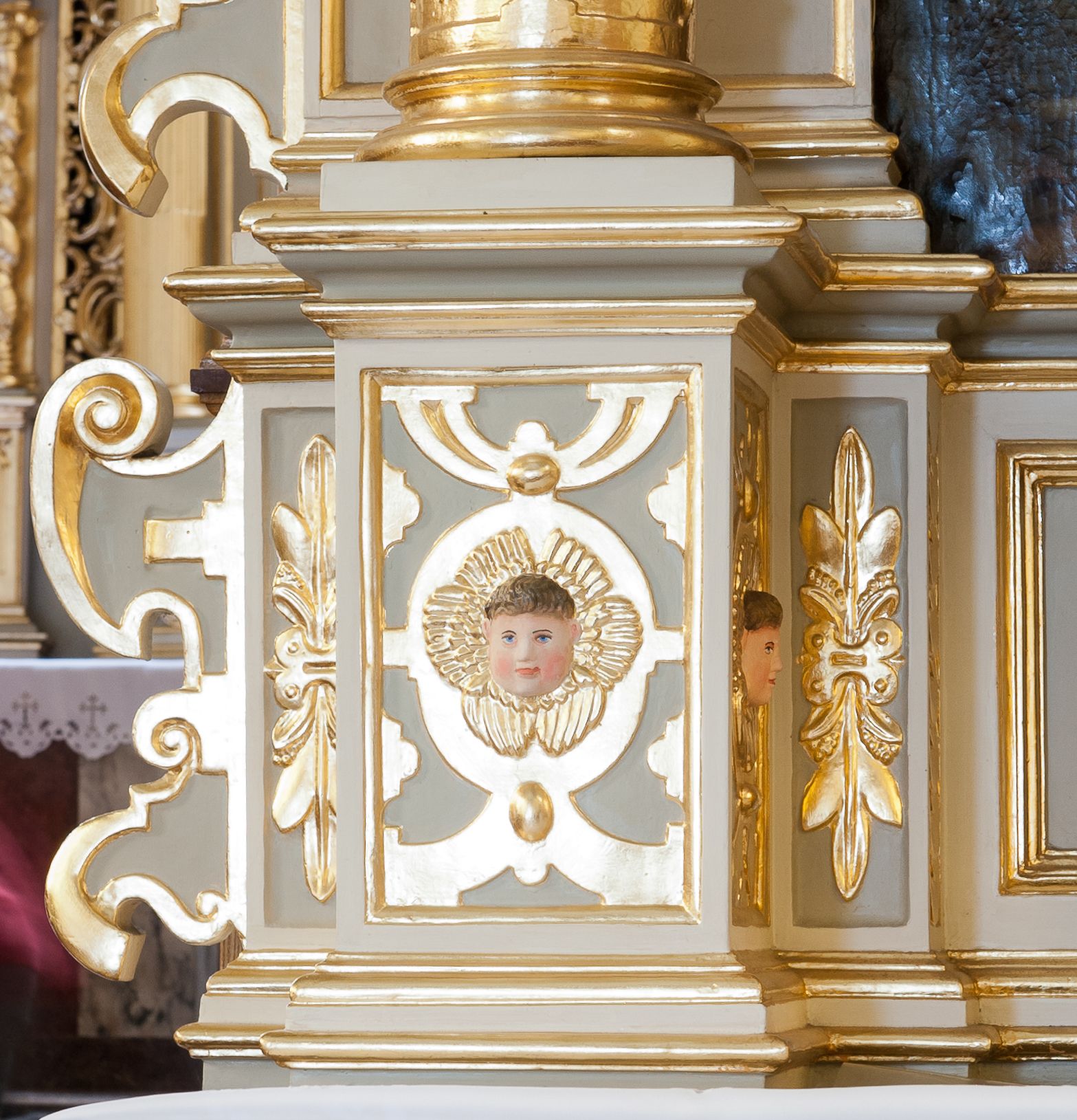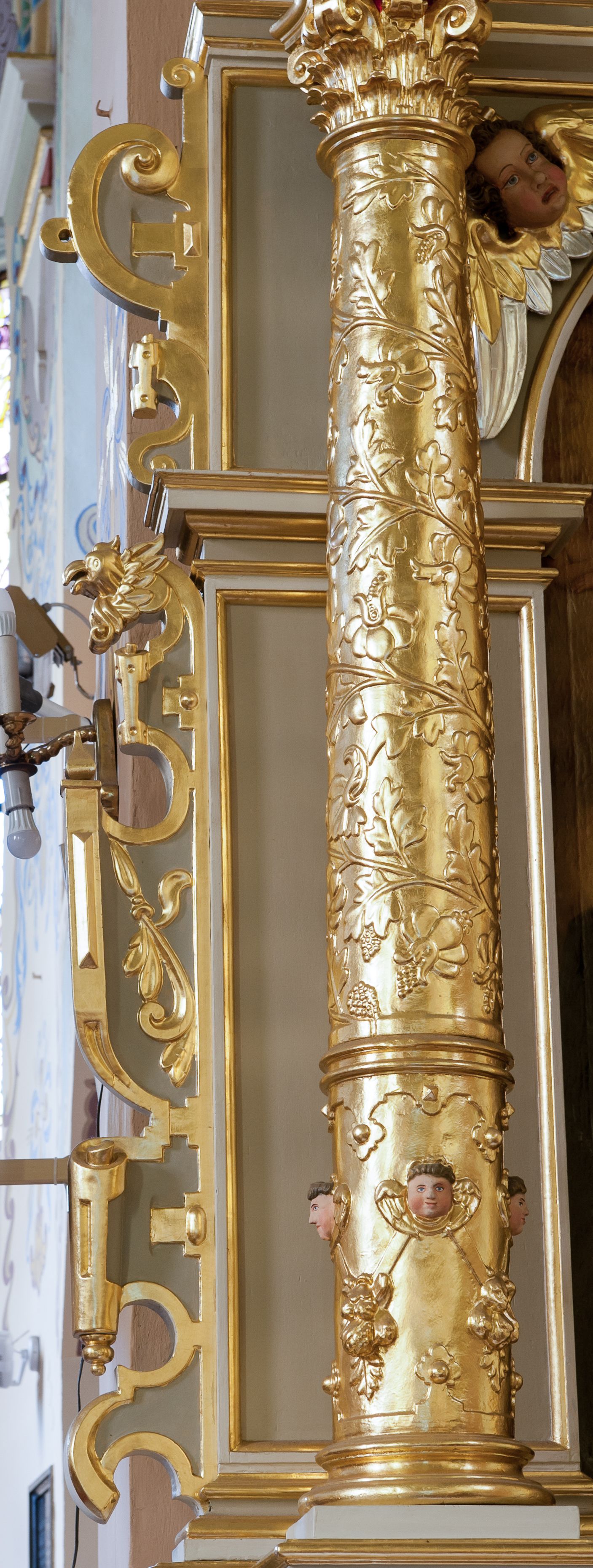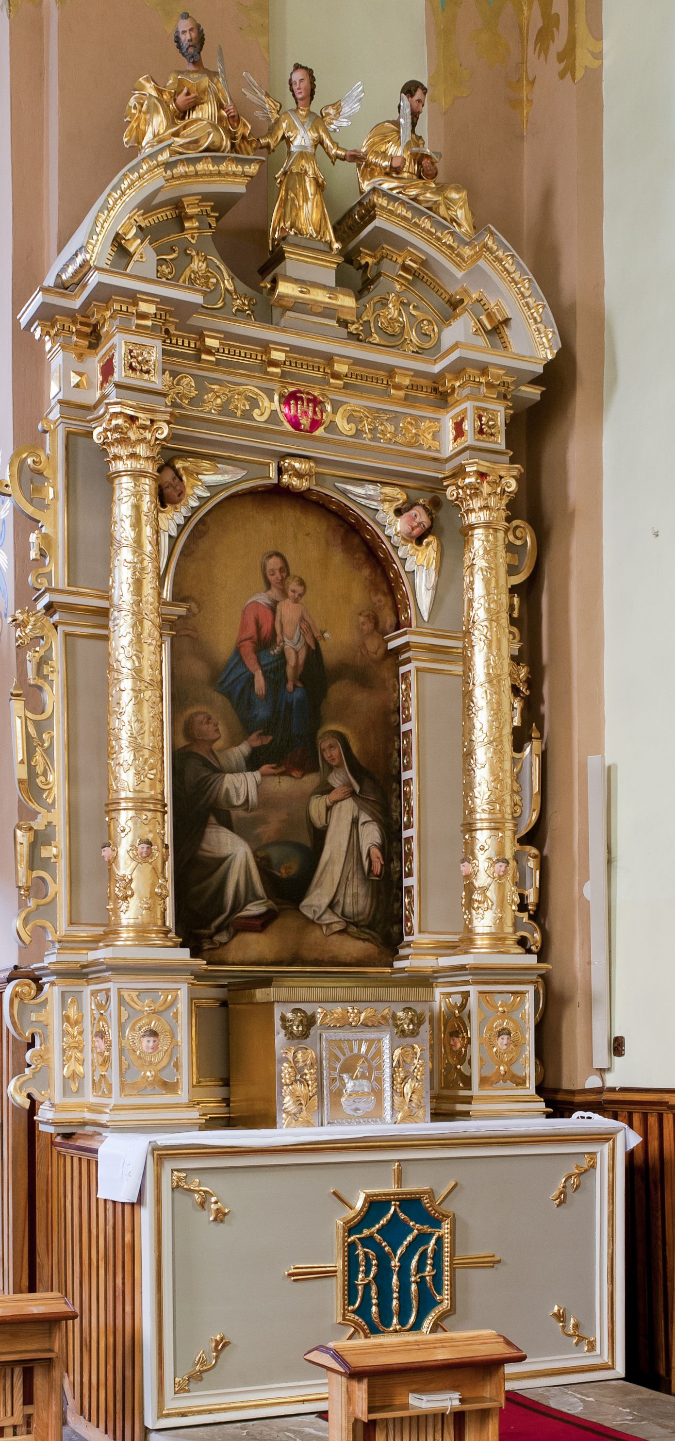 Cokoły zdobią motywy okuciowe z główkami aniołów. Kolumny w jednej trzeciej ujęte profilowaniem, w dolnej pokryte są okuciowymi taśmami i główkami aniołków, a w górnej wijącą się spiralnie wicią roślinną. Boki nastawy ujmują uszy utworzone z zawijających się taśm. Nad niszą z obrazem główki aniołków. Profile belkowania ozdobione konsolkami i kostkowaniem a fryz wicią roślinną i medalionem z literami IHS. Podobne ornamenty w partii przyczółka. Kolorystyka ołtarza jest szara, kolumny, profile, złocone i srebrzone, twarze aniołków i postaci w zwieńczeniu polichromowane naturalistycznie.