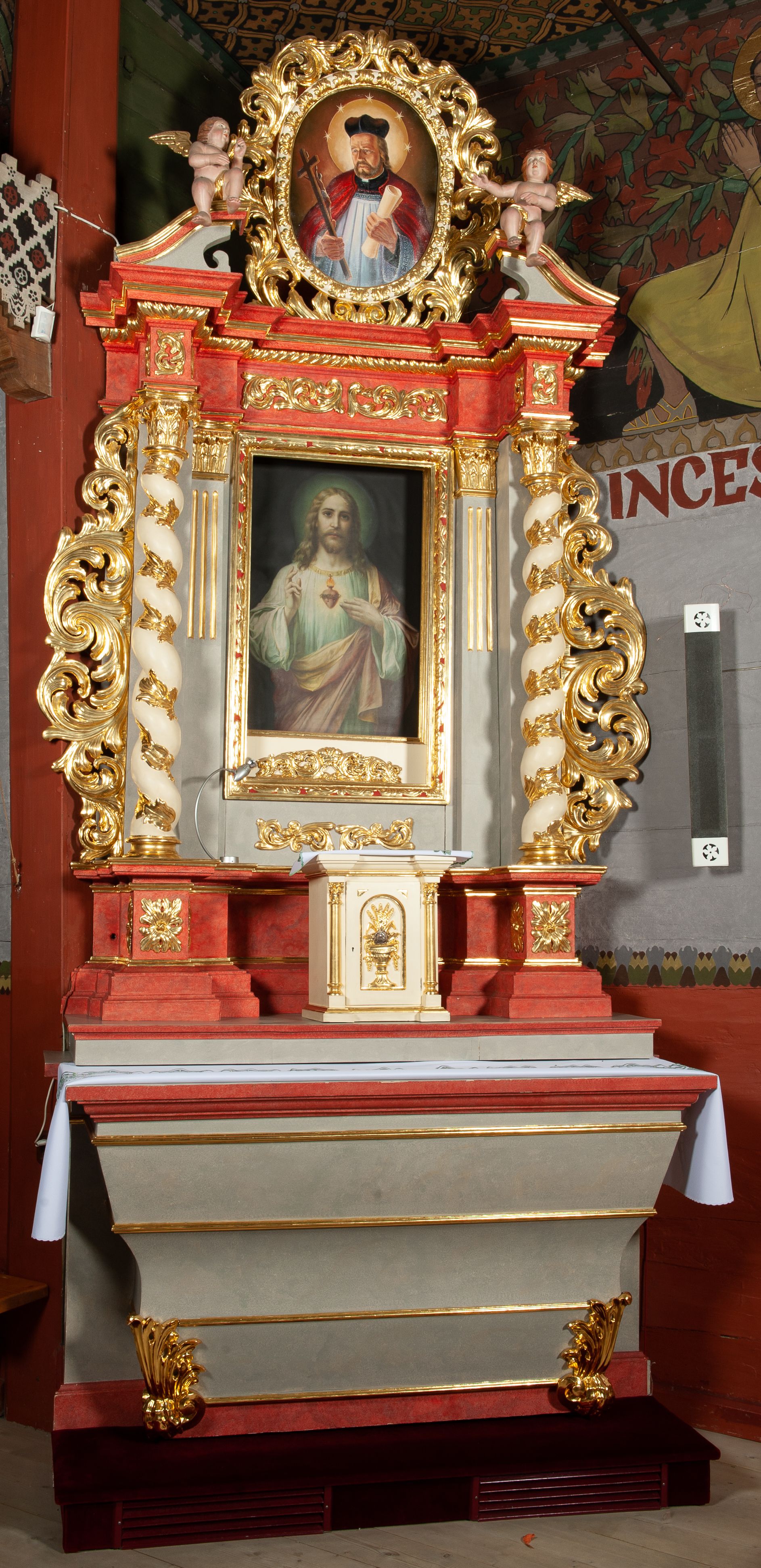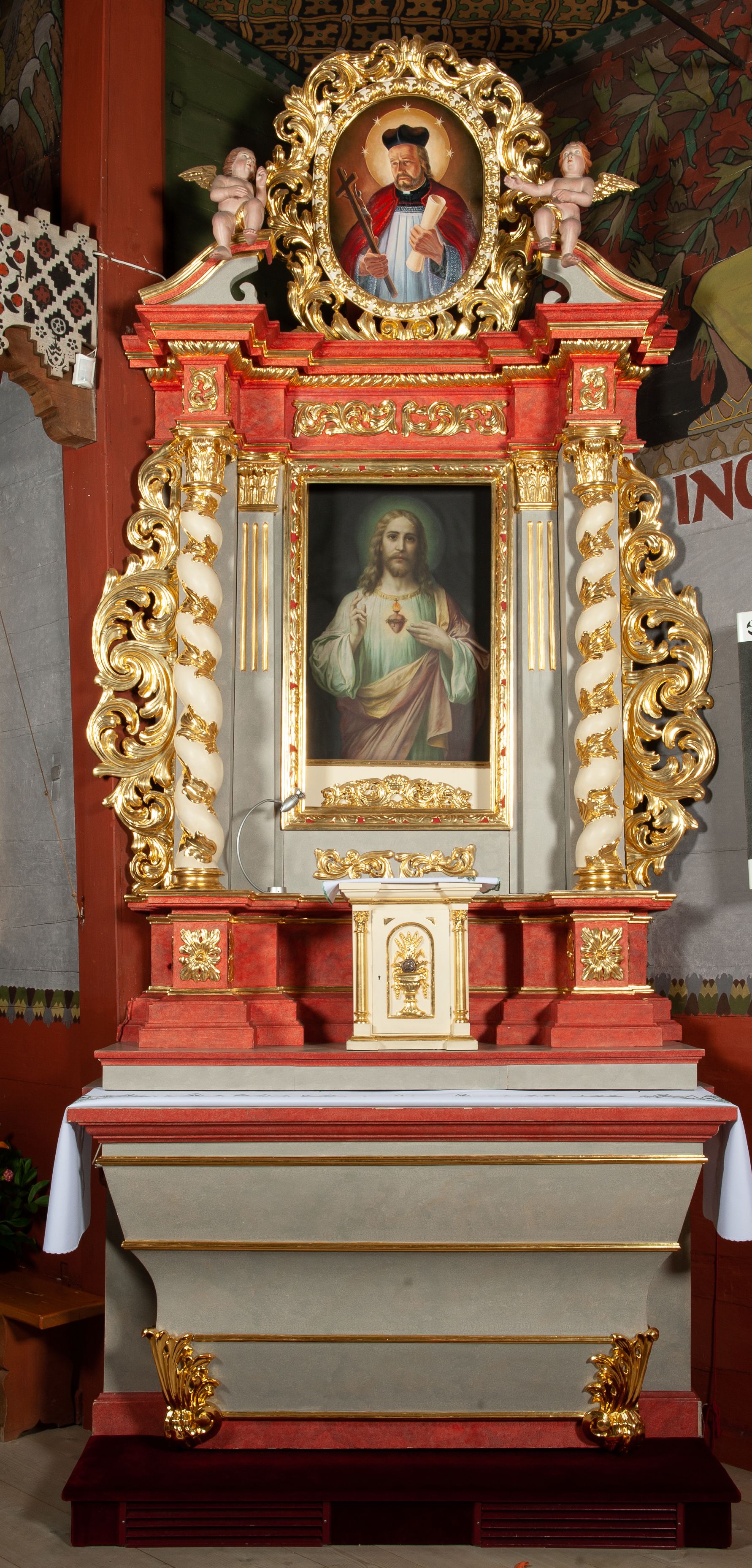 Ołtarz architektoniczny, jednokondygnacyjny, jednoosiowy, ze zwieńczeniem i drewnianą, sarkofagową mensą z kamiennym portatylem. Na mensie ołtarza kremowe tabernakulum w formie prostopadłościennej szafki, ujęte parą korynckich, złoconych półkolumienek, stojących na wyłamującym się, zdwojonym cokoliku, wspierających silnie wysunięty gzyms wieńczący. Drzwiczki w kształcie stojącego prostokąta, z prostokątną płyciną zwieńczoną łukiem półkolistym, zdobioną płaskorzeźbionym motywem kielicha, hostii, kłosów zboża i winnych gron. Retabulum na cokole, ujęte parą pilastrów korynckich, z kanelurowaniem do połowy trzonu i parą filarów na tle których ustawiona jest para kolumn akantowych o spiralnie skręconych trzonach. Podpory wspierają wyłamujące się ponad nimi belkowanie o wysuniętym gzymsie. Zwieńczenie w formie stojącego owalu ujętego ażurową, akantową ramą, flankowane przerwanym, wklęsło wypukłym przyczółkiem. Dolne naroża antepedium zdobione motywem lwiej łapy ujętej parą wolut, z liściem akantu w zwieńczeniu. Pola cokołu, dolna partia pola środkowego i pola wewnątrz wnęki oraz fryz retabulum zdobiony motywem wici akantowej. Na trzonach kolumn retabulum spiralnie oplatająca je wić roślinna. Część środkowa retabulum ujęta parą ażurowych, akantowych uszaków. Pole środkowe w formie wnęki w kształcie stojącego prostokąta z przedstawieniem Najświętszego Serca Jezusa (druk) i obrazem św. Józefa (XX w.) na zasuwie. W zwieńczeniu pole obrazowe w kształcie stojącego owalu z przedstawieniem św. Jana Nepomucena. Na gzymsie przyczółka para siedzących aniołków. Kolorystyka struktury ołtarza w odcieniach szarości i czerwieni; ornamentyka i fragmenty detali architektonicznych złocone.
