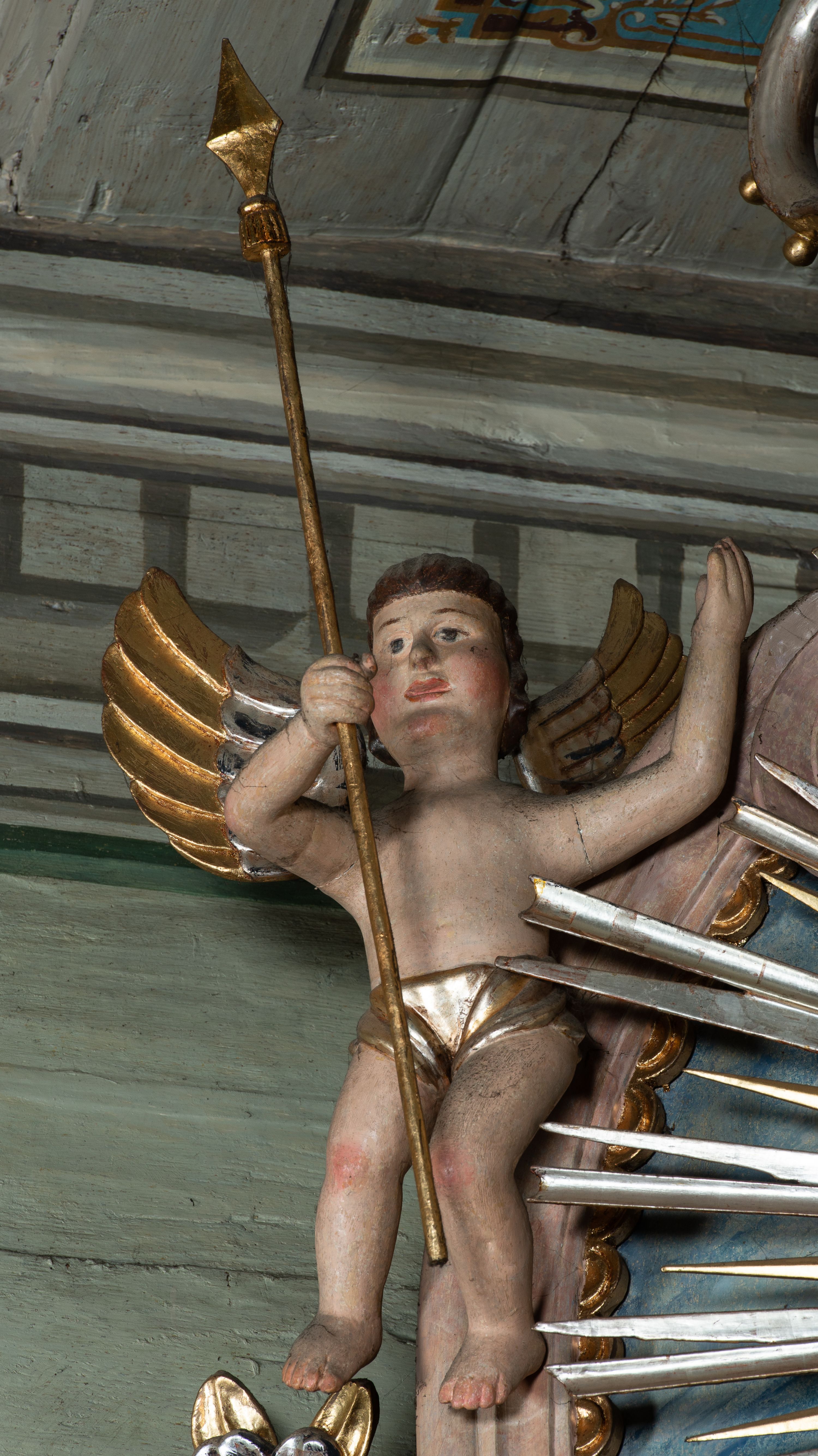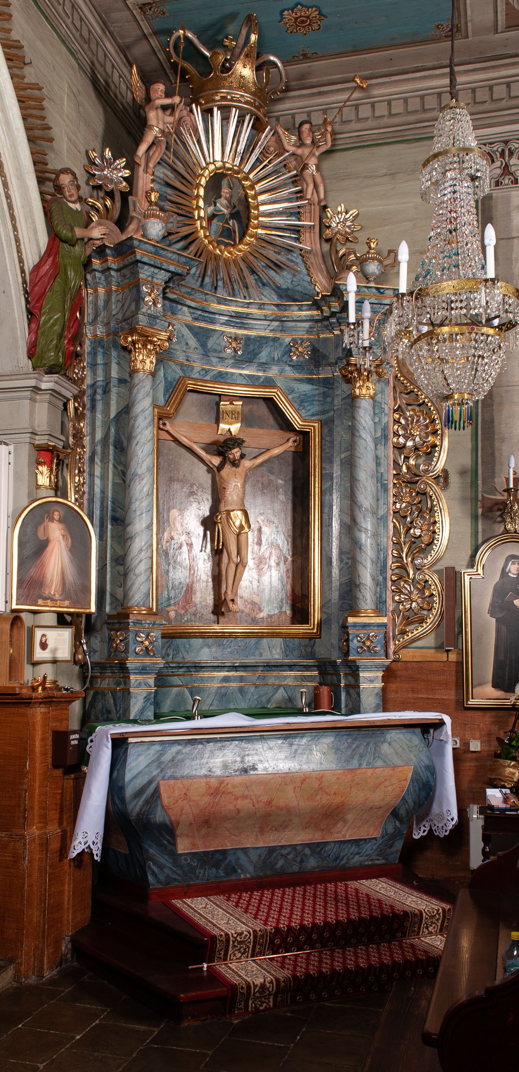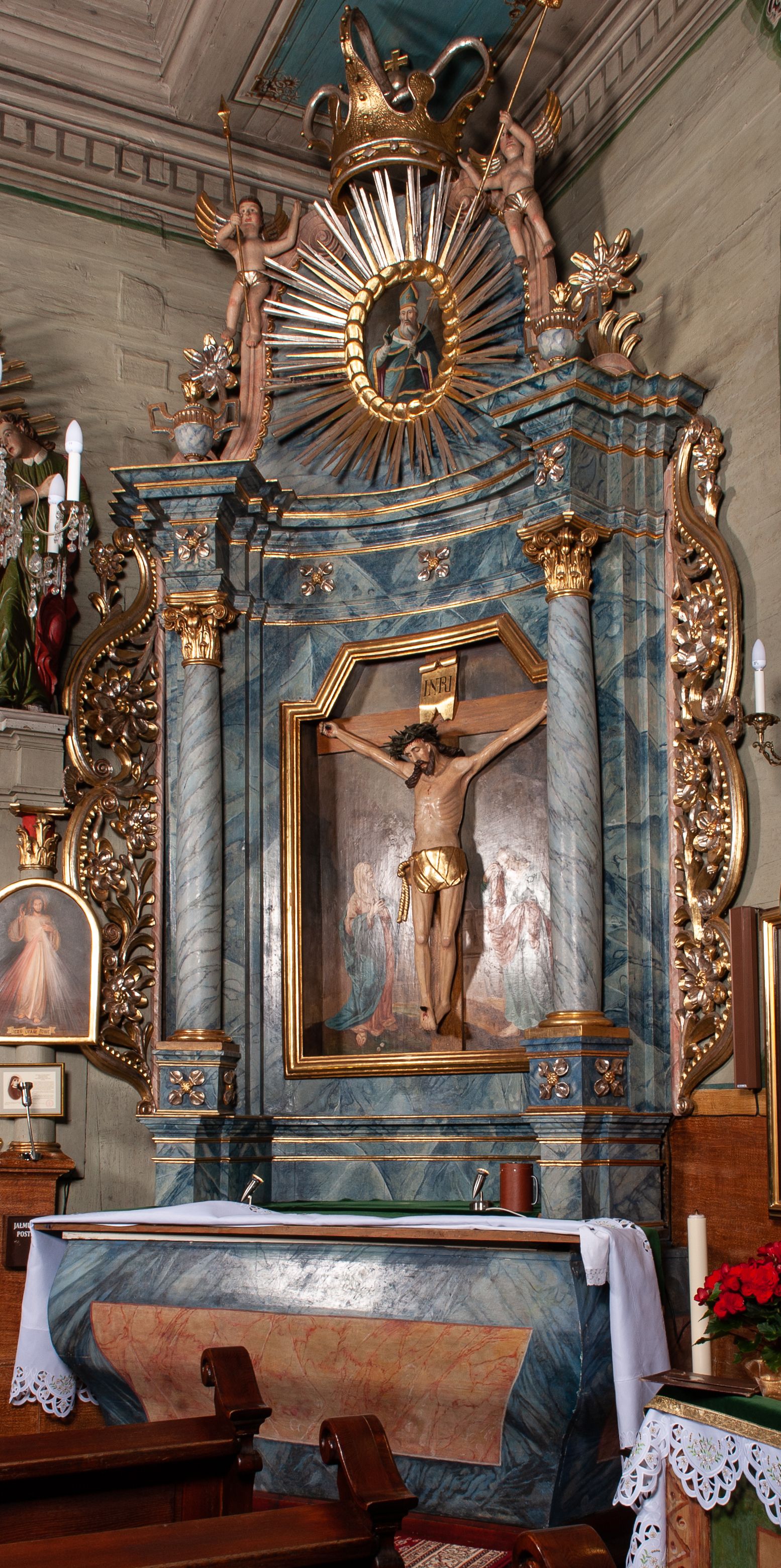 Boczny ołtarz ze sceną Ukrzyżowania powstał w pierwszej połowie XIX wieku i jest przykładem długiego trwania tradycji barokowej w sztuce prowincjonalnej. Jego strukturę uzupełniają elementy nawiązujące do sztuki klasycystycznej oraz ludowej.