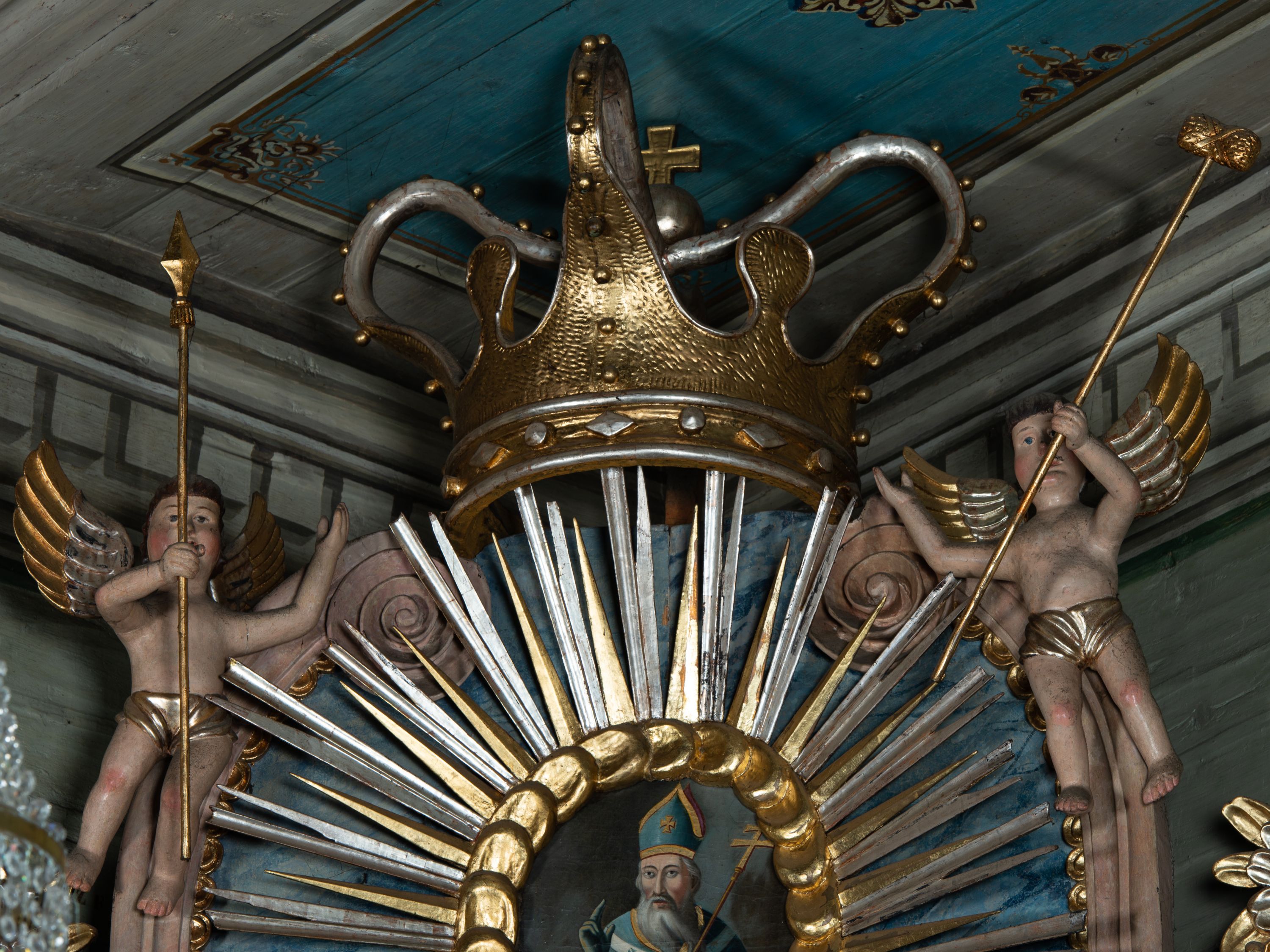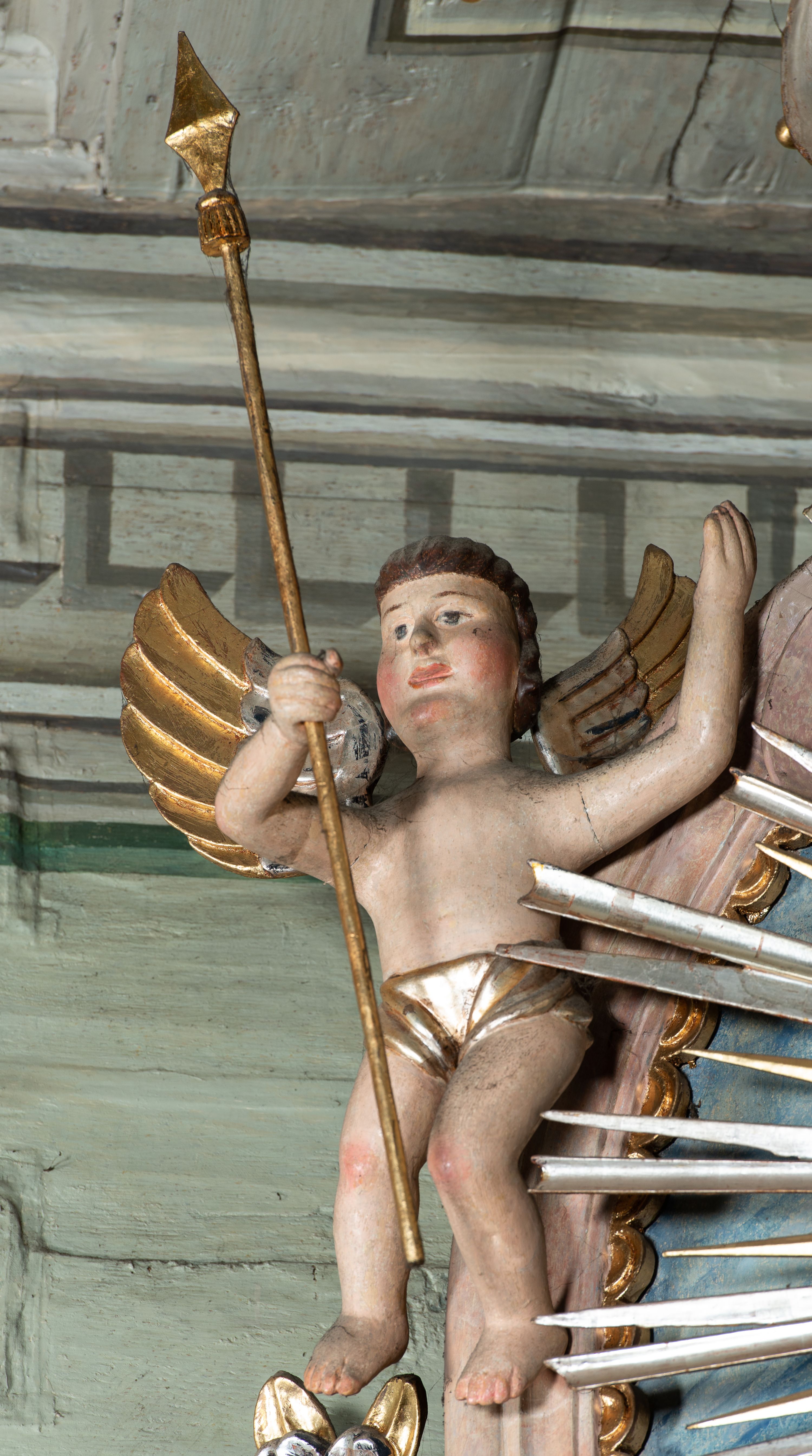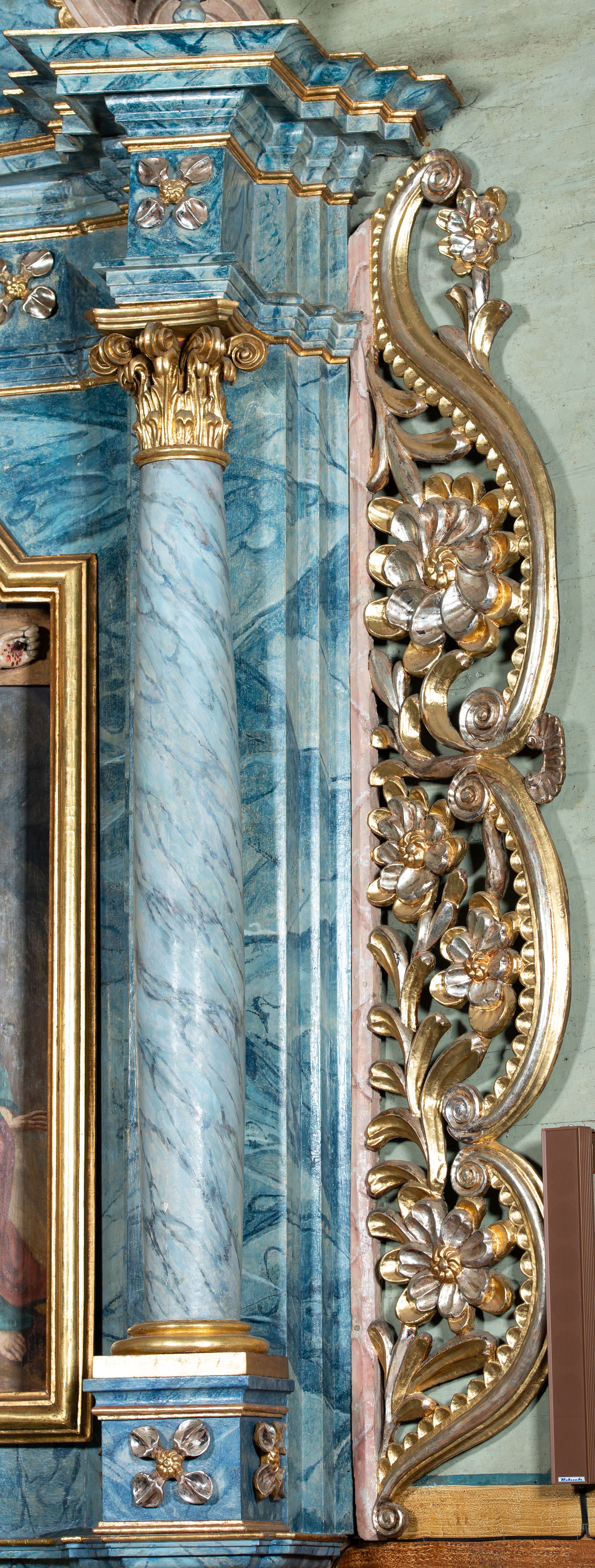 Boczny ołtarz ze sceną Ukrzyżowania powstał w pierwszej połowie XIX wieku i jest przykładem długiego trwania tradycji barokowej w sztuce prowincjonalnej. Jego strukturę uzupełniają elementy nawiązujące do sztuki klasycystycznej oraz ludowej.