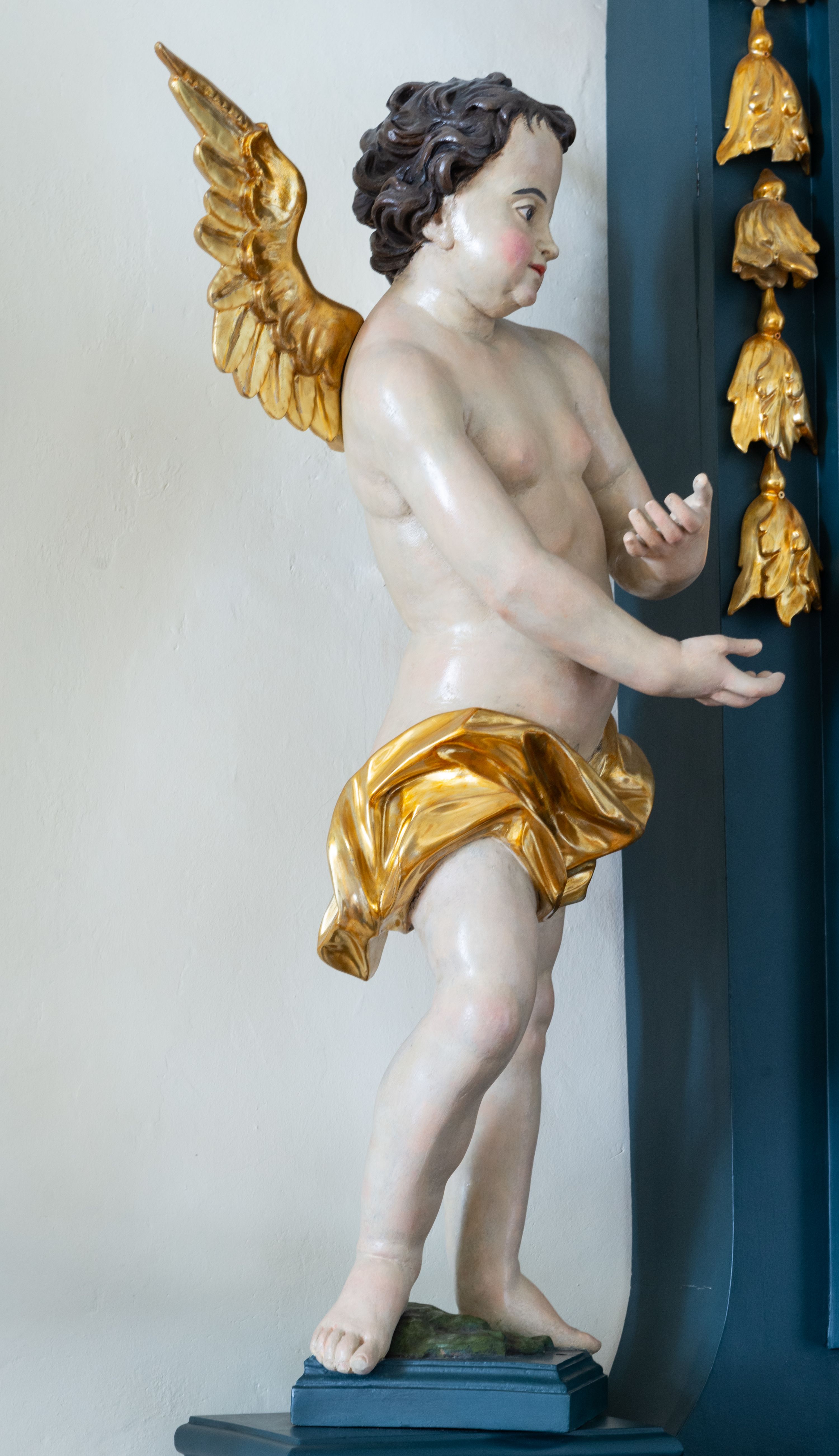 Ołtarz drewniany, jednoosiowy, jednokondygnacyjny. Mensa ołtarza z antepedium, w którym złocony krzyż. Nastawa ujęta postumentami z aniołami, w profilowanej ramie z kampanulami po bokach, z uszkami i konsolami w górnej części, zwieńczona bogato profilowanym wklęsłym gzymsem przechodzącym w dwie zwrócone ku sobie woluty z kartuszem i godłem Kotwica, umieszczonym pod muszlą palmetową. Obraz w ramie profilowanej, prostokątny, zamknięty półkolistym łukiem nadwieszonym. Stojące po bokach aniołki ukazane w kontrapoście, nagie, o pulchnych kształtach, przepasane na biodrach, z zarzuconymi na plecy złoconymi, miękko marszczonymi draperiami. Nastawa ciemnozielona ze złoconymi ornamentami i profilami; aniołki w naturalistycznej tonacji kolorystycznej.