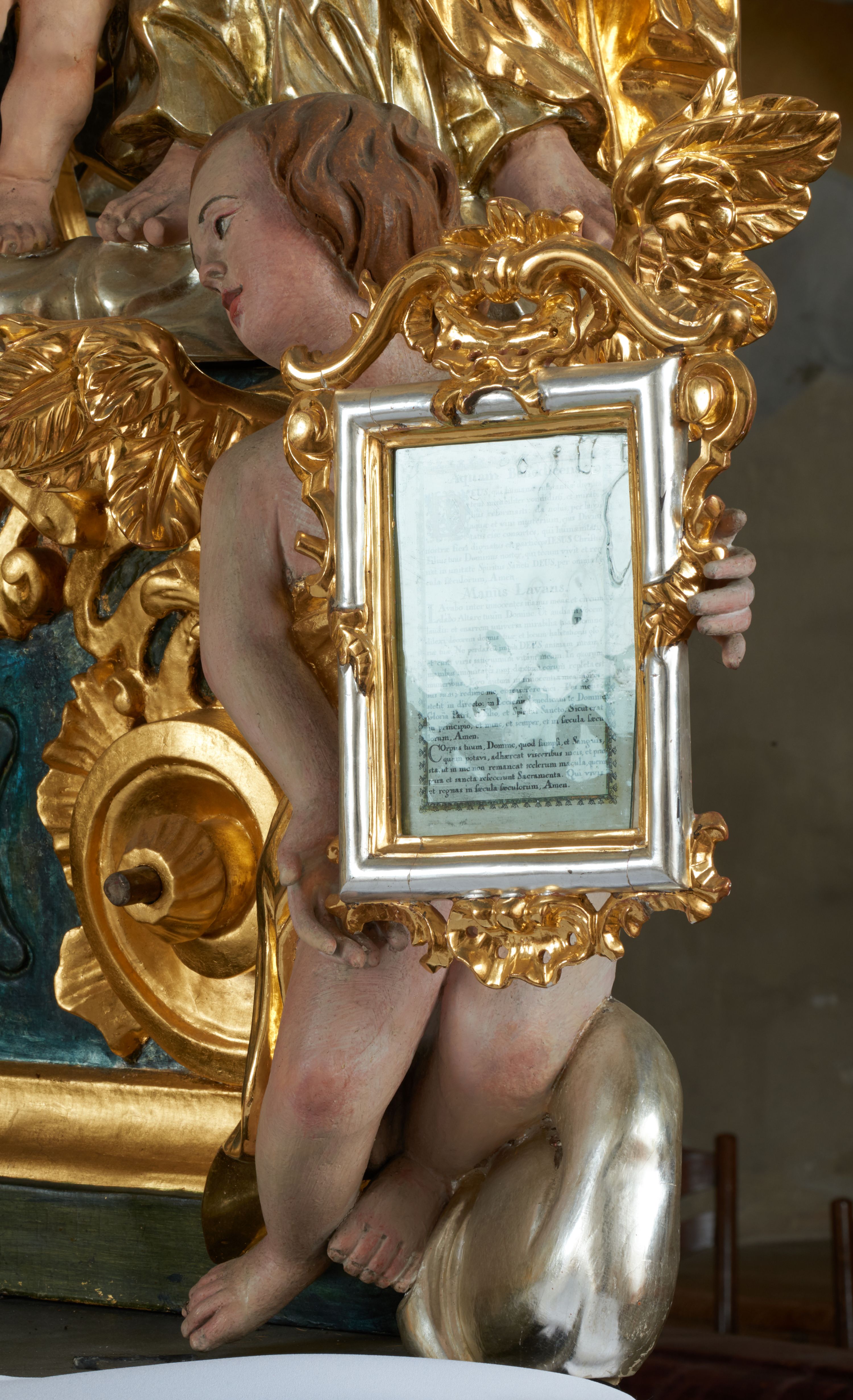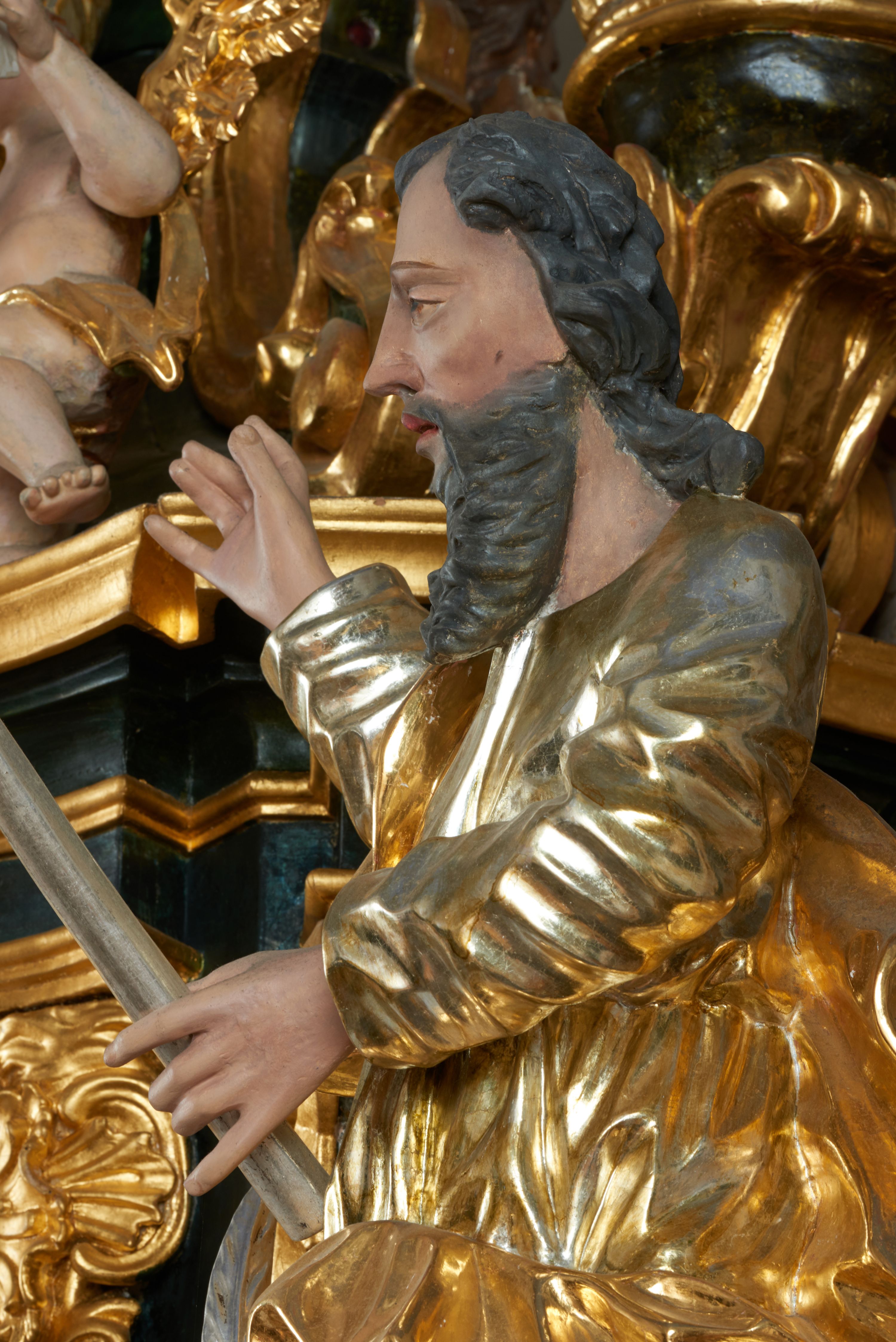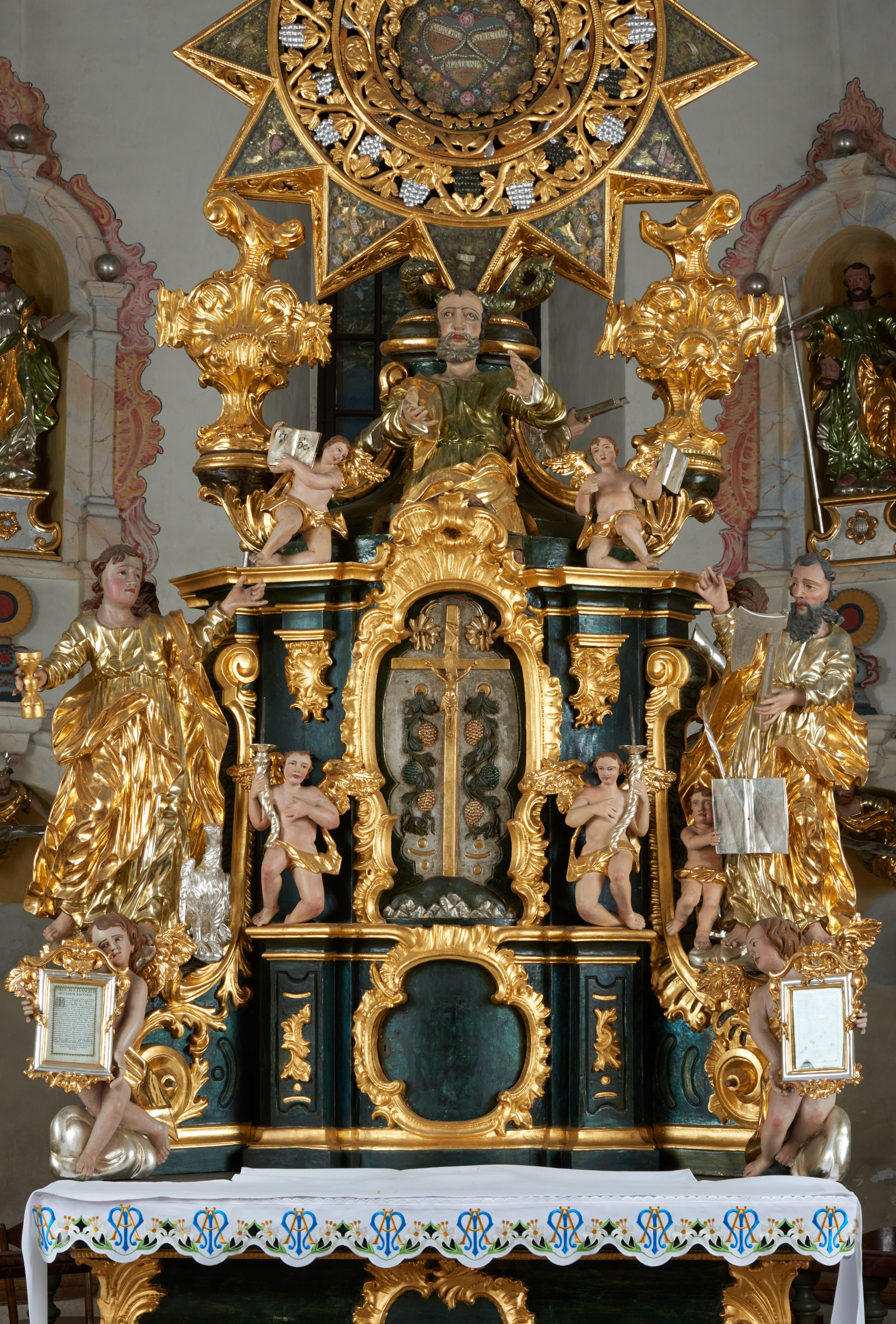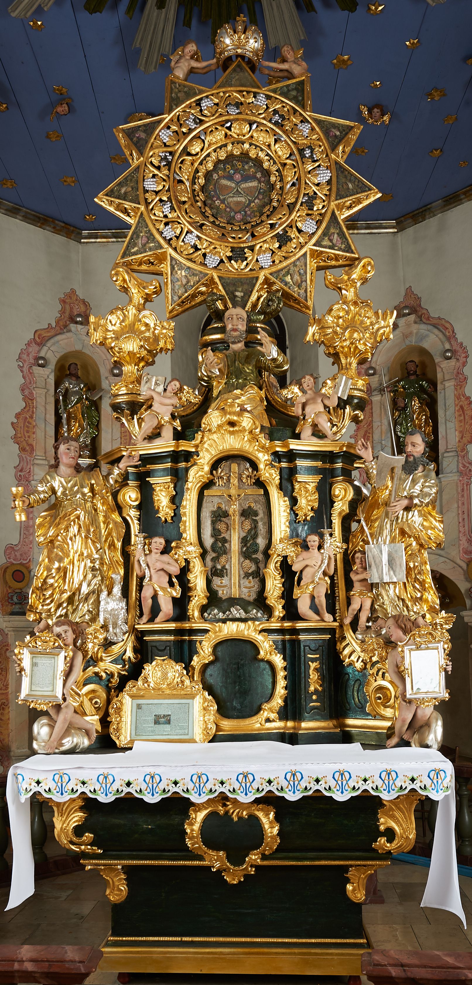 Na awersie ołtarza, na mensie znajdują się dwie figurki puttów siedzących na obłokach i trzymających tabliczki z kanonami. Całość flankują ustawione na spływach wolutowych figury św. Jana Ewangelisty i św. Bartłomieja, tron wieńczy półpostać Boga Ojca, ujęta przez dwa putta z otwartymi księgami. Obrotową niszę flankują dwa aniołki trzymające lichtarze. Na rewersie ołtarza na spływach wolutowych stoją figury św. Andrzeja i św. Piotra, tron wieńczy półpostać Mojżesza flankowana przez dwa putta z otwartymi księgami.