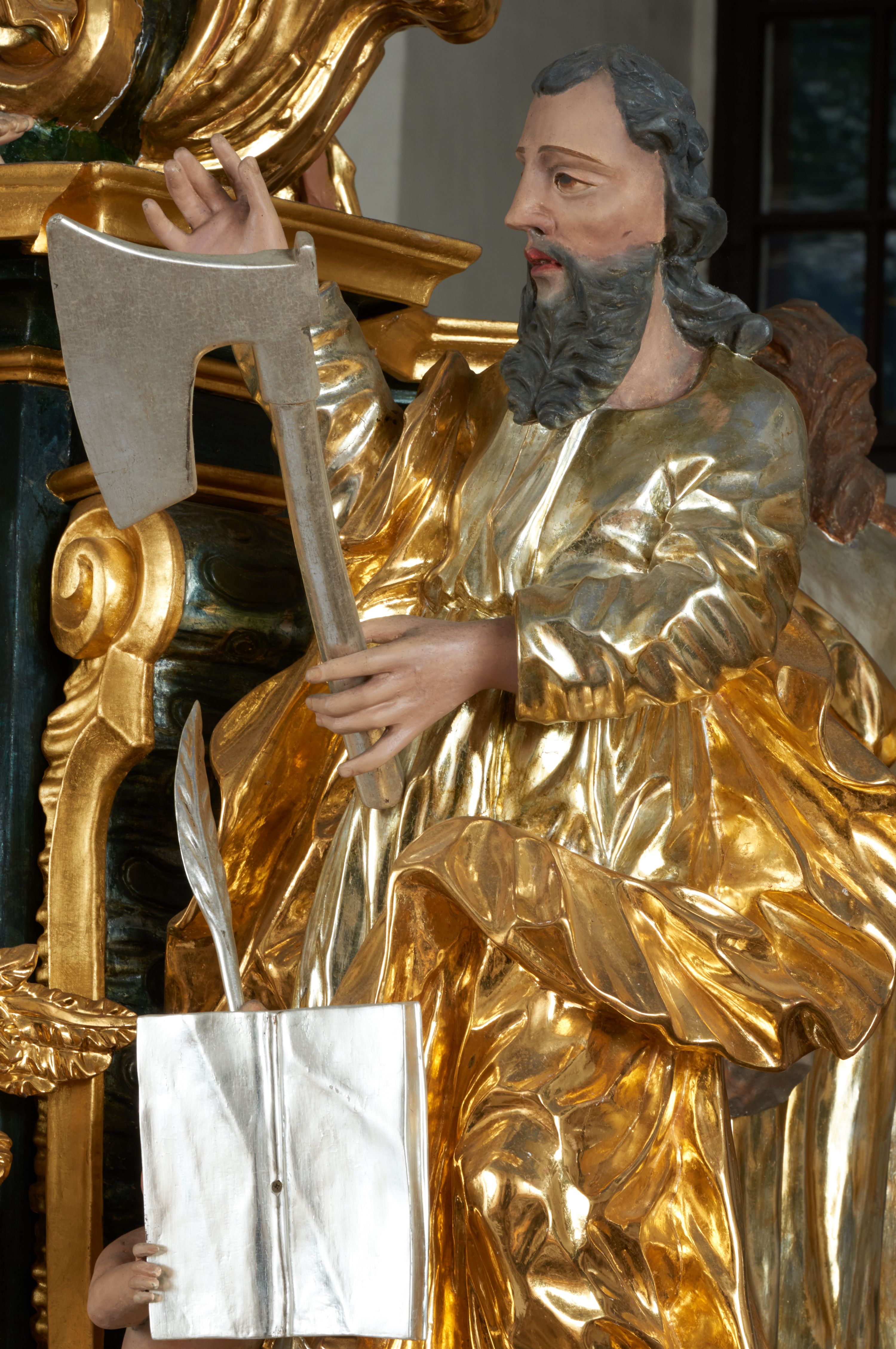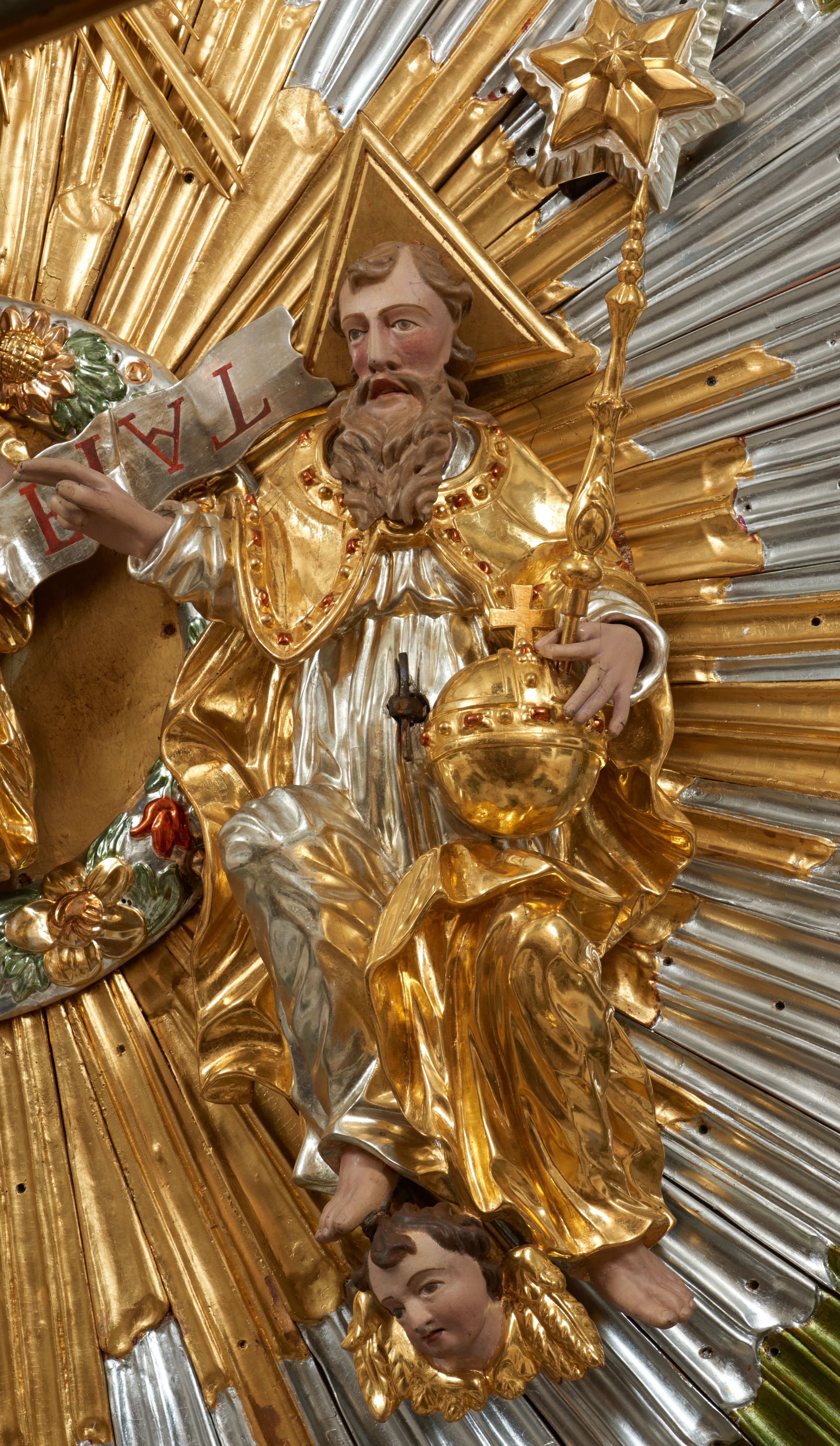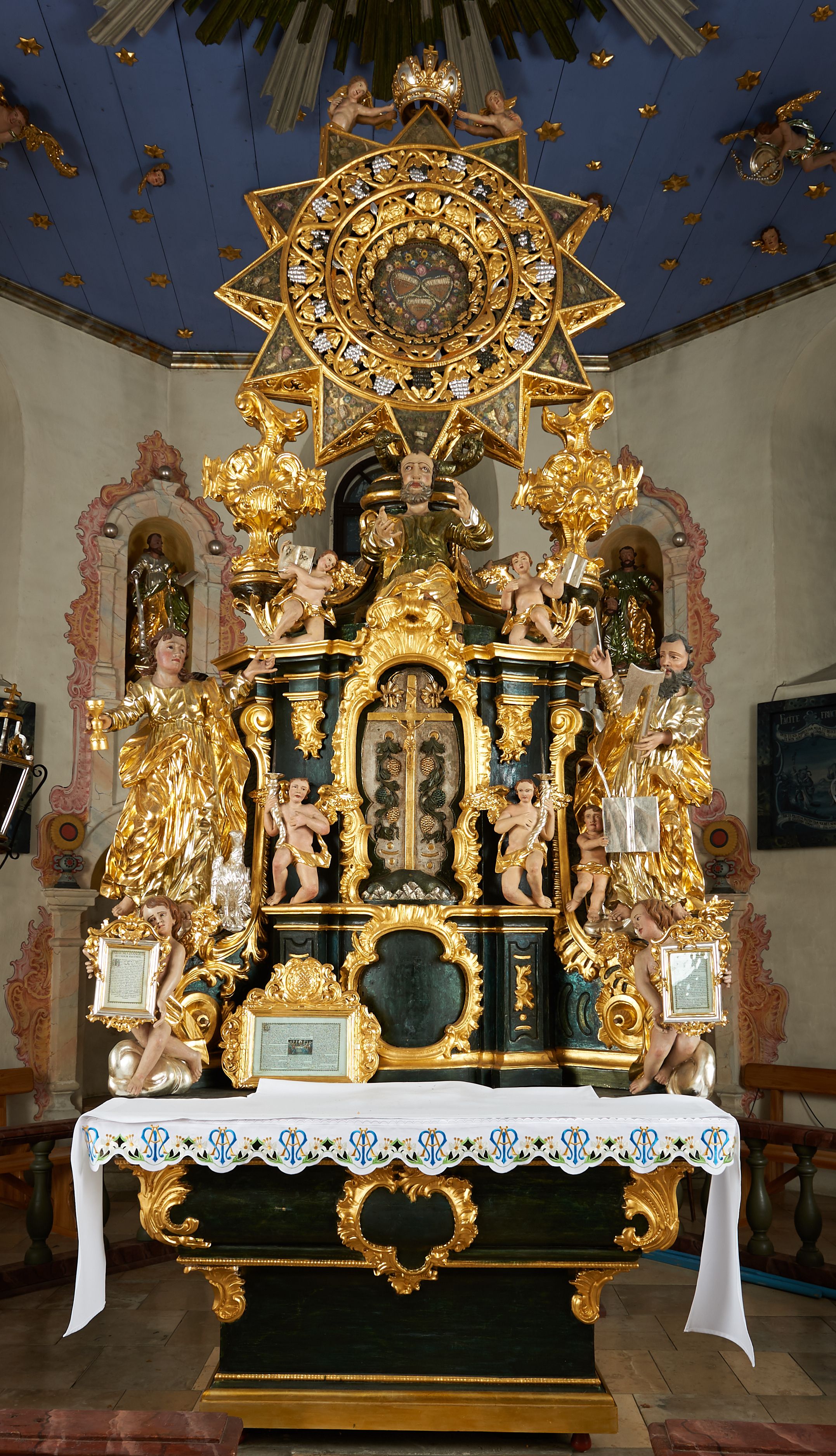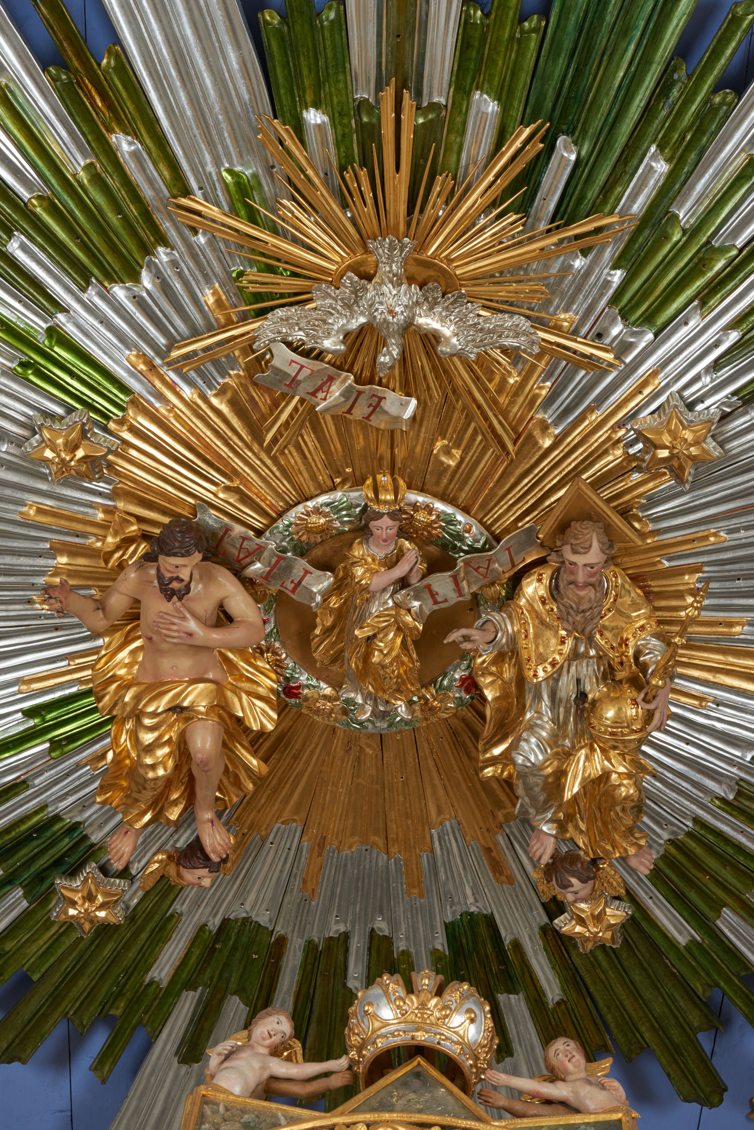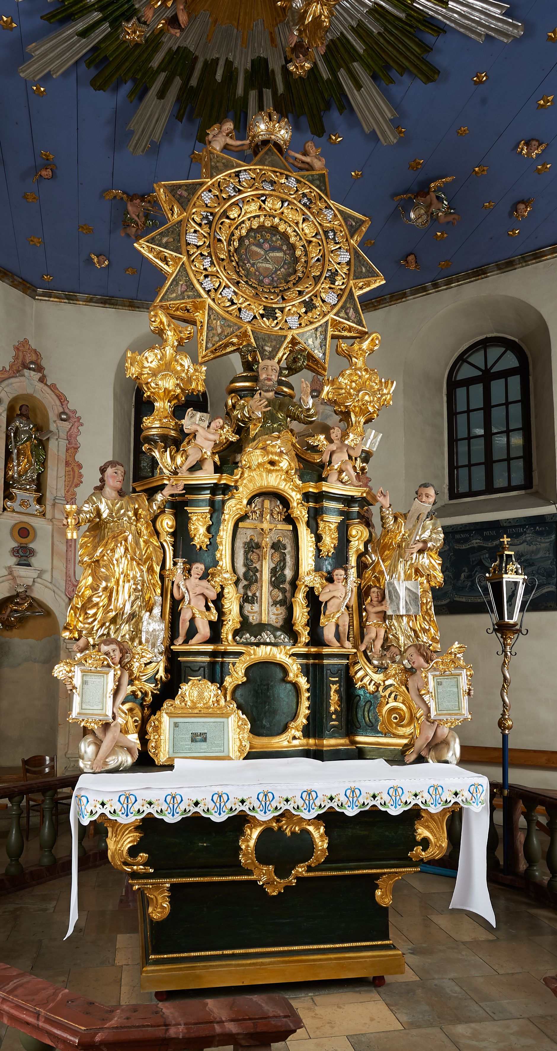 Na awersie ołtarza, na mensie znajdują się dwie figurki puttów siedzących na obłokach i trzymających tabliczki z kanonami. Całość flankują ustawione na spływach wolutowych figury św. Jana Ewangelisty i św. Bartłomieja, tron wieńczy półpostać Boga Ojca, ujęta przez dwa putta z otwartymi księgami. Obrotową niszę flankują dwa aniołki trzymające lichtarze. Na rewersie ołtarza na spływach wolutowych stoją figury św. Andrzeja i św. Piotra, tron wieńczy półpostać Mojżesza flankowana przez dwa putta z otwartymi księgami.