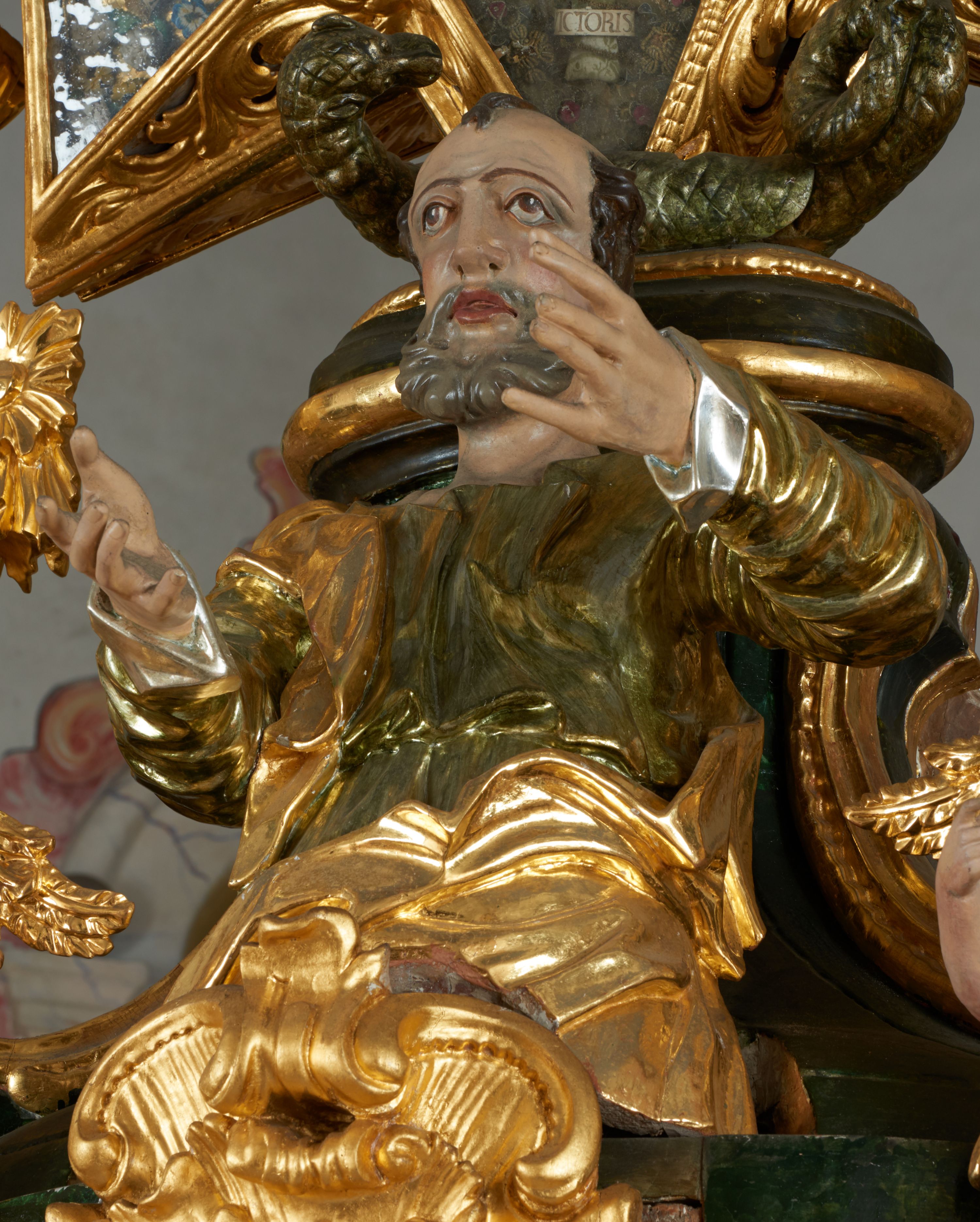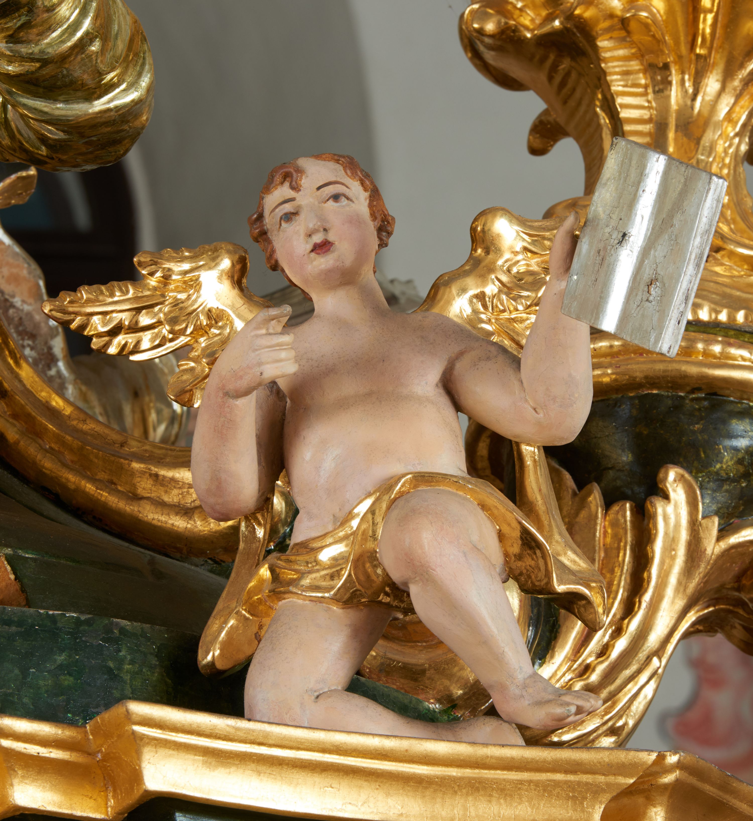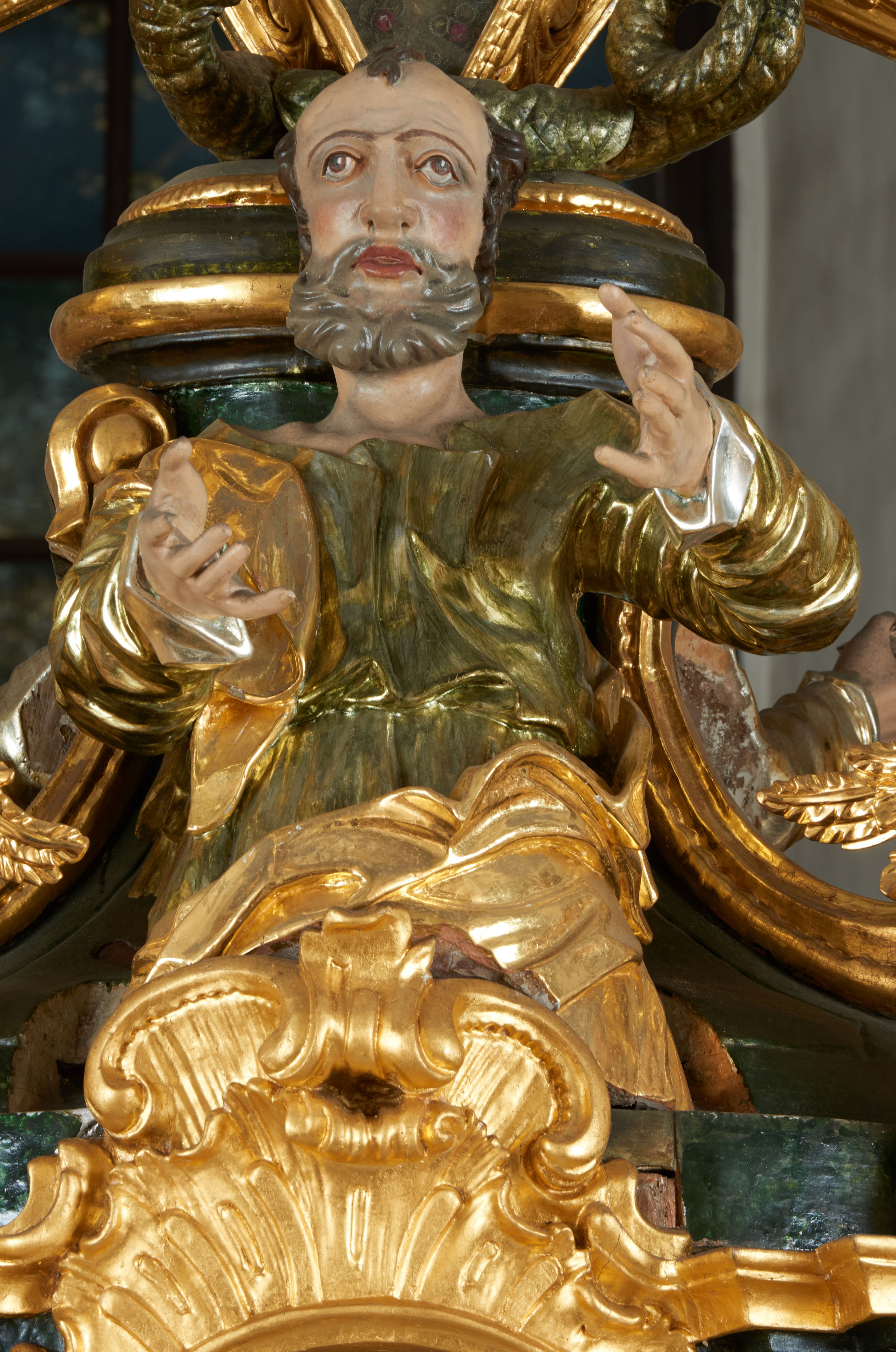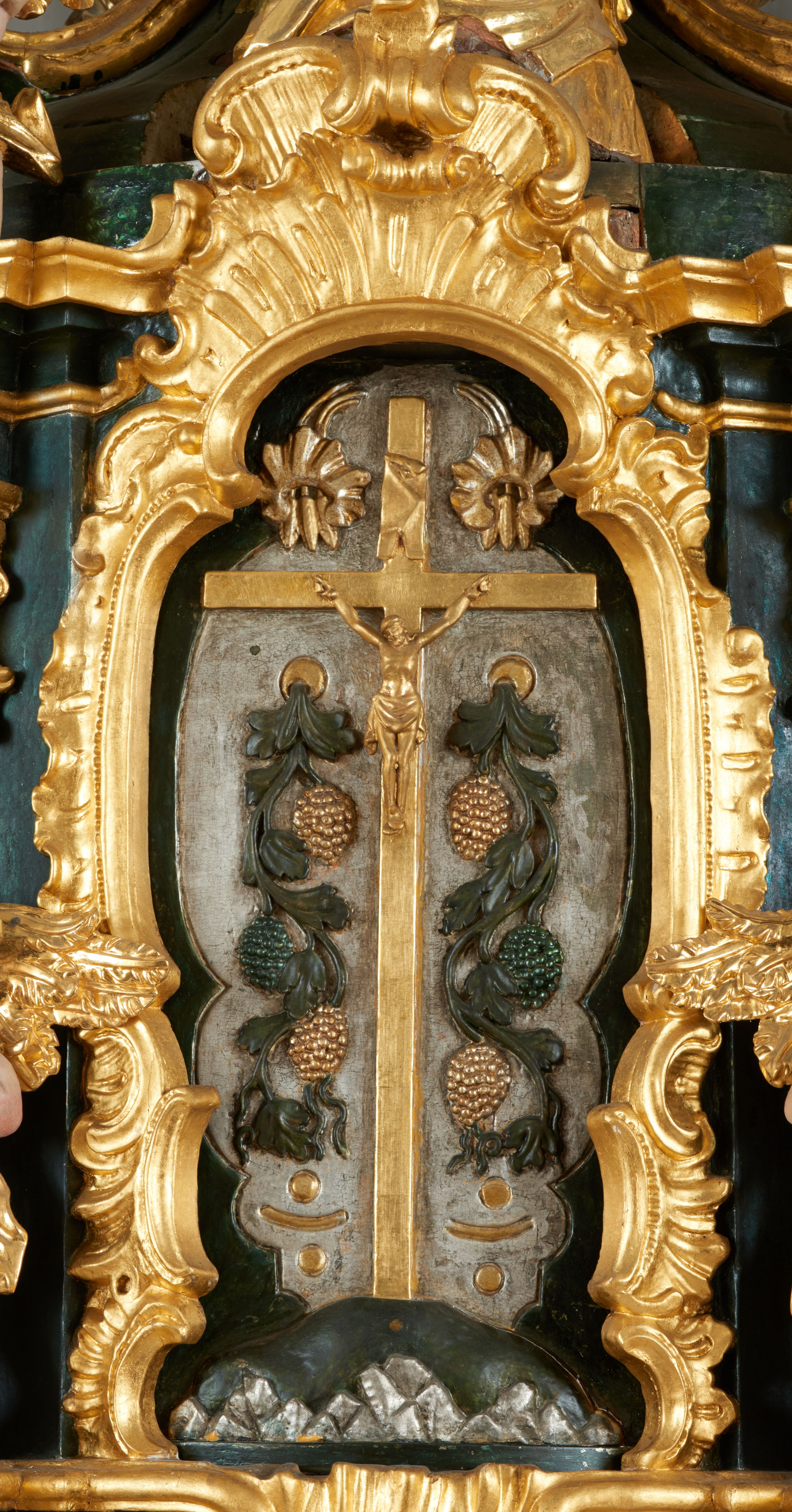 Struktura polichromowana w kolorze ciemnozielonym, ornamentyka i profile złocone, detal srebrzony.