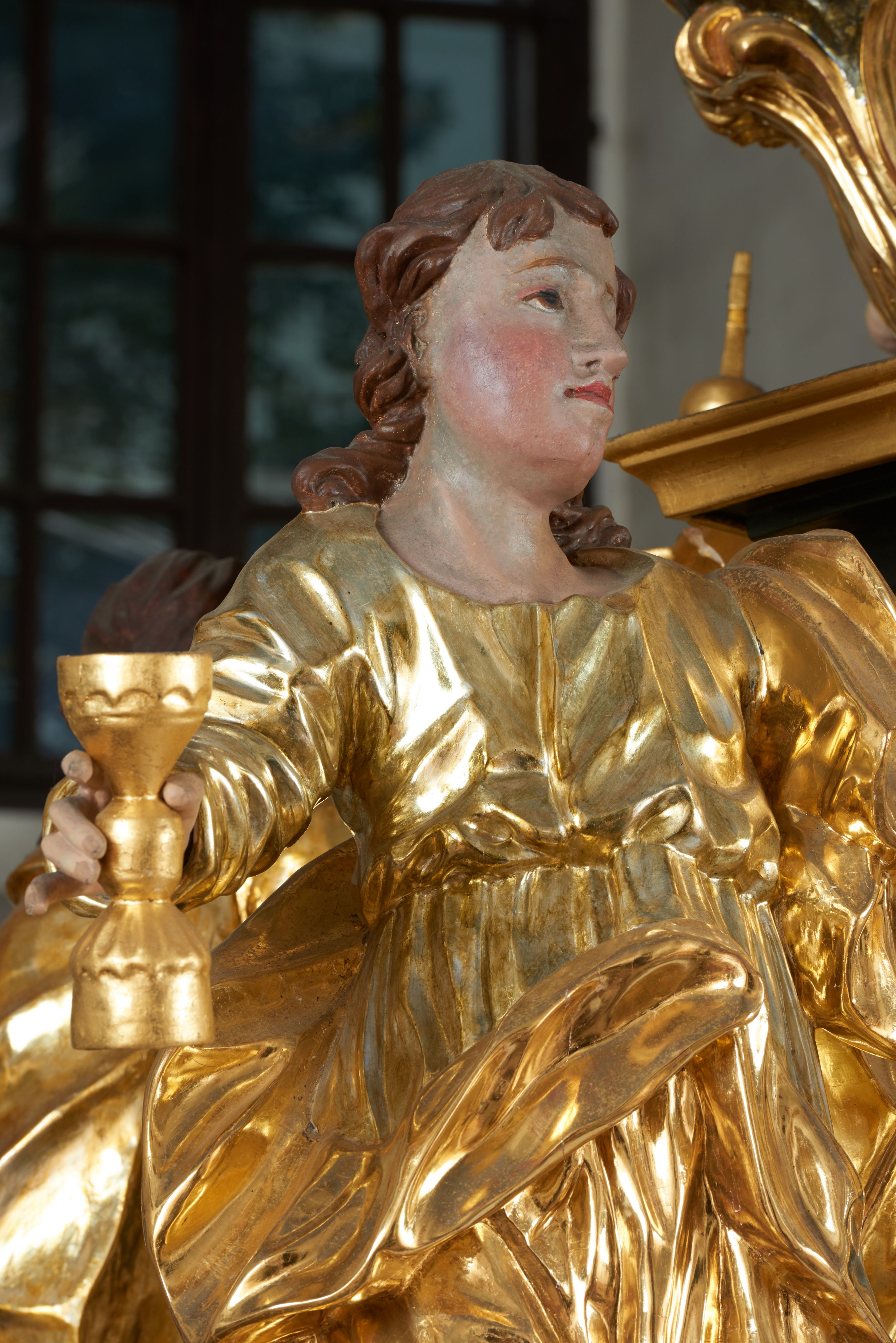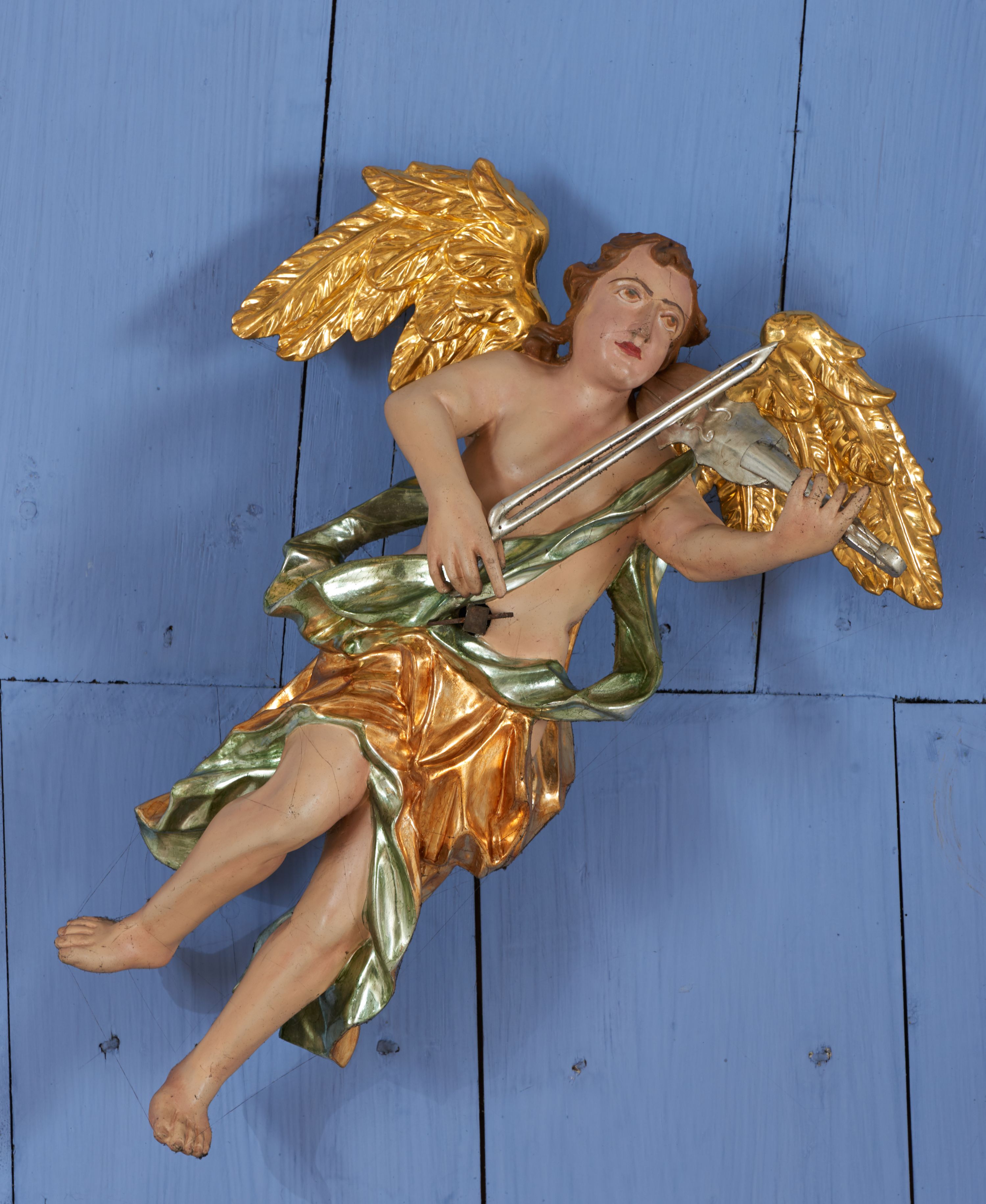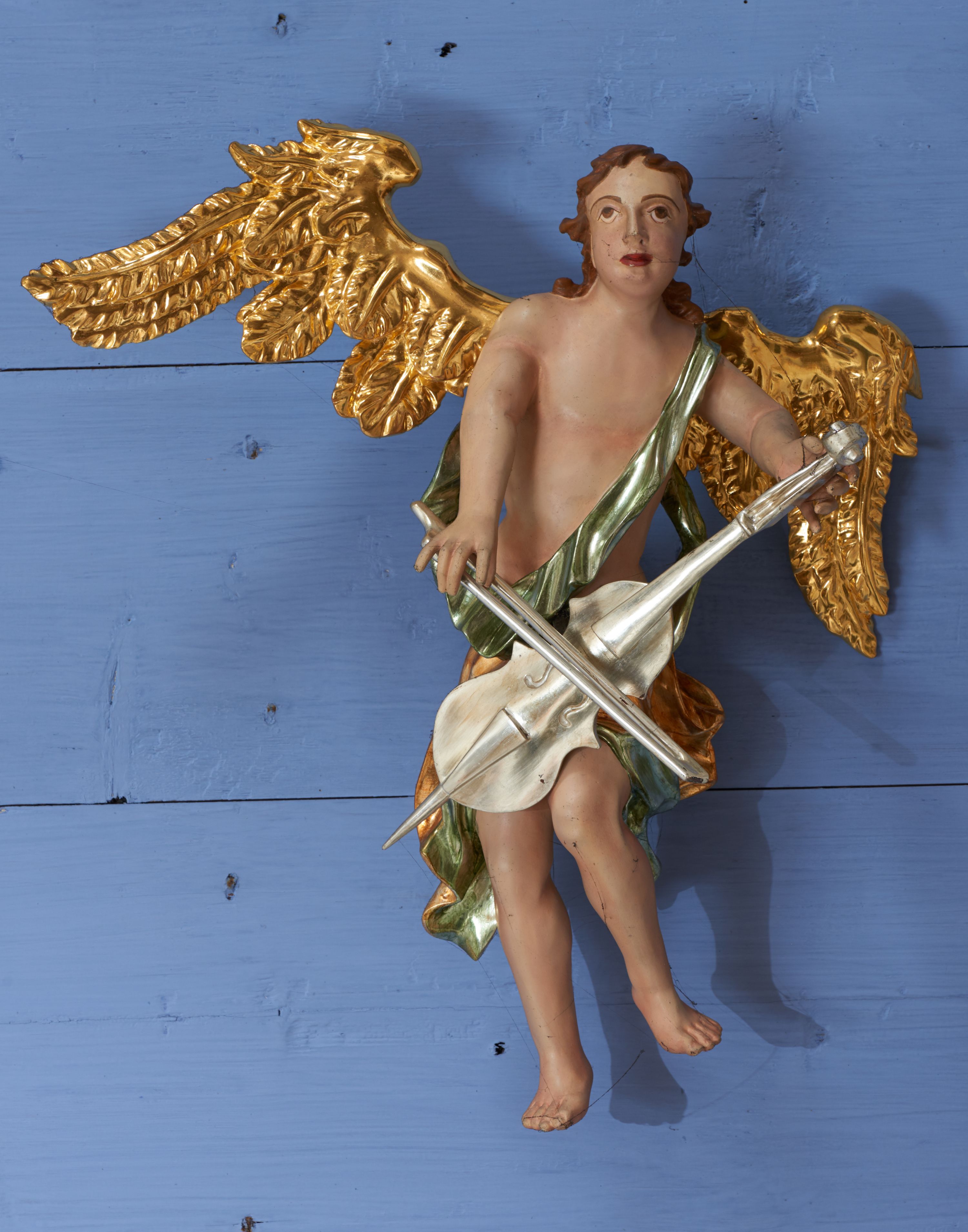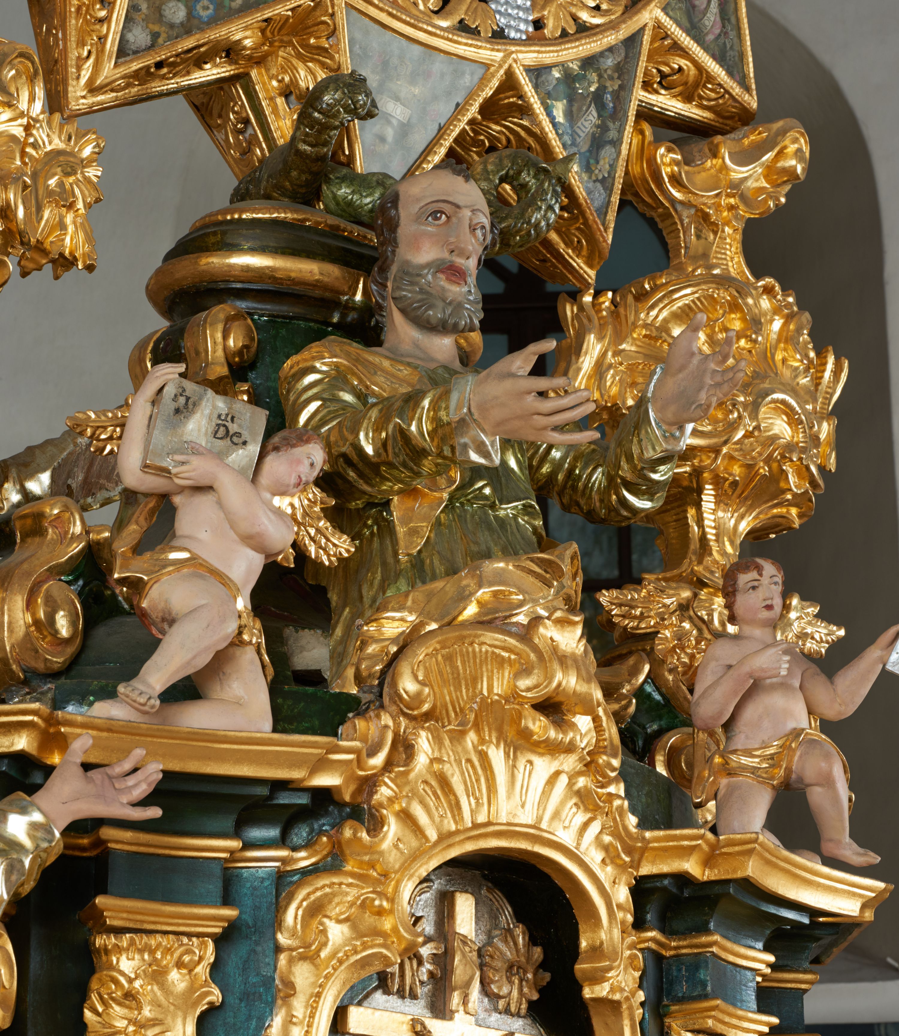 Struktura polichromowana w kolorze ciemnozielonym, ornamentyka i profile złocone, detal srebrzony.