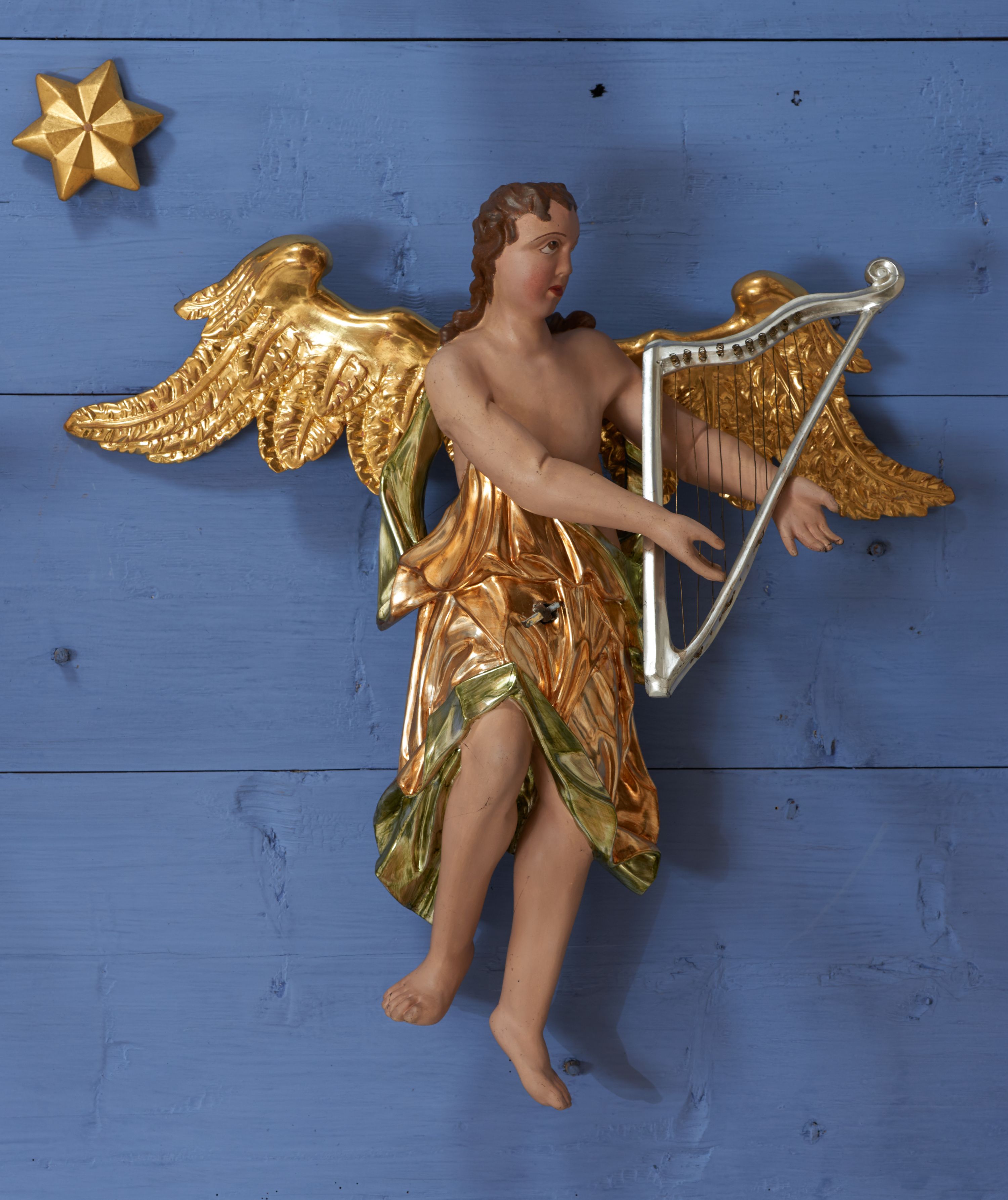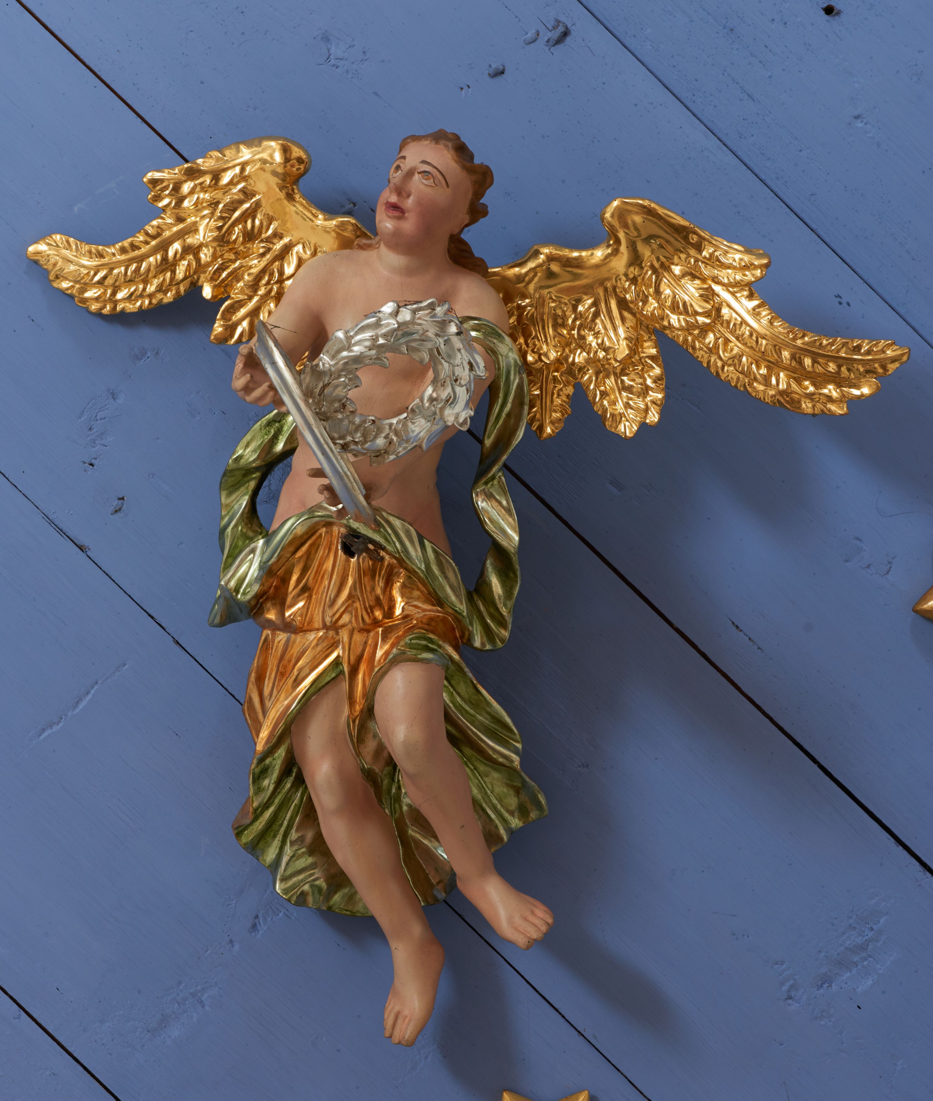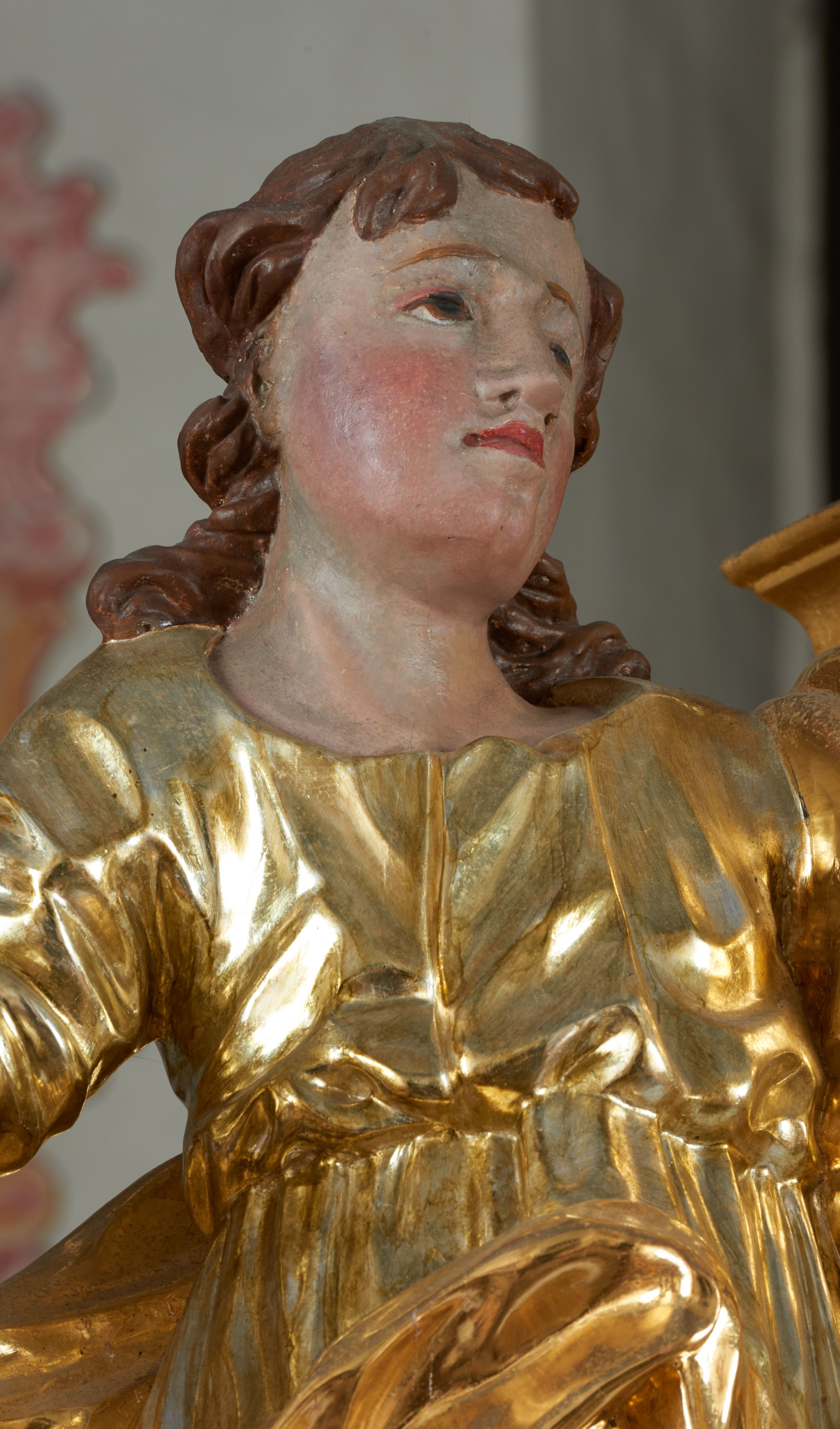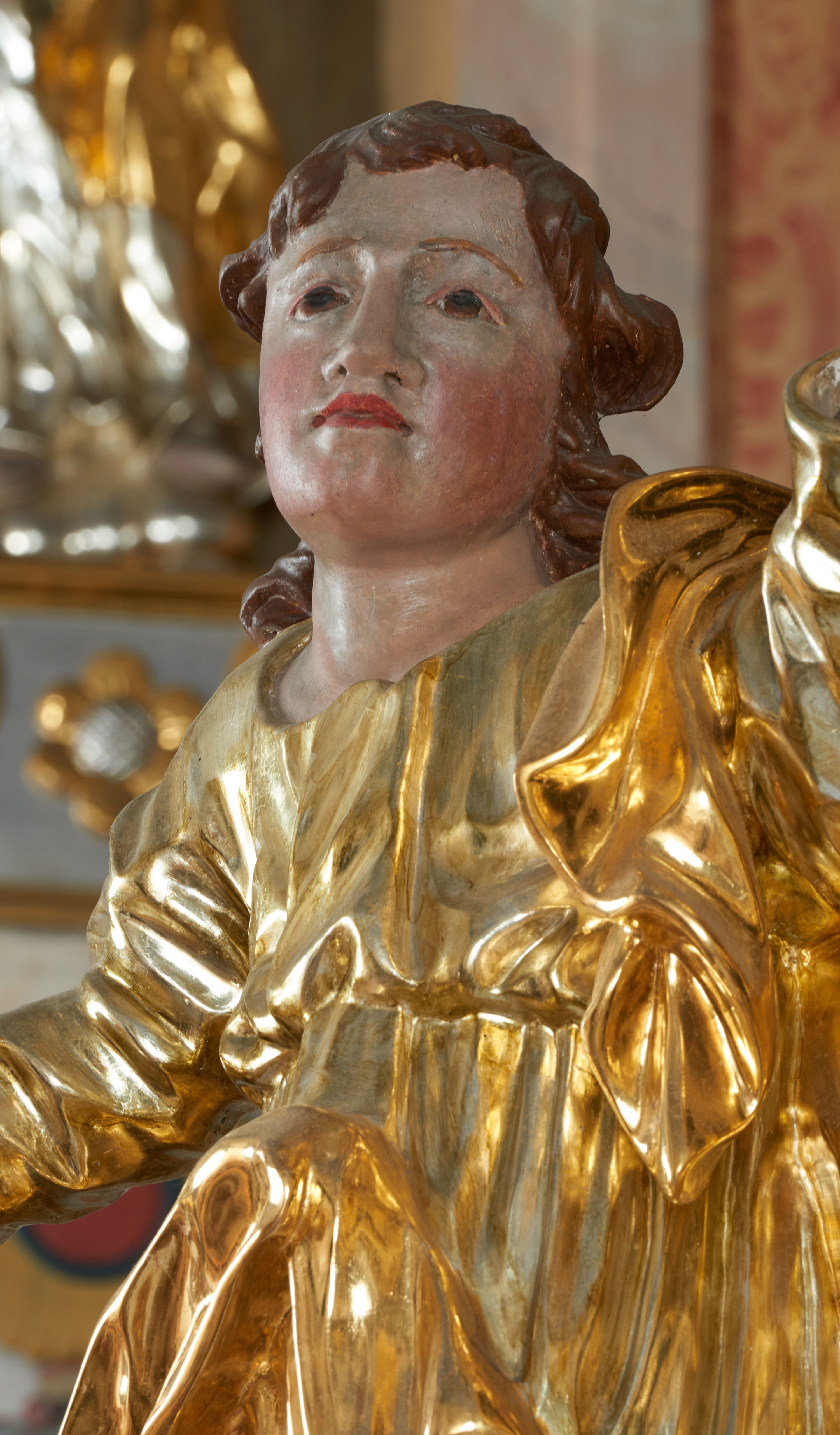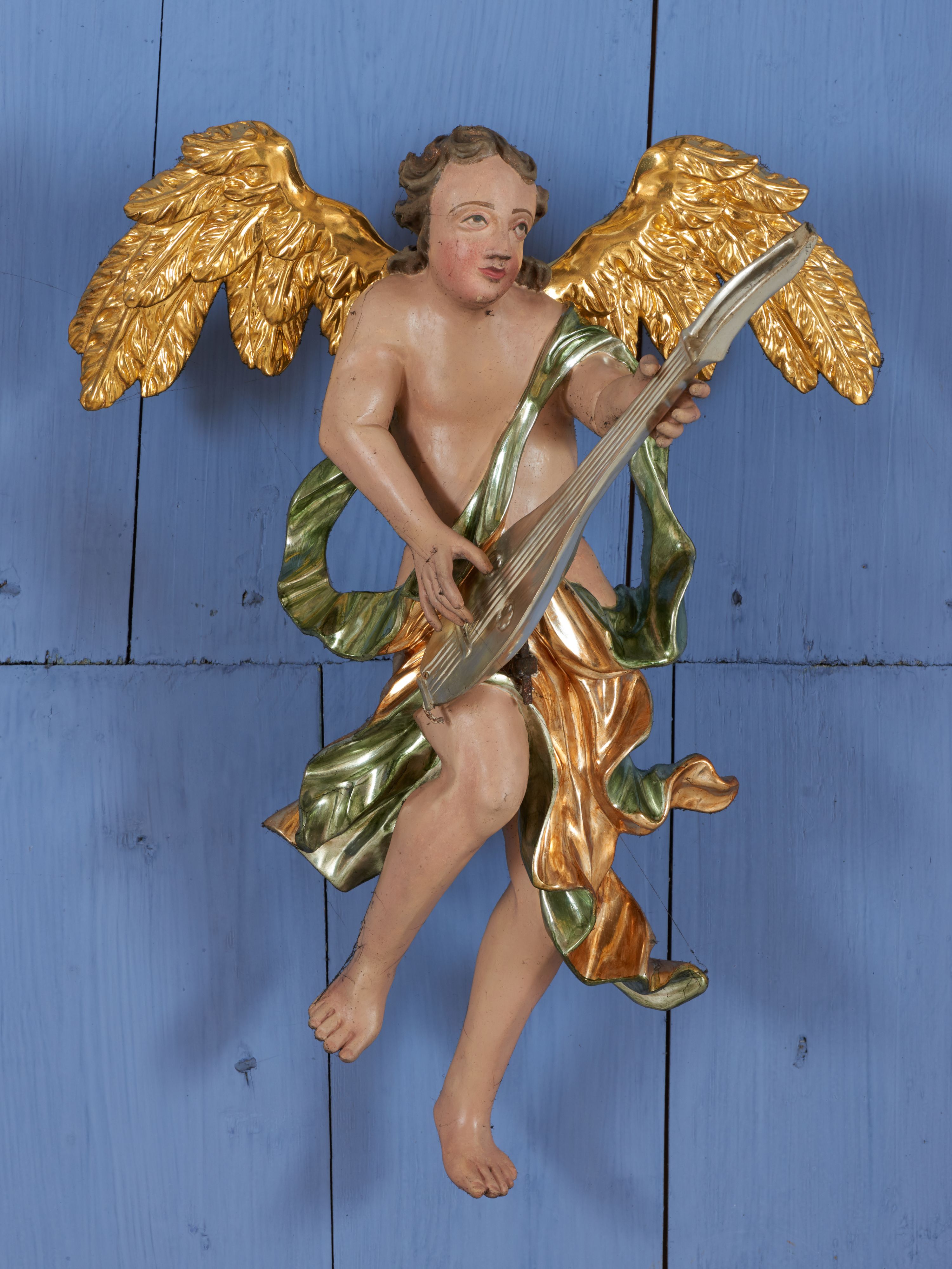 Struktura polichromowana w kolorze ciemnozielonym, ornamentyka i profile złocone, detal srebrzony.
