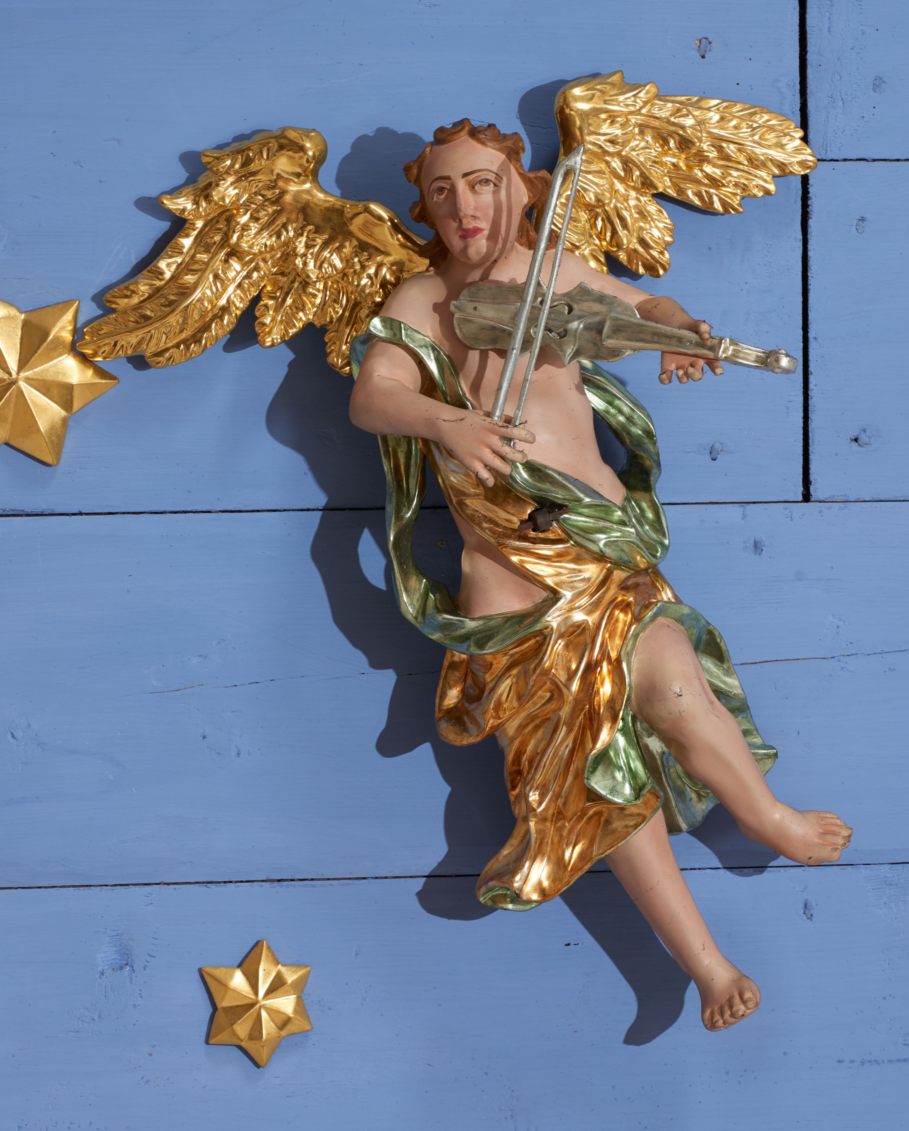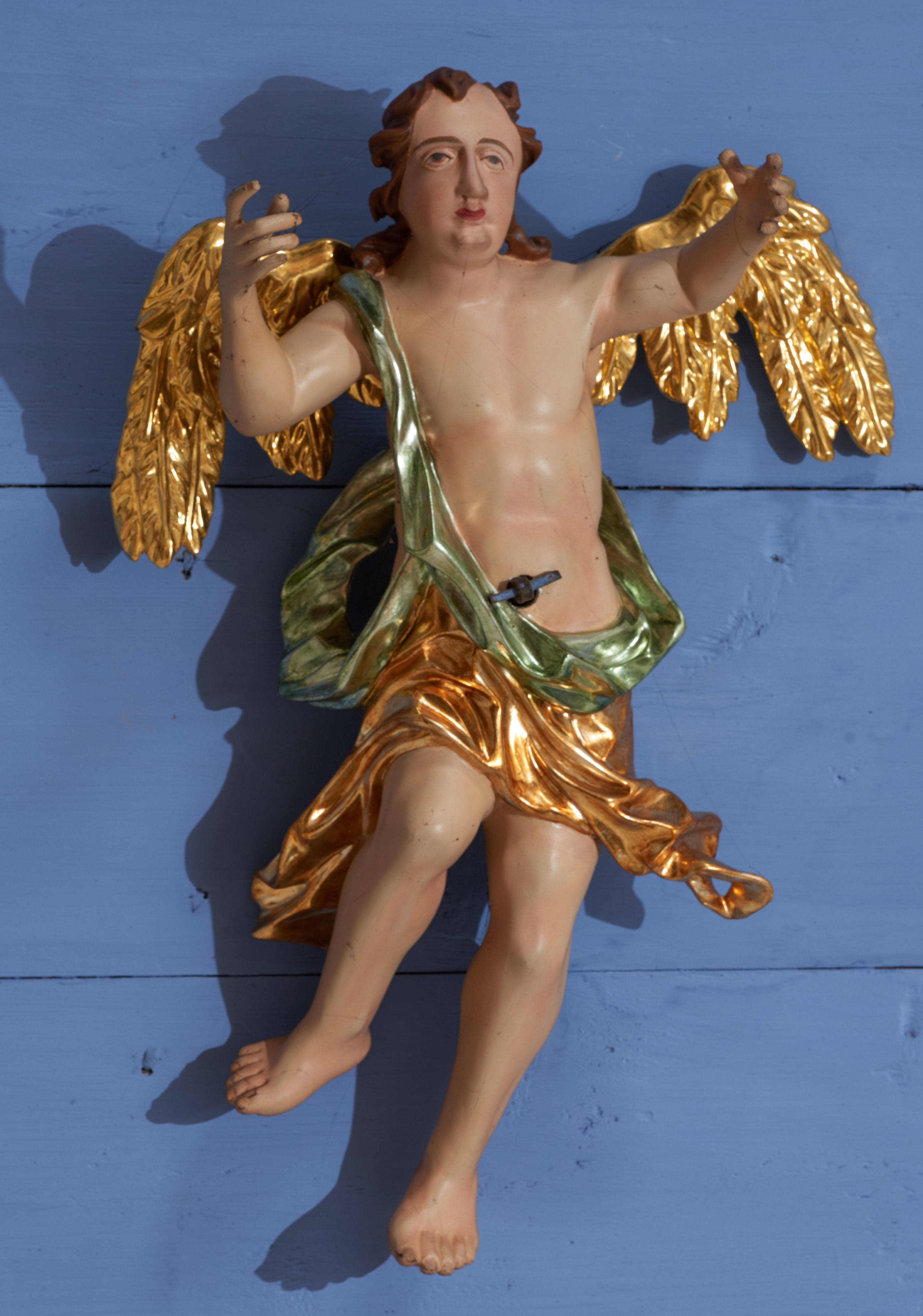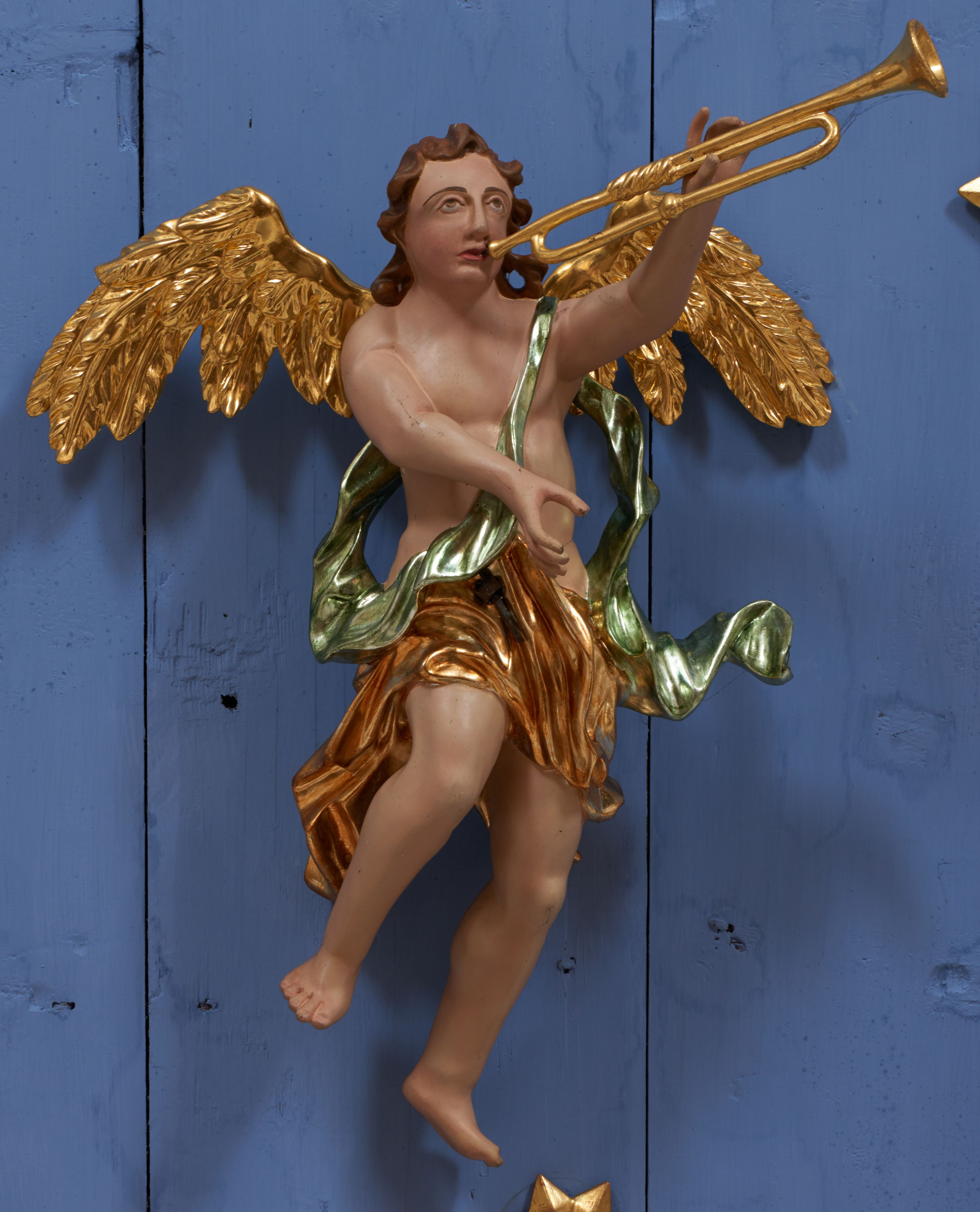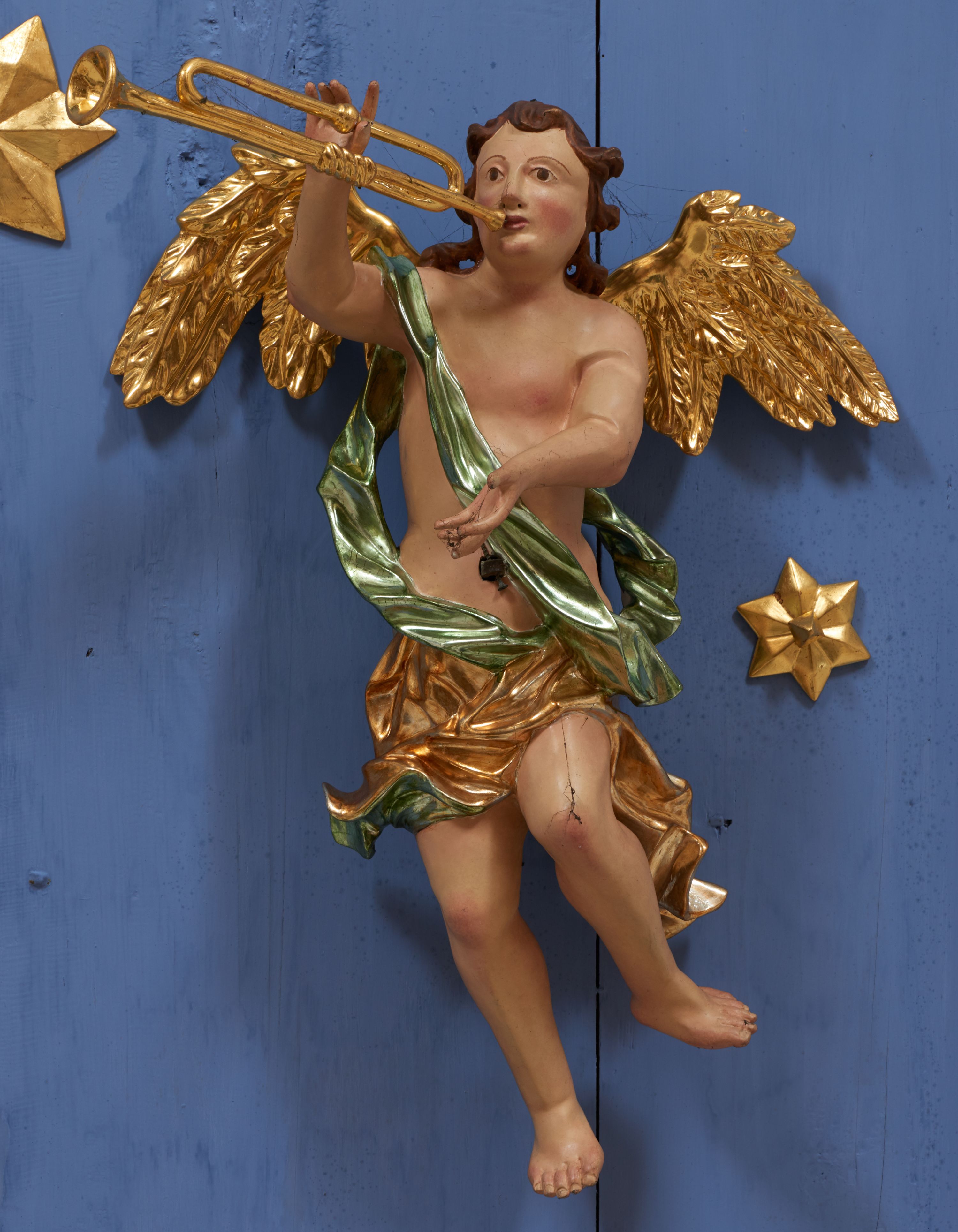 Struktura polichromowana w kolorze ciemnozielonym, ornamentyka i profile złocone, detal srebrzony.