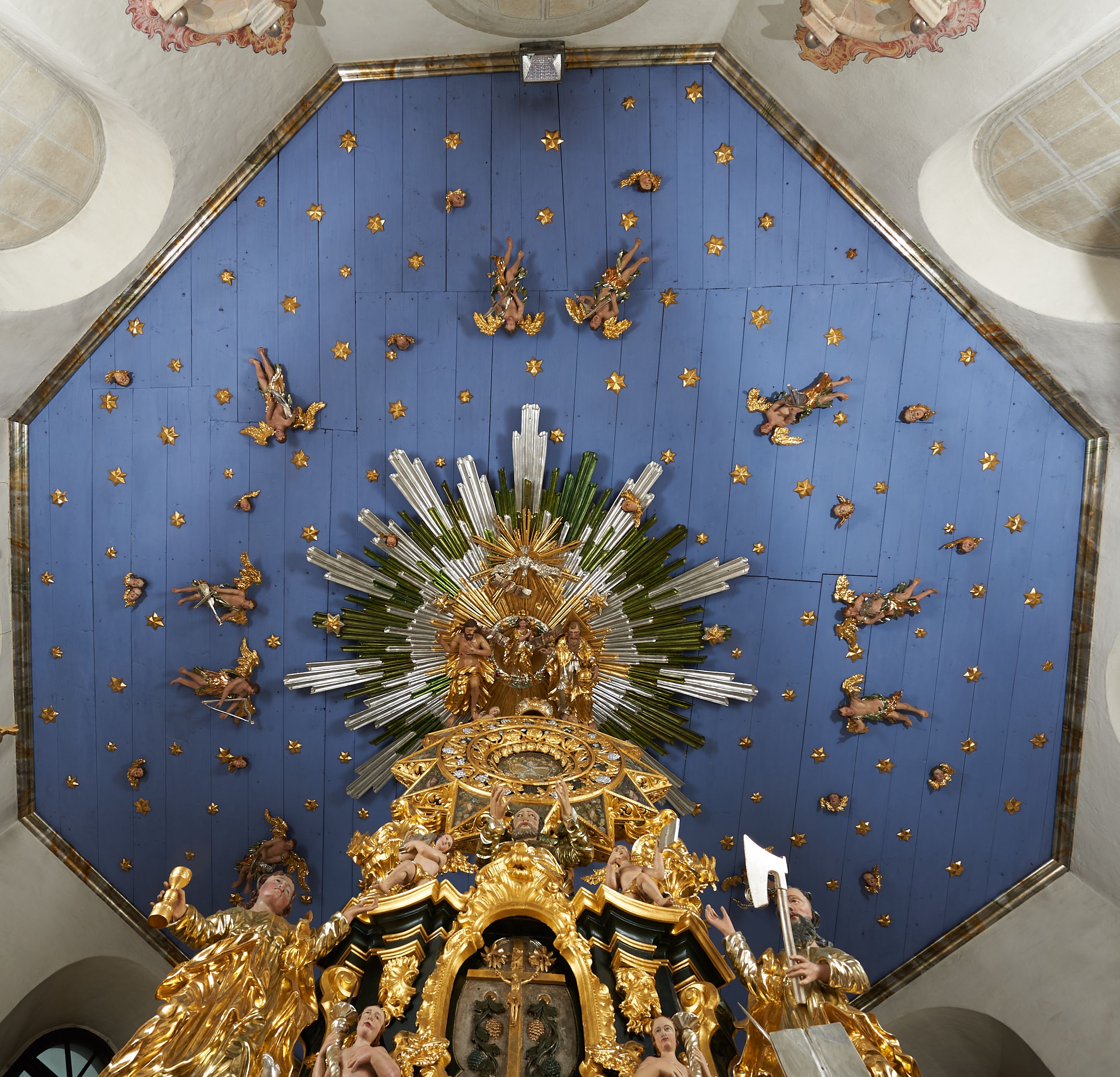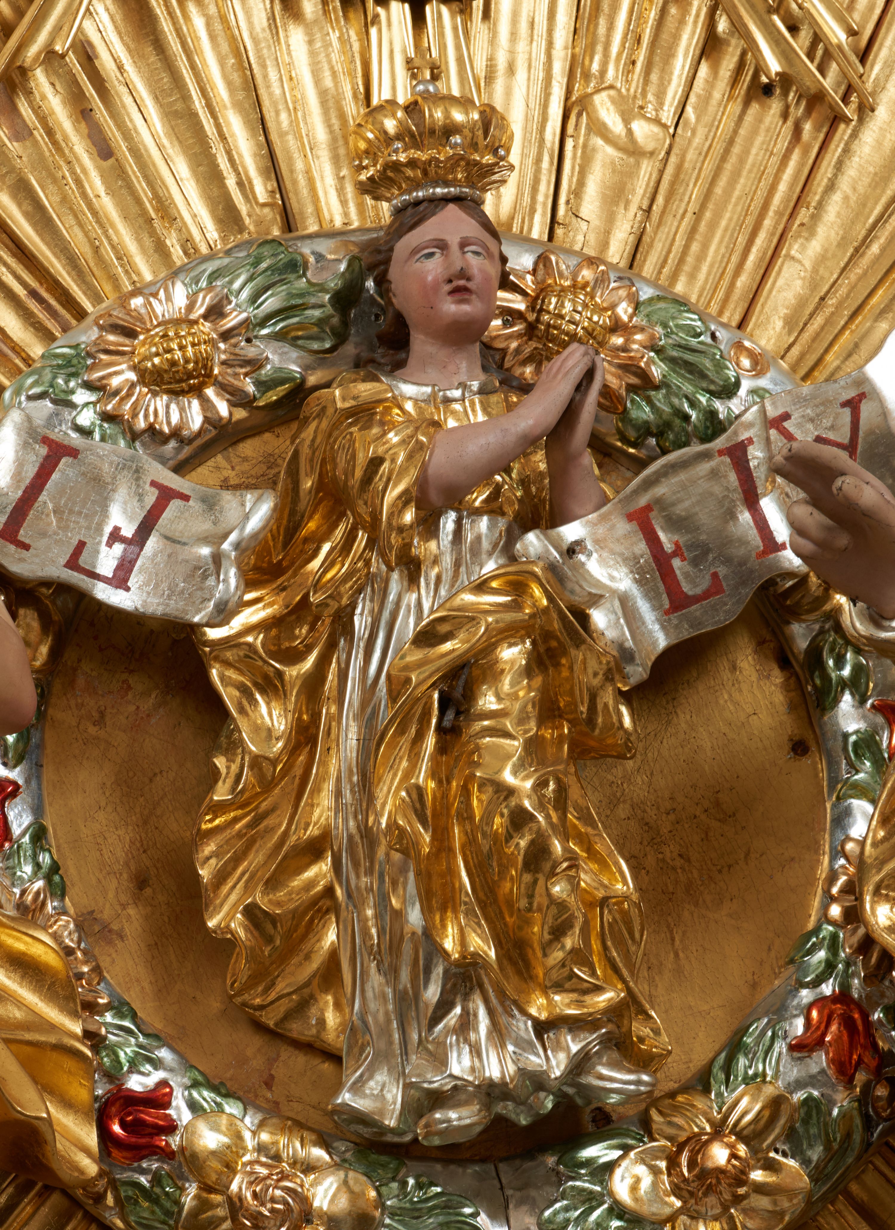 Ołtarz flankują postacie apostołów, z przodu św. Jan Ewangelista i św. Bartłomiej, z tyłu św. Andrzej i św. Piotr, wieńczą zaś z przodu Bóg Ojciec, z tyłu Mojżesz, który uważany jest za prefigurację Najświętszej Marii Panny i jej Koronacji. Figury w nieczytelnym dziś kontekście musiały odnosić się do postaci Marii. Pary puttów z otwartymi księgami, na których dawniej zapisane były sentencje, zasrebrzone podczas ostatniej konserwacji, układające się w modlitwę do Marii. Brzmiały: „Vidi coelum novum et terram novam Apo[calypsis] 21”, co znaczy „I ujrzałem niebo nowe i ziemię nową” (Ap 21, 1); „Tota pulchra es Cant[ica canticorum] 4” – „O jaka piękna jesteś”