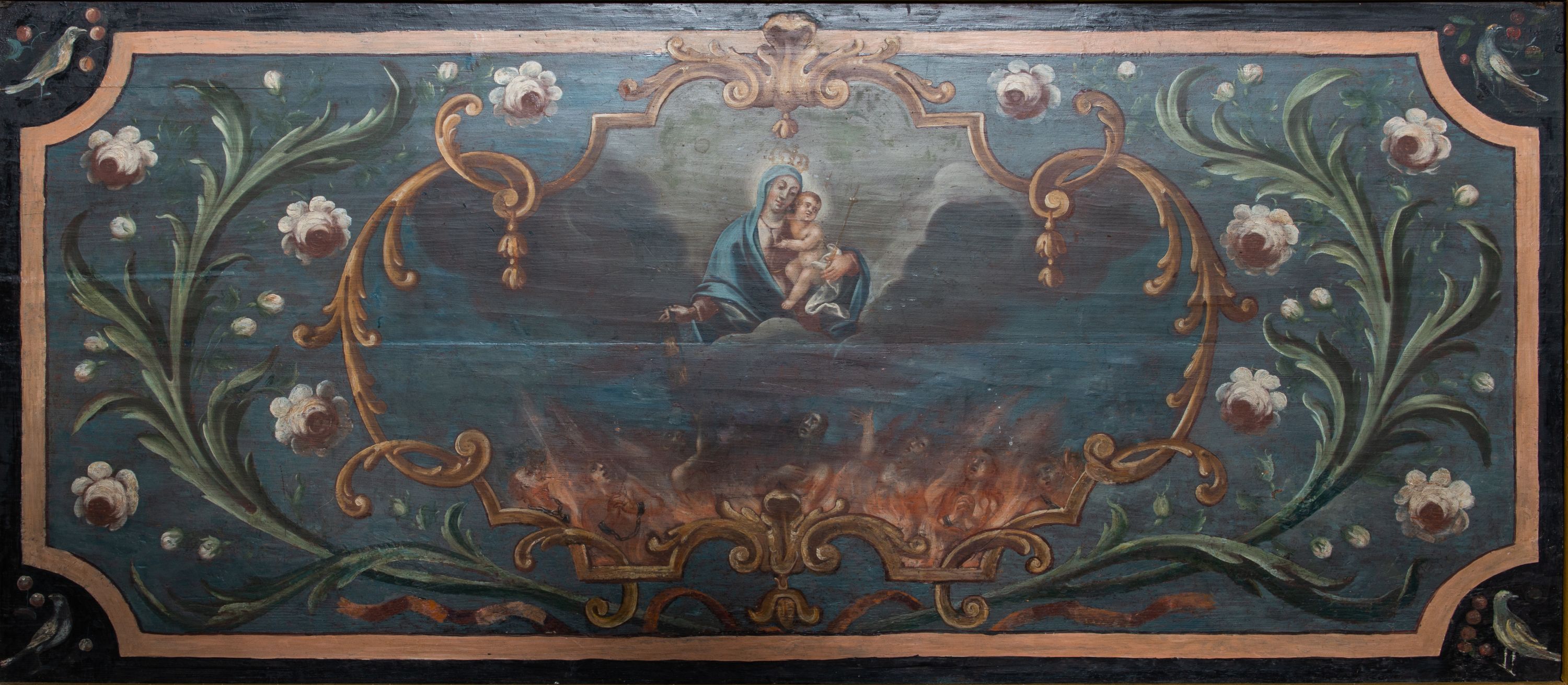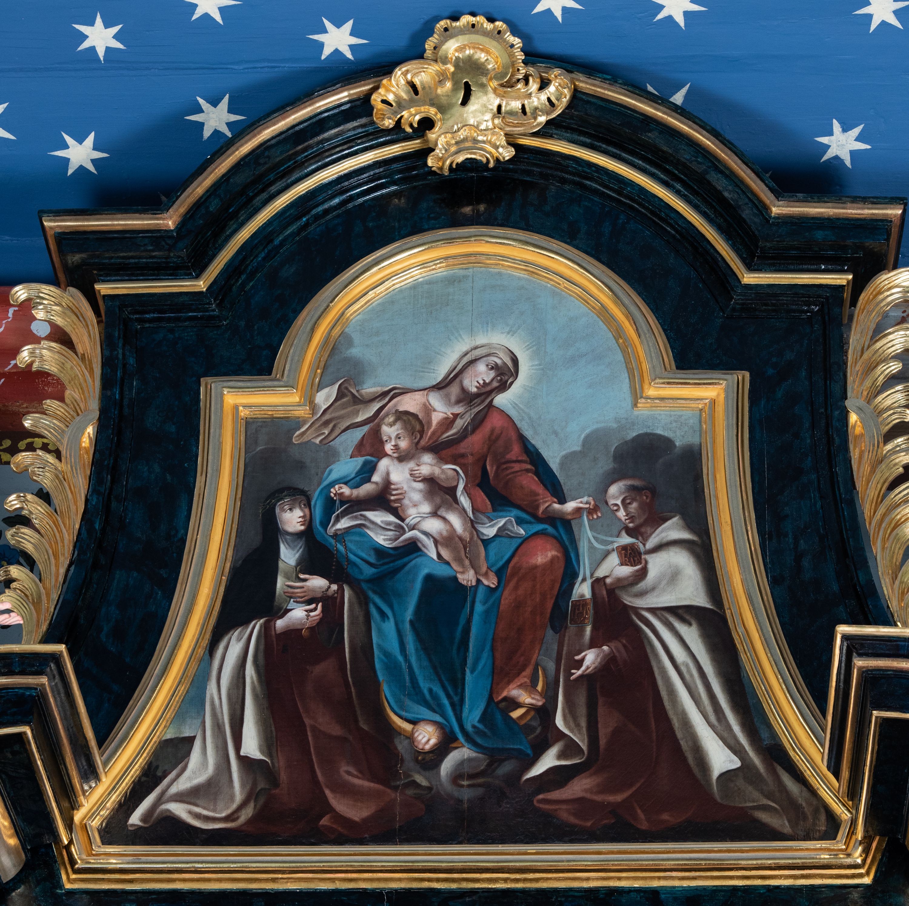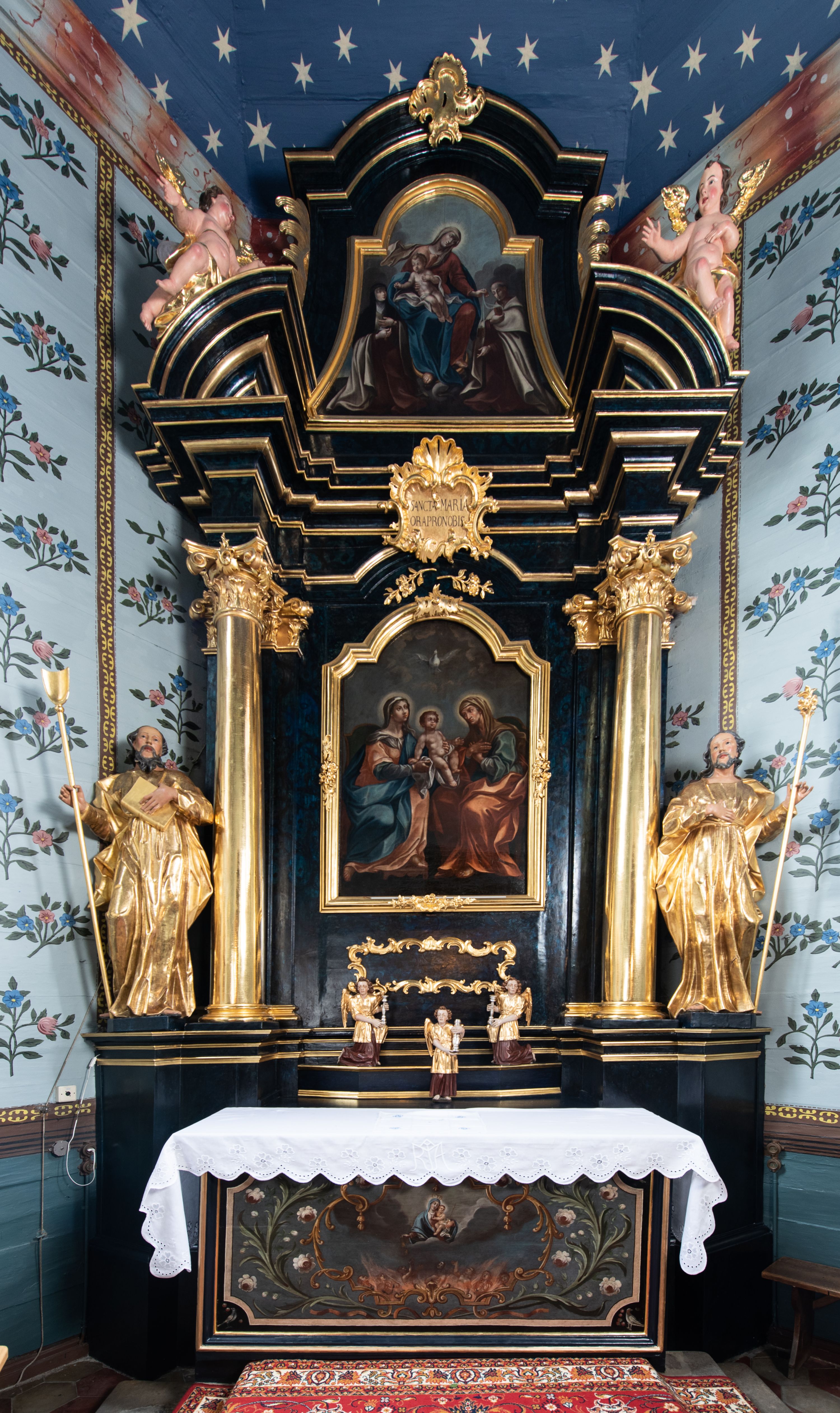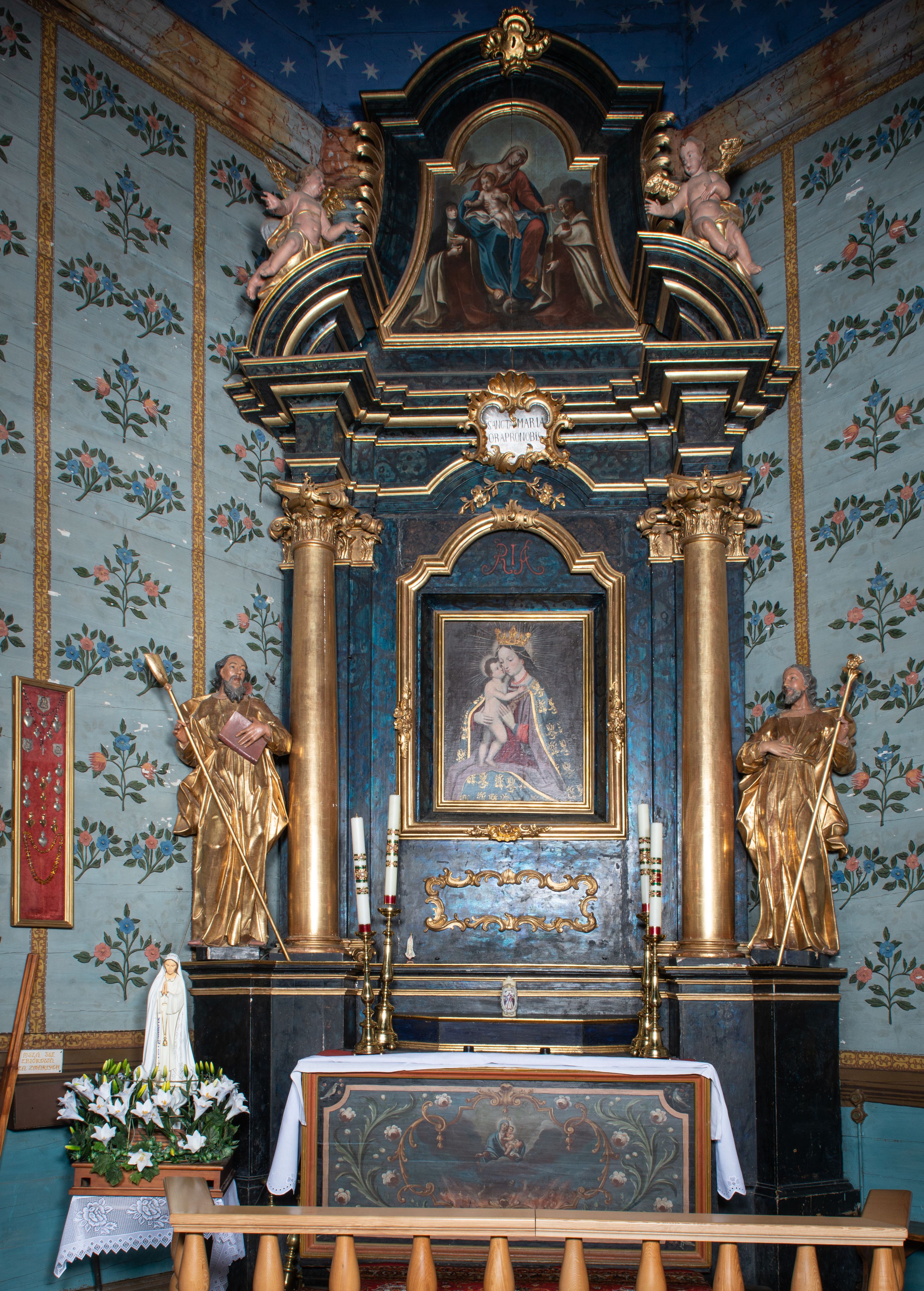 Antepedium ujęte profilowaną ramą, w polu malowana płycina w formie leżącego prostokąta o wklęsłych narożach, wypełniona wicią roślinną z różami, z kartuszem w centrum. W narożach przedstawienia ptaków na gałęziach. W polu kartusza ukazana półpostać Matki Boskiej Szkaplerznej unoszącej się nad duszami czyśćcowymi, na tle nieba. Retabulum ustawione na wysokim cokole, szerszym od nastawy, z wyłamanymi czterema prostopadłościanami. Nastawa ujęta parą zdwojonych pilastrów i parą stojących przed nimi kolumn o kapitelach kompozytowych, dźwigających pełne belkowanie, wyłamane na ich osi, z architrawem przyjmującym nad polem środkowym formę łuku odcinkowego. Na belkowaniu fragmenty półkolistego, przerwanego przyczółka z siedzącymi puttami. W polu centralnym wnęka w formie stojącego prostokąta zamkniętego łukiem półkolistym nadwieszonym z uskokiem, ujęta profilowaną ramą, z mniejszym obrazem Matki Boskiej z Dzieciątkiem w kształcie stojącego prostokąta. Powyżej, w podłuczu monogram Marii. Nad wnęką, w polu belkowania rocaille'owy kartusz z napisem „SANCTA MARIA / ORA PRO NOBIS”. Na skrajnych partiach cokołu ustawione figury św. Joachima i św. Józefa. Zwieńczenie w formie zbliżonej do trapezu, ujętego spływami wolutowymi, zamkniętego fragmentem gzymsu w formie łuku półkolistego nadwieszonego. Flankowane liśćmi palmowymi, gzyms dekorowany rocaille'm. W polu obraz Matki Boskiej Szkaplerznej ze św. Szymonem Stockiem i św. Teresą z Avili w formie analogicznej do zwieńczenia, w profilowanej ramie. Struktura polichromowana na sposób imitujący marmoryzację w kolorze niebiesko-czarnym, profile i ornamentyka złocone, detal srebrzony.