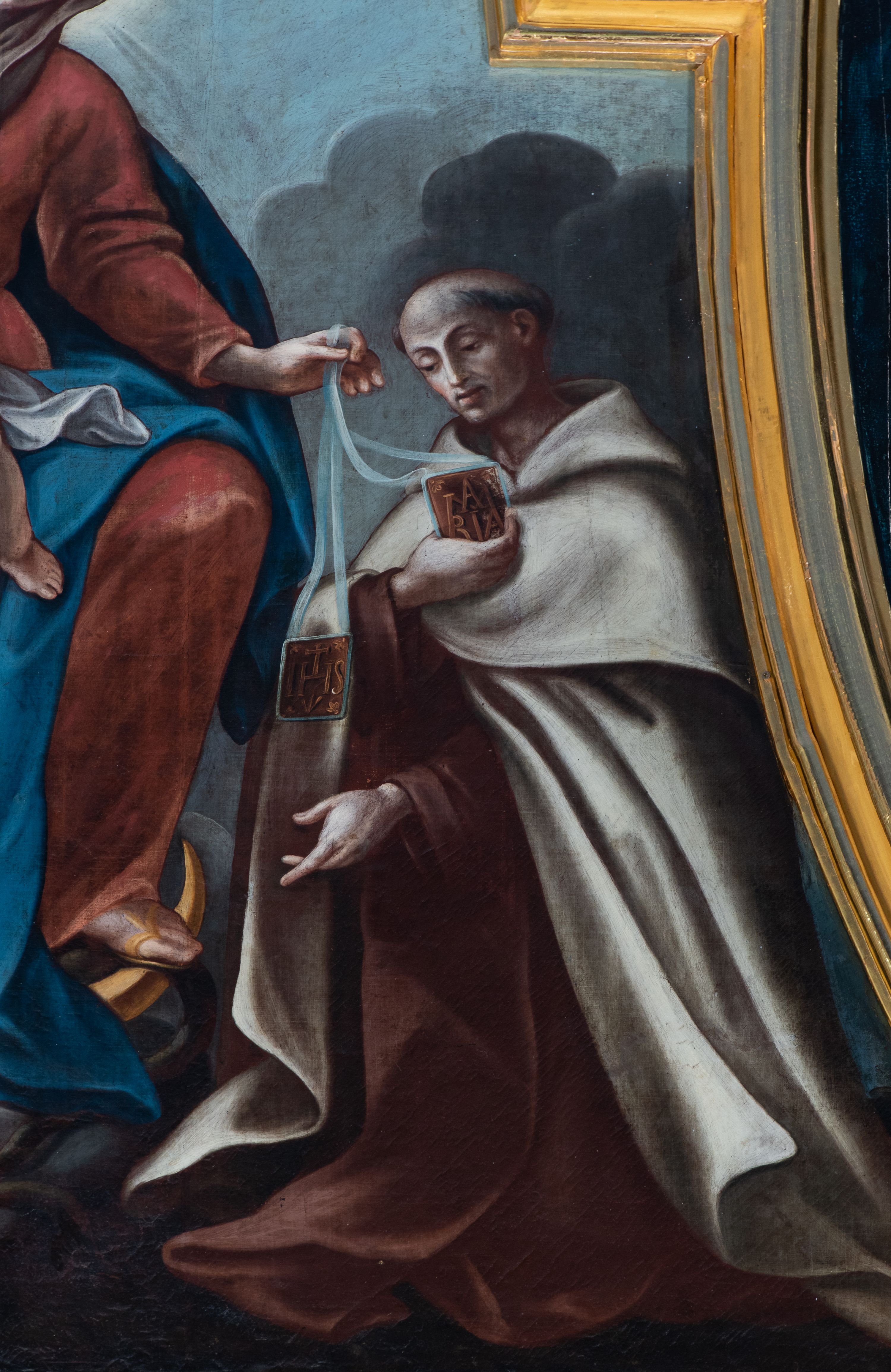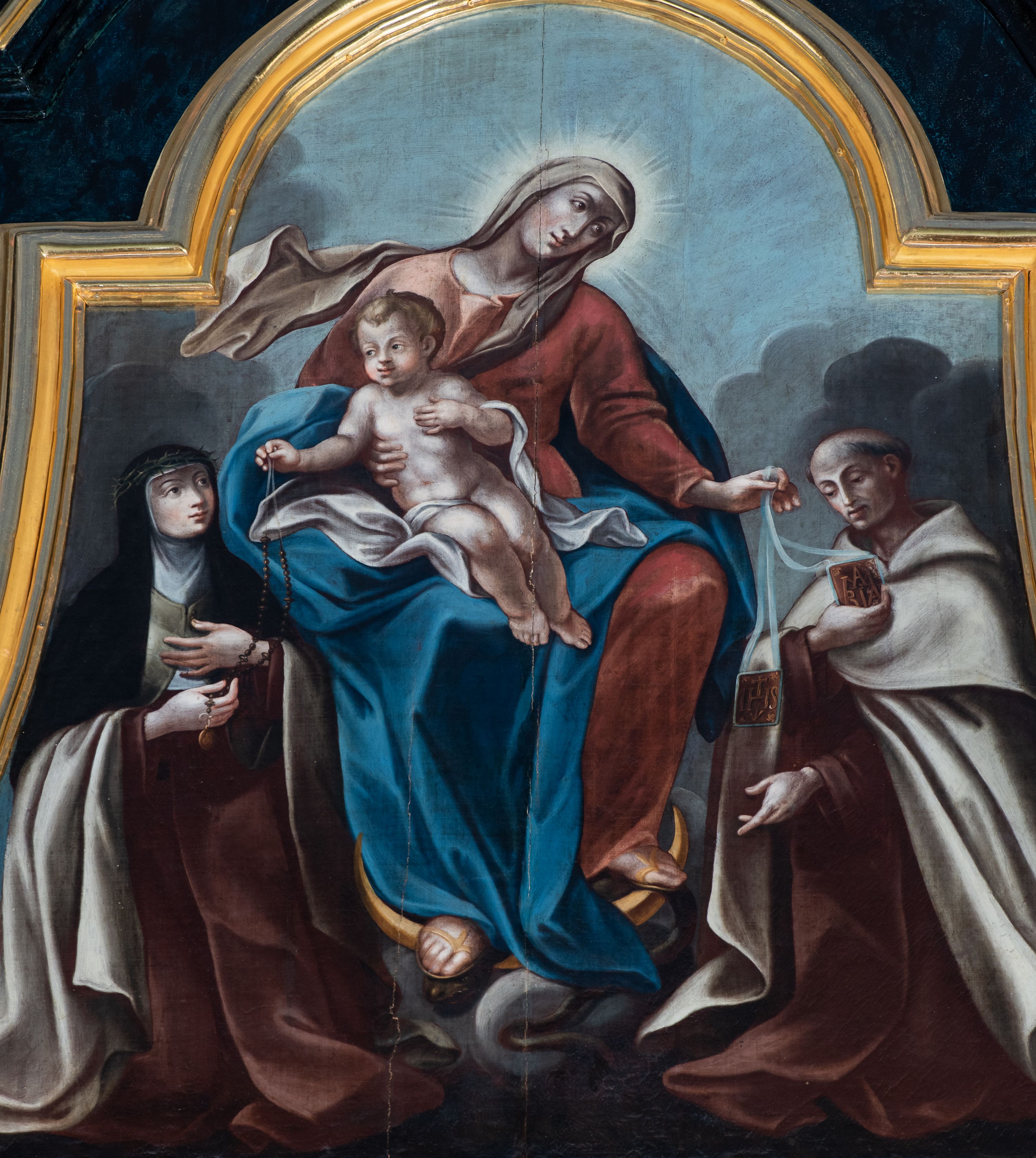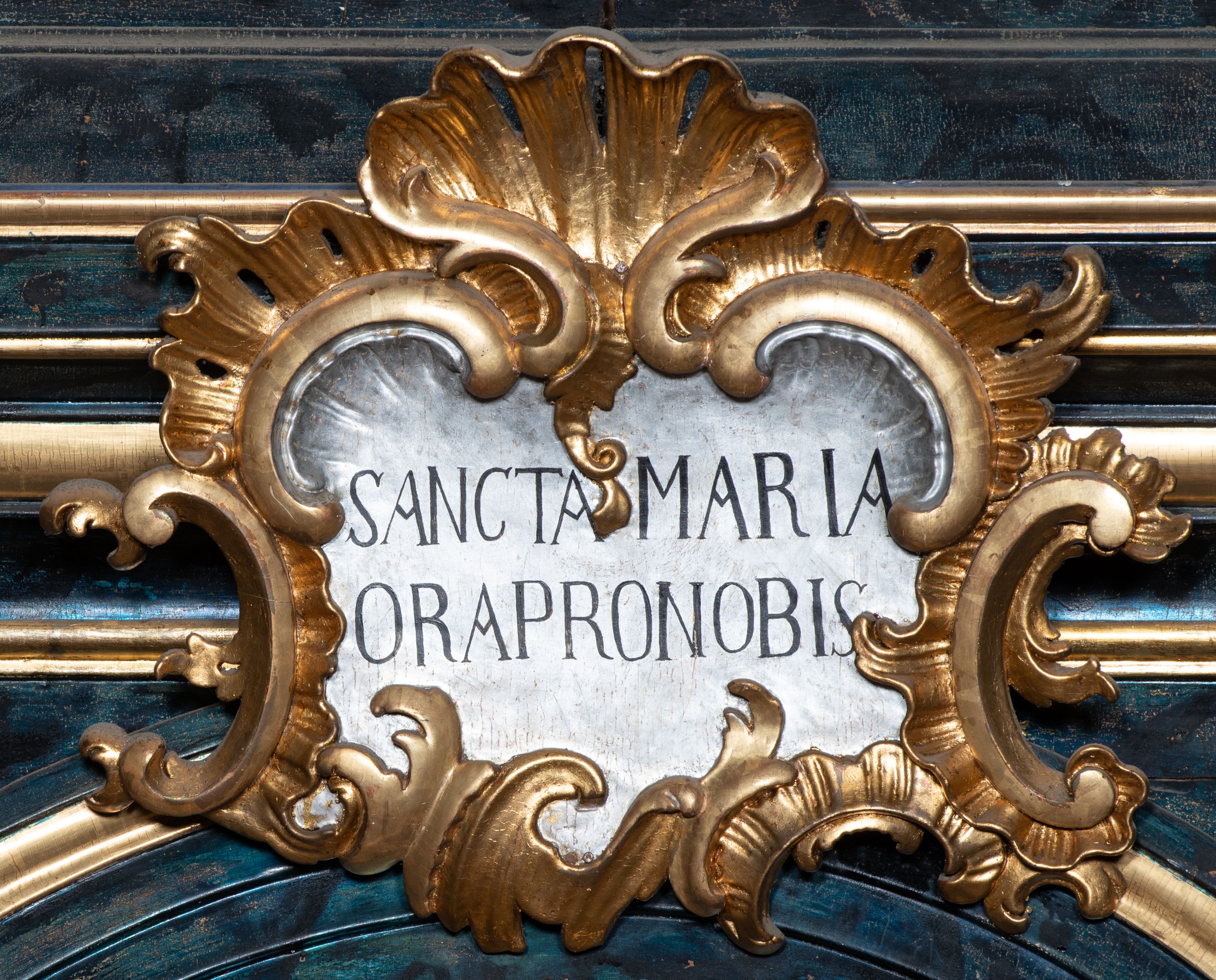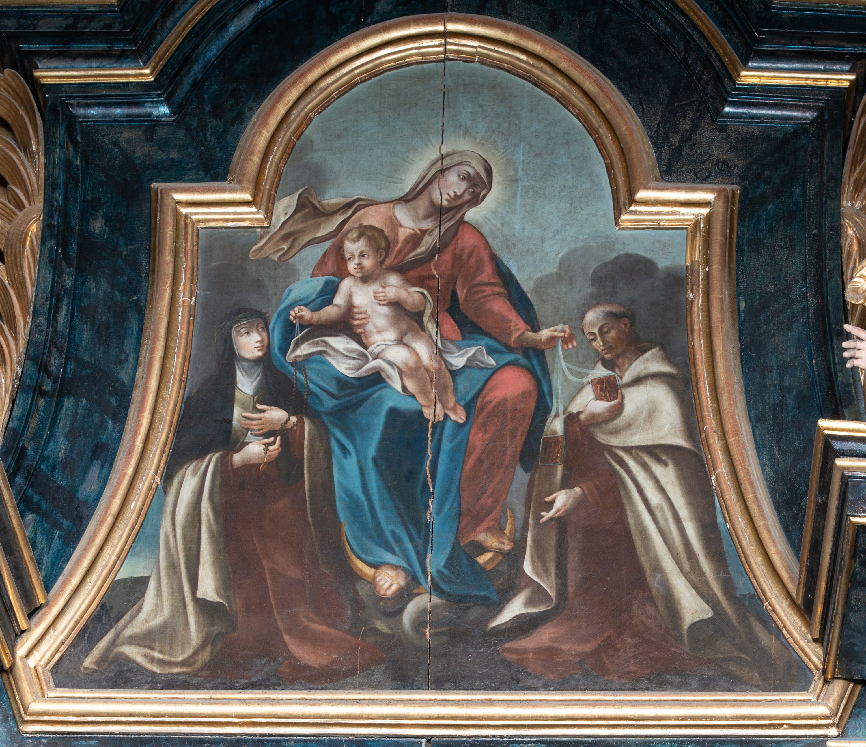 Antepedium ujęte profilowaną ramą, w polu malowana płycina w formie leżącego prostokąta o wklęsłych narożach, wypełniona wicią roślinną z różami, z kartuszem w centrum. W narożach przedstawienia ptaków na gałęziach. W polu kartusza ukazana półpostać Matki Boskiej Szkaplerznej unoszącej się nad duszami czyśćcowymi, na tle nieba. Retabulum ustawione na wysokim cokole, szerszym od nastawy, z wyłamanymi czterema prostopadłościanami. Nastawa ujęta parą zdwojonych pilastrów i parą stojących przed nimi kolumn o kapitelach kompozytowych, dźwigających pełne belkowanie, wyłamane na ich osi, z architrawem przyjmującym nad polem środkowym formę łuku odcinkowego. Na belkowaniu fragmenty półkolistego, przerwanego przyczółka z siedzącymi puttami. W polu centralnym wnęka w formie stojącego prostokąta zamkniętego łukiem półkolistym nadwieszonym z uskokiem, ujęta profilowaną ramą, z mniejszym obrazem Matki Boskiej z Dzieciątkiem w kształcie stojącego prostokąta. Powyżej, w podłuczu monogram Marii. Nad wnęką, w polu belkowania rocaille'owy kartusz z napisem „SANCTA MARIA / ORA PRO NOBIS”. Na skrajnych partiach cokołu ustawione figury św. Joachima i św. Józefa. Zwieńczenie w formie zbliżonej do trapezu, ujętego spływami wolutowymi, zamkniętego fragmentem gzymsu w formie łuku półkolistego nadwieszonego. Flankowane liśćmi palmowymi, gzyms dekorowany rocaille'm. W polu obraz Matki Boskiej Szkaplerznej ze św. Szymonem Stockiem i św. Teresą z Avili w formie analogicznej do zwieńczenia, w profilowanej ramie. Struktura polichromowana na sposób imitujący marmoryzację w kolorze niebiesko-czarnym, profile i ornamentyka złocone, detal srebrzony.