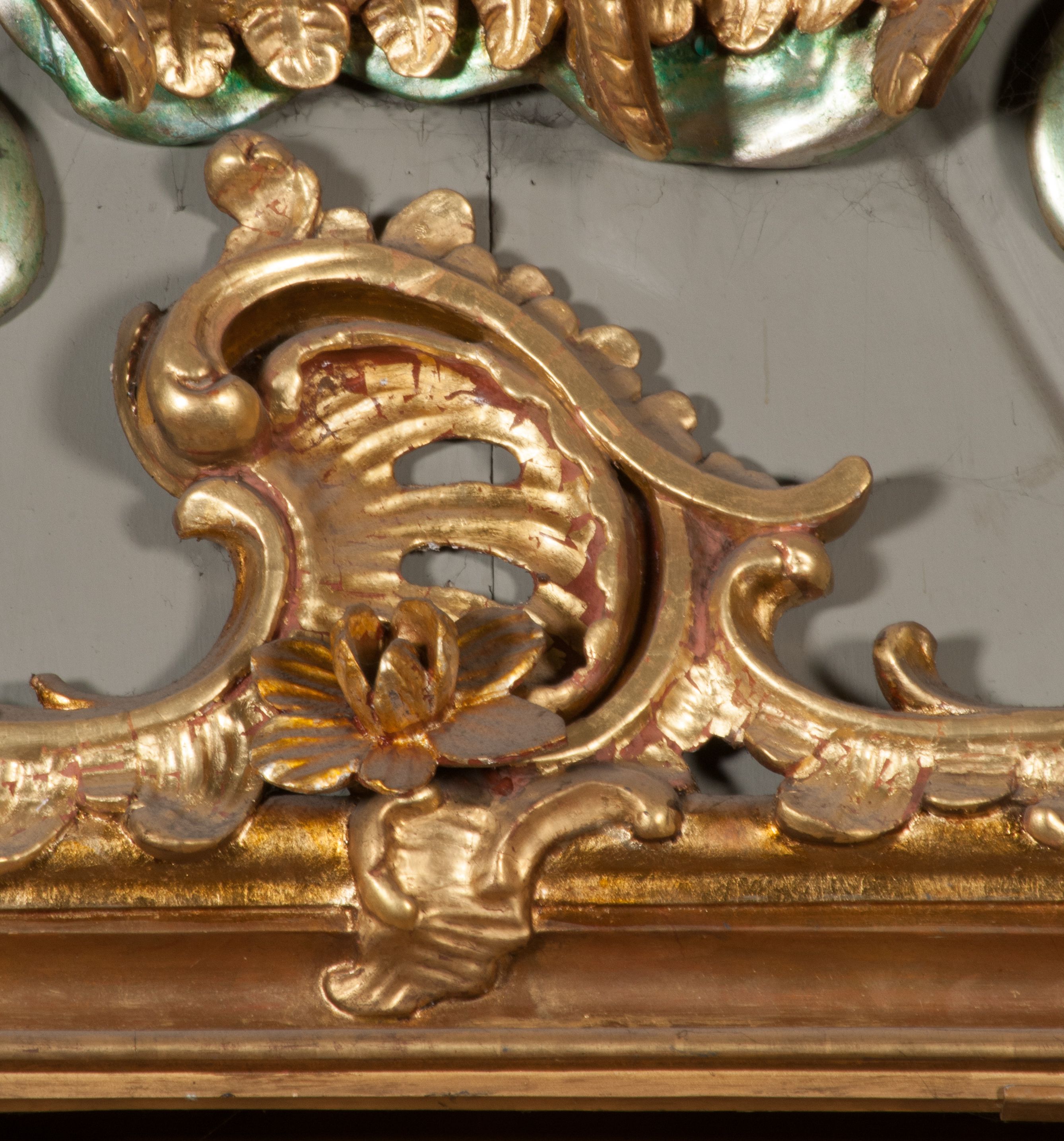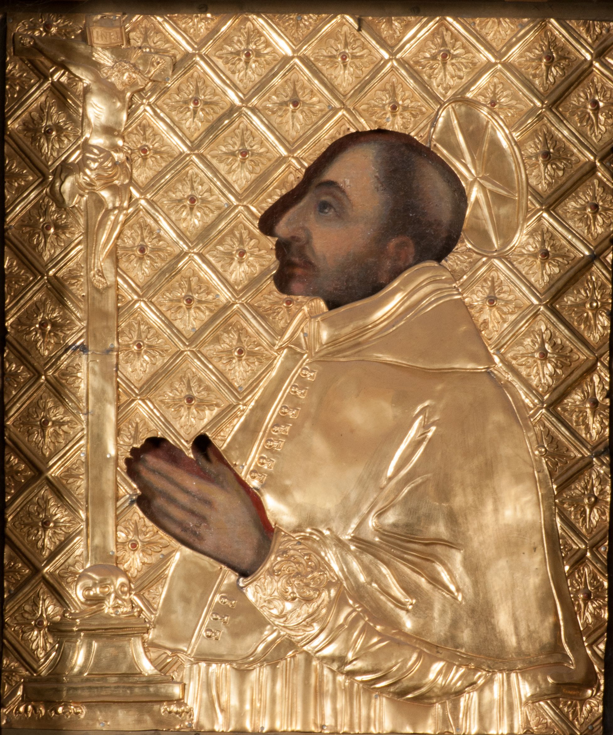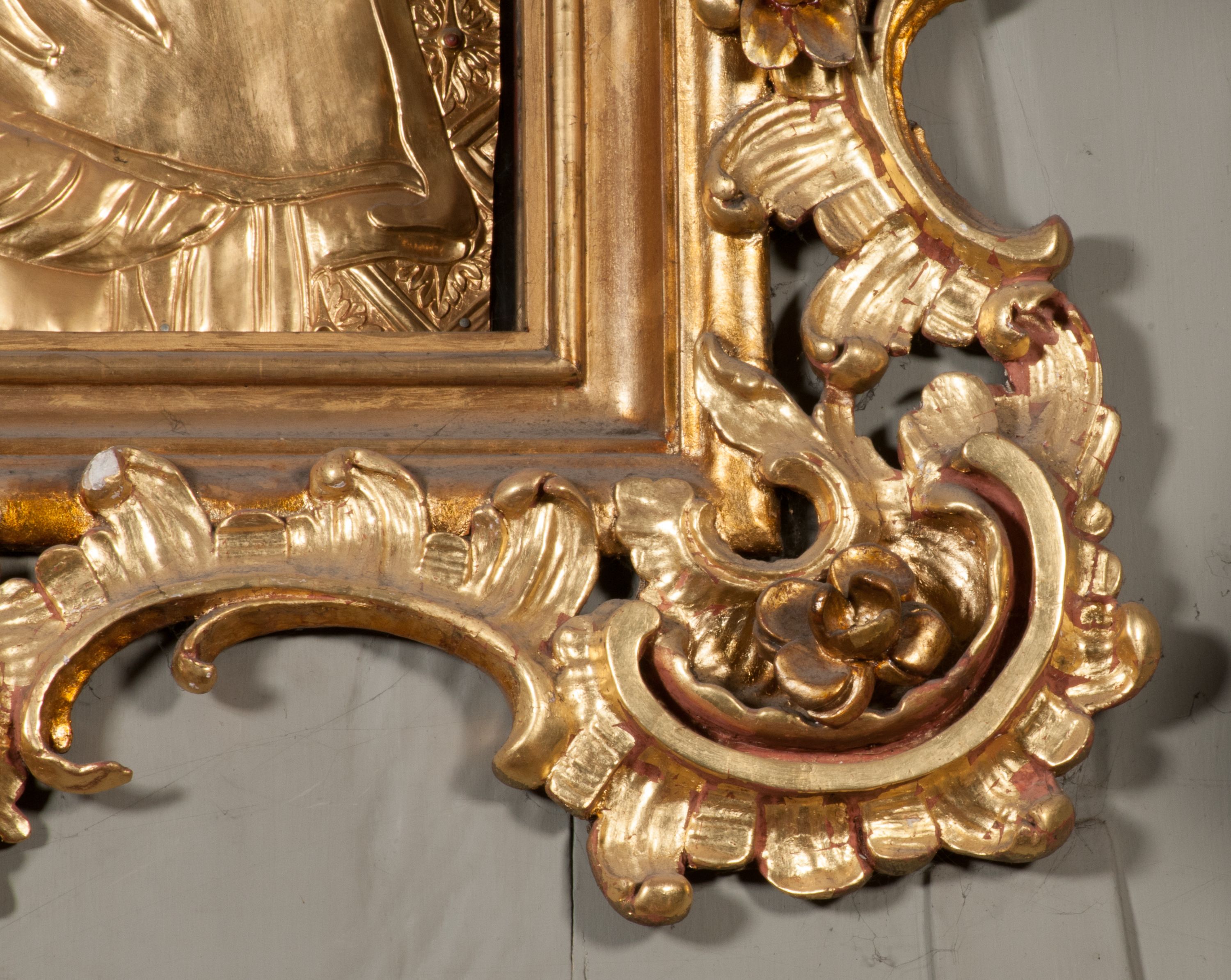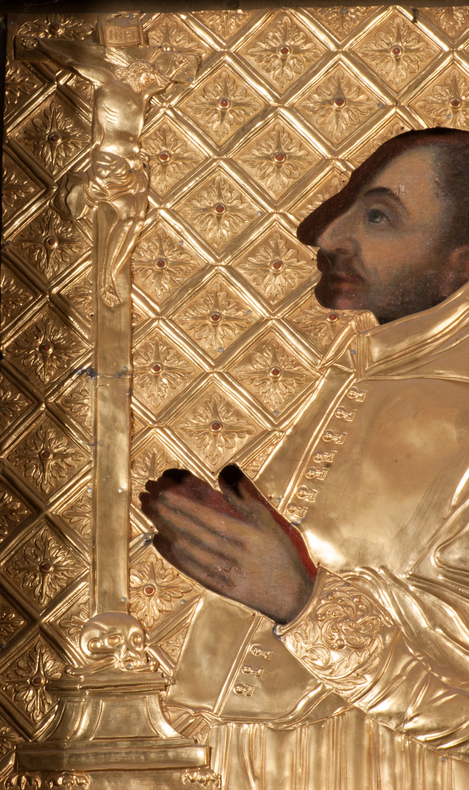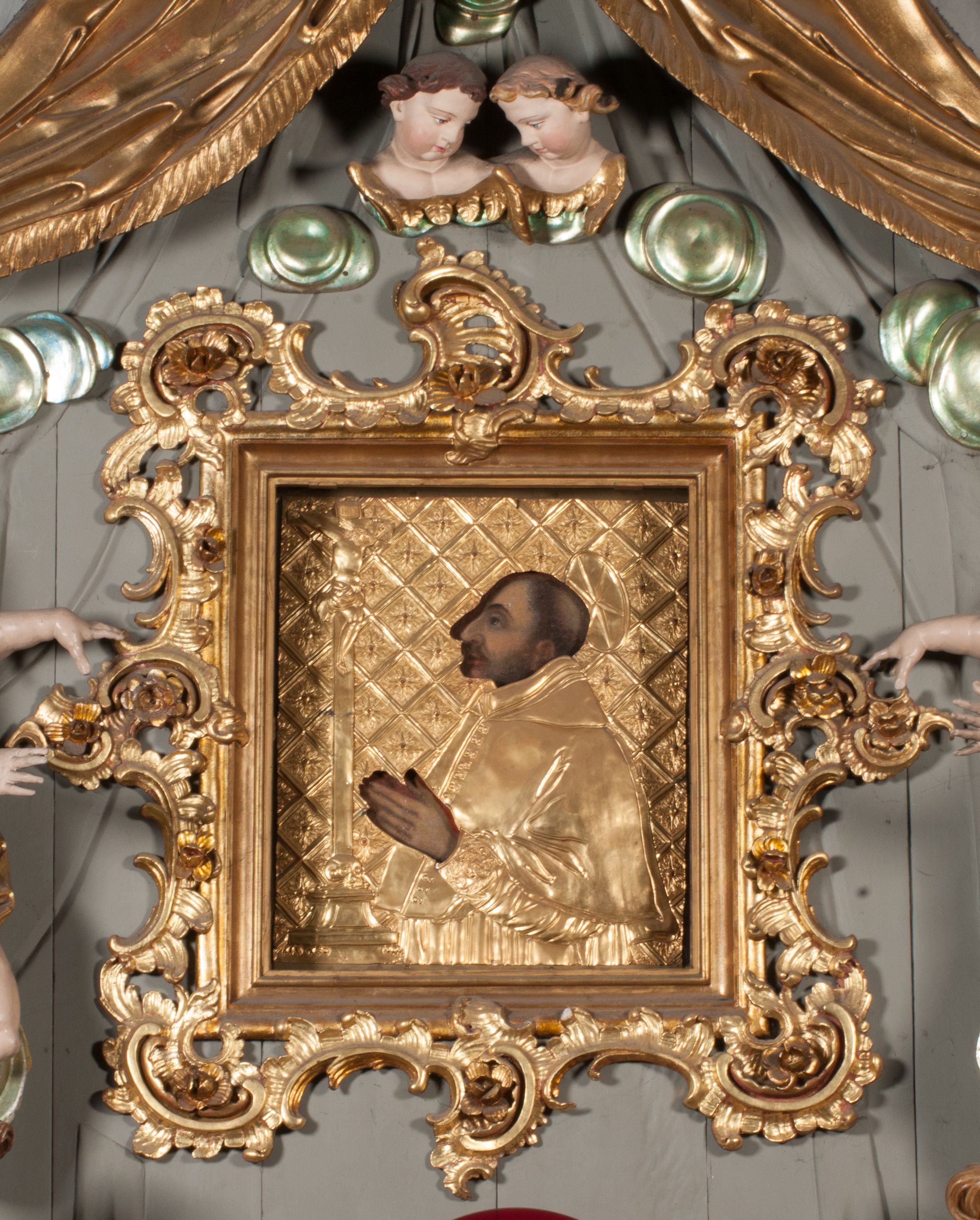 Paludament podwiązany po bokach sznurem z chwostami, podtrzymywany przez putta, lamowany frędzlą, zwieńczony baldachimem utworzonym z fragmentu wklęsło-wypukłego gzymsu z lambrekinem. W polu wnęka w kształcie stojącego prostokąta ujęta profilowaną ramą i rocaille'm, z obrazem św. Karola Boromeusza. Nad obrazem rzeźbione obłoki i dwie uskrzydlone główki anielskie, po bokach nadlatujące dwa putta. Paludament polichromowany wewnątrz w kolorze szaro-brązowym, zewnątrz złocony.