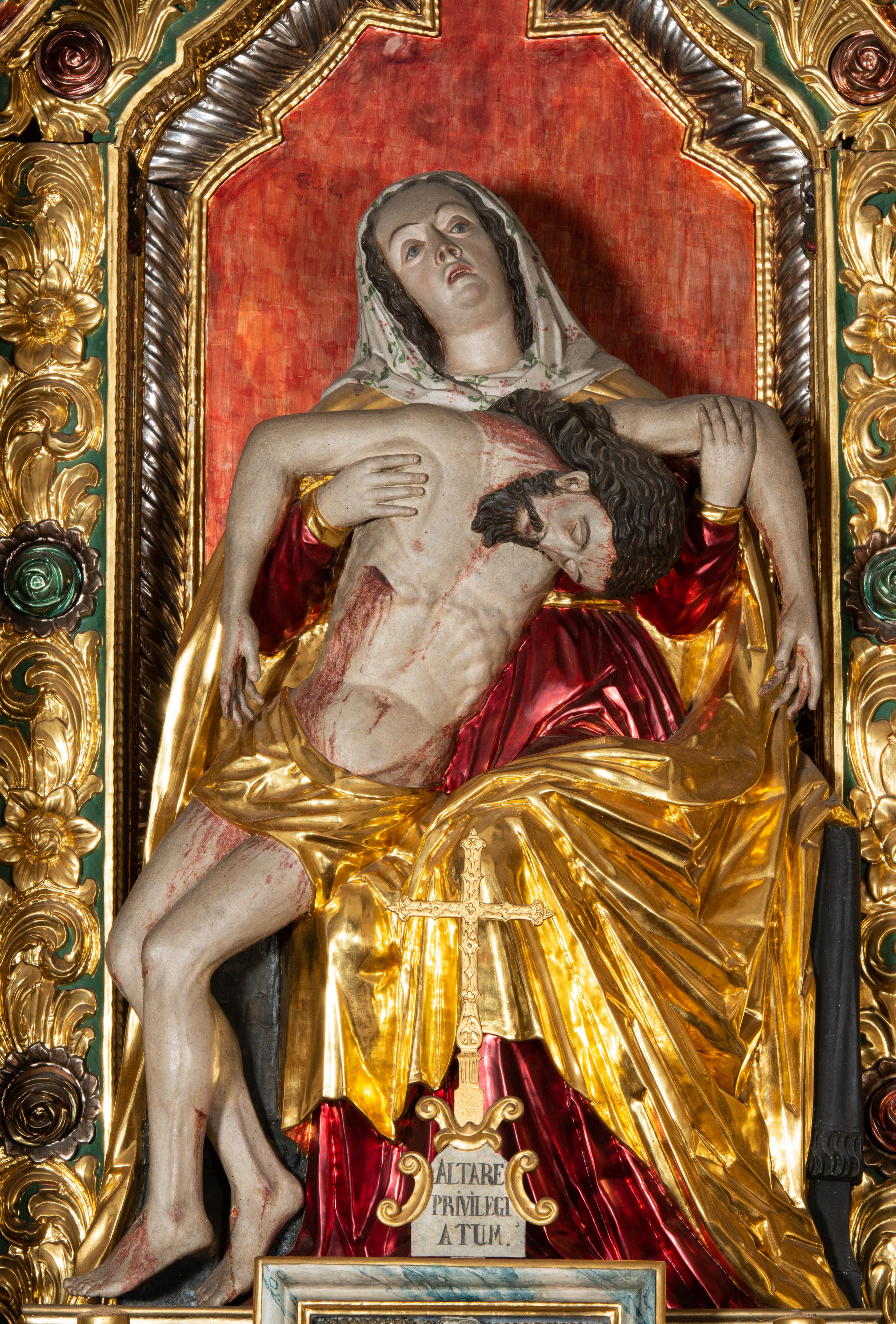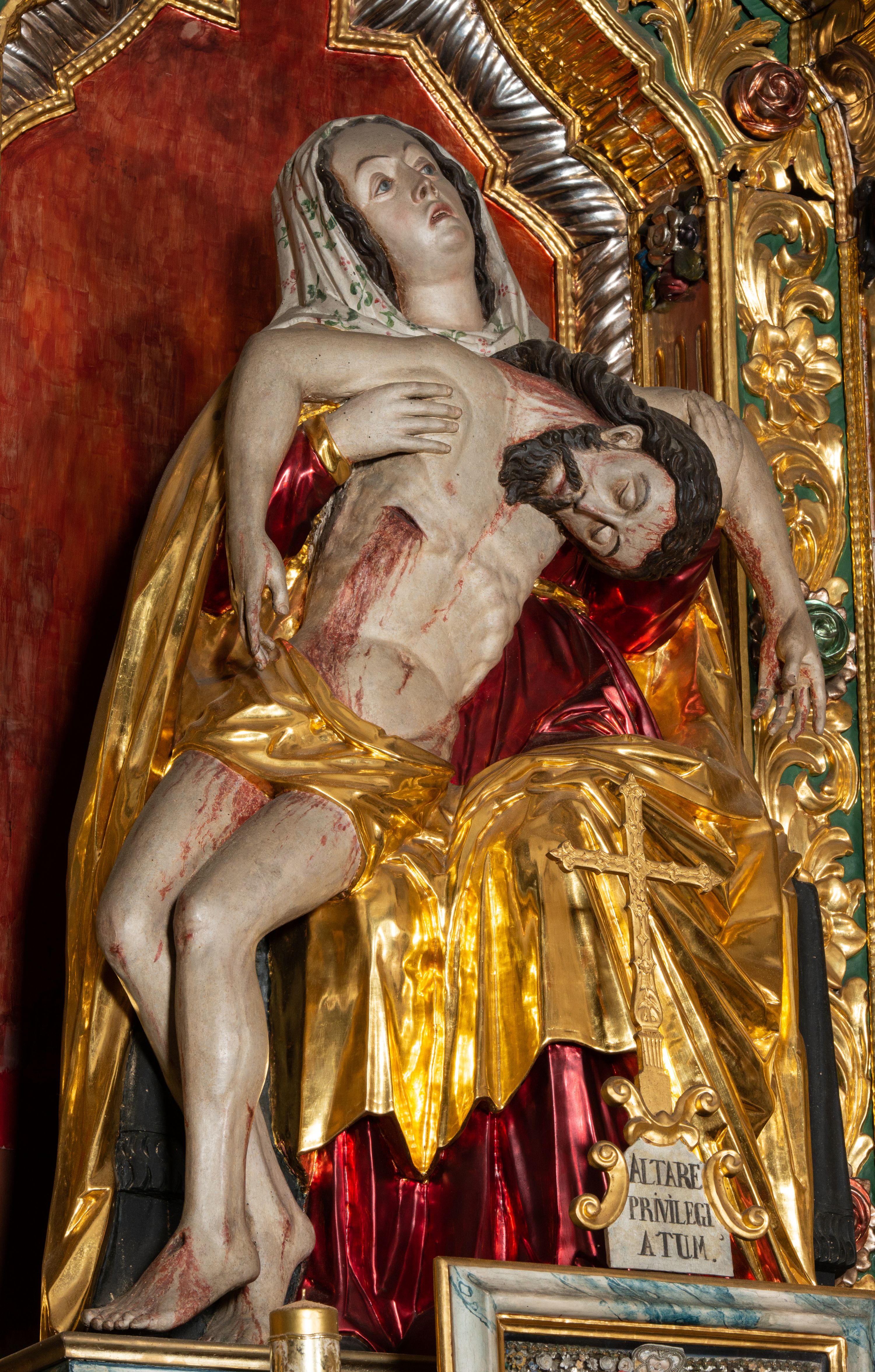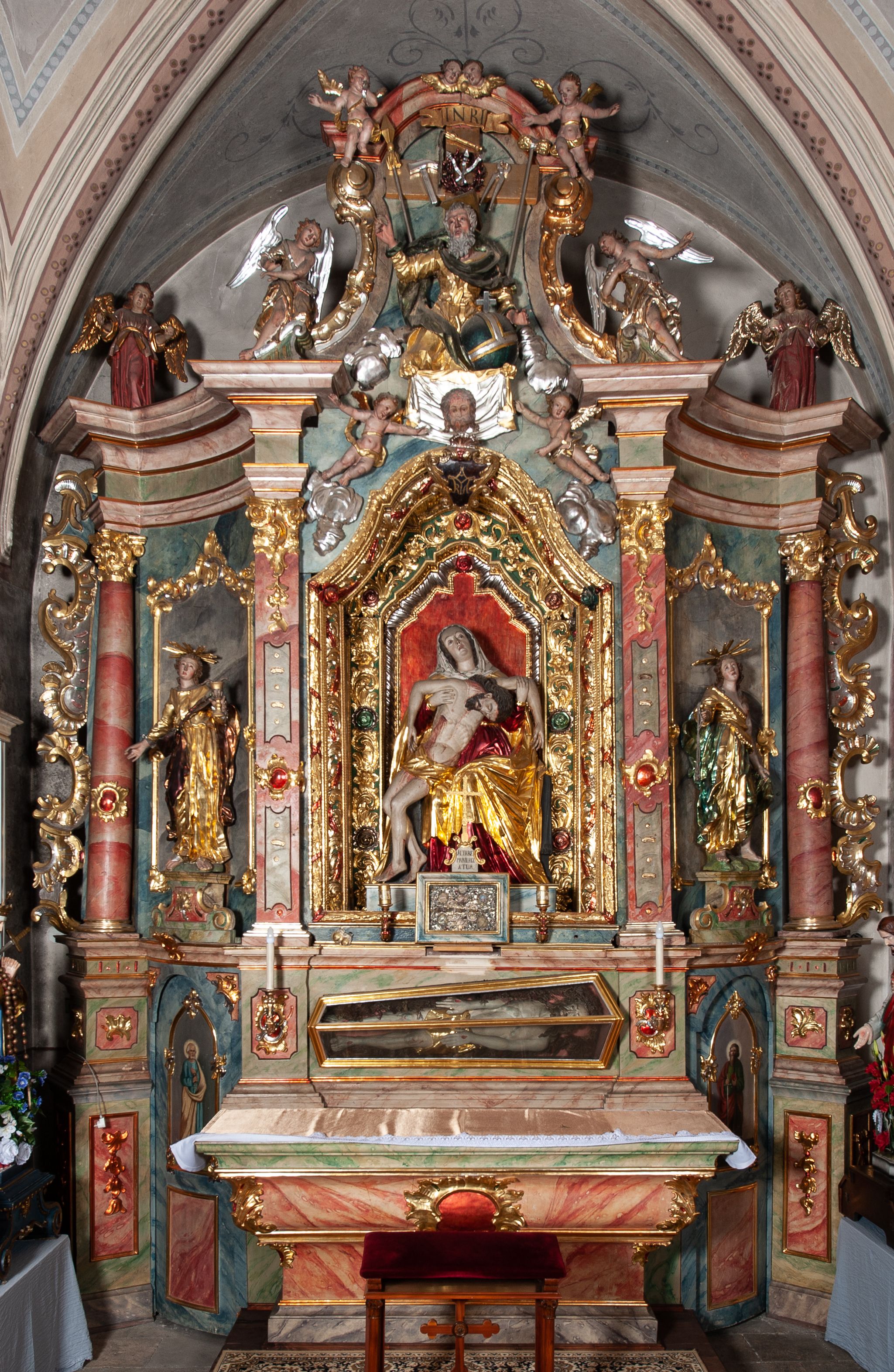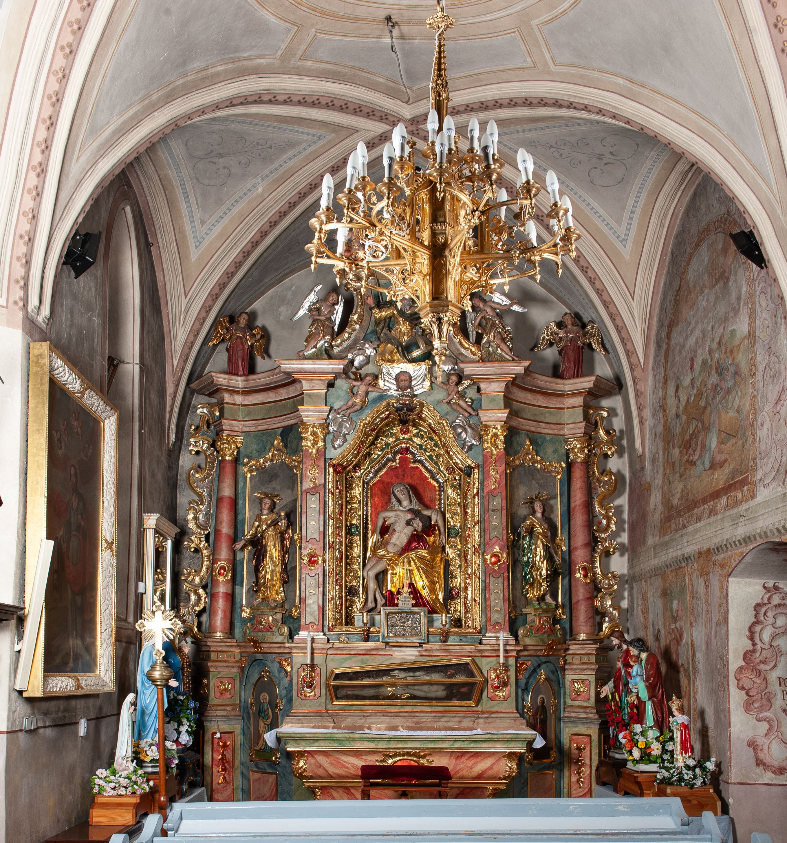 Ołtarz drewniany, rzeźbiony, polichromowany, złocony, srebrzony; architektoniczny, trójosiowy, z wydzieloną częścią cokołową, jednokondygnacyjny, ze zwieńczeniem. W predelli oszklona trumienka z rzeźbą Chrystusa w grobie. Pole środkowe nastawy ujęte dwoma czworobocznymi filarami o kompozytowych kapitelach. Pola boczne wklęsłe i cofnięte od lica pola środkowego flankowane kolumnami o gładkich trzonach i kompozytowych kapitelach. Podpory dźwigają pełne belkowanie i gzyms, przerwane nad polem środkowym. W polu środkowym w niszy rzeźba Pieta. Po bokach, na tle filarów, umieszczone dwa okazałe anioły w dynamicznych pozach, z rozłożonymi skrzydłami. Ponad niszą płaskorzeźbiona Chusta św. Weroniki rozpostarta przez dwa uskrzydlone putta ze stopami wspartymi na obłokach. W polach bocznych umieszczone na konsolach rzeźby: Św. Jan Ewangelista (po lewej) i Św. Maria Magdalena (po prawej). W zwieńczeniu rzeźbione przedstawienie tronującego Boga Ojca oraz Arma Christi; wokół putta i uskrzydlone główki aniołków. W osiach podpór rzeźby uskrzydlonych aniołów. Rokokowy ołtarz zapewne z warsztatu Johannesa Feega z Kiežmarku, ufundowany przez proboszcza Jana Gorelewicza w latach 1765-1769.