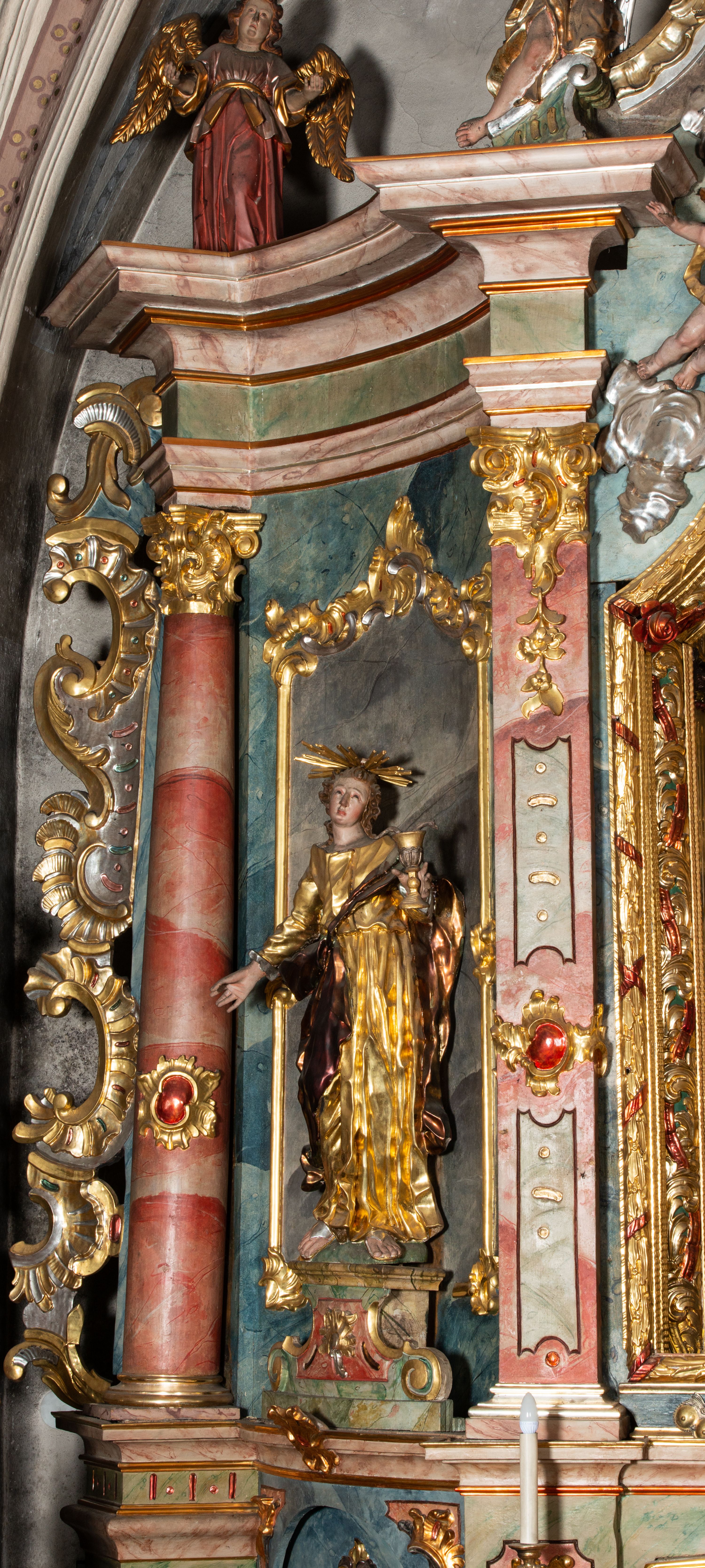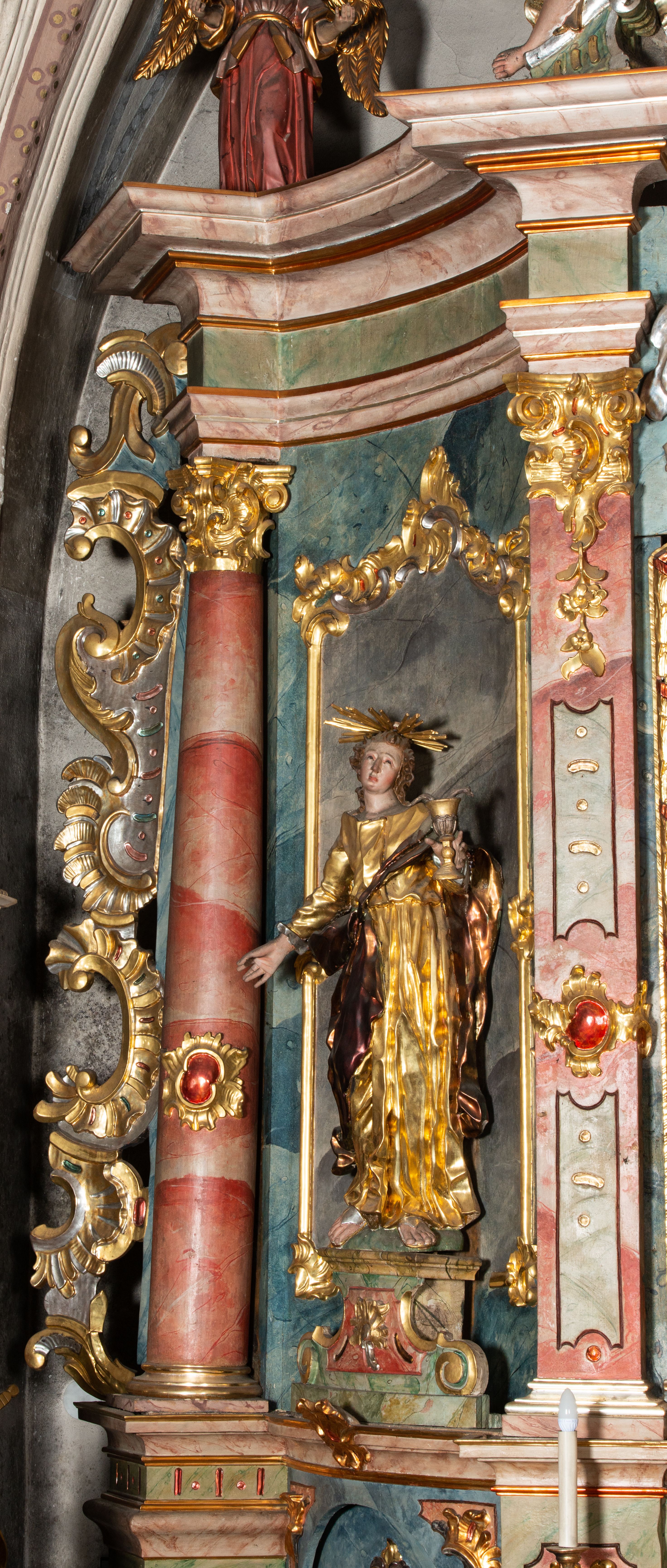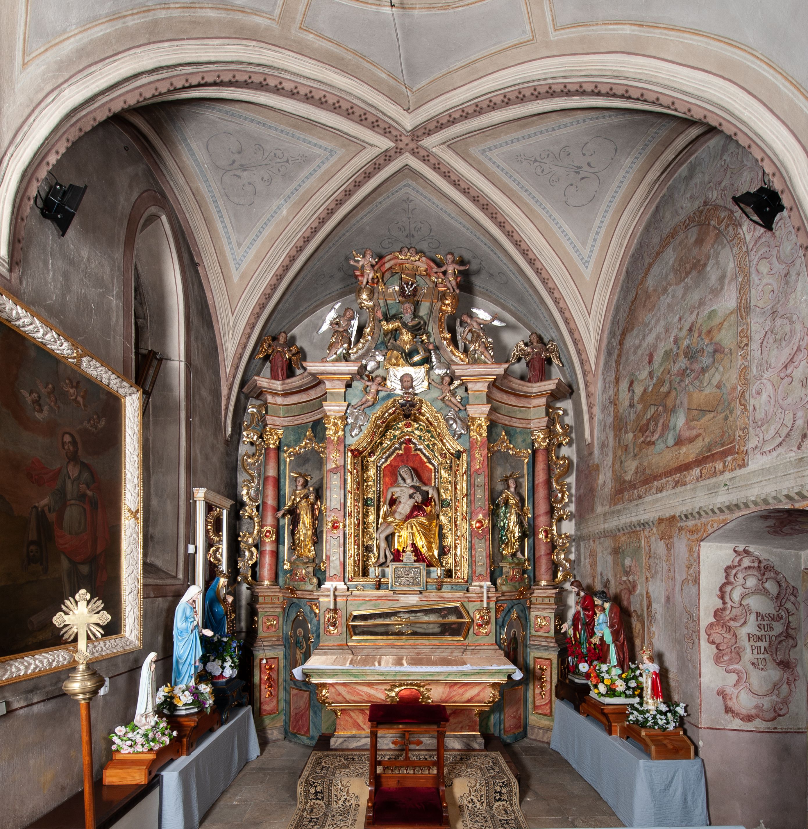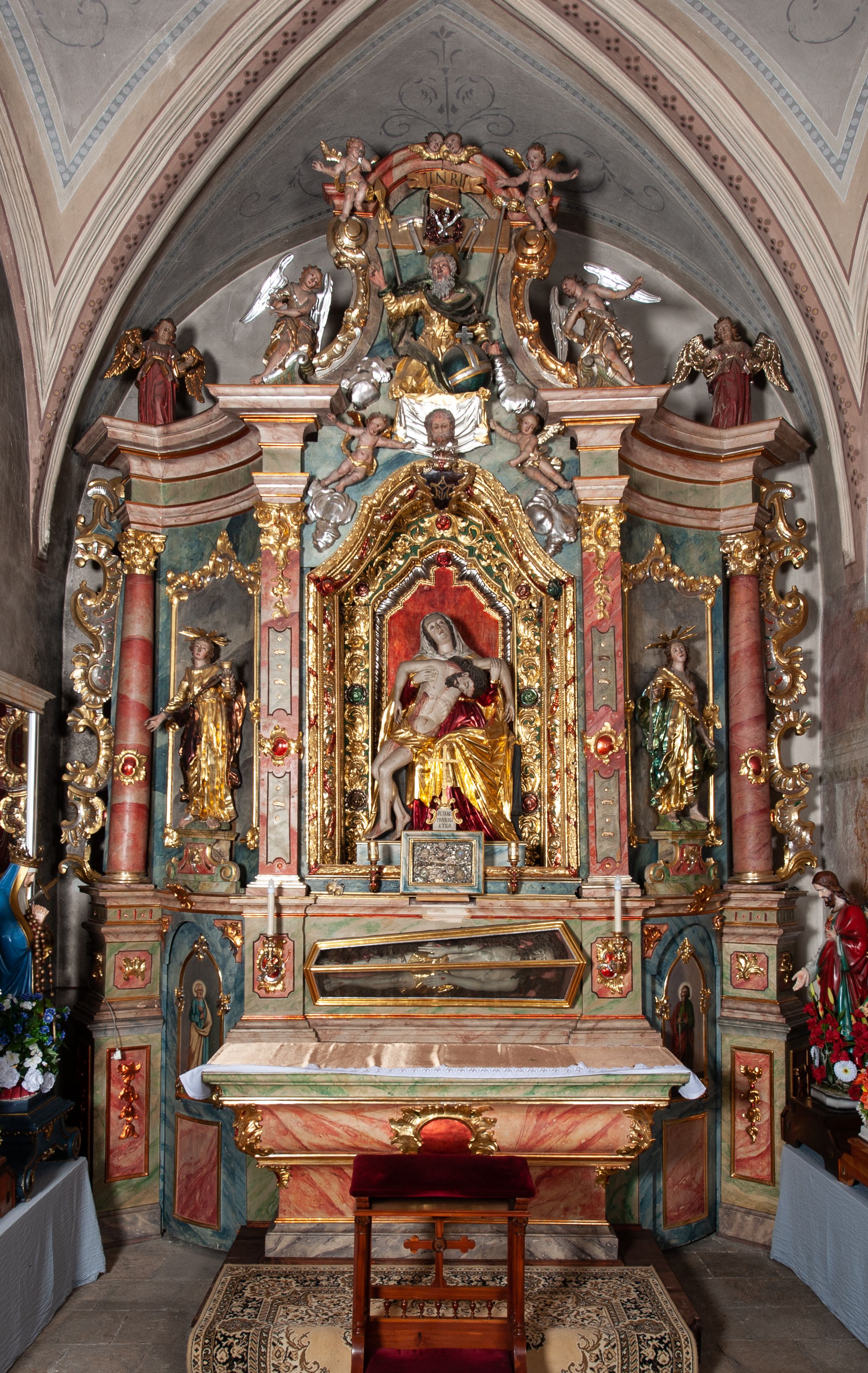 Rokokowy ołtarz zapewne z warsztatu Johannesa Feega z Kiežmarku. Nastawa prezentuje spójny, pasyjny program ikonograficzny.