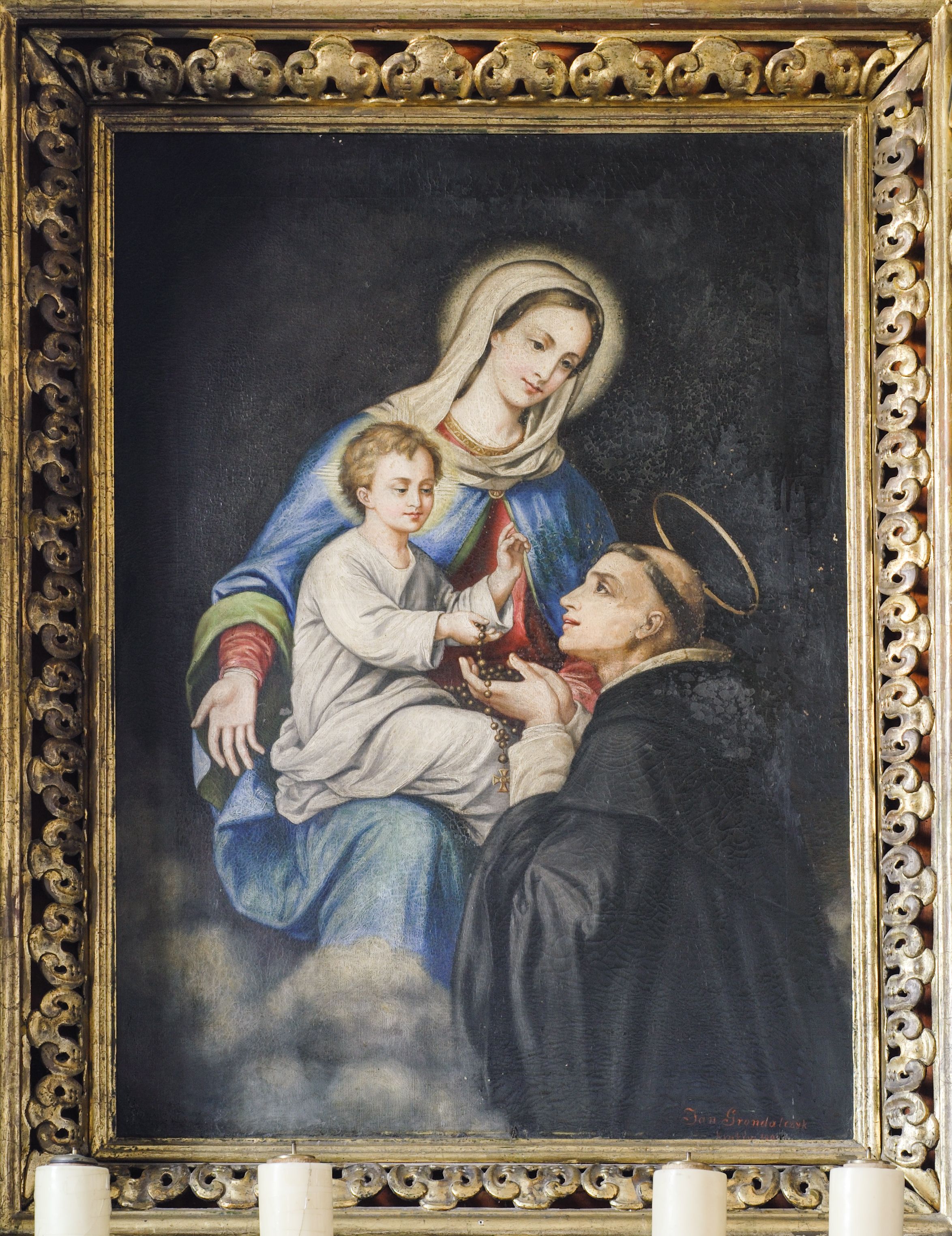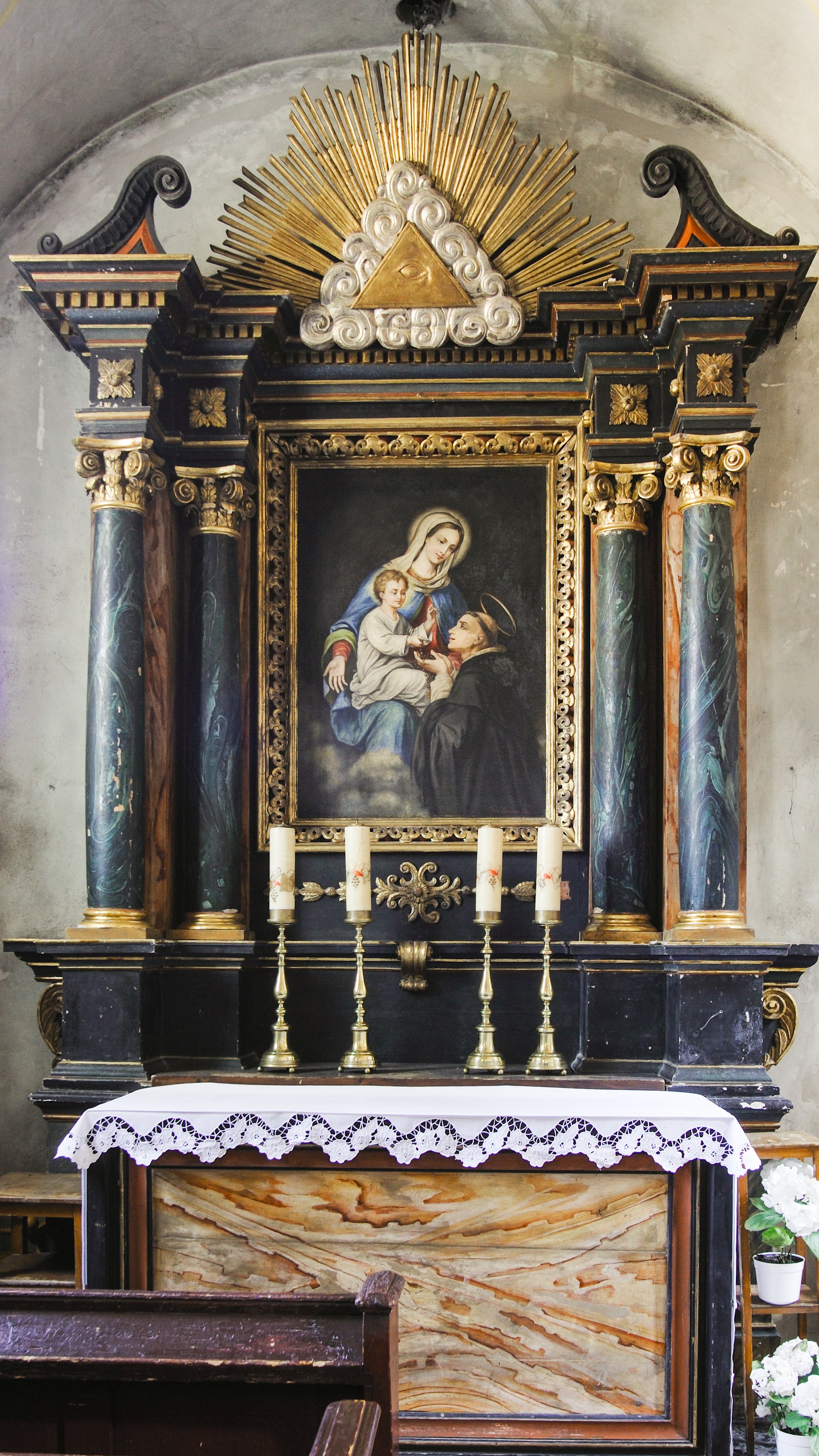 Prostopadłościenny ołtarz z retabulum posadowionym na dwustrefowym cokole. Nastawa ujęta parami kolumn, z których zewnętrzne są wysunięte do przodu, a środkowe cofnięte do tyłu, z kapitelami kompozytowymi, podtrzymującymi przełamujące się nad nimi belkowanie, z wydatnym gzymsem ozdobionym kostkowaniem. Na osi kolumn skrajnych faliste naczółki, nad częścią środkową Oko Opatrzności obramione chmurami, na tle promienistej glorii. Pośrodku nastawy prostokątny obraz w profilowanej ramie wypełnionej kwiatonami z wyobrażeniem Matki Boskiej Różańcowej i św. Dominikiem.