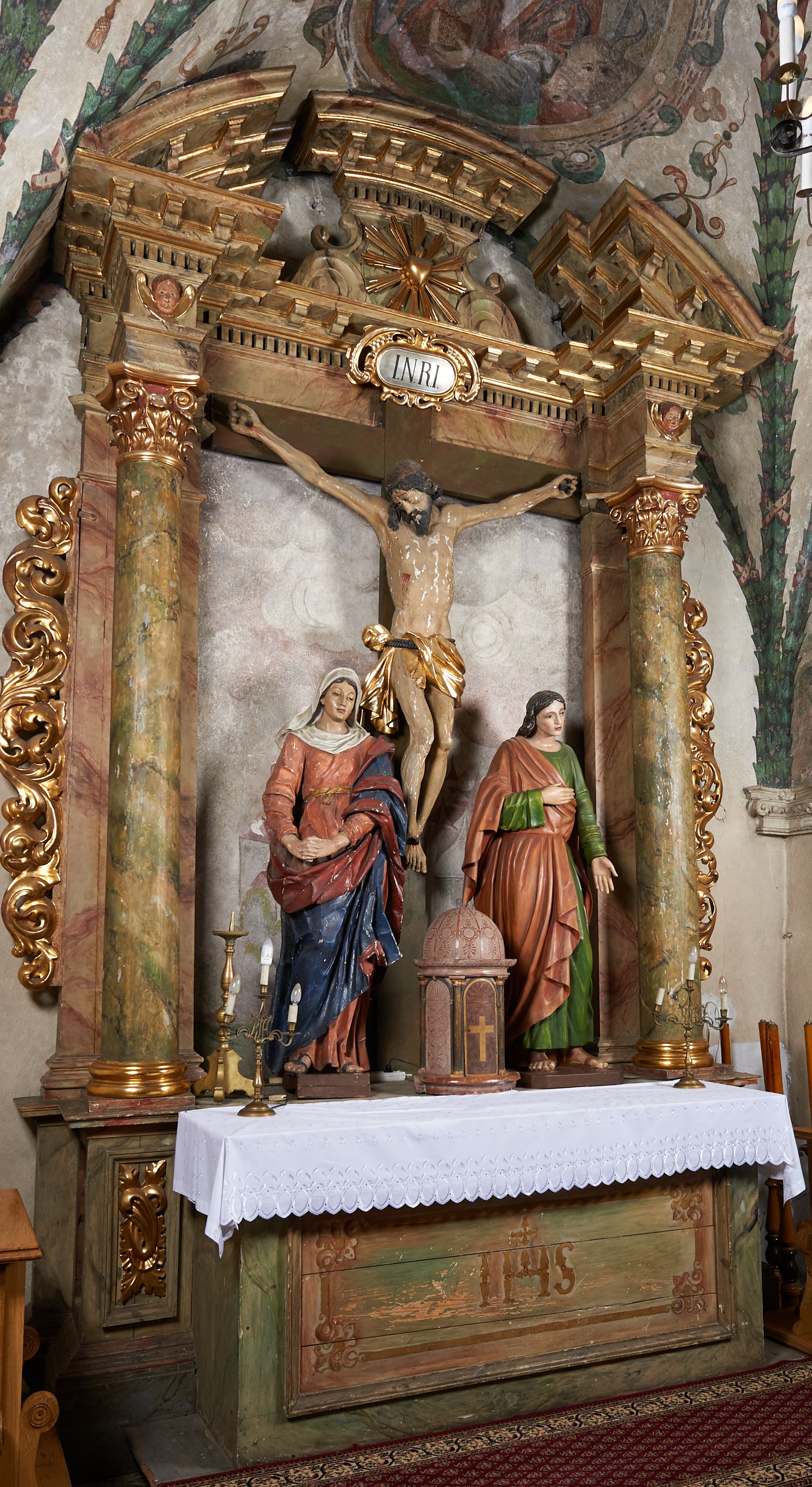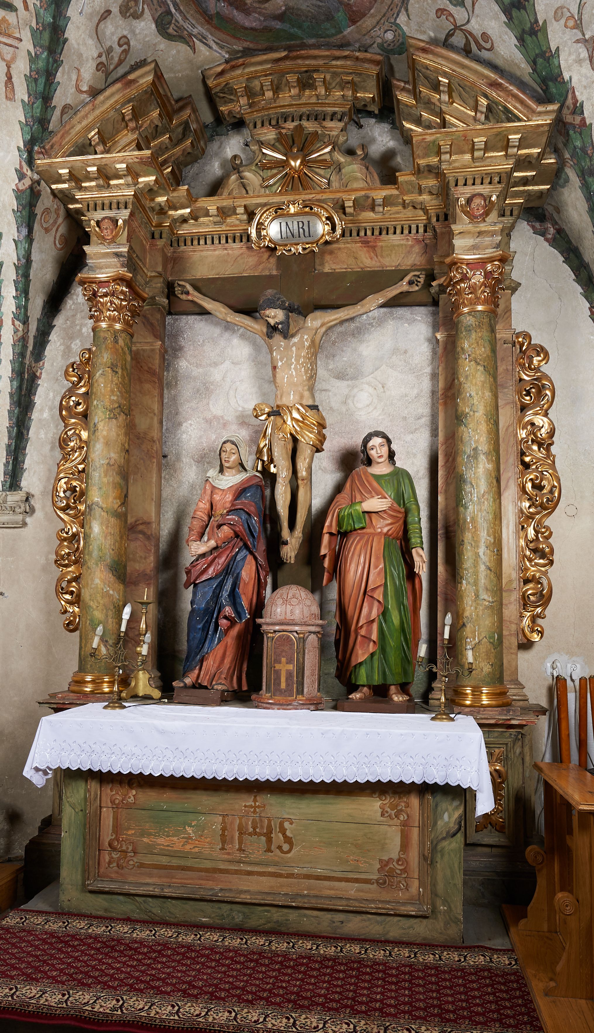 Ołtarz architektoniczny, jednoosiowy, jednokondygnacyjny, ze zwieńczeniem. Mensa drewniana z marmurowym portatylem, na prostopadłościennej skrzyni. Antepedium ujęte profilowaną ramą z malowanym obramieniem w polu oraz literami IHS. Retabulum ujęte parą kolumn o kapitelach kompozytowych, na cokołach, dźwigających występujące nad podporami pełne belkowanie i wydatny gzyms oraz przerwany półkolisty przyczółek. W polu środkowym rzeźbiona Grupa Ukrzyżowania na malowanym tle. W zwieńczeniu serce gorejące w glorii promienistej. Zwieńczenie ujęte spływami wolutowymi i cęgami, zamknięte gzymsem wygiętym łukiem odcinkowym. Cokoły kolumn zdobione płycinami z dekoracją roślinną. Nastawa flankowana uszami utworzonymi z motywów mięsistego akantu. Fryz dekorowany uskrzydlonymi główkami anielskimi. Nastawa i antepedium marmoryzowane w odcieniach seledynowych i beżoworóżowych, detale architektoniczne i ornamentyka złocone.