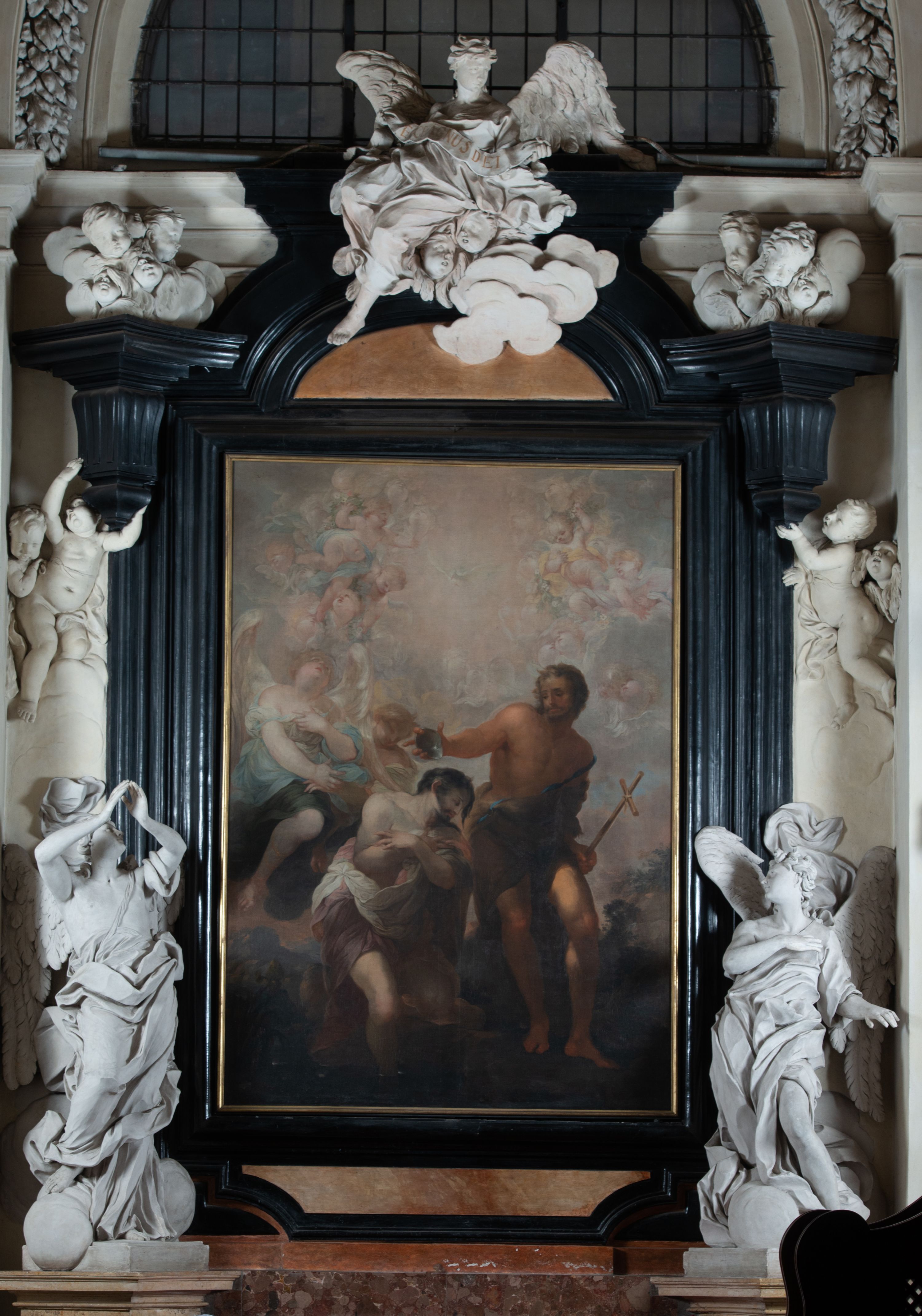 Ołtarz św. Jana Chrzciciela powstał w latach 1695-1703. Jego autorem jest Baltazar Fontana i jego warsztat. Nowatorski na ziemiach polskich typ nastawy z parą aniołów flankujących obraz został zaczerpnięty ze sztuki Rzymu. Źródłem inspiracji były ołtarze w kościele Santa Maria del Popolo. Także postać anioła po lewej stronie z uniesionymi do góry rękami znajduje podobieństwa w figurze Daniela w jaskini lwów, autorstwa Gian Lorenza Berniniego, znajdującej się w tym samym rzymskim kościele, w kaplicy Chigich.