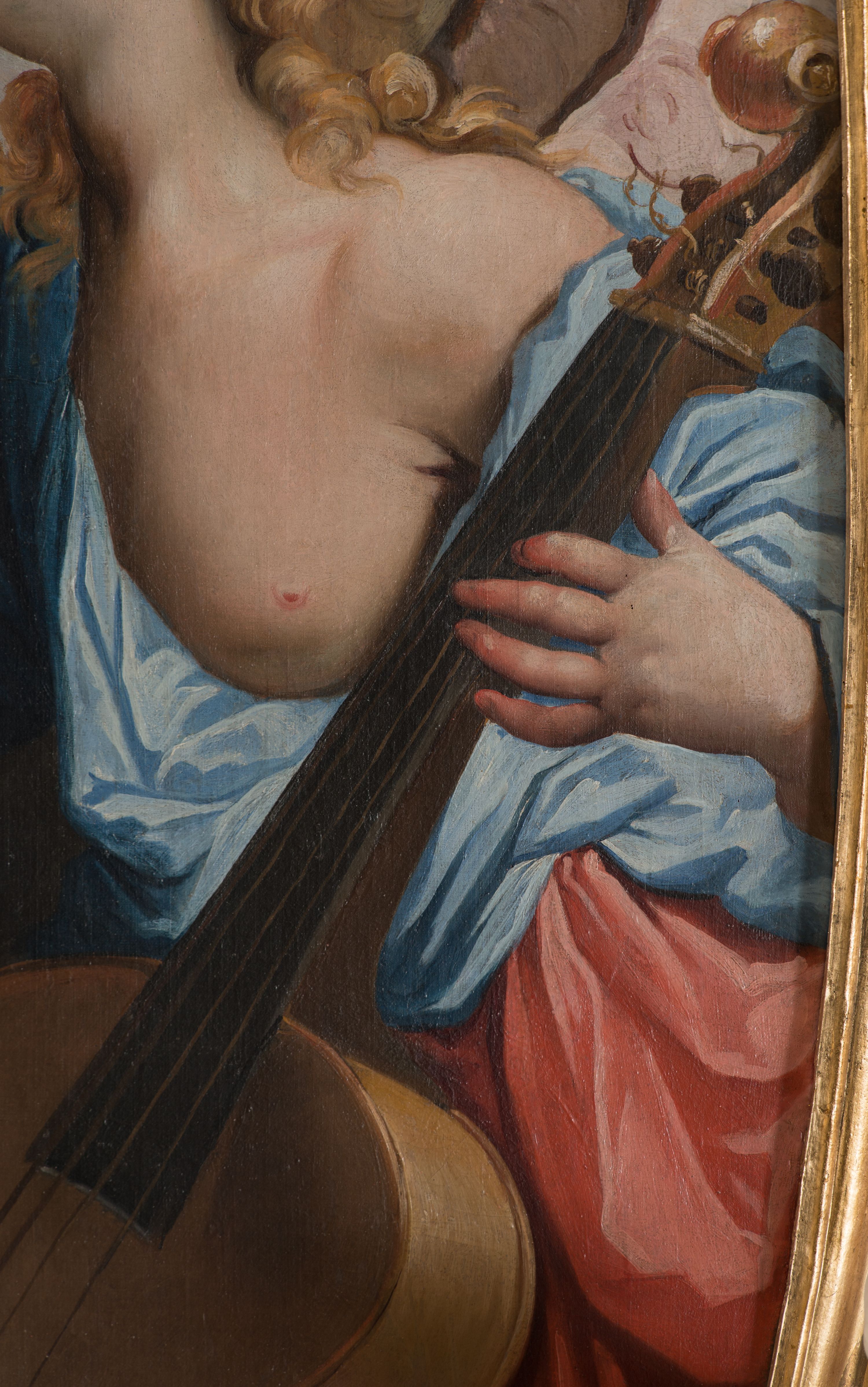 Na niskim postumencie o krawędzi przedniej zarysowanej linią falistą osadzony ołtarz w kształcie tumby, wybrzuszonej w górnej partii. Jego antepedium wypełnione marmoryzacją z owalnym, pustym polem i pękami różnokolorowych kwiatów. Po bokach ołtarza dwa ukośnie dostawione kamienne postumenty, na których dwie figury aniołów flankujących owalny obraz w złoconej ramie z przedstawieniem św. Józefa z Jezusem i grającym na kontrabasie aniołem. Malowidło obwiedzione dekoracją sztukatorską w formie obłoków z główkami lub postaciami aniołów i zwieńczone glorią promienistą z gołębicą Ducha Świętego. Anioły klęczące na postumentach ukazane są w poruszonych pozach, w obficie drapowanych szatach, tworzących grube, mięsiste poły, ze skrzydłami o gęstych piórach. Anioł po lewej stronie jest ukazany frontalnie, klęcząc na chmurze na prawym kolanie, z lewą noga wyprostowaną, z głową w trzech czwartych, zwróconą w swoją prawą stronę. Lewą ręką przytrzymuje ramę obrazu, prawą unosi w geście błogosławieństwa. Anioł po prawej stronie głowę kieruje ku obrazowi, jego ręce są uniesione na wysokości klatki piersiowej, dłoń lewą opuszcza, a prawą unosi. Nad górną częścią obrazu został ukazany anioł w pozycji niemalże leżącej, z rozłożonymi rękami, odziany w bogato drapowane szaty odsłaniające dolną część nogi. Duże skrzydła o gęstych piórach rozłożone są niesymetrycznie. Po przeciwnej stronie leży na chmurach nagie putto wśród modelowanych sumarycznie główek anielskich. Dolne partie wykonane z kamienia inkrustowanego czarnym marmurem i marmoryzacją z różnokolorowymi pękami kwiatów, w jasnych kolorach z czarnym polem antepedium z różnobarwnymi kwiatami, partie rzeźbiarskie białe, rama obrazu złocona, gloria bladoniebieska.