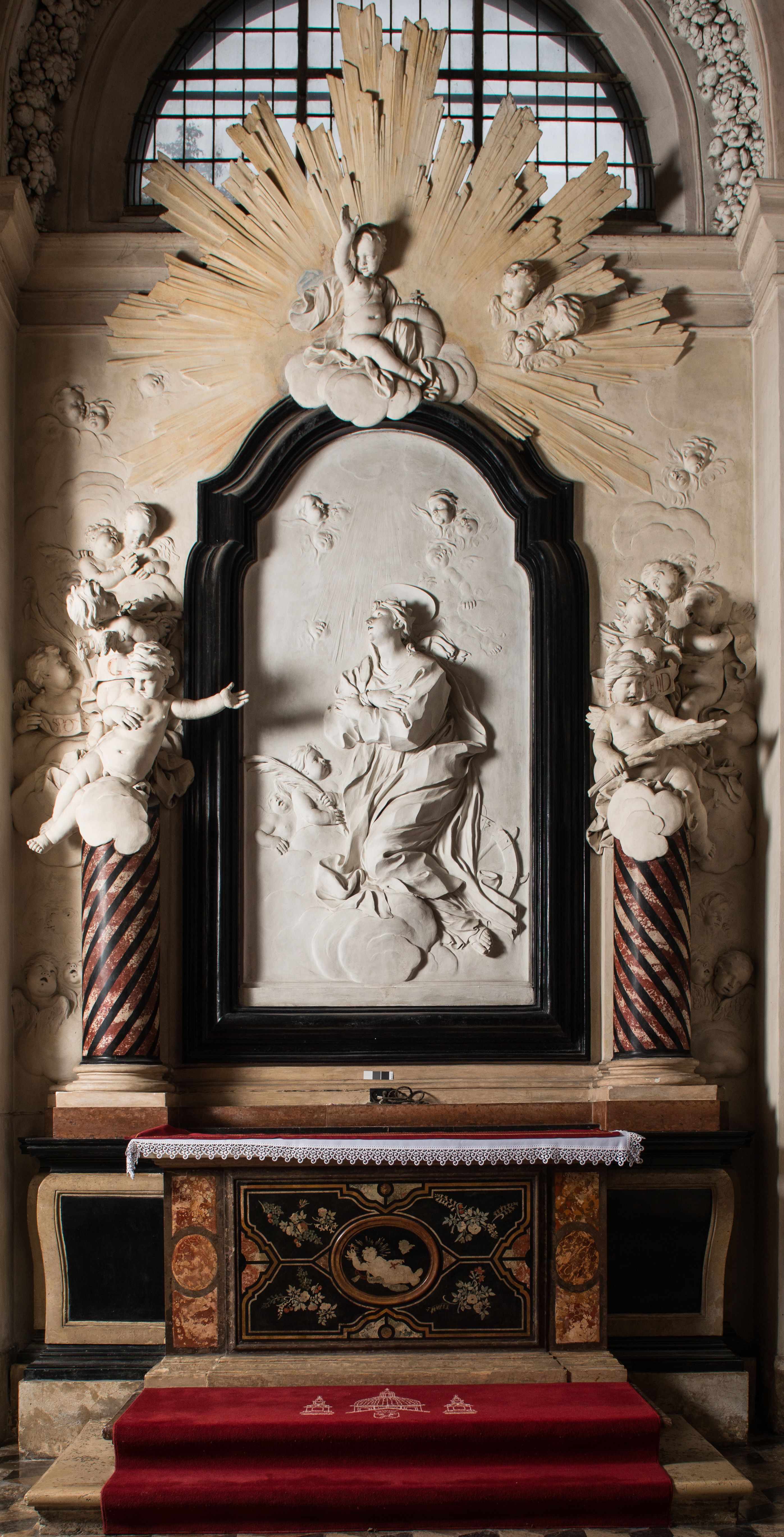 Wykonany między 1695 a 1703 roku przez warsztat Baltazara Fontany ołtarz należy do najciekawszych dzieł dojrzałego baroku w Polsce. Bezpośrednim źródłem inspiracji dla tej nastawy był ołtarz św. Emerenziany w kościele Sant’Agnese w Rzymie, autorstwa Ercole Ferraty, jednego z najbliższych współpracowników Berniniego.