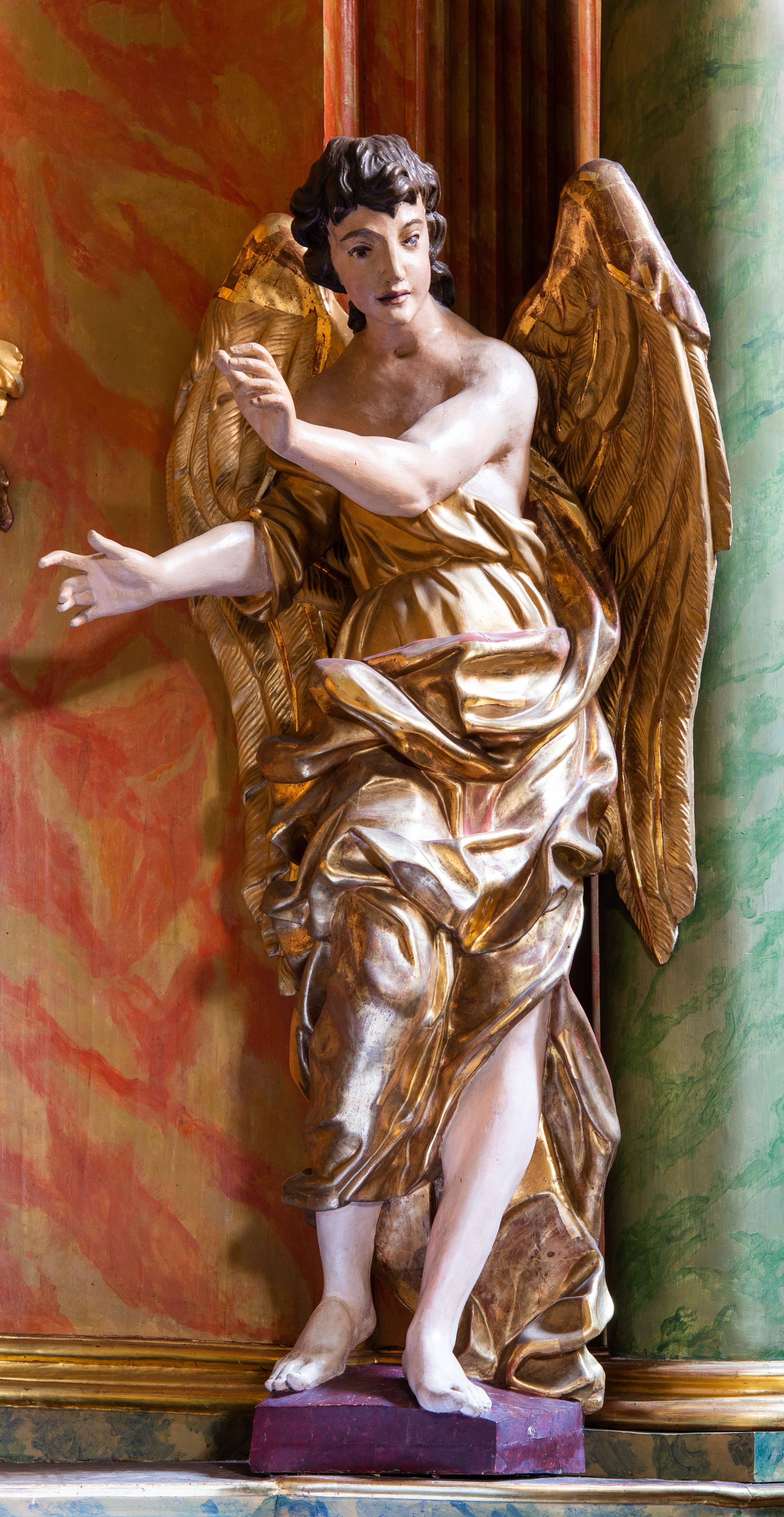 Para pełnoplastycznych figur ustawionych na niewielkich, prostopadłościennych postumentach. Postaci przedstawione w pozycji stojącej, w kontrapoście. Aniołowie ukazani jako ciemnowłosi młodzieńcy o owalnych twarzach ubrani w złote szaty tworzące dynamicznie wyginające się fałdy. Torsy odsłonięte, stopy bose. Anioł z lewej strony ołtarza unosi prawą rękę do góry w geście oratorskim, lewą ugiętą w łokciu wyciąga przed siebie. Lewa noga ugięta w kolanie. Anioł z prawej strony obie ręce ugięte w łokciach wyciąga w prawo. Szaty i skrzydła złocone, karnacje aniołów polichromowane.