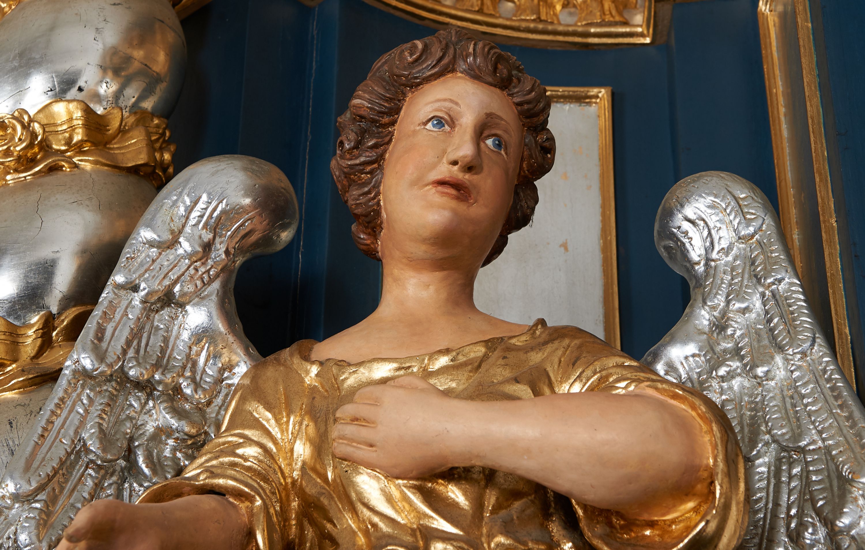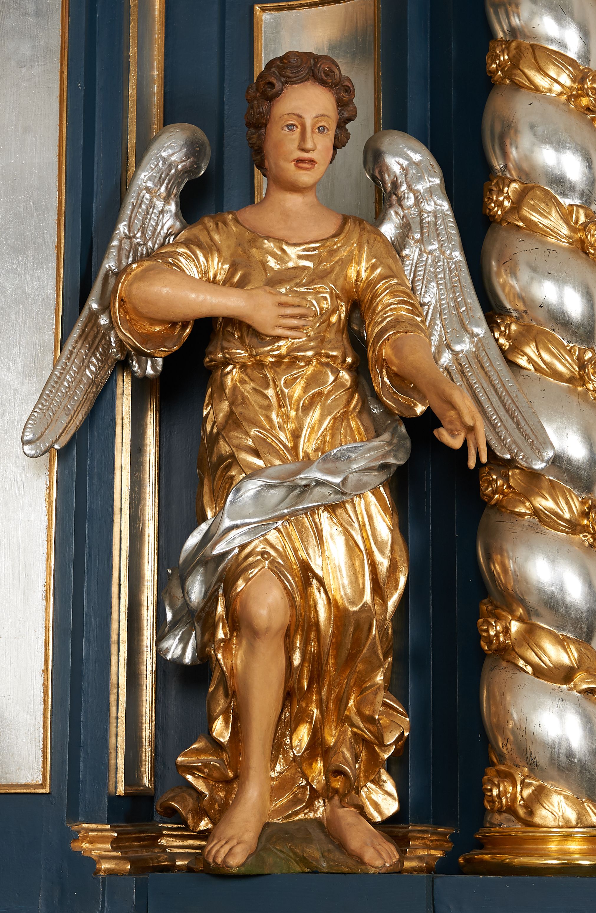 Para pełnoplastycznych, drążonych od tyłu, polichromowanych, złoconych i srebrzonych rzeźb przedstawiających stojące anioły w dynamicznych pozach. Figury przedstawione w kontrapoście, ustawione na niewielkich postumentach. Ubrane w długie, bogato drapowane, złocone suknie oraz rozwiane srebrzone płaszcze. Stopy bose. Obie postaci wykonują analogiczne gesty, składając jedną rękę na piersi, drugą wyciągając lekko do przodu. Twarze owalne, pełne z wydatnymi policzkami oraz podbródkami okolone jasnobrązowymi, kręconymi włosami. Karnacje polichromowane, skrzydła srebrzone.