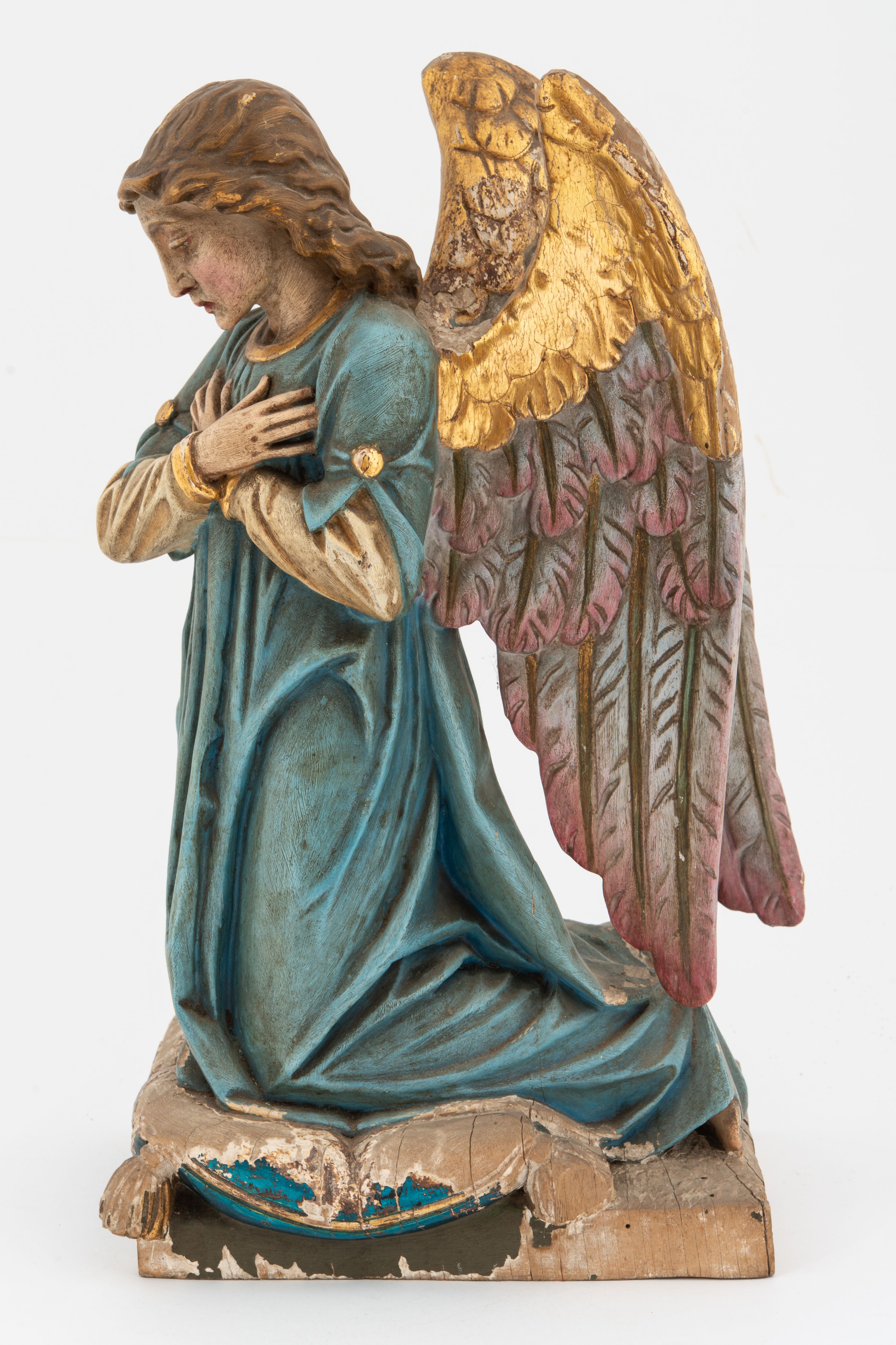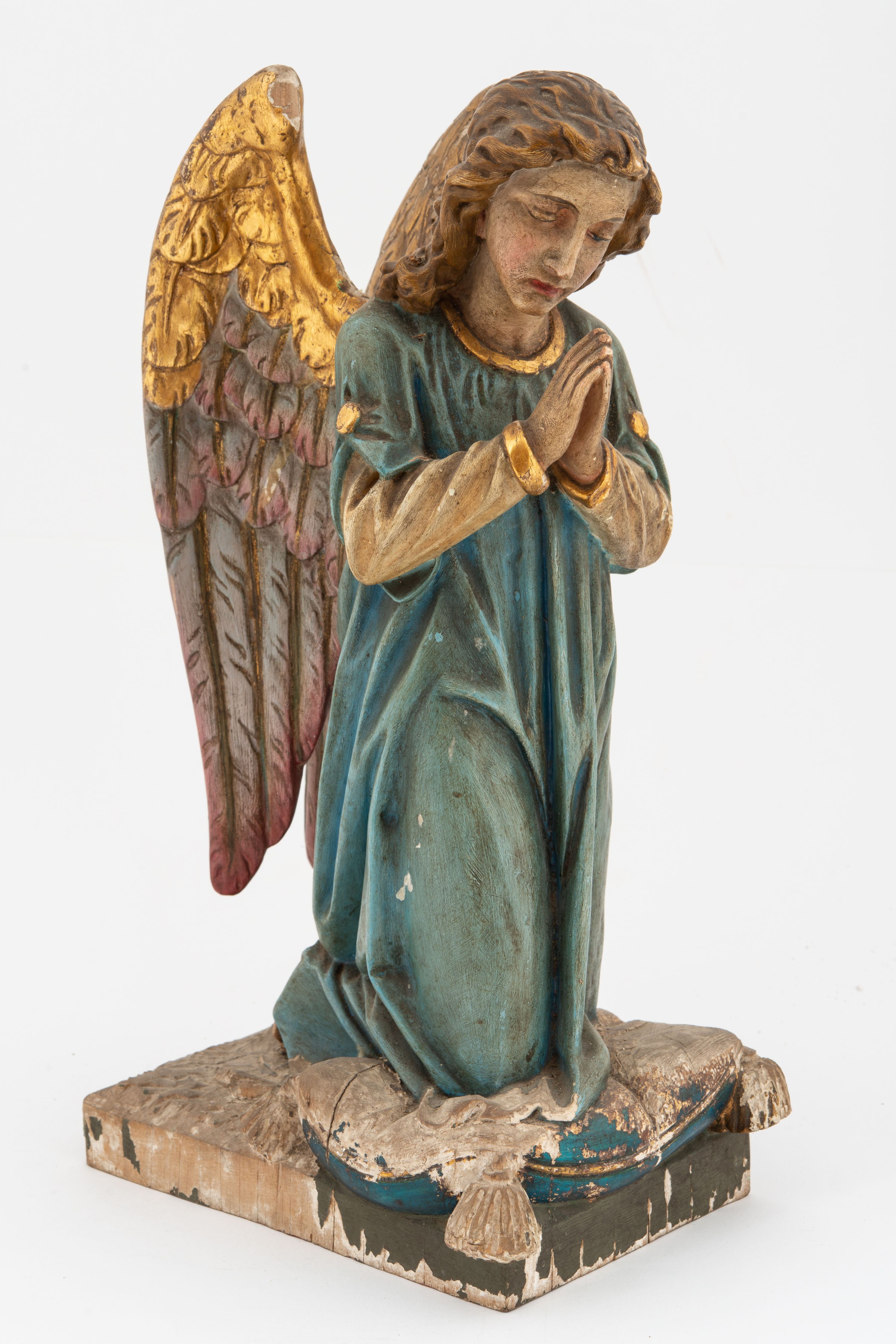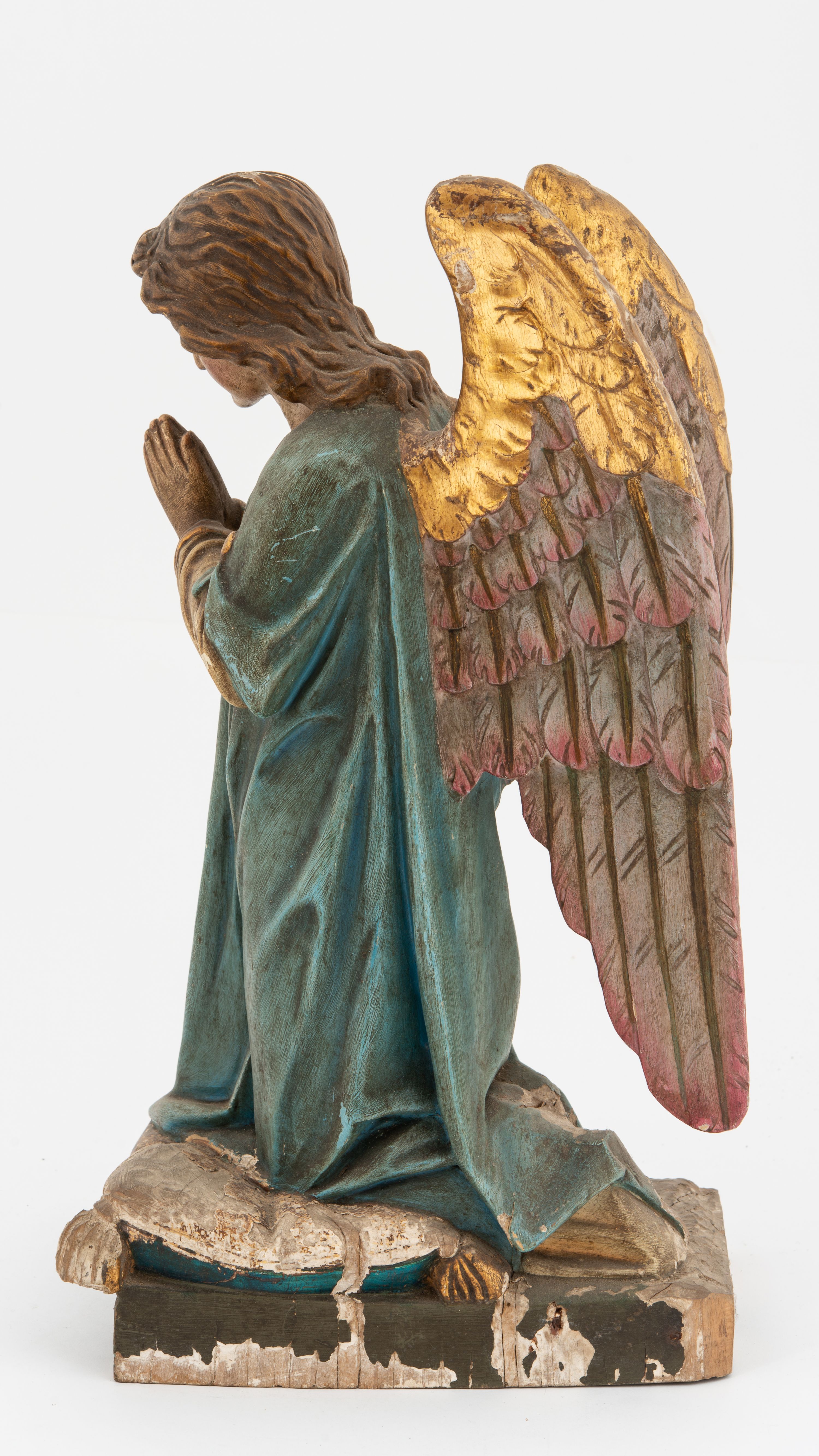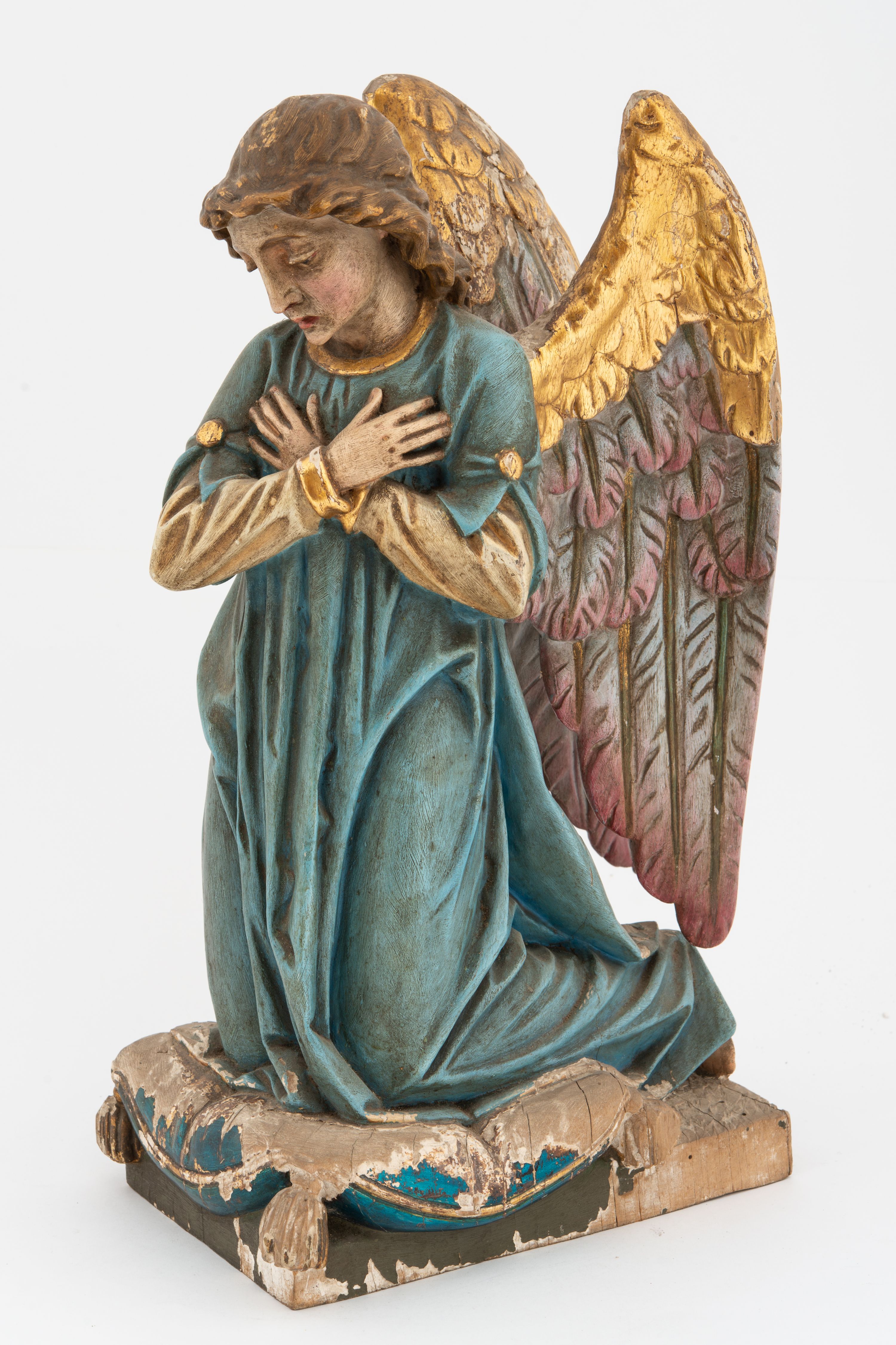 Pełnoplastyczne figury aniołów, klęczących na podstawach i poduszkach z chwostami. Postacie ukazane z profilu, z pochylonymi głowami, jedna ma skrzyżowane na piersi ręce, druga złożone w geście modlitwy. Twarze mają szczupłe, trójkątne, z oczami skierowanymi w dół, prostymi nosami i wąskimi ustami, okolone jasnobrązowymi, kręconymi włosami, opadającymi na kark. Ubrane są w jasnożółte szaty spodnie, z długimi rękawami, o złoconych lamówkach oraz jasnoniebieskie szaty wierzchnie, z krótkimi rękawami i złoconymi lamówkami. Skrzydła mają duże, złożone na plecach, złocone przy górnym brzegu, polichromowane w kolorach szarym i różowym w dolnej części. Polichromia ciał naturalistyczna.