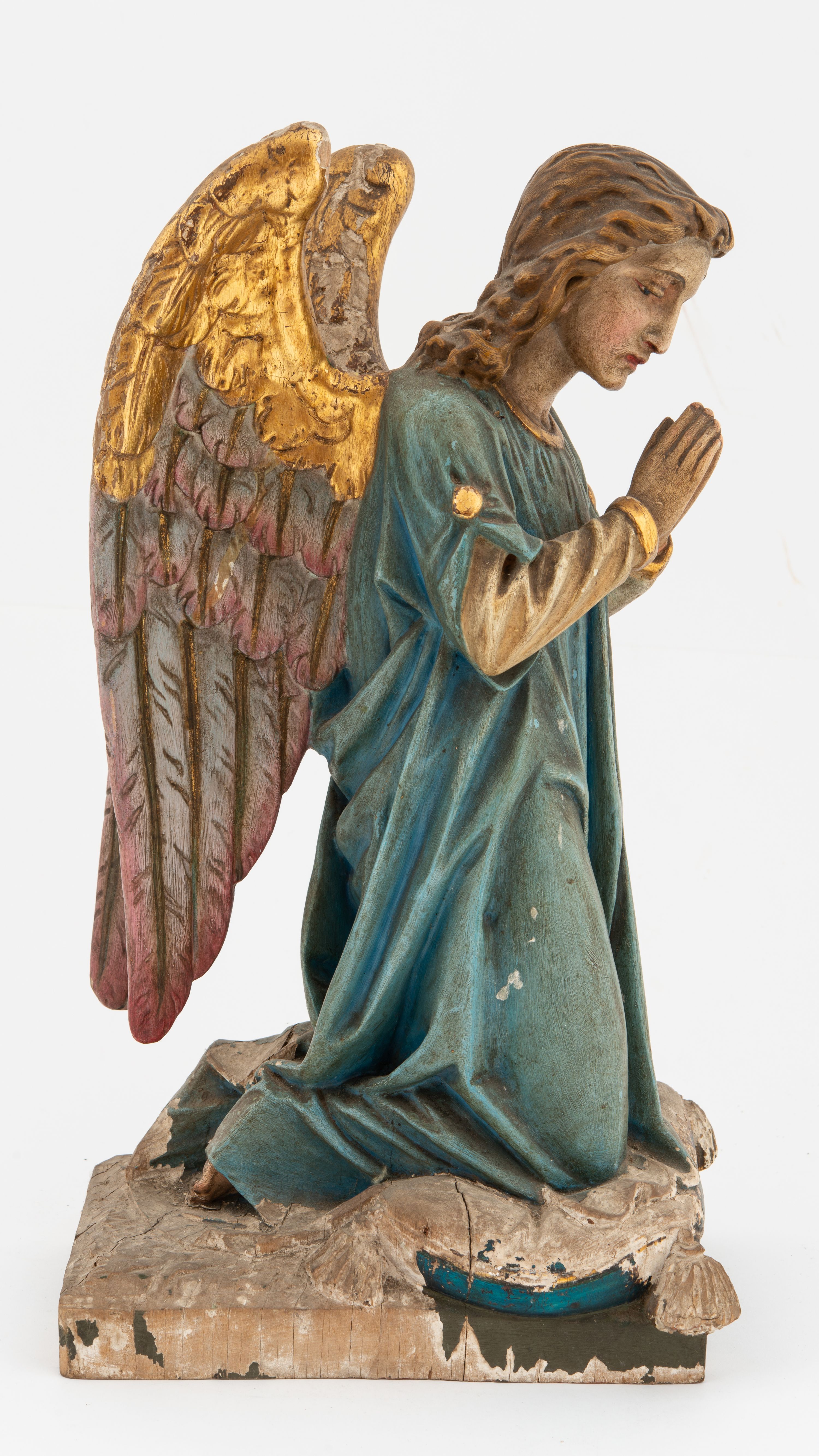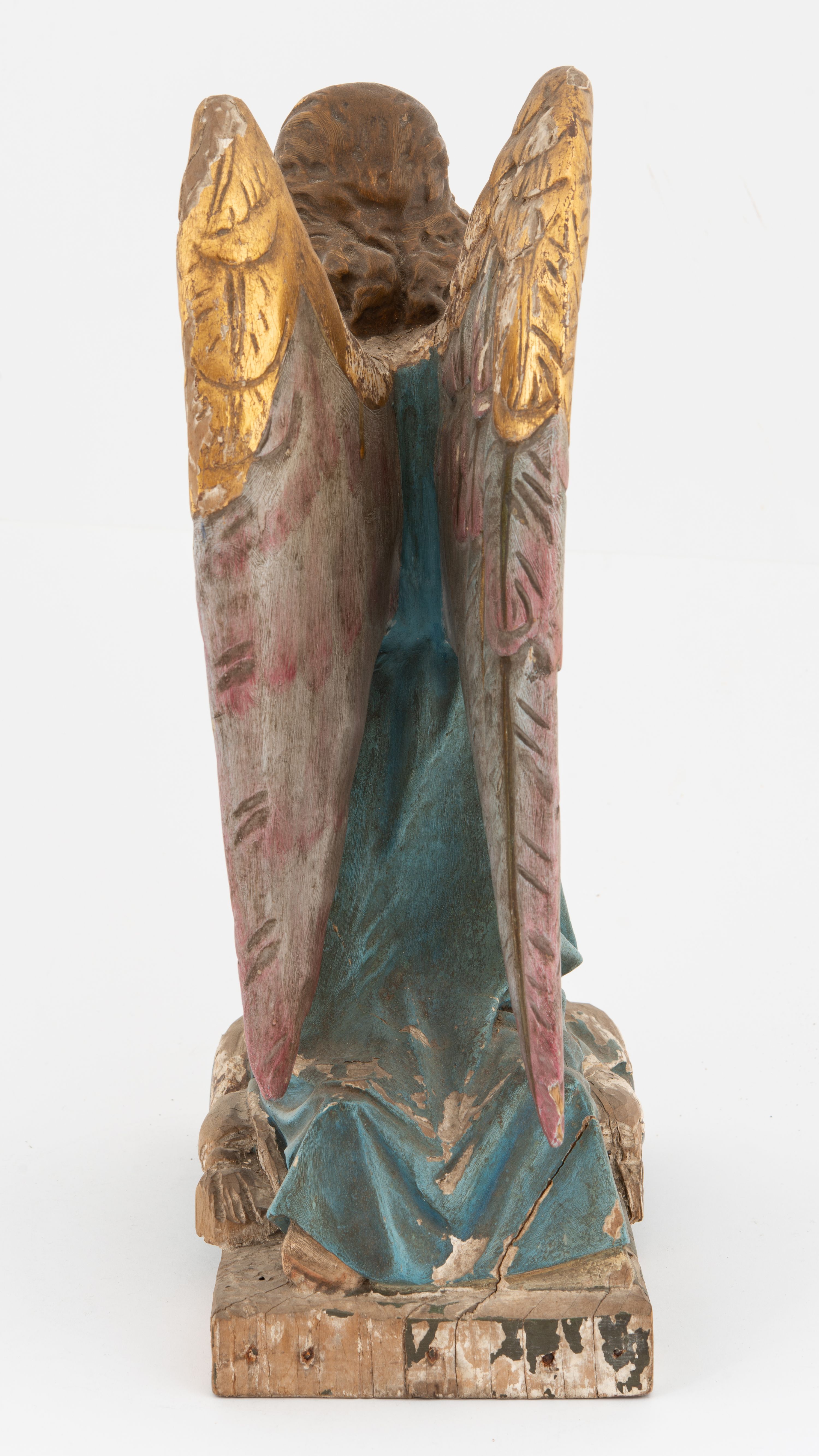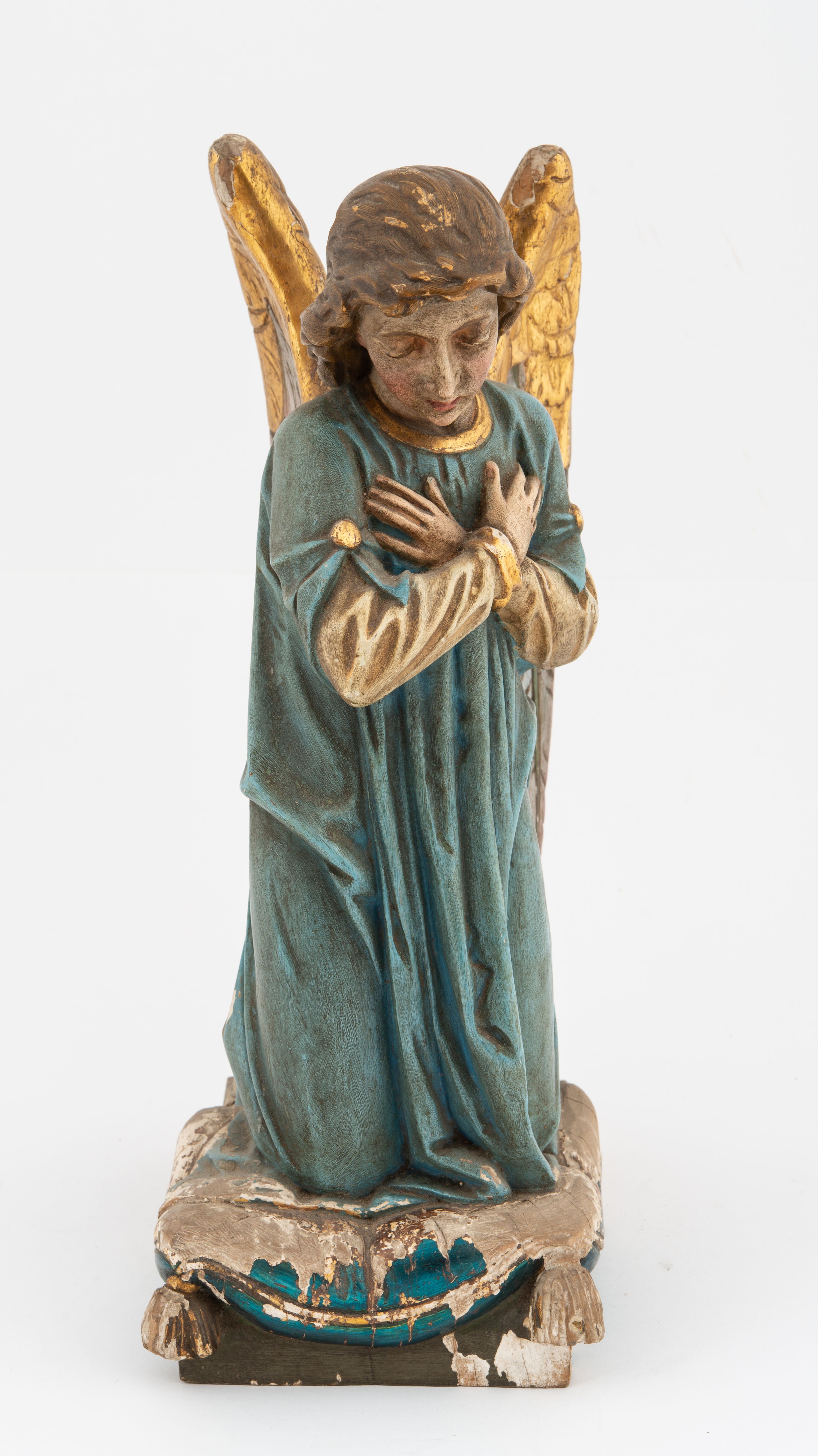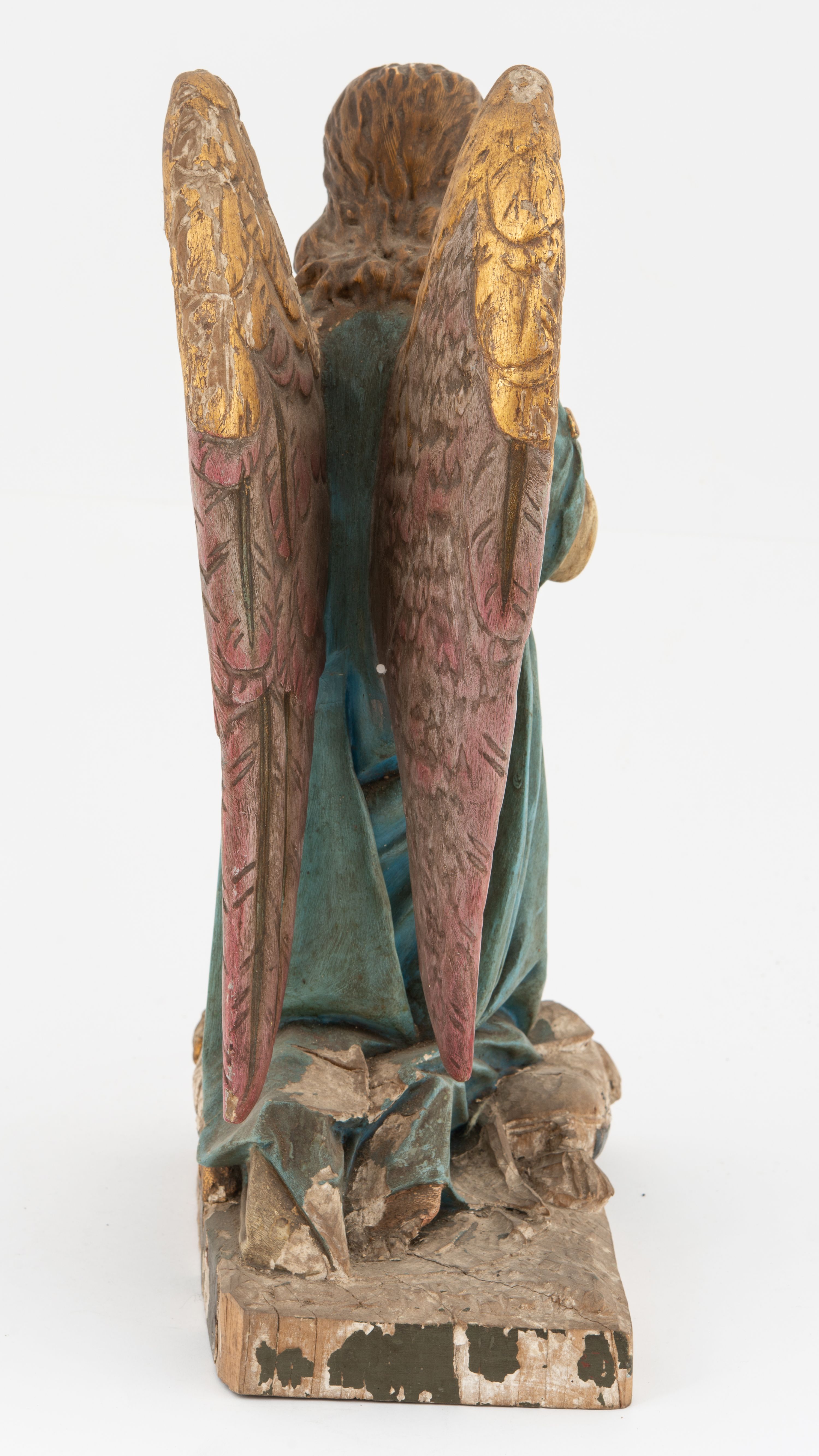 Ubytki mechaniczne, ubytki gruntu i polichromii podstawy, odpryski, przetarcia złoceń, silne zabrudzenia całości.