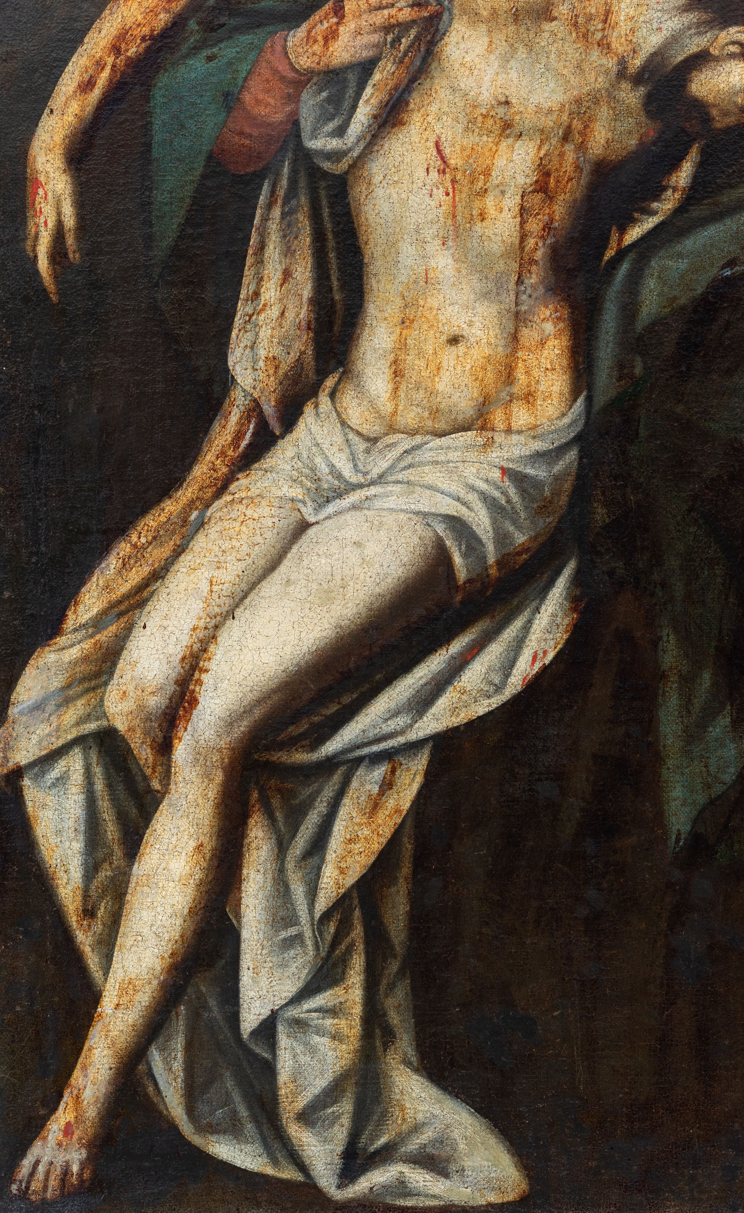 Obraz w formie stojącego prostokąta. W centrum ukazana Matka Boska podtrzymująca przy swoim prawym boku opadające bezwładnie ciało Chrystusa. Maria w pozycji siedzącej, zwrócona w trzech czwartych w lewo, z głową skierowaną w prawo, lewą rękę kładzie na wyciągniętej na jej kolanach ręce Chrystusa, prawą przytrzymuje jego ciało. Twarz ma pociągłą, o dużych, okrągłych i skierowanych w dół oczach, prostym nosie i małych ustach. Wokół jej głowy nimb promienisty. Ubrana jest w bladoróżową suknię oraz niebieski płaszcz zarzucony na głowę, ramiona i kolana. Chrystus ukazany w pozycji siedzącej z bezwładnie opadającymi torsem, głową, i nogami, ręce ma rozłożone na boki, podtrzymywane przez Marię. Zwrócony jest w trzech czwartych w prawo, z głową opadającą na lewą stronę. Twarz ma pociągłą, o zamkniętych oczach i długim nosie, okoloną krótkimi, brązowymi brodą i włosami. Ciało ma szczupłe i smukłe, o delikatnie zaznaczonej muskulaturze ciała, z zaznaczonymi śladami męki. Przez biodra ma przewiązane krótkie, białe perizonium. Postacie ukazane na tle zachmurzonego nieba, rozjaśnionego wokół głowy Marii. Obraz ujęty profilowaną ramą, polichromowaną w kolorze szarym.