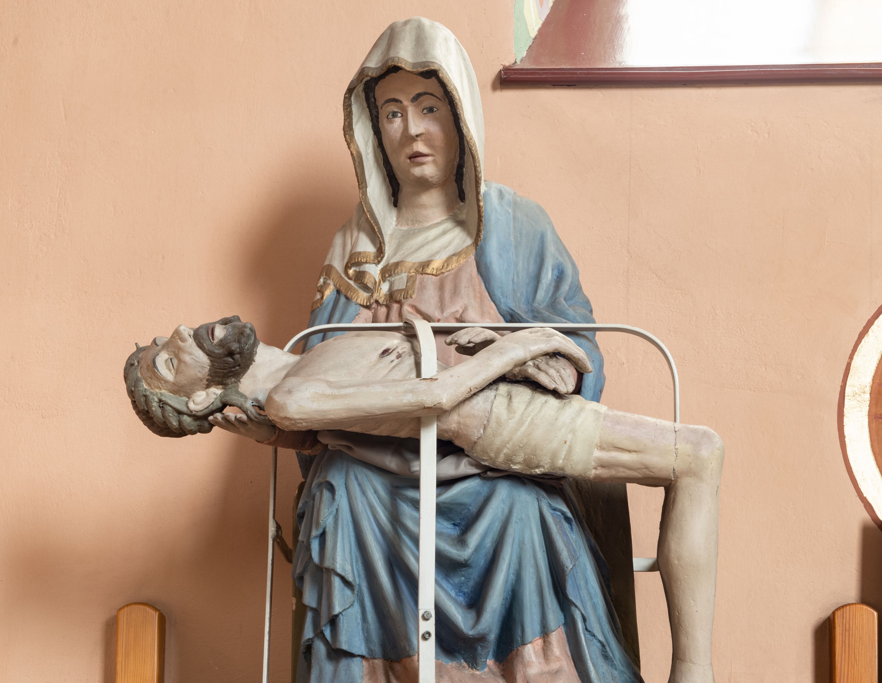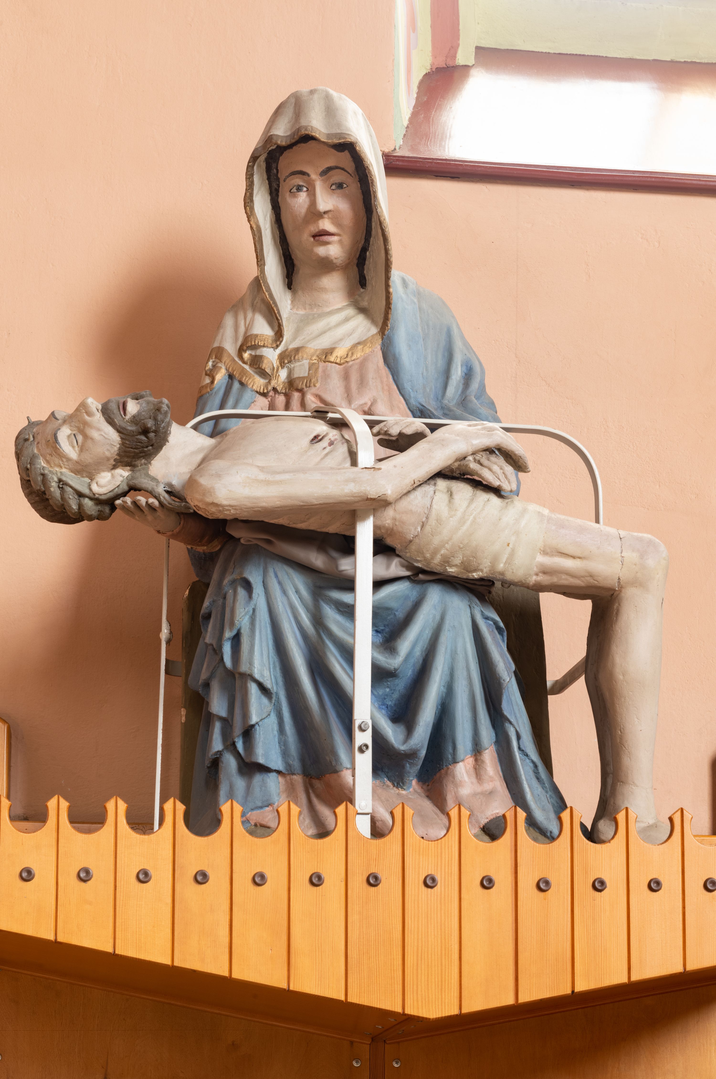 Matka Boska siedząca na tronie z płaskorzeźbioną dekoracją w formie maswerku, na jej kolanach horyzontalnie ułożone, martwe ciało Chrystusa. Dojrzała kobieta w bladoróżowej sukni i błękitnym płaszczu układającym się po bokach w kaskady fał. Poomiędzy nimi szaty uformowane w kształt litery V, na głowie biała chusta wykończona złotą lamówką. Ciało Chrystusa wychudzone z zaznaczonymi śladami męki, głowa w koronie cierniowej lekko odchylona do tyłu, włosy układające się w spiralne loki. Ręce złożone na wysokości bioder. Biodra ma owiniete jasnym perizonium.
