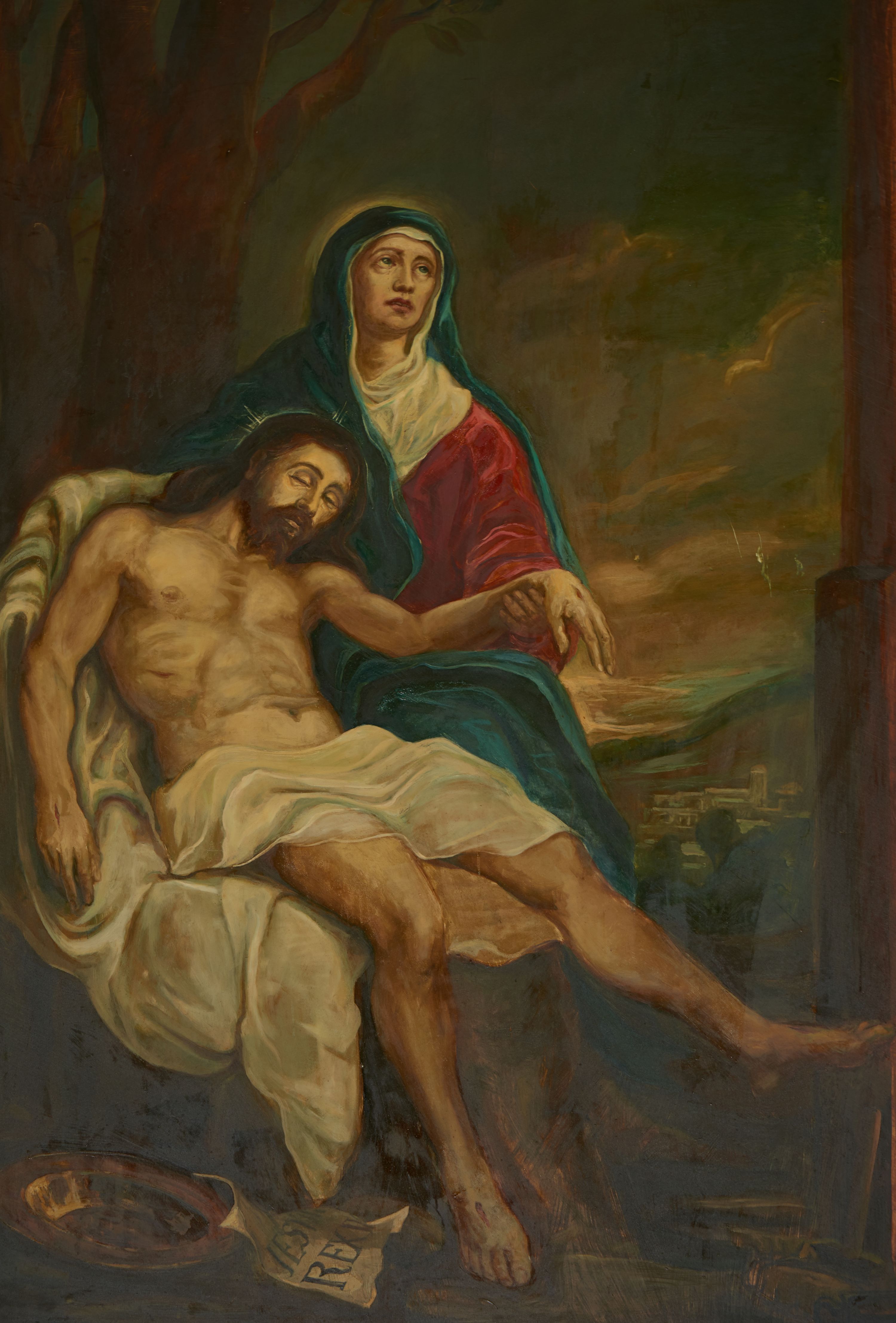 Obraz powstał w latach sześćdziesiątych XX wieku w pracowni Zdzisława Pabisiaka, bliskiego współpracownika Wiktora Zina, autora ołtarza. Przedstawia Pietę, jeden z popularniejszych tematów ikonograficznych spotykanych w kościołach już od średniowiecza.