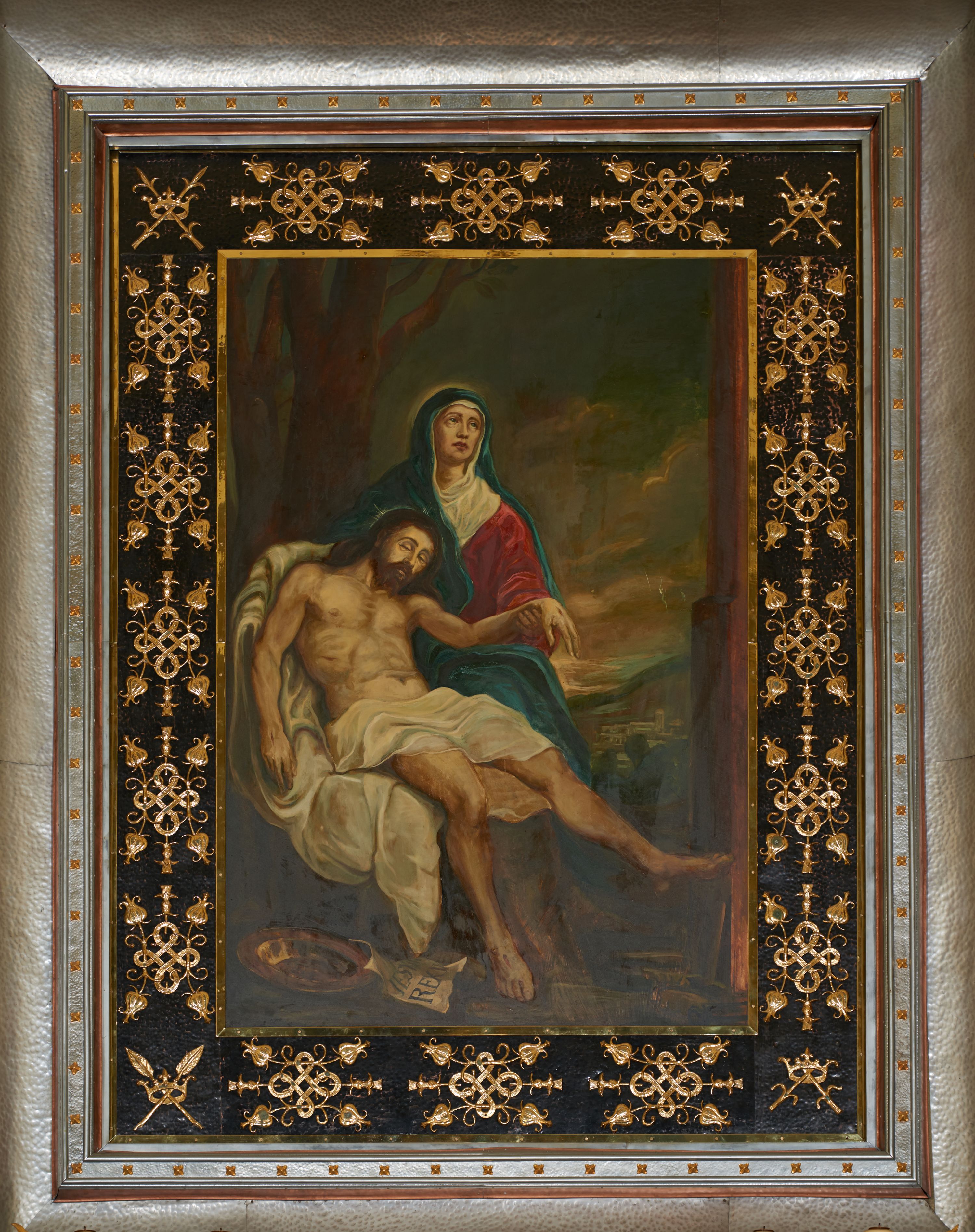 Obraz w kształcie stojącego prostokąta w rozbudowanej, profilowanej ramie dekorowanej nakładanymi motywami geometrycznymi oraz kwiatowymi, zwieńczonej na osi monogramem maryjnym. W centrum kompozycji, nieco z lewej strony obrazu przedstawienie Marii trzymającej na kolanach martwe ciało Chrystusa. Twarz Marii szeroka, z delikatnie otwartymi ustami, szerokim nosem i wzrokiem skierowanym ku niebu. Matka Boska jest ubrana w czerwoną suknię, ciemnobłękitny płaszcz nałożony na głowę oraz biały welon. Chrystus ukazany w pozycji półleżącej na białym płótnie, z lewą ręką podtrzymywaną przez Marię, prawą opadłą bezwładnie w dół. Twarz szczupła, oczy zamknięte, okolona krótką brodą i długimi, ciemnobrązowymi włosami, spływającymi na ramiona i plecy. Odziany jest w białe perizonium na biodrach, delikatnie drapowane. Wokół głów są zaznaczone nimby. W lewym, dolnym rogu przedstawienia titulus oraz misa, w prawym widoczny fragment krzyża. W tle otwiera się rozległy pejzaż z widokiem na Jerozolimę. Kolorystyka ciemna, ciepła z dominacją brązów.