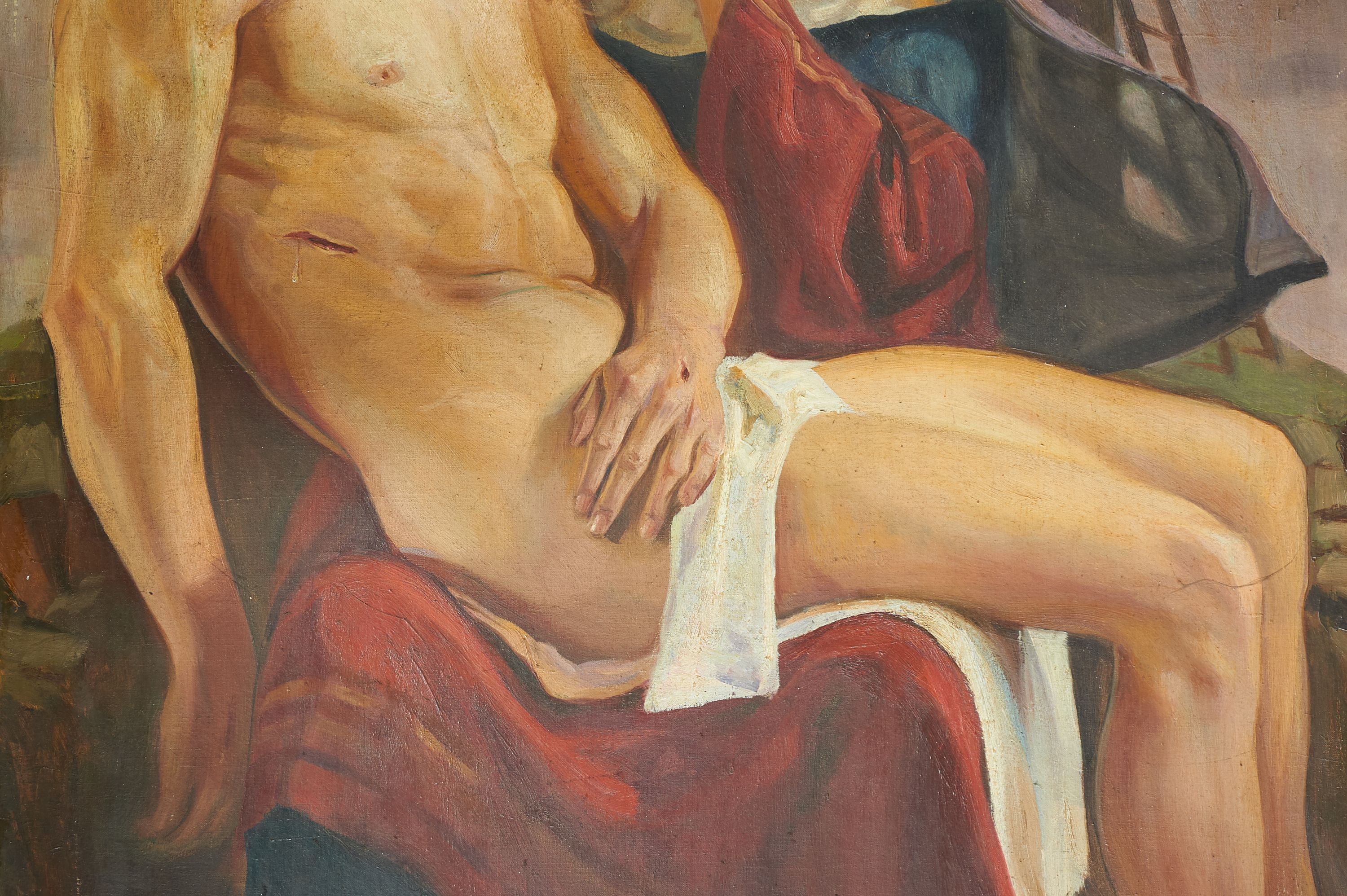 Obraz w formie stojącego prostokąta. W centrum kompozycji Matka Boska w pozycji siedzącej, pod krzyżem, ukazana frontalnie. Na kolanach trzyma martwe ciało Chrystusa, oparte o pionową belkę krzyża. Lewą ręką przytrzymuje na ramieniu głowę Syna, do której przytula twarz. Maria ma okrągłą twarz, o wyrazistych rysach, dużych oczach, uniesionych brwiach, prostym nosie i pełnych ustach. Ubrana jest w granatową suknię oraz czerwony płaszcz, przepasany przez lewe przedramię i spoczywający na kolanach. Na głowie ma białą podwikę oraz rozwiany, jasnofioletowy welon. Ciało Chrystusa zwrócone w trzech czwartych w lewo, opada bezwładnie na prawe ramię Marii. Lewa ręka spoczywa na podbrzuszu, prawa opada wzdłuż ciała. Twarz ma szczupłą, z zamkniętymi oczami, garbatym nosem i lekko rozchylonymi ustami; okoloną jasnym zarostem i jasnymi, długimi włosami. Ciało ma muskularne, z zaznaczonymi śladami męki. Przez biodra ma przerzuconą białą tkaniną. W tle ukazana Golgota z krzyżem, o który oparta jest drabina, a na ramieniu powiewa biała tkanina. Niebo zachmurzone, w kolorze fioletowo-brunatnym. W lewym dolnym rogu sygnatura „SKlimowski”.