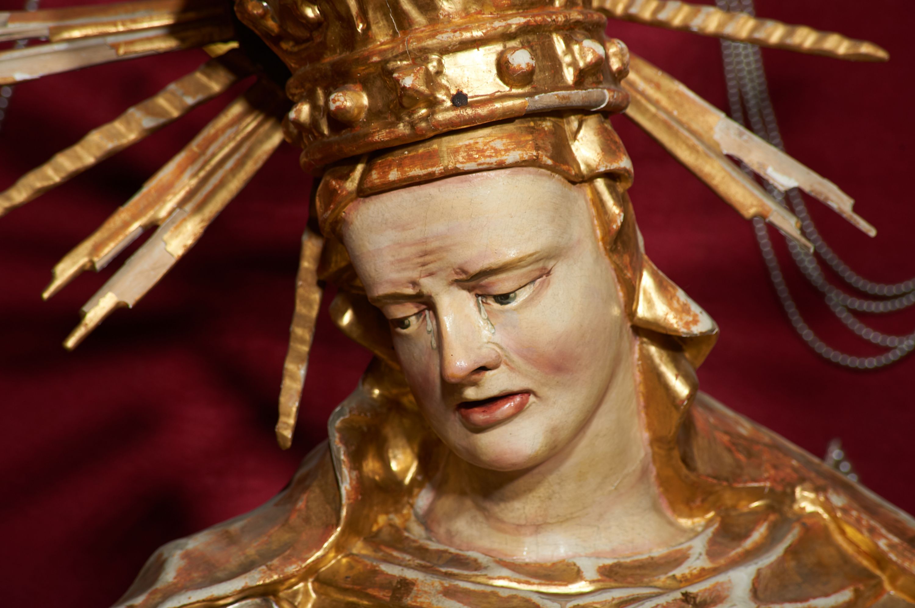 Polichromia naturalistyczna w partiach ciała, szaty złocone.