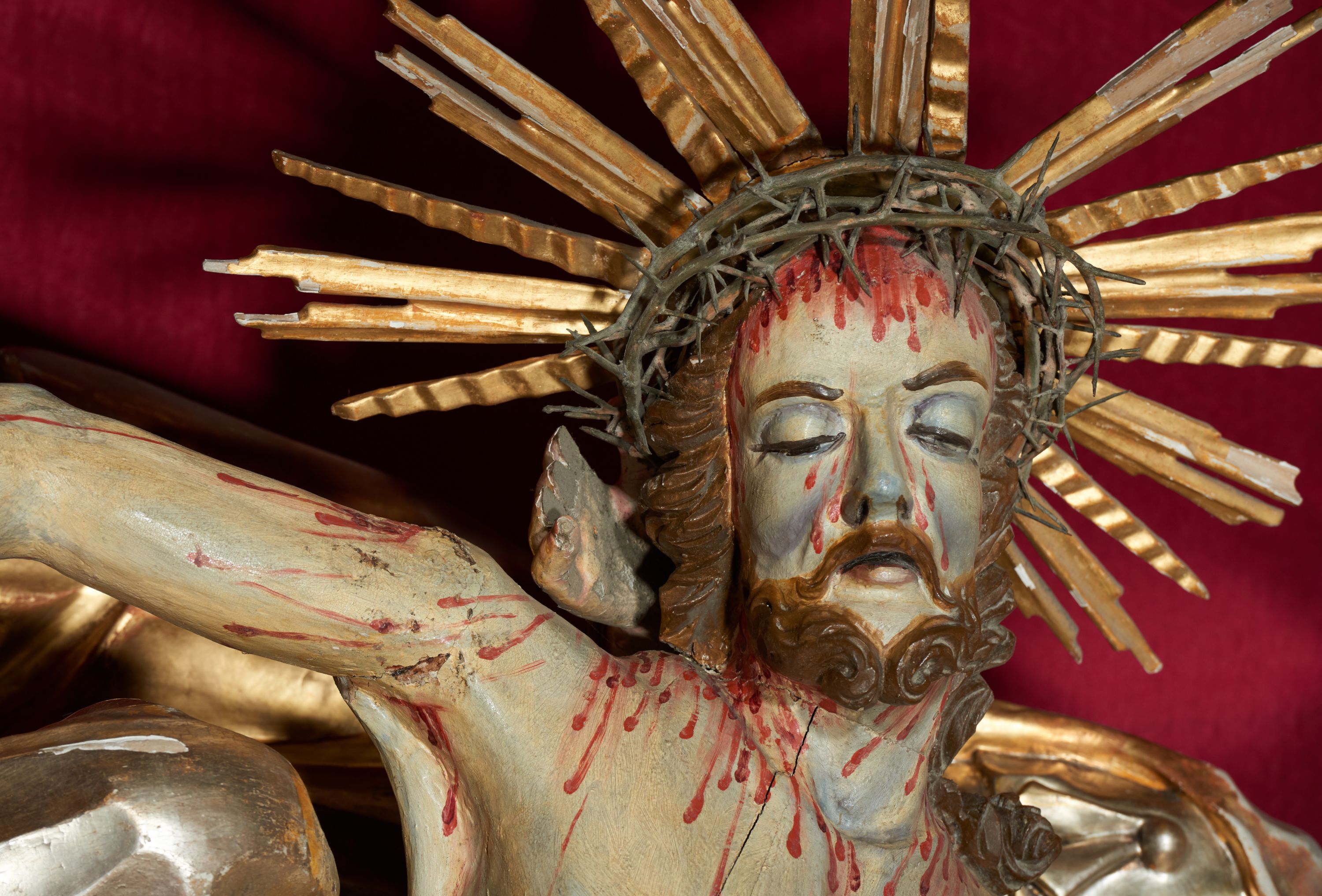 Dobry, przetarcia w warstwie złoceń, pęknięcie pionowe w rzeźbie Chrystusa w partii korpusu.