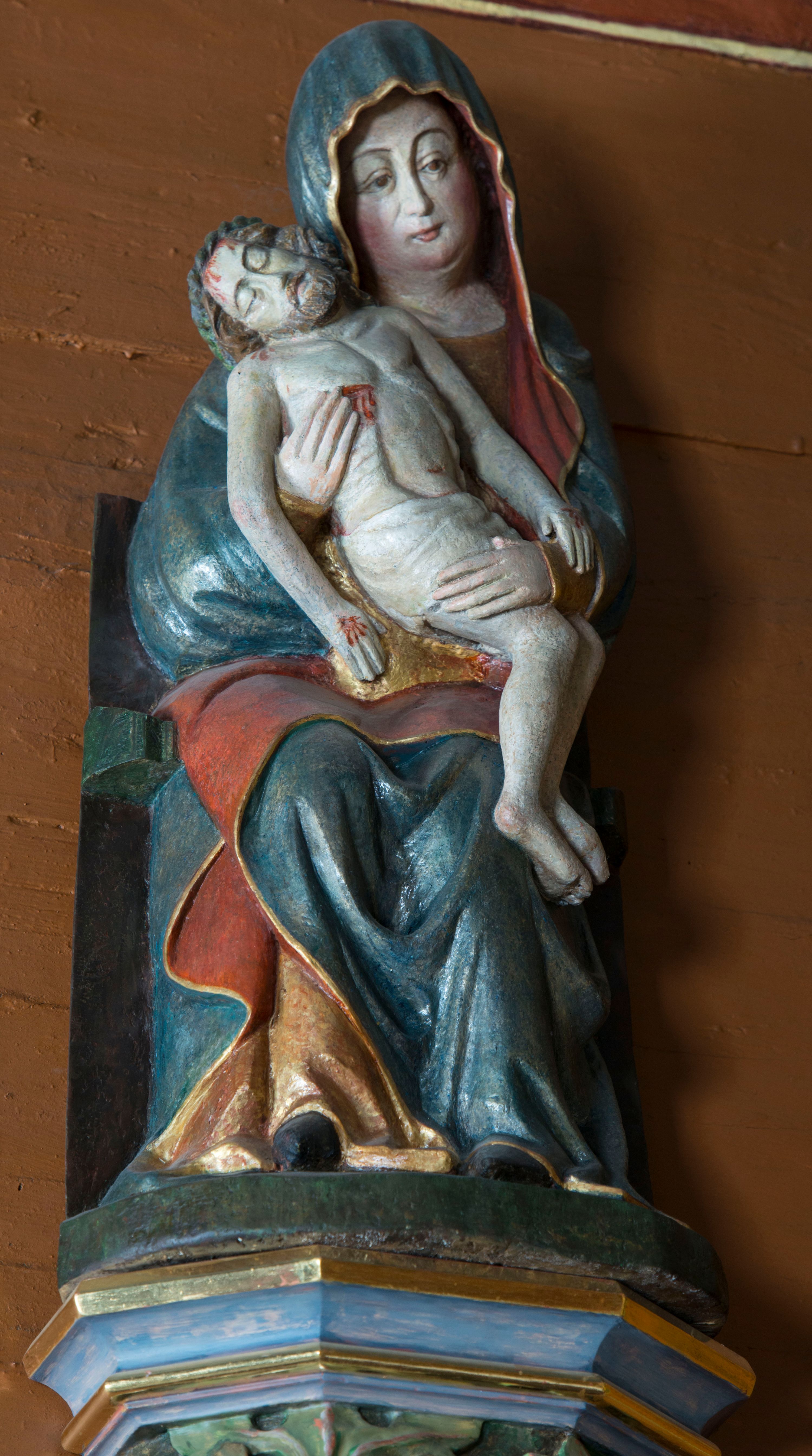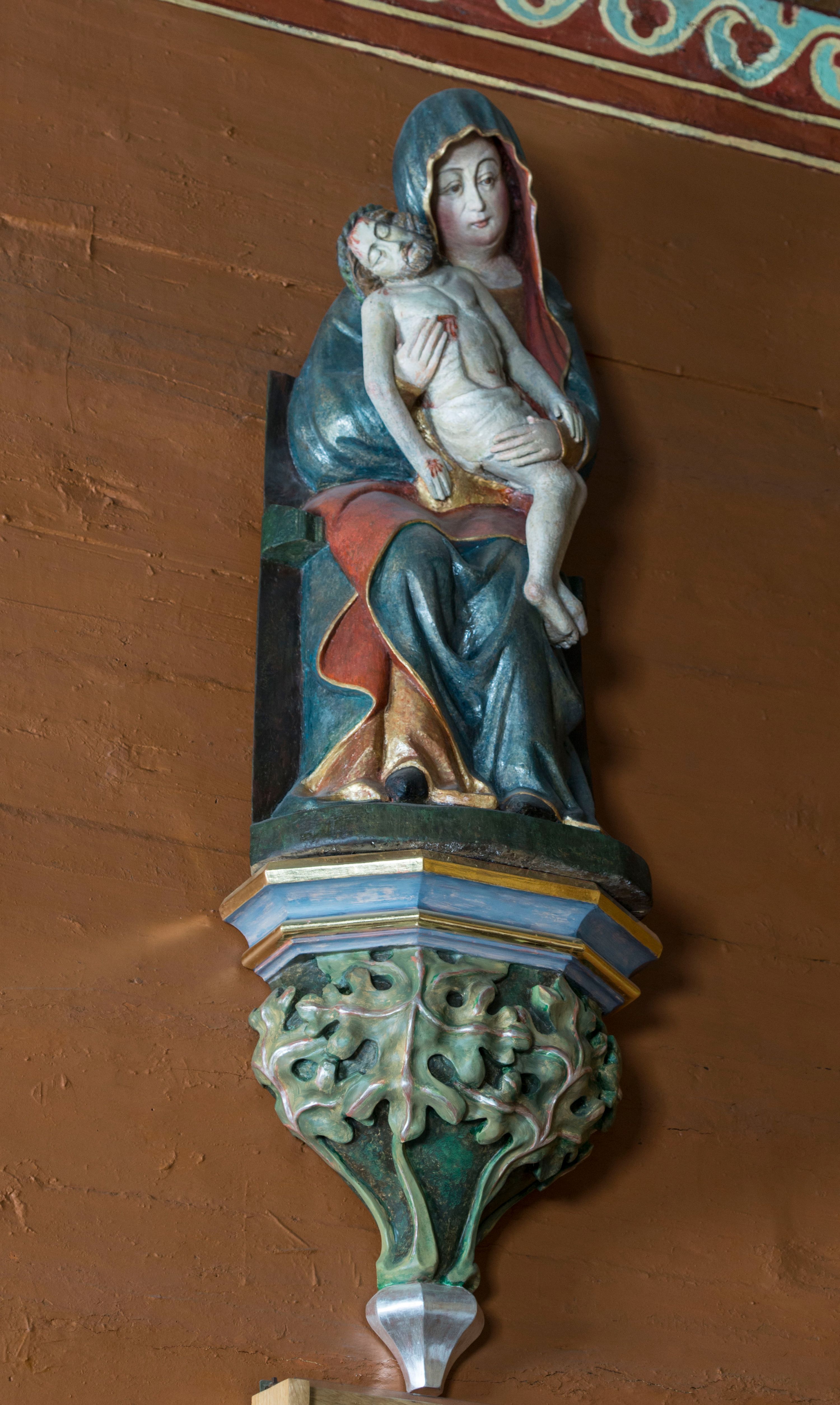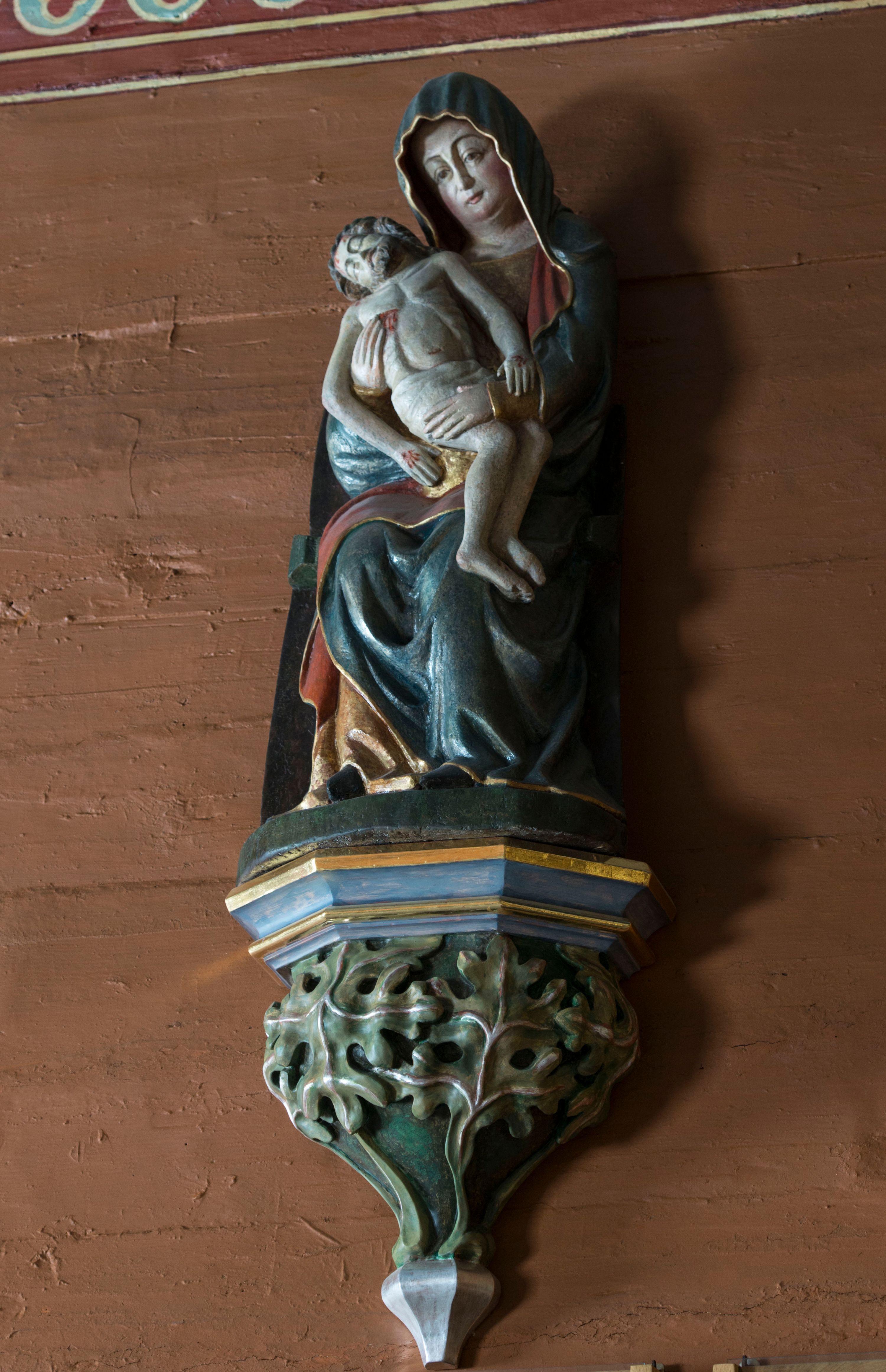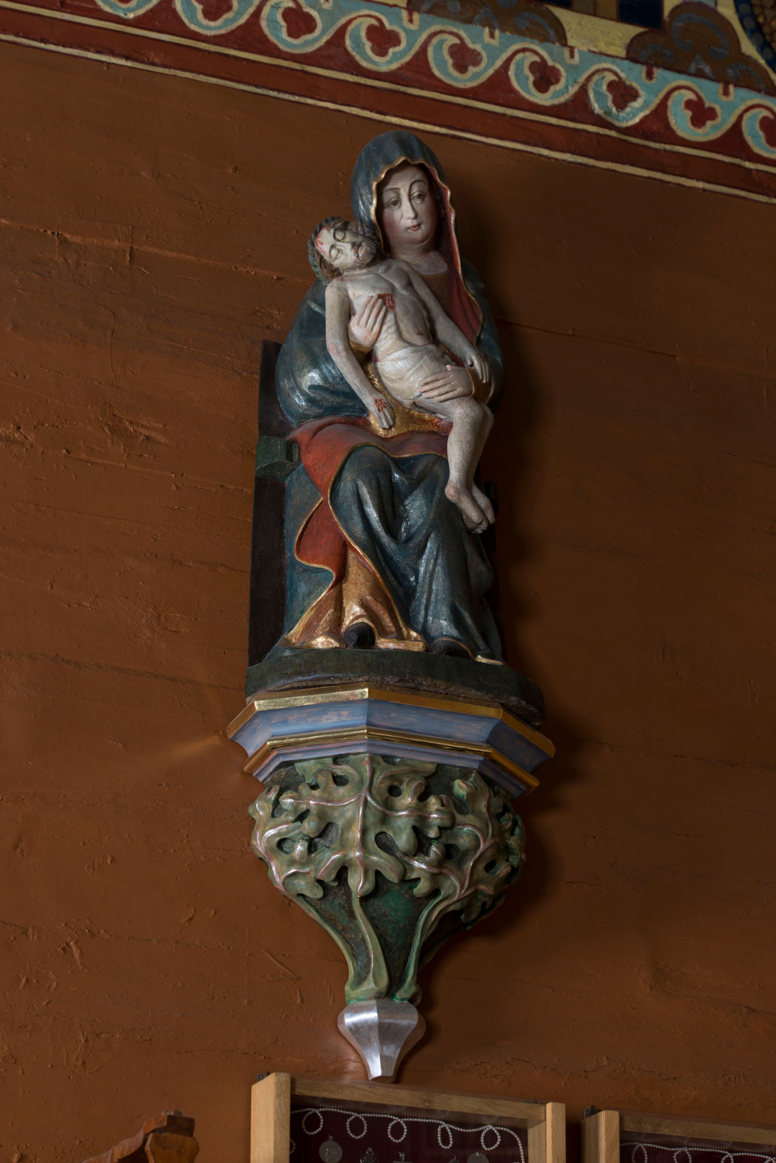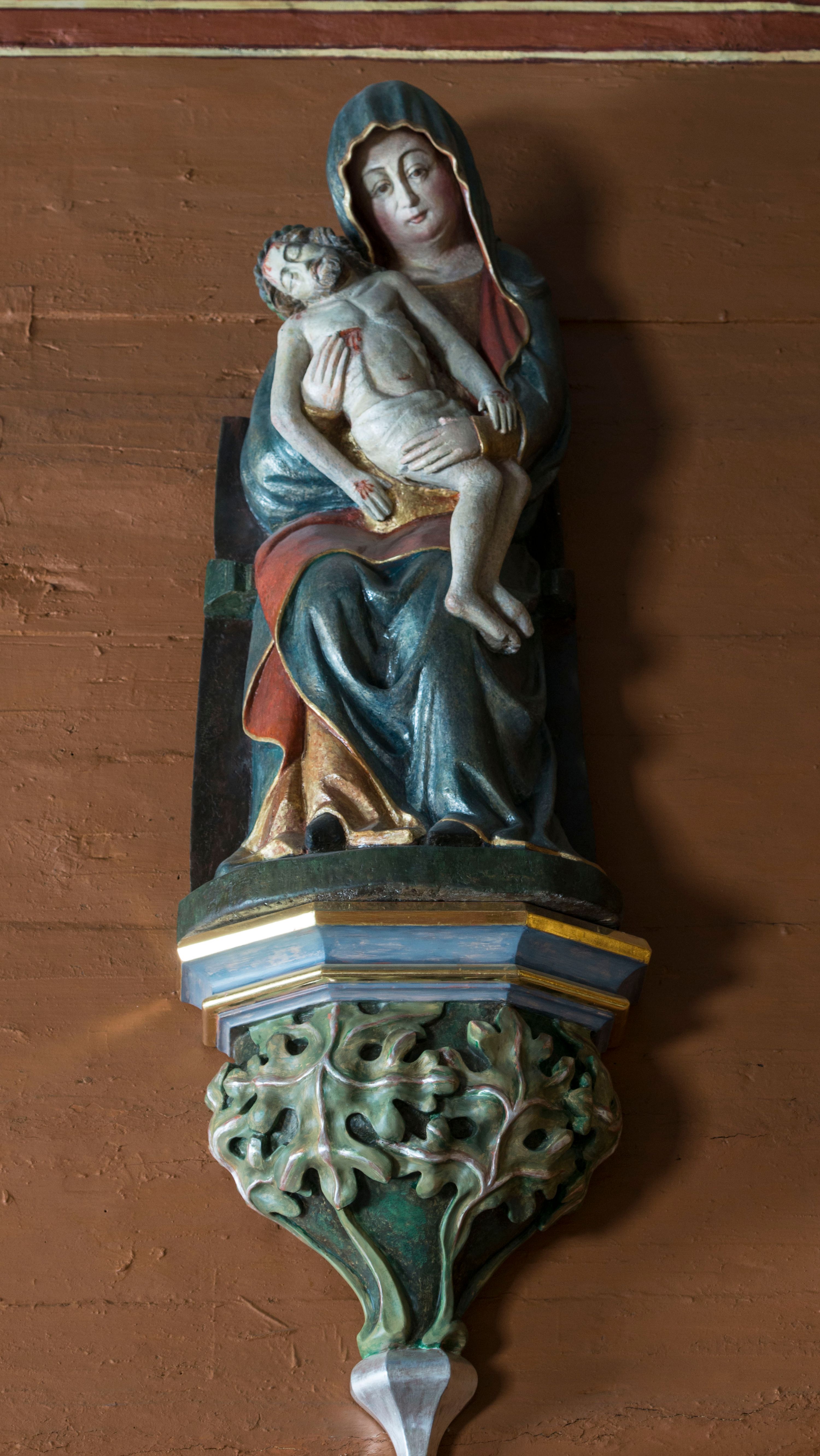 Rzeźba stoi na współczesnej, stylizowanej na gotycką pięciobocznej konsoli. Jej profilowany cokół podtrzymuje wspornik opleciony srebrzystymi i złotymi liśćmi akantu. Krawędzie konsoli są pozłocone.
