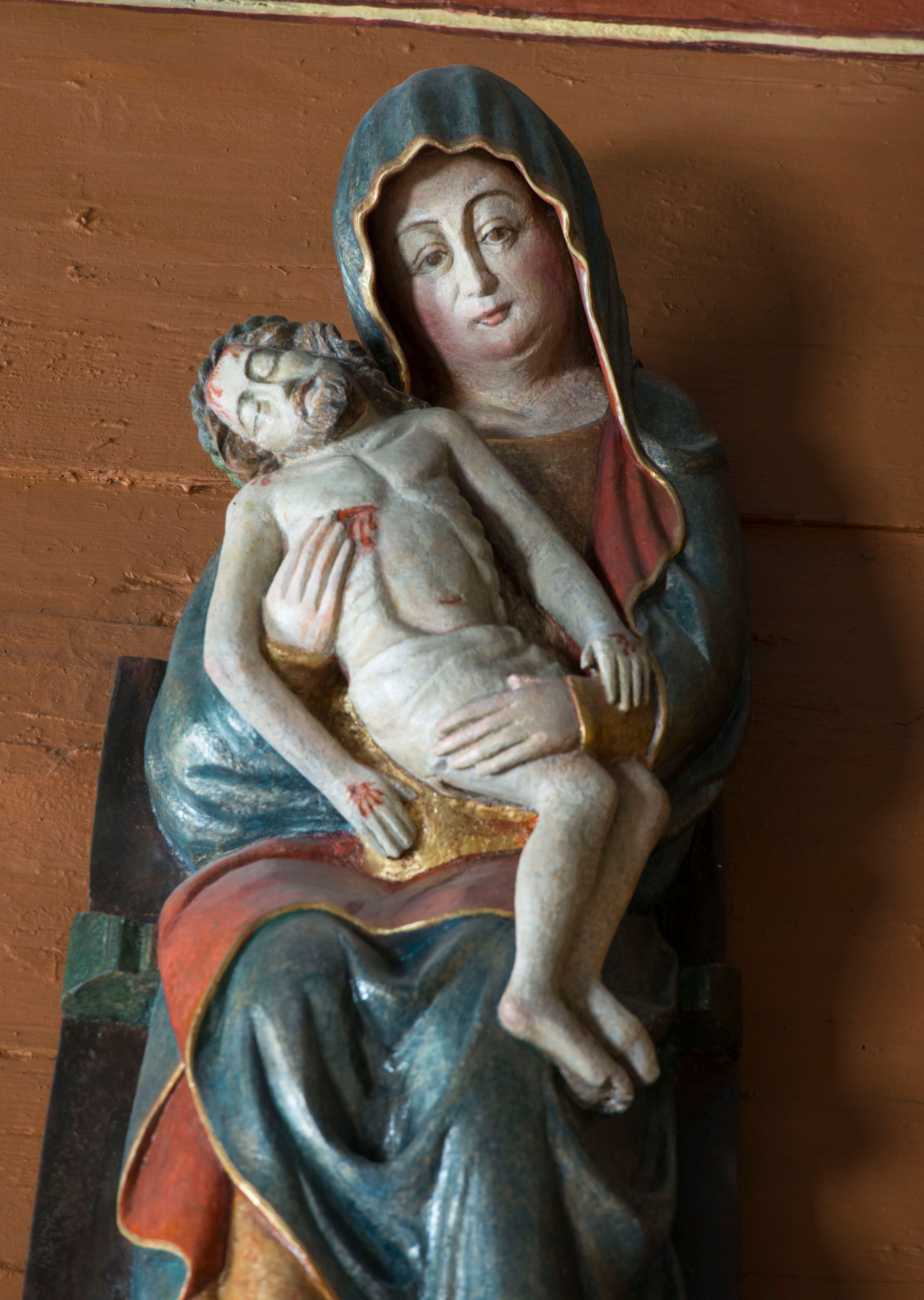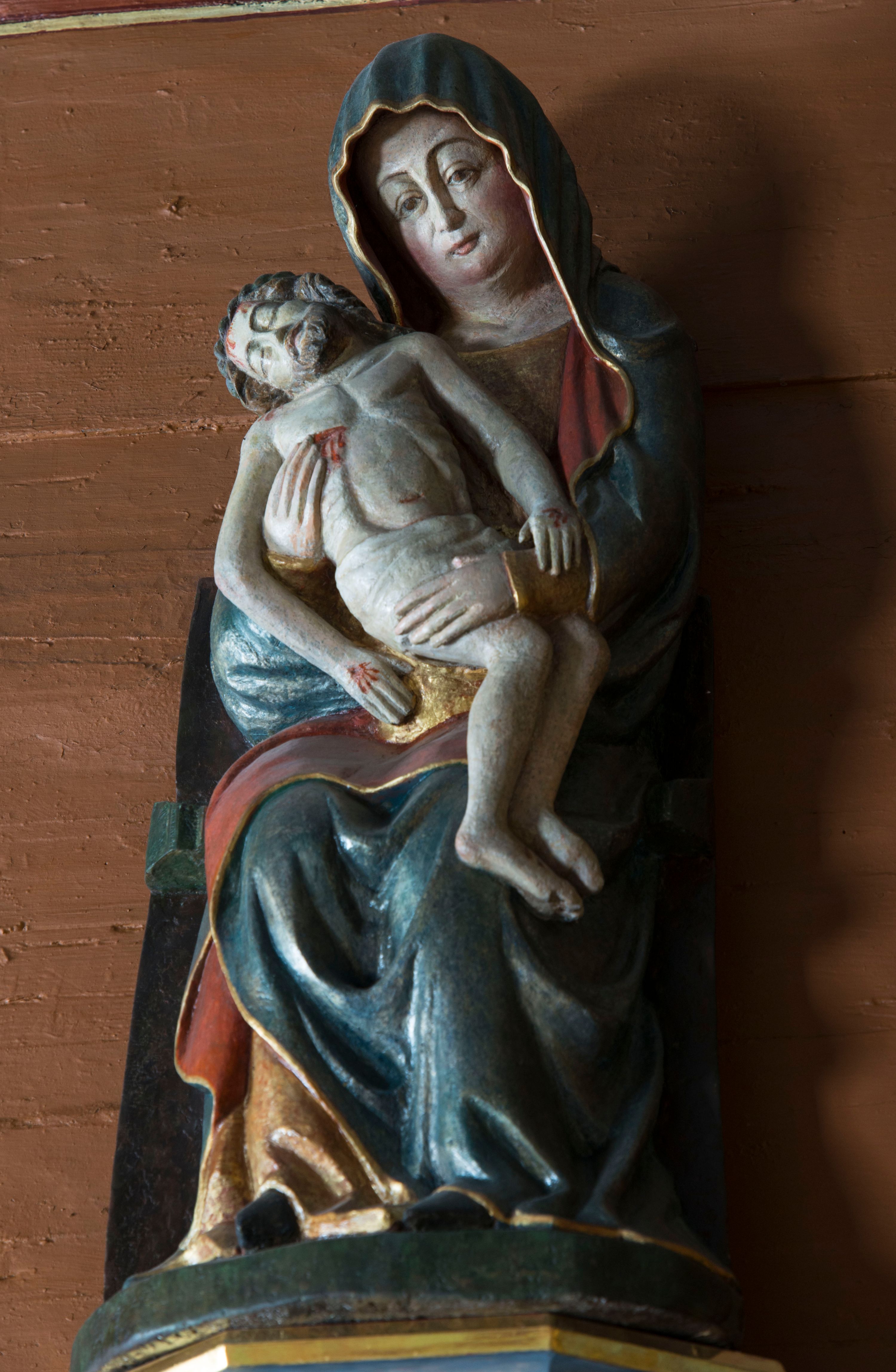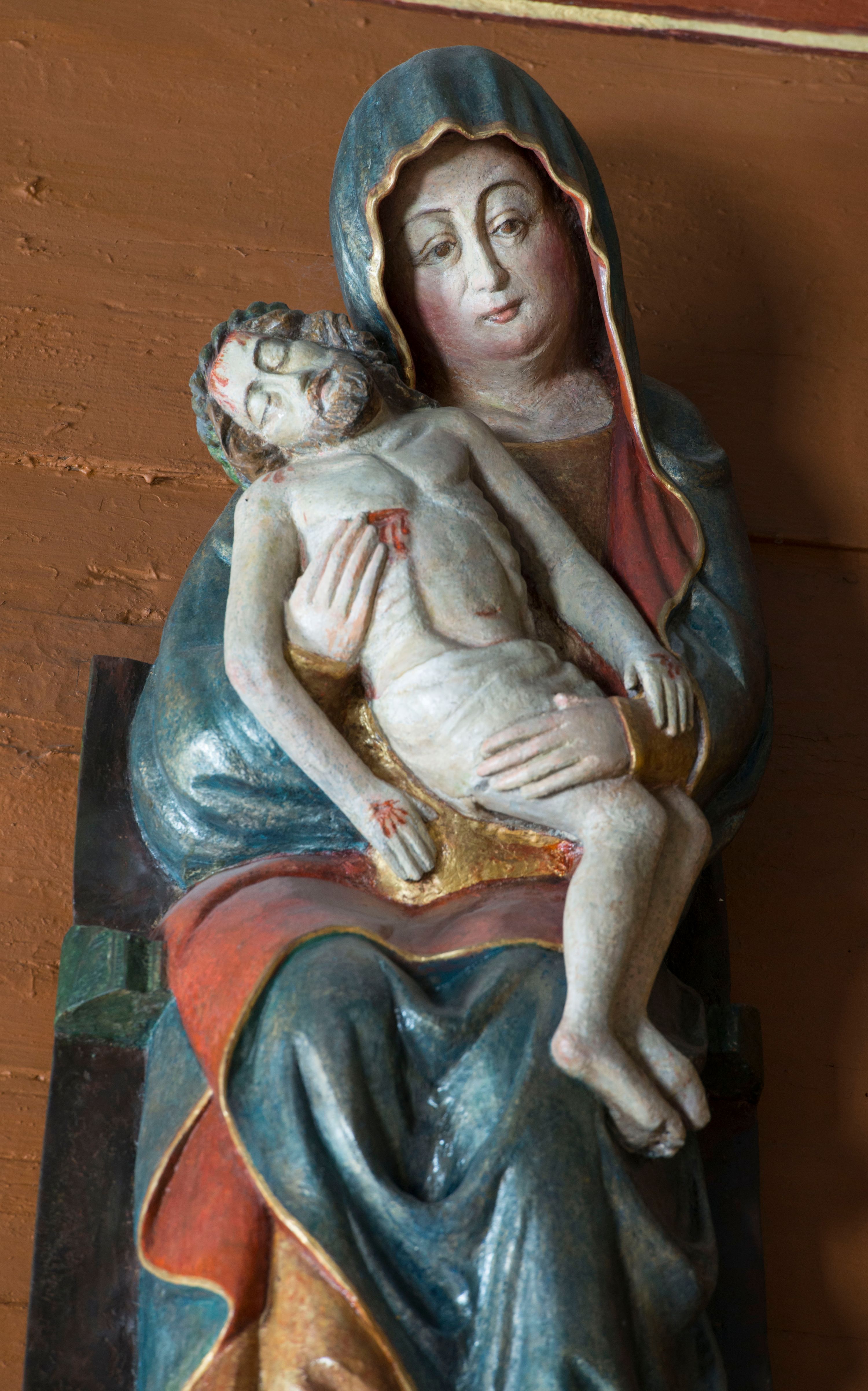Pieta w Jawiszowicach reprezentuje Pietę w tzw. typie Pieta corpusculum. Przedstawiono tutaj pełnopostaciową figurę siedzącej Marii, trzymającą na kolanach martwe ciało Chrystusa. Matka Boska jest lekko pochylona w prawą stronę. Obiema rękami podtrzymuje na swoich kolanach Chrystusa, opartego o jej prawe przedramię. Prawą ręką trzyma go za bok, a lewą kładzie na jego udach. Ma owalną twarz o jasnej karnacji z wysokim czołem. Jej oczy są duże, wyraźne. Maria ma długi, prosty nos, czerwone usta, rumiane policzki i nieznacznie zaznaczone zmarszczki podkreślające jej cierpienie. Matka Boska odziana jest w złotą tunikę i ciemnobłękitny maforion z czerwonym podbiciem lamowany złotem, okrywający jej postać. Fałdy płaszcza są misowate, miękko rzeźbione. Spód szaty odsłania brunatne ciżmy. Martwy Chrystus jest wielkości dziecka. Jego ciało z odchyloną głową ułożone jest prawie schodkowo. Twarz z zamkniętymi oczami okala zarost oraz włosy. Na głowie ma koronę cierniową, spod której sączą się na czoło stróżki krwi. Krew cieknie także z przebitego boku. Biodra Chrystusa okrywa jasne, miękko drapowane perizonium.