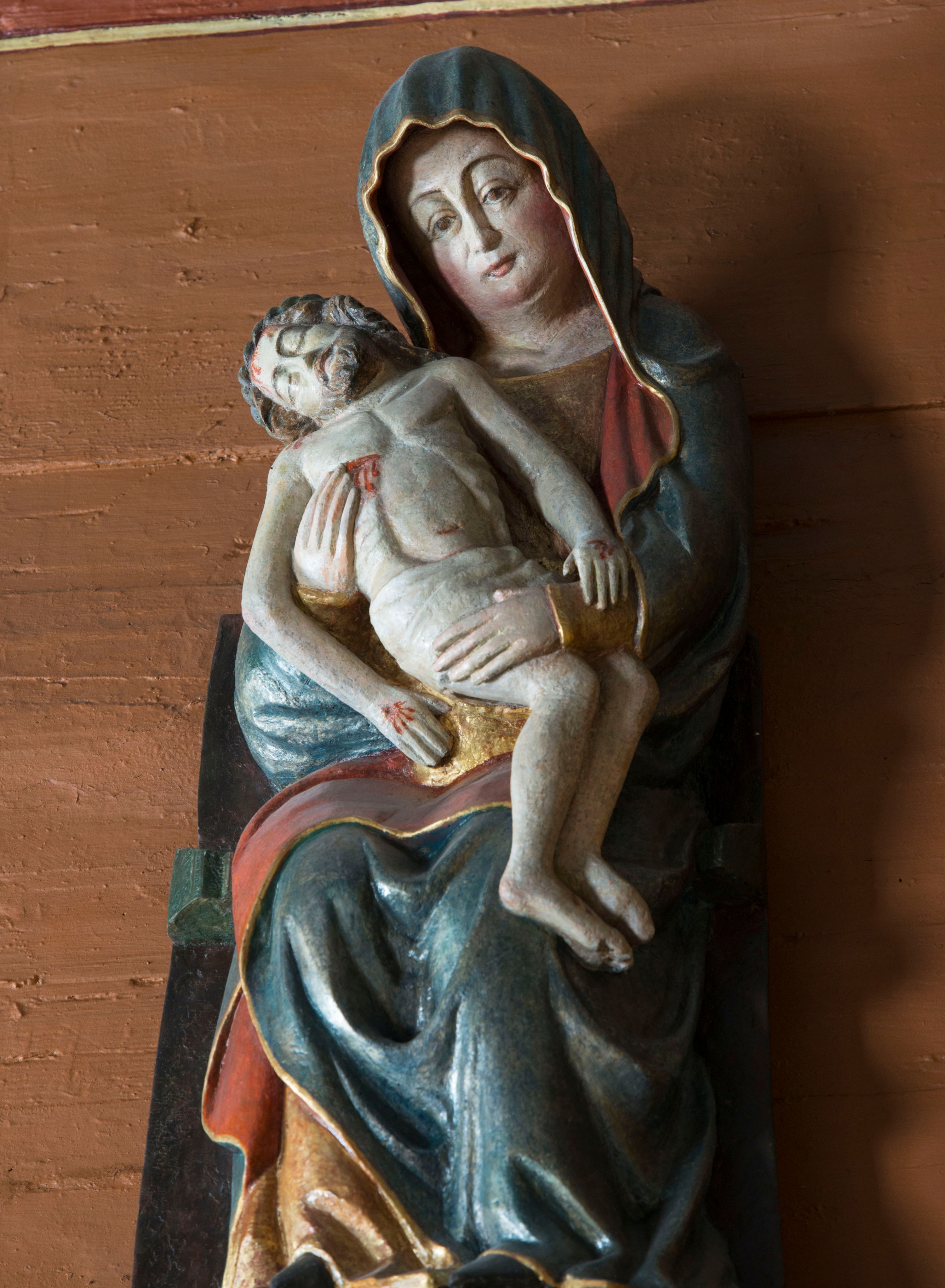 Pieta w Jawiszowicach reprezentuje Pietę w tzw. typie Pieta corpusculum. Przedstawiono tutaj pełnopostaciową figurę siedzącej Marii, trzymającą na kolanach mocno pomniejszone martwe ciało Chrystusa. W ten sposób odniesiono się do tajemnicy Wcielenia i równocześnie Odkupienia. Tego rodzaju treści były obecne już w polskiej sztuce romańskiej, czego przykład stanowi tympanon z kolegiaty NMP i św. Aleksego w Tumie pod Łęczycą z lat siedemdziesiątych XII wieku z przedstawieniem tzw. podwójnego Zwiastowania. Na uwagę zasługuje archaizująca forma rzeźby, inspirowana jeszcze romańskimi tronującymi madonnami.
