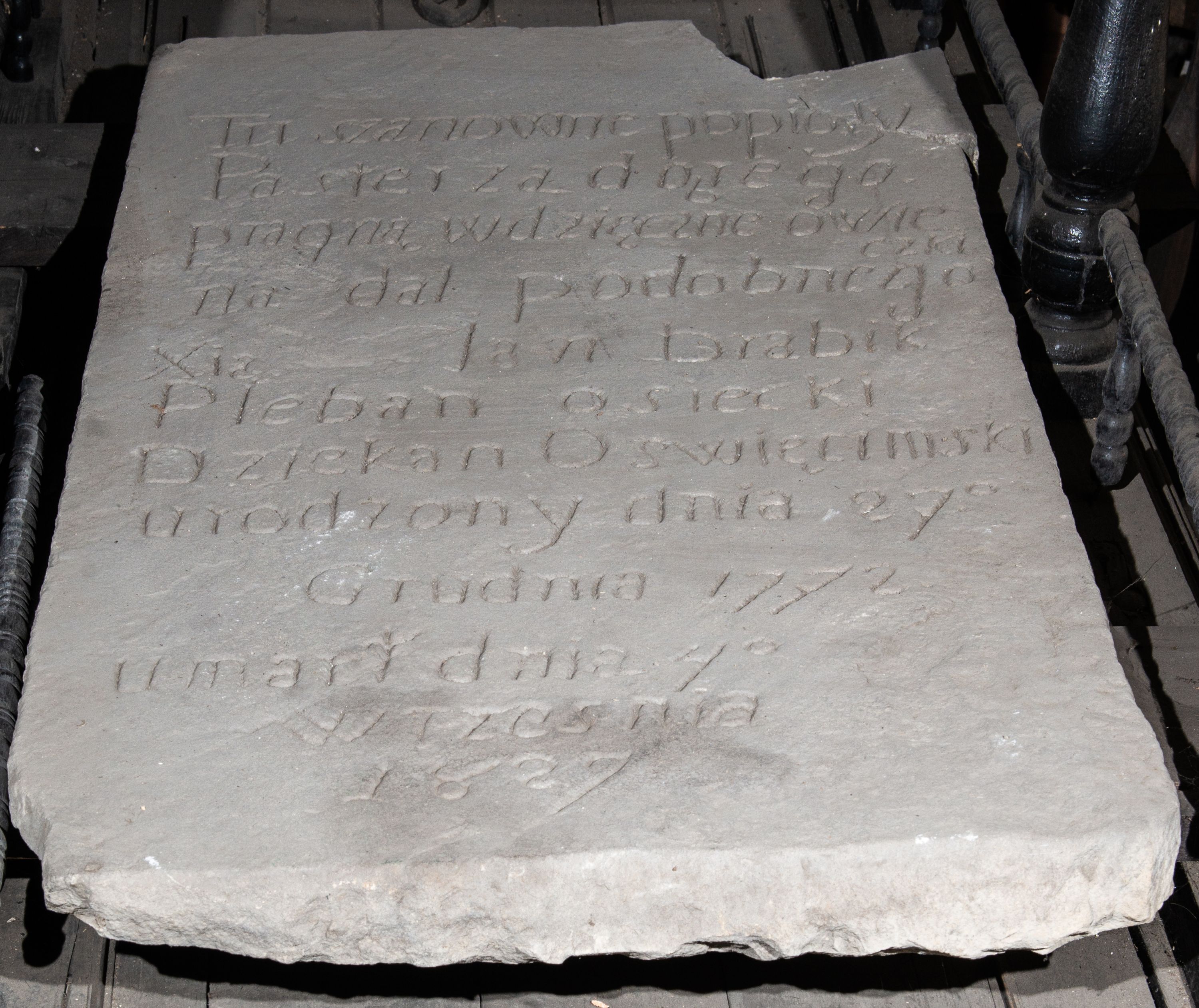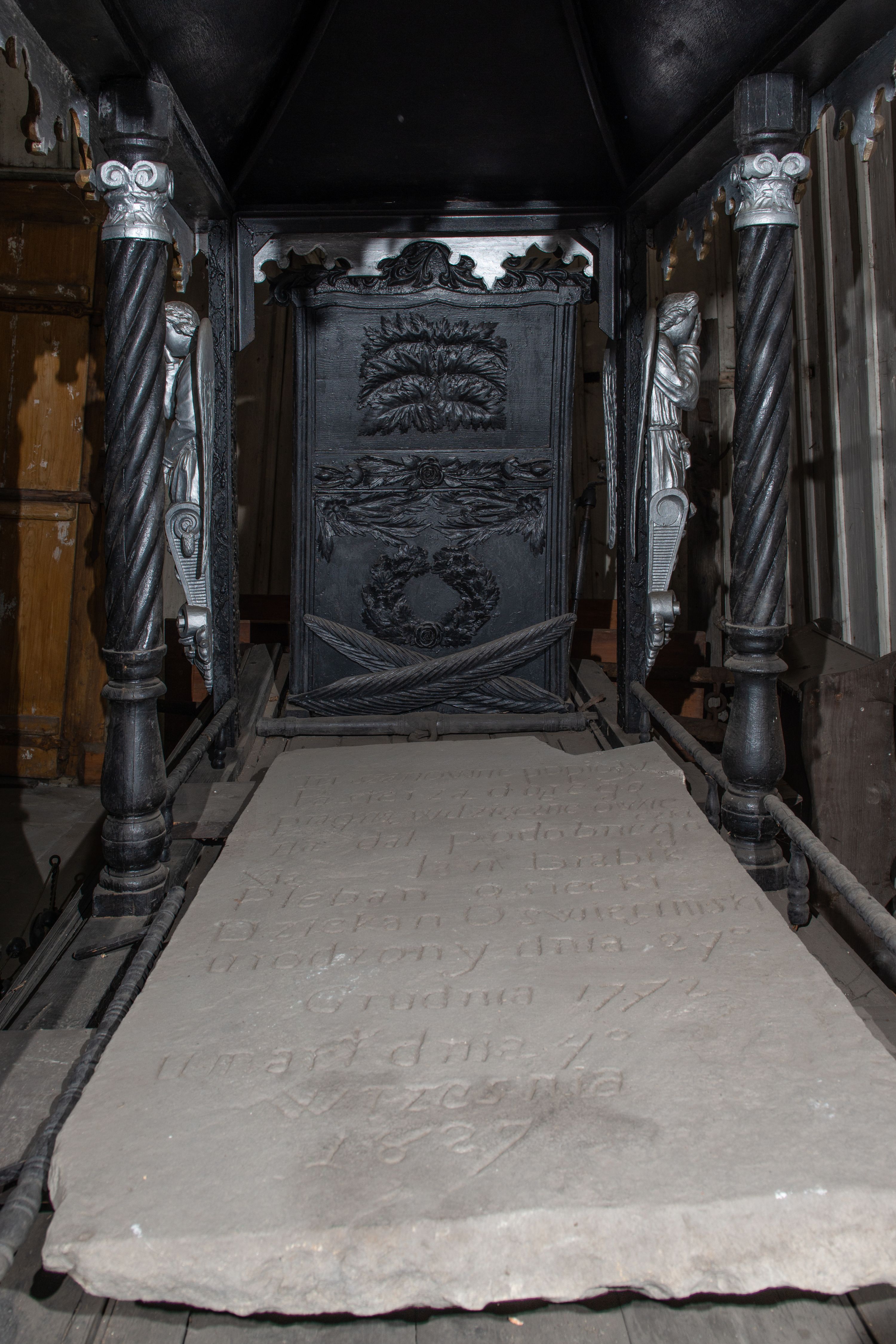 Płyta upamiętnia księdza Jana Drabika, proboszcza osieckiego i dziekana oświęcimskiego, urodzonego 27 grudnia 1772, a zmarłego 4 września 1827. Zapewne pierwotnie znajdowała się na przykościelnym cmentarzu, skąd została przeniesiona do kruchty podwieżowej.