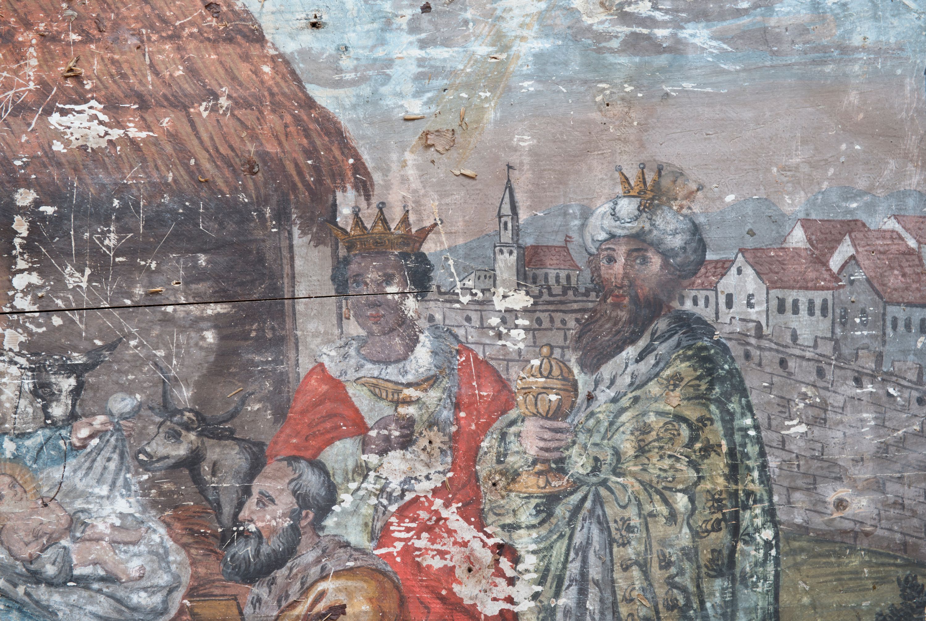 Na obrazie przedstawiono scenę odwołującą się do biblijnego przekazu o mędrcach, w której trzej władcy przybywają, by złożyć hołd nowo narodzonemu Jezusowi Chrystusowi. Od pierwszej połowy XII wieku władcy są ukazywani jako królowie, często również jako przedstawiciele trzech kontynentów – Europy, Afryki i Azji. Ubrani w kosztowne stroje, w koronach lub turbanach przynoszą ze sobą dary. Do miejsca objawienia prowadziła ich widoczna na niebie gwiazda.