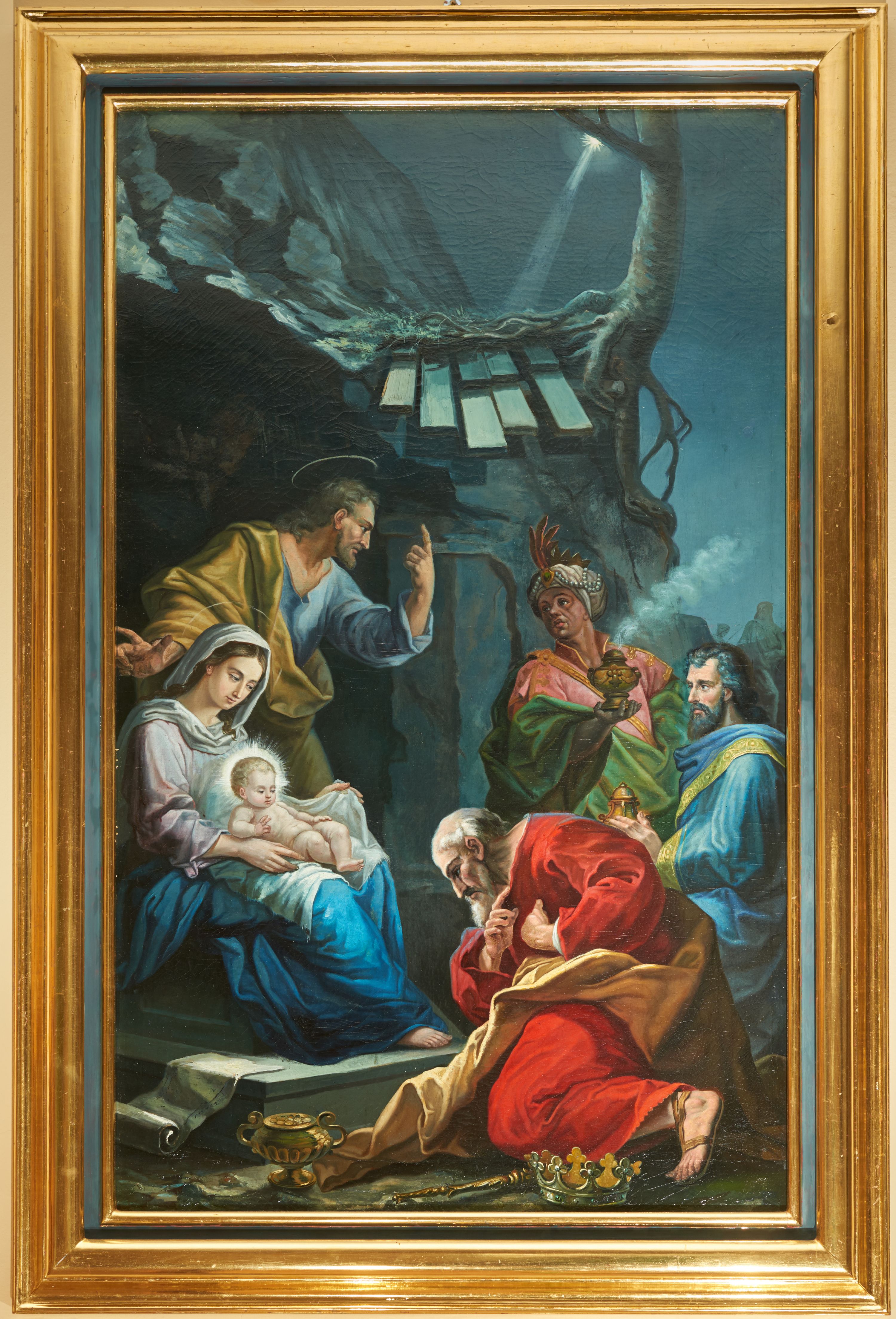 Obraz w kształcie stojącego prostokąta, ujęty złoconą, profilowaną ramą. W centrum kompozycji została przedstawiona scena Pokłonu Trzech Króli. Na pierwszym planie, z lewej strony obrazu siedzi Matka Boska z Dzieciątkiem na kolanach, zwrócona trzy czwarte w lewo na wysokim i dwustopniowym, kamiennym podeście. Maria ma owalną twarz o idealizowanych rysach. Ubrana jest w jasnoróżową suknię oraz niebieski płaszcz, na głowie ma założony biały welon. Dzieciątko leży na kolanach matki, na białej, rozłożonej pieluszce. Ma krótkie i jasne włosy, a wokół głowy promienisty nimb. Z tyłu za Matką Boską stoi św. Józef z rękami rozłożonymi na boki, który palcem wskazującym lewej dłoni pokazuje na niebo. Jego twarz jest ukazana z prawego profilu o rysach mężczyzny w średnim wieku, okoloną krótką brodą i długimi włosami. Ubrany jest w niebieską suknię oraz jasnobrązowy płaszcz. Po prawej stronie obrazu zostali ukazani Trzej Królowie. Pierwszy, klęczy przed Matką Boską głęboko pochylony, zwrócony w prawą stronę. Ma twarz o rysach starszego mężczyzny z łysiną nad czołem, z siwą brodą i włosami. Ubrany jest w czerwoną suknię oraz jasnobrązowy płaszcz odsłaniający ramiona. Przed nim leżą na ziemi: berło, korona i złote naczynie z monetami. Dalej klęczy drugi król, zwrócony w prawo, który trzyma w dłoniach złote naczynie. Ma rysy twarzy mężczyzny w średnim wieku. Ubrany jest w niebieski płaszcz o złotej bordiurze. Wyżej, nieco z lewej strony stoi trzeci król zwrócony delikatnie w lewo, z głową skierowaną w stronę św. Józefa. Król trzyma w dłoniach złotą kadzielnicę, z której unosi się dym. Ma ciemną karnację skóry, ubrany jest w różową suknię z wysokim, postawionym kołnierzem i złotymi zdobieniami oraz zielony płaszcz, a na głowie ma założony biały turban ozdobiony piórem i klejnotami. W tle ukazana jest surrealistyczna stajenka betlejmska znajdująca się w grocie z drzewem wyrastającym z dachu, na którą pada snop światła z gwiazdy betlejemskiej. W tle, po prawej stronie obrazu są również dwie słabo widoczne postacie. Dzieło utrzymane jest w niebieskiej kolorystyce z niewielką dominantą czerwieni na sukni jednego z królów.