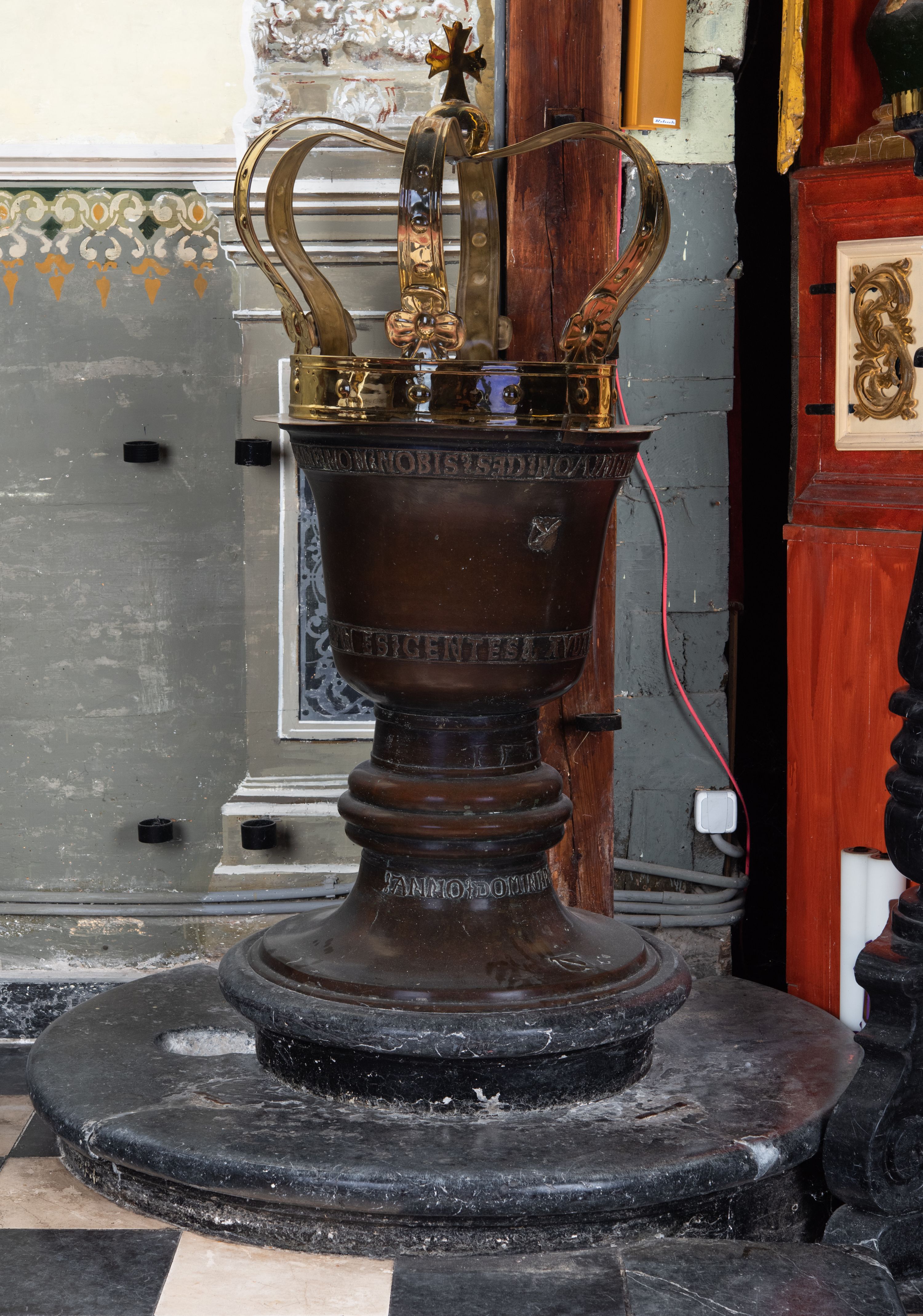 Pokrywa w kształcie korony podarowana parafii przez ojca Benedykta Parszywkę w 1852 roku zastąpiła wcześniejszą pokrywę pochodzącą z 1663 roku.