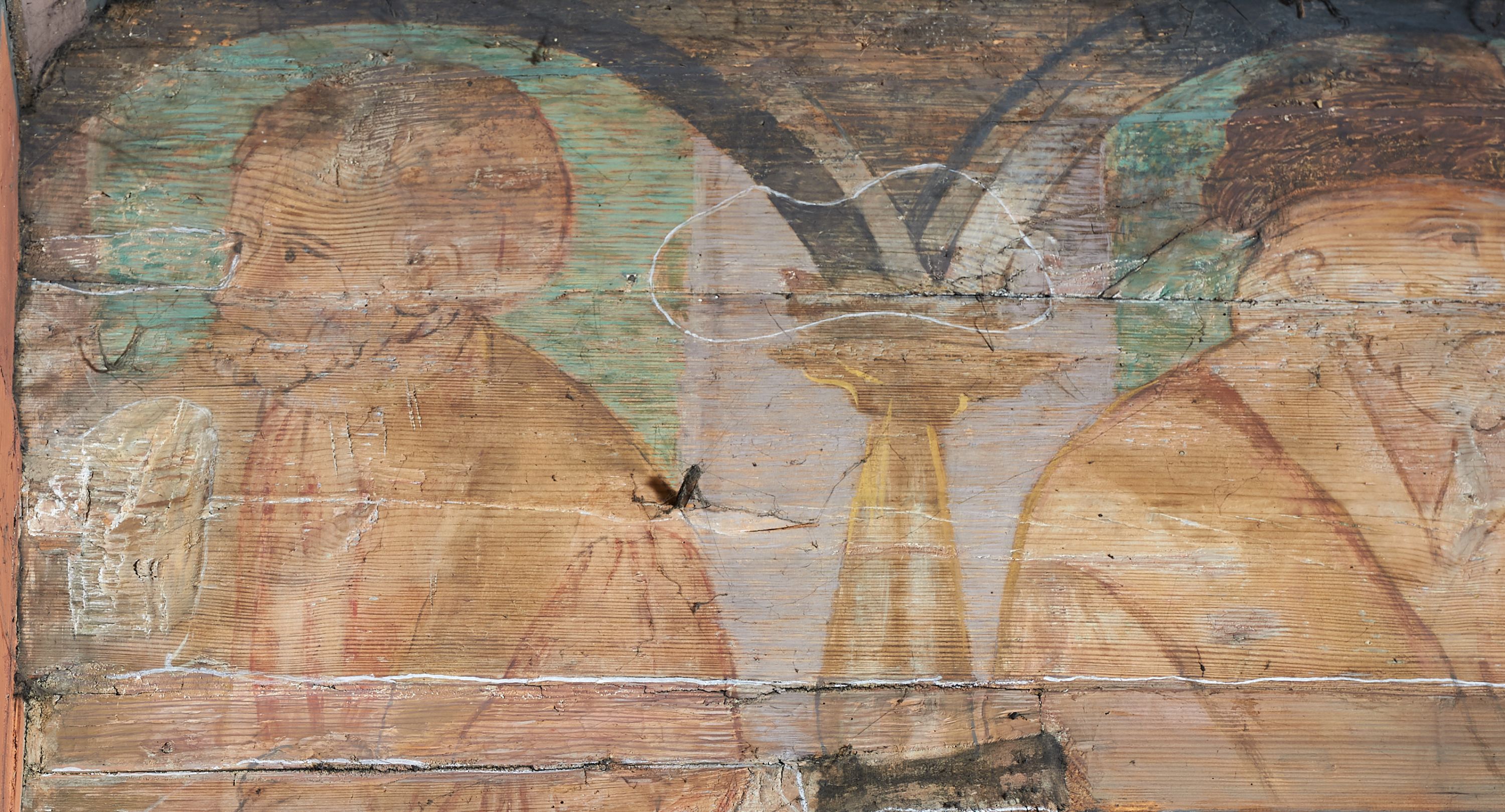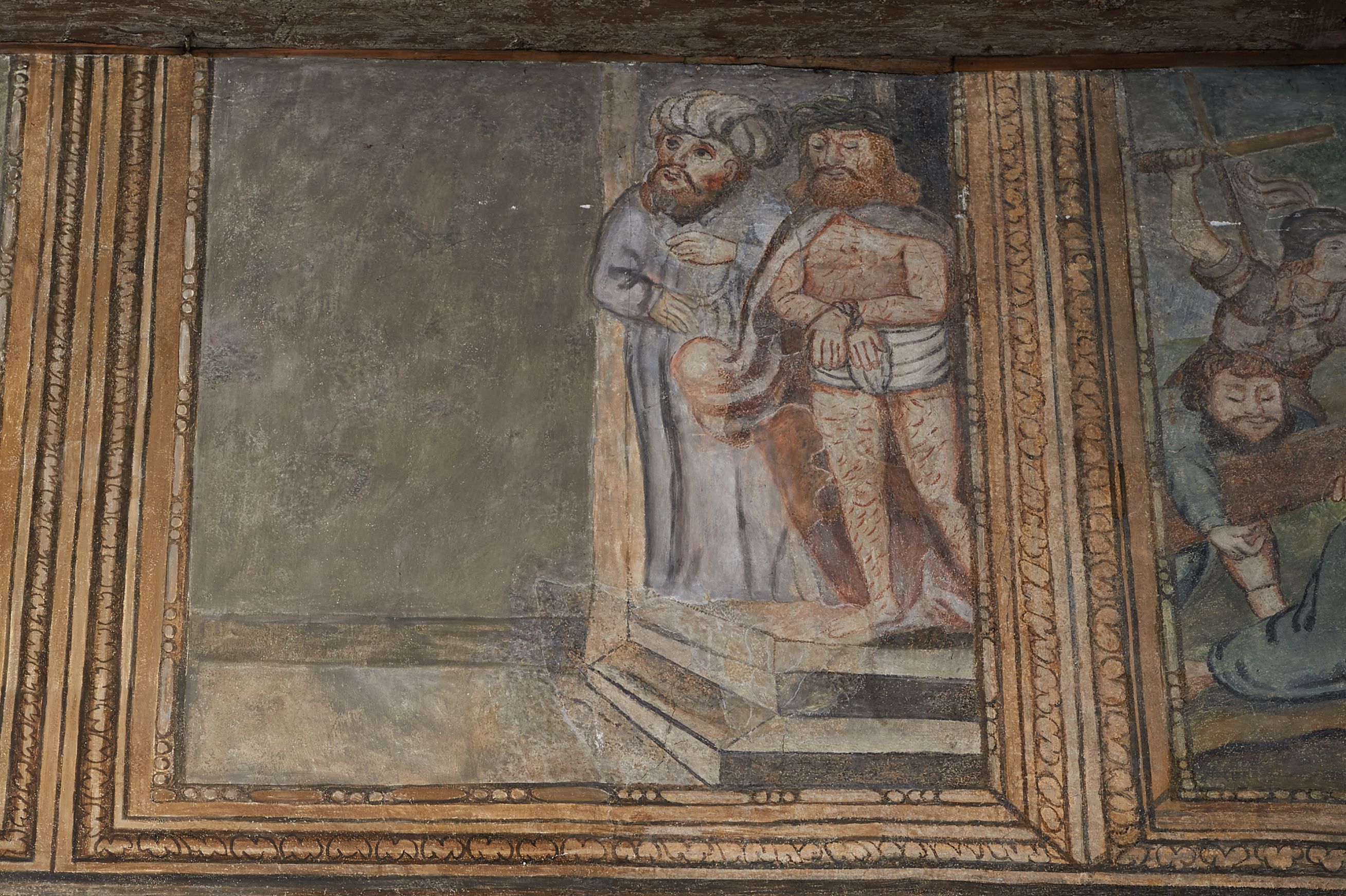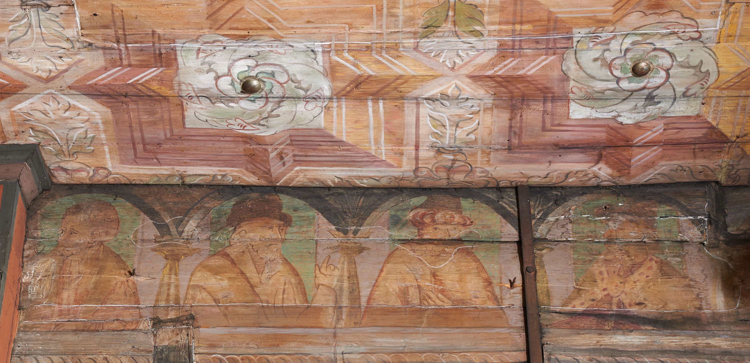 Późnorenesansowa polichromia stropów i ścian prezbiterium i nawy (pierwotnie również kaplic bocznych), wykonana w technice klejowej na drewnie. Na stropie prezbiterium iluzjonistycznie malowane kasetony, na ścianach galeria popiersi apostołów oraz przodków Chrystusa (królów starotestamentowych), umieszczonych w arkadach, poniżej malowana girlanda; na ścianach nawy cykl pasyjny oraz sceny z życia Chrystusa i Matki Boskiej. Malowidła wykonane w latach 1553-1562. Odsłonięte w wyniku prac konserwatorskich i częściowo zrekonstruowane (m.in. dekoracja stropu w nawie) przez Macieja Makarewicza w latach 1956-1957.