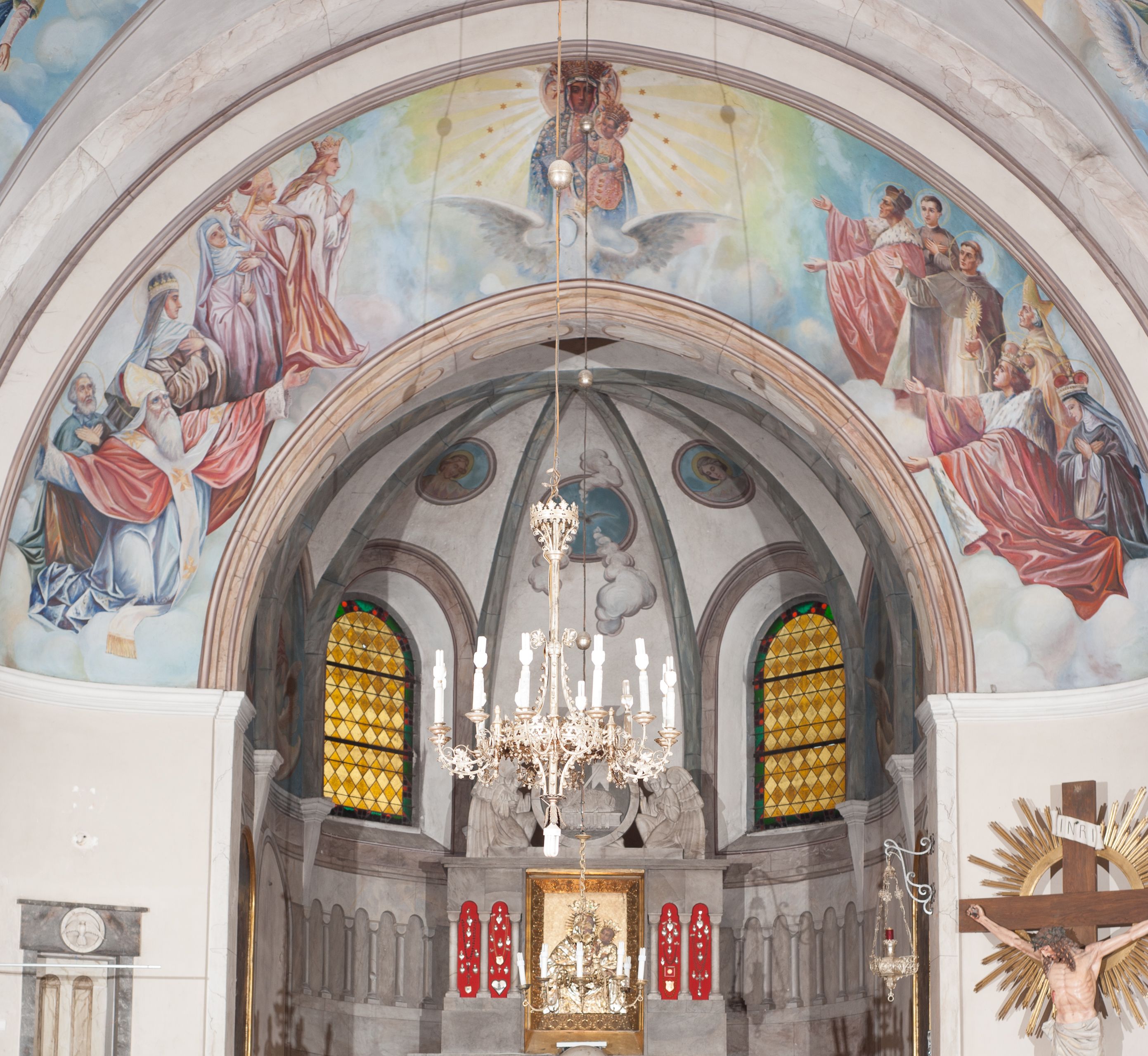 Arkada i ściana tęczowa: Na ścianie tęczowej znajduje się wielopostaciowa, figuralna kompozycja z umieszczonym w centrum przedstawieniem Matki Boskiej Częstochowskiej unoszącej się na skrzydłach orła białego. Przedstawienie to jest flankowane przez dwie grupy świętych. Popiersie Marii z Dzieciątkiem ukazano na tle obłoków oraz promienistej glorii oraz ujęto wieńcem dwunastu gwiazd. Z lewej strony kompozycji ukazano sześcioosobową grupę klęczących świętych, zwracających się w kierunku Marii. Od lewej przedstawiony św. Andrzej Bobola z rękoma skrzyżowanymi na piersi, św. Wojciech w infule i paliuszu szeroko rozpościerający ramiona, św. Kinga w brązowym habicie klaryski z koroną na głowie, błogosławiona Bronisława w jasnoróżowym habicie, z krucyfiksem w dłoni, św. Stanisław biskup i męczennik z pastorałem w dłoni oraz infule na głowie i św. Jadwiga Królowa przedstawiona w złotej koronie i gronostajowym płaszczu. Sześcioosobową grupę świętych ukazanych z prawej strony kompozycji od lewej otwiera postać św. Jana Kantego przedstawionego w birecie oraz obszernym, czerwonym płaszczu z gronostajowym kołnierzem. Za nim przedstawiony św. Stanisław Kostka z rękoma skrzyżowanymi na piersi, następnie św. Jacek w habicie dominikańskim z monstrancją w ręku, błogosławiony Wincenty Kadłubek w stroju biskupim, św. Kazimierz Królewicz w mitrze książęcej oraz czerwonym płaszczu podbitym gronostajem i błogosławiona Salomea przedstawiona w brązowym habicie klaryski, z mitrą na głowie.