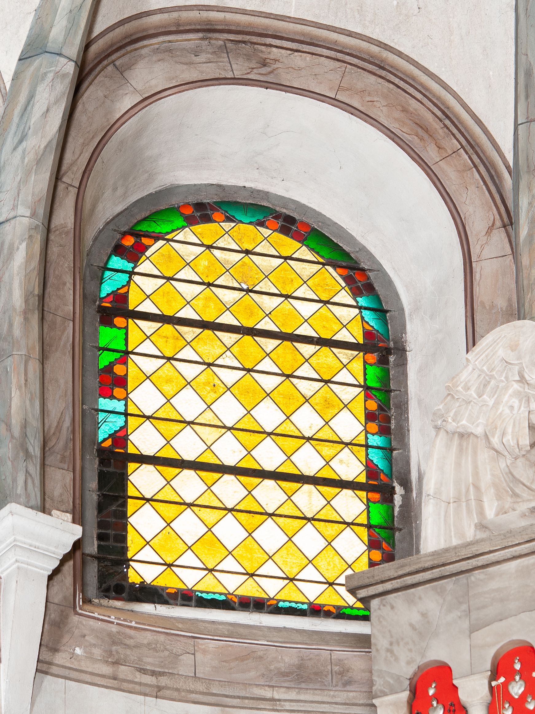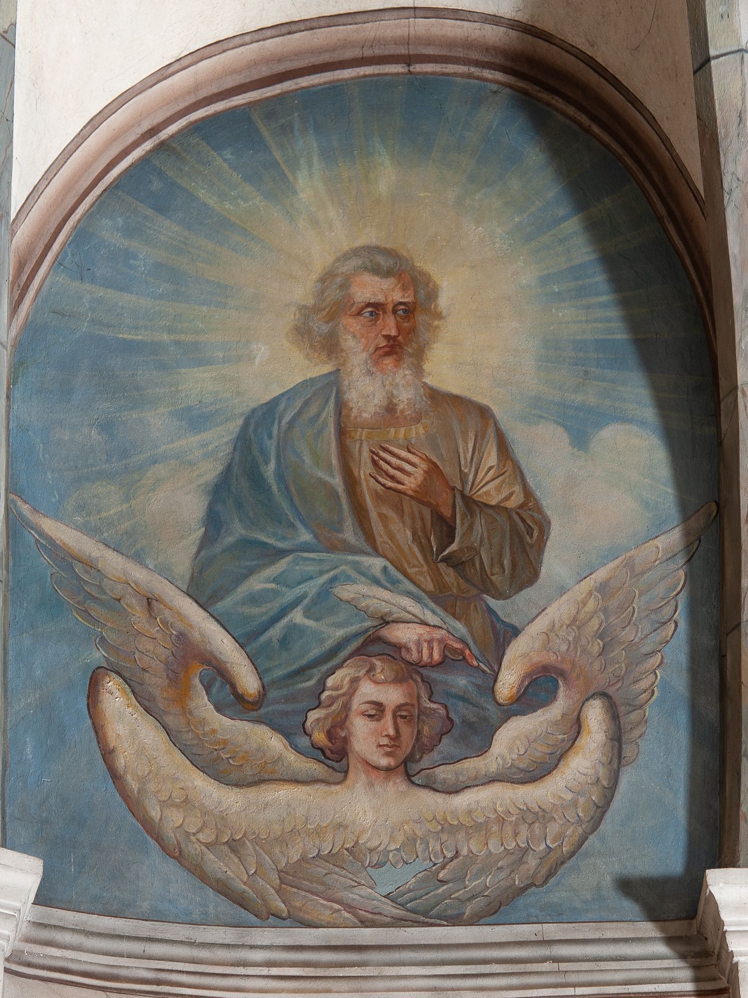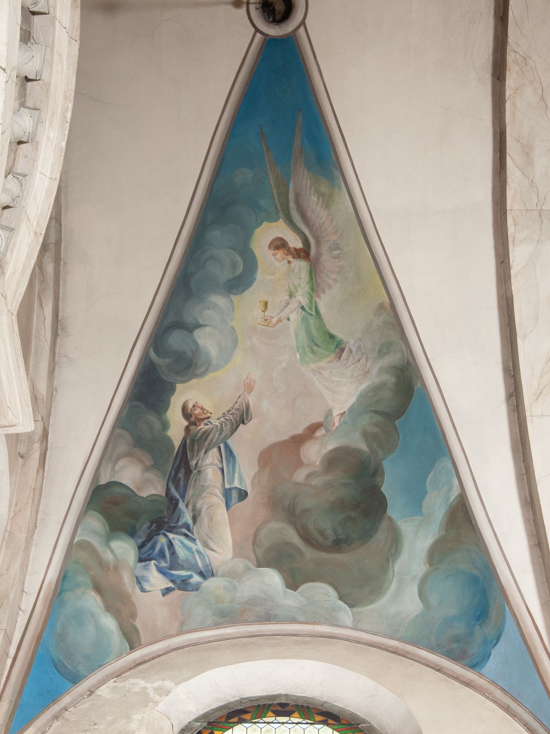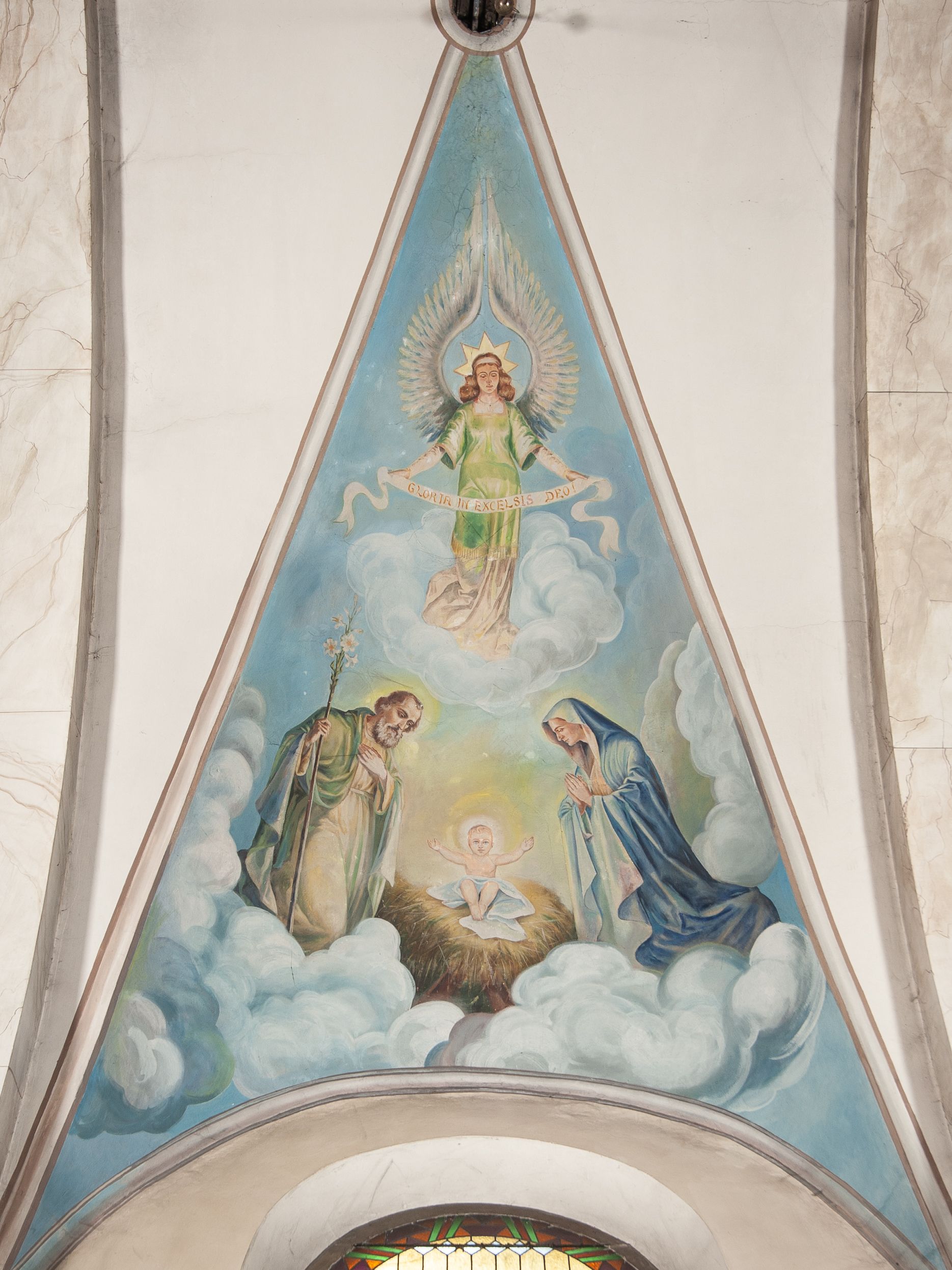 Nawa główna: W nawie sklepienie kolebkowe z lunetami, trójprzęsłowe. Pola sklepienne malowane na kolor jasnobeżowy. W każdym z przęseł, w lunetach sceny figuralne, tworzące cykl ikonograficzny obrazujący sceny z życia Chrystusa i Marii. Wszystkie sceny umieszczone na tle nieba i obłoków. Cykl otwiera scena Zwiastowania umieszczona w pierwszym od prezbiterium przęśle sklepienia po lewej (północnej) stronie. W obłokach ukazani Maria (z prawej) oraz archanioł Gabriel (z lewej), ponad którymi unosi się gołębica Ducha Świętego otoczona świetlistą glorią. Maria przedstawiona jako młoda, jasnowłosa kobieta z ciałem zwróconym w prawo. Głowa otoczona nimbem, pochylona do dołu, prawa ręka złożona na piersi. Postać ubrana jest w białą suknię oraz błękitny płaszcz. Archanioł Gabriel ukazany z profilu w dynamicznej pozie z prawą ręką uniesioną do góry i lewą wyciągniętą do przodu, w której trzyma kwiat lilii. Anioł ubrany jest w długą, jasnoróżową szatę. W kolejnym przęśle przedstawiono Boże Narodzenie. W dolnej części kompozycji ukazani św. Józef (z lewej) i Maria (z prawej) klęczący w obłokach, obok żłóbka z Dzieciątkiem Jezus. Józef ukazany jako dojrzały, brodaty mężczyzna w żółtej szacie i zielonym płaszczu, trzymający w prawej ręce kwiat lilii. Maria przedstawiona jako młoda kobieta z dłońmi złożonymi w geście modlitwy, ubrana w jasnoróżową szatę oraz błękitny płaszcz, którego poła nakrywa jej głowę. Dzieciątko Jezus przepasane białą materią, ukazane frontalnie z rękami wyciągniętymi do góry. W górnej części kompozycji przedstawiony frontalnie długowłosy anioł w jasnozielonej szacie trzymający oburącz banderolę z napisem „GLORIA IN EXCELSIS DEO”. W trzecim przęśle scena Modlitwy w Ogrójcu. Z lewej strony kompozycji przedstawiony z profilu, klęczący Chrystus unoszący do góry ręce złożone w geście modlitwy. Postać ubrana w długą, białą szatę oraz luźno przerzucony przez ramię jasnobłękitny płaszcz. Z prawej strony kompozycji, naprzeciw Chrystusa ukazujący się w obłokach anioł trzymający złoty kielich. Anioł przedstawiony jako długowłosa, młodzieńcza postać ubrana w biało-zielone szaty. Wokół obu postaci rama utworzona z ciemnoszarych, skłębionych obłoków. Kolejne przedstawienia figuralne znajdują się w prawej (południowej) części sklepienia. W pierwszym od strony chóru przęśle przedstawiono Ukrzyżowanie. W centrum kompozycji ukrzyżowany Chrystus z ramionami uniesionymi do góry, tworzącymi linię litery „V”, uniesioną głową w koronie cierniowej oraz stopami przebitymi jednym gwoździem. Postać przepasana długim, białym perizonium. U stóp krzyża ukazani w dynamicznych pozach, z rękoma wzniesionymi do góry św. Jan Ewangelista (z lewej) oraz Maria (z prawej). Święty Jan ubrany w zieloną szatę oraz rozwiany żółto-różowy płaszcz. Maria ukazana w jasnoróżowej sukni oraz granatowo-zielonym płaszczu i chuście na głowie. W kolejnym przęśle przedstawiono scenę Zmartwychwstania. W centrum kompozycji ukazany frontalnie, całopostaciowo zmartwychwstały Chrystus w obszernym, układającym się w dynamicznie załamujące się fałdy, czerwonym płaszczu. Jezus prawą, uniesioną do góry ręką błogosławi, w lewej trzyma chorągiew paschalną. W dolnej części kompozycji przedstawiony anioł w błękitnej szacie podtrzymujący wieko grobowca. W ostatnim przęśle znajduje się scena Wniebowzięcia Marii. W centrum kompozycji, na jasnożółtym tle frontalnie przedstawiona, unosząca się ponad obłokami Maria. Postać ukazana jako młoda kobieta z głową otoczoną wieńcem z gwiazd i rękami uniesionymi do góry. Ubrana jest w jasnoróżową suknię oraz spięty pod szyją, błękitny płaszcz. W dolnej części kompozycji dwa anioły ukazane w dynamicznych pozach. Anioł z lewej strony w zielonej sukni, anioł z prawej w jasnoróżowej. Na ścianie zachodniej kościoła, na wysokości parapetu chóru muzycznego dwie prostokątne płyciny zamknięte łukiem półokrągłym. Płycina z lewej mieści przedstawienie św. Cecylii grającej na organach, płycina z prawej wizerunek króla Dawida grającego na harfie. Pasy gurtów sklepiennych w nawie dekorowane są geometryczną dekoracją z malowanymi pseudopłycinami w kształcie poziomego prostokąta o krótszych bokach zamkniętych łukiem półkolistym z uskokiem. Filary artykułujące nawę, parapet chóru muzycznego oraz gzyms na ścianie zachodniej świątyni polichromowane w odcieniach szarości z efektem marmoryzacji naśladującej kolorystykę alabastrowych elementów wyposażenia kościoła.
