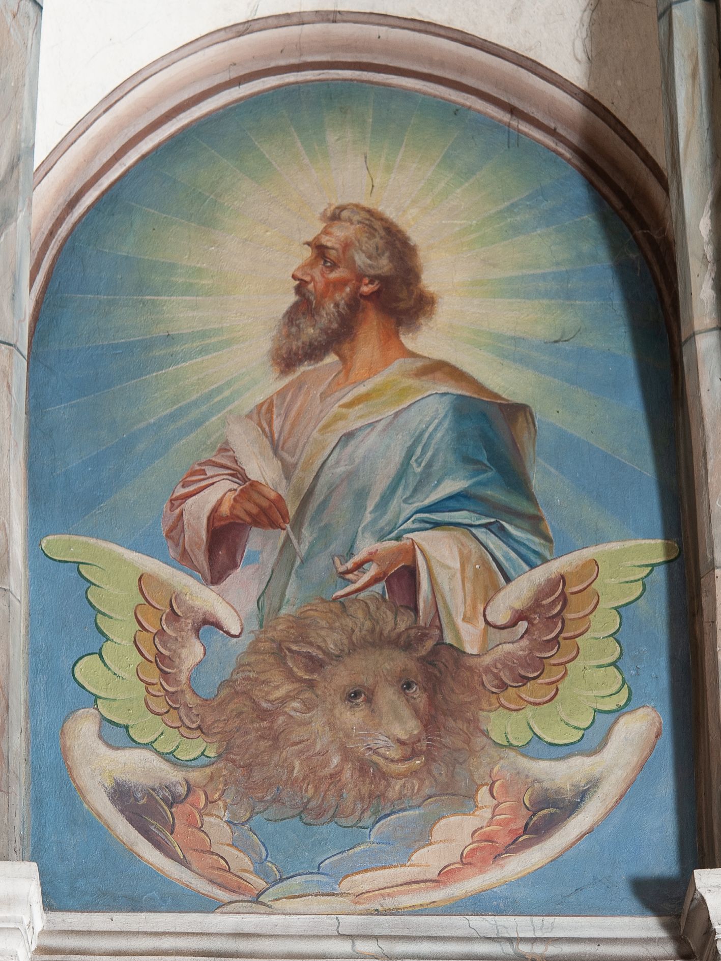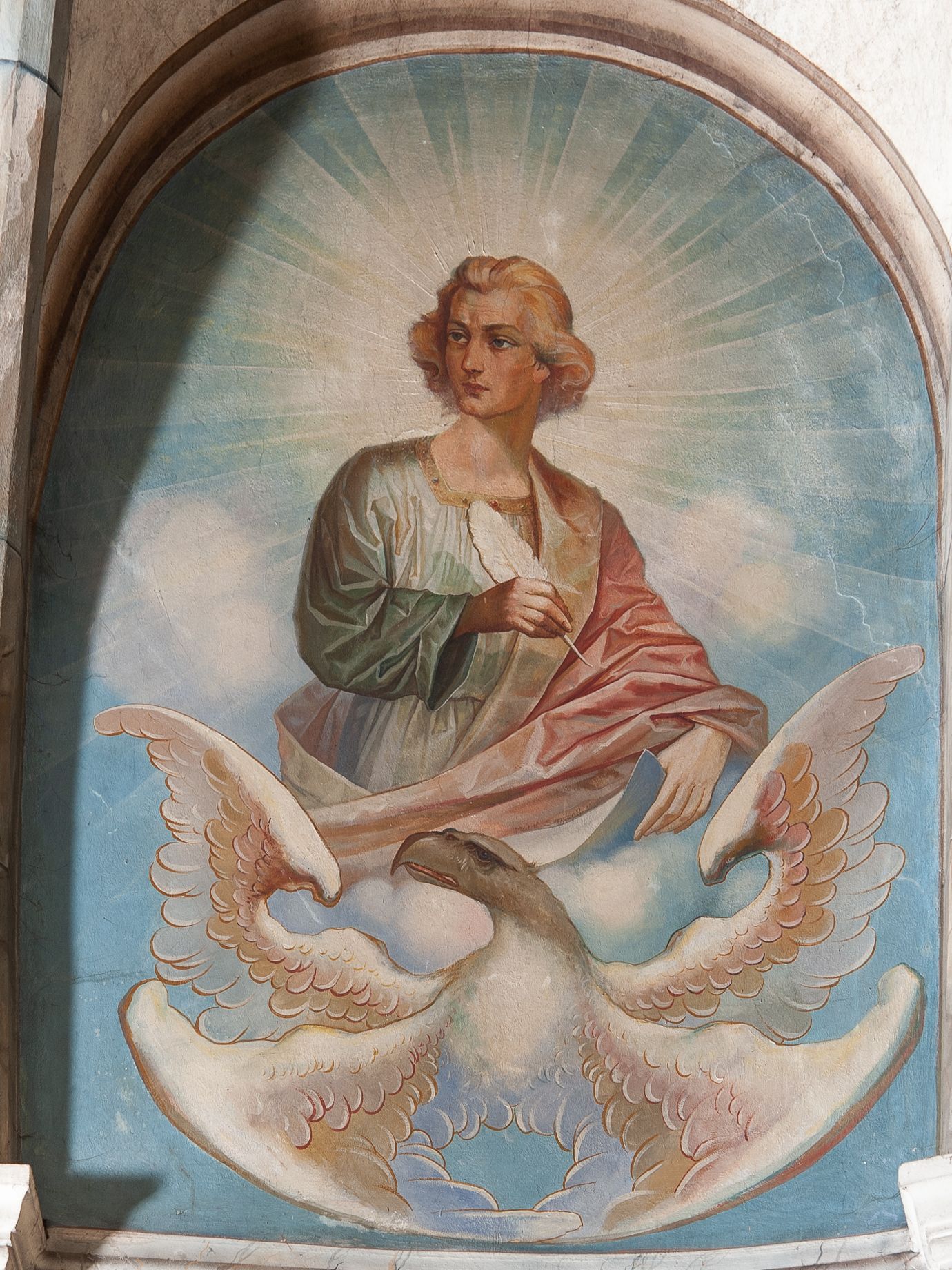 Sklepienie krzyżowo-żebrowe, dwuprzęsłowe. Pola sklepienne malowane są na kolor beżowy. Od strony wschodniej z centralnie umieszczonymi trzema kolistymi medalionami, mieszczącymi przedstawienie gołębicy Ducha Świętego w obłokach na błękitnym tle (w medalionie centralnym) oraz przeciwstawnie ustawione popiersia dwóch serafinów przedstawionych jako jasnowłosi młodzieńcy w pastelowych szatach, z nimbem wokół głowy (w medalionach skrajnych). W ścianach tarczowych umieszczone wizerunki czterech ewangelistów wraz z ich atrybutami. W pierwszym od wschodu przęśle przedstawienie św. Jana z orłem (po lewej od ołtarza) i św. Mateusza z aniołem (po prawej). W przęśle drugim wizerunek św. Łukasza z uskrzydlonym bykiem (po lewej) i św. Marka z uskrzydlonym lwem (po prawej). Ewangeliści ukazani w popiersiu, na tle błękitnego nieba, obłoków i promienistego nimbu. W dolnej części każdej z kompozycji przedstawione symbole każdego z ewangelistów. Święty Jan ukazany jako młody, jasnowłosy mężczyzna z głową zwróconą w prawo. Ubrany jest w jasnozieloną szatę oraz luźno przerzucony przez ramię różowy płaszcz. W prawym ręku trzyma pióro, w lewym księgę. Świętego Mateusza przedstawiono jako starszego, siwowłosego i brodatego mężczyznę z głową zwróconą w lewo. Ubrany jest w złotą szatę oraz błękitny płaszcz. Swoją lewą rękę składa na piersi, prawą wskazuje w dół. Święty Łukasz przedstawiony jest jako starszy siwowłosy i brodaty mężczyzna ukazany w dynamicznej pozie – z głową z profilu zwróconą w lewo oraz lewą ręką uniesioną do góry. Postać ubrana jest w jasnofioletową szatę oraz błękitny płaszcz. Świętego Marka przedstawiono z ciałem zwróconym w trzech czwartych w prawo i głową ujętą z profilu. Ewangelistę ukazano jako dojrzałego, brodatego mężczyznę o ostrych rysach. Ubrany jest w różową szatę oraz błękitny płaszcz z jasnozieloną podszewką. W swoim prawym ręku trzyma pióro. Elementy architektoniczne takie jak żebra sklepienne, obramienia okien i arkadowych nisz oraz gzyms przebiegający na linii parapetów okiennych są polichromowane w odcieniach szarości z efektem marmoryzacji naśladującej kolorystykę alabastrowych elementów wyposażenia kościoła.