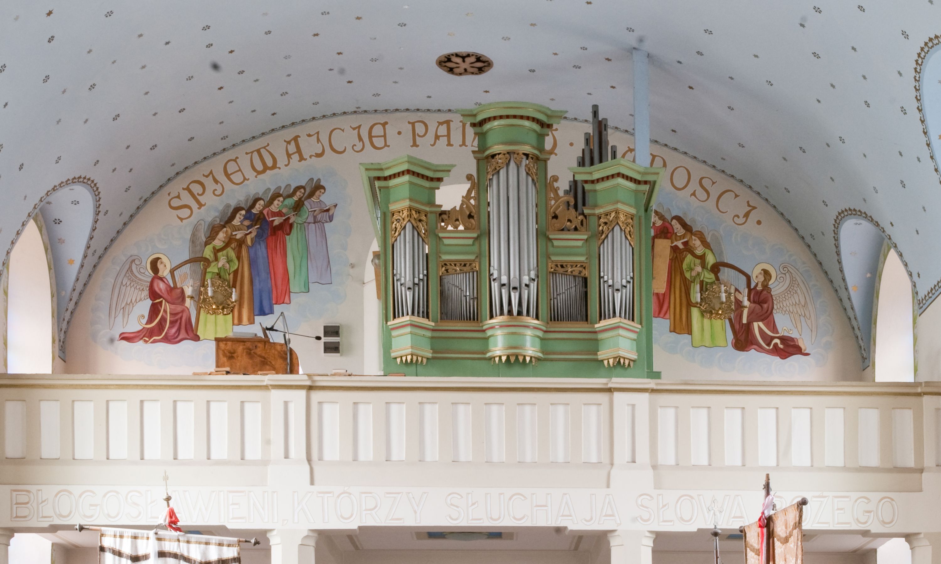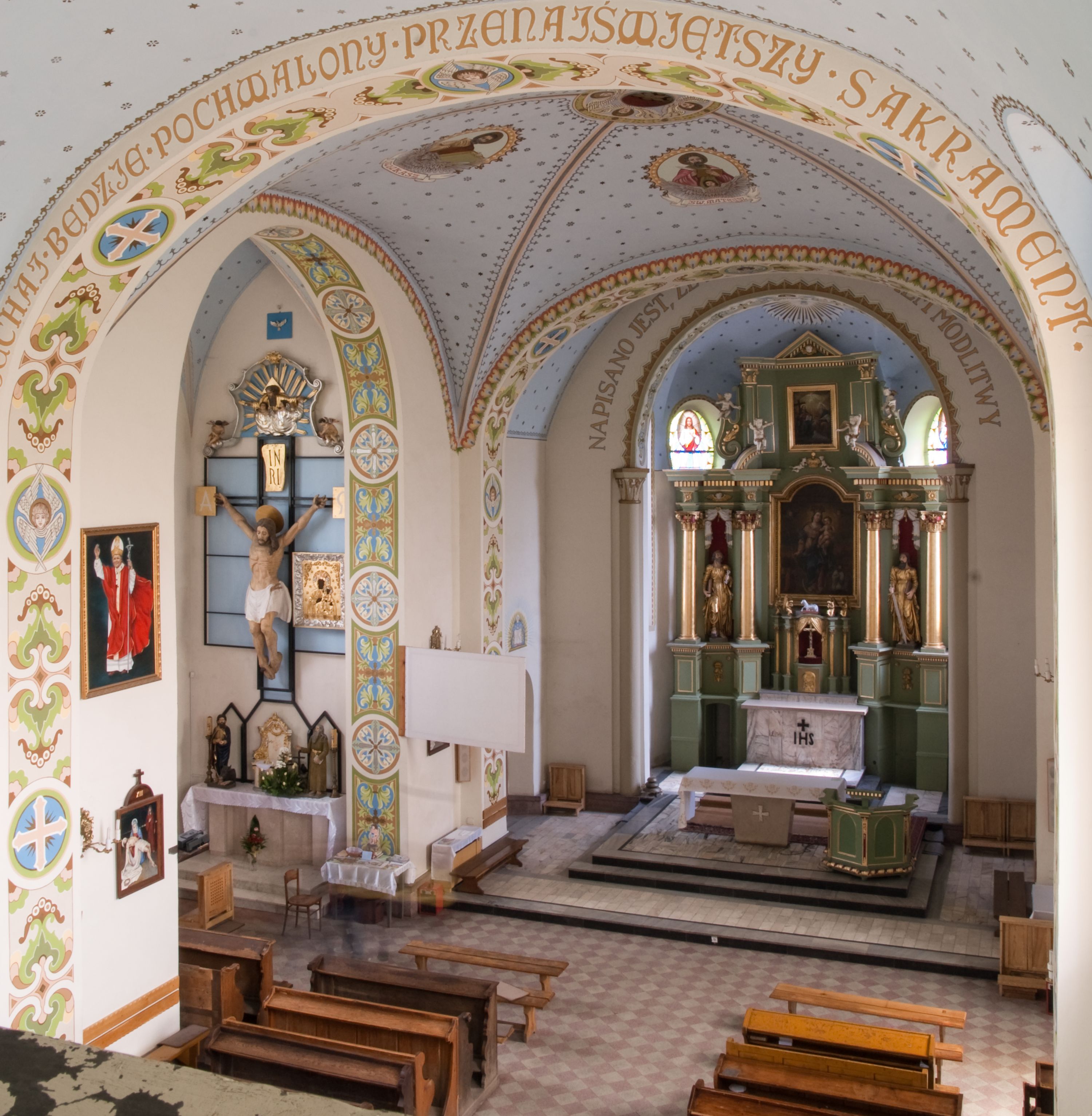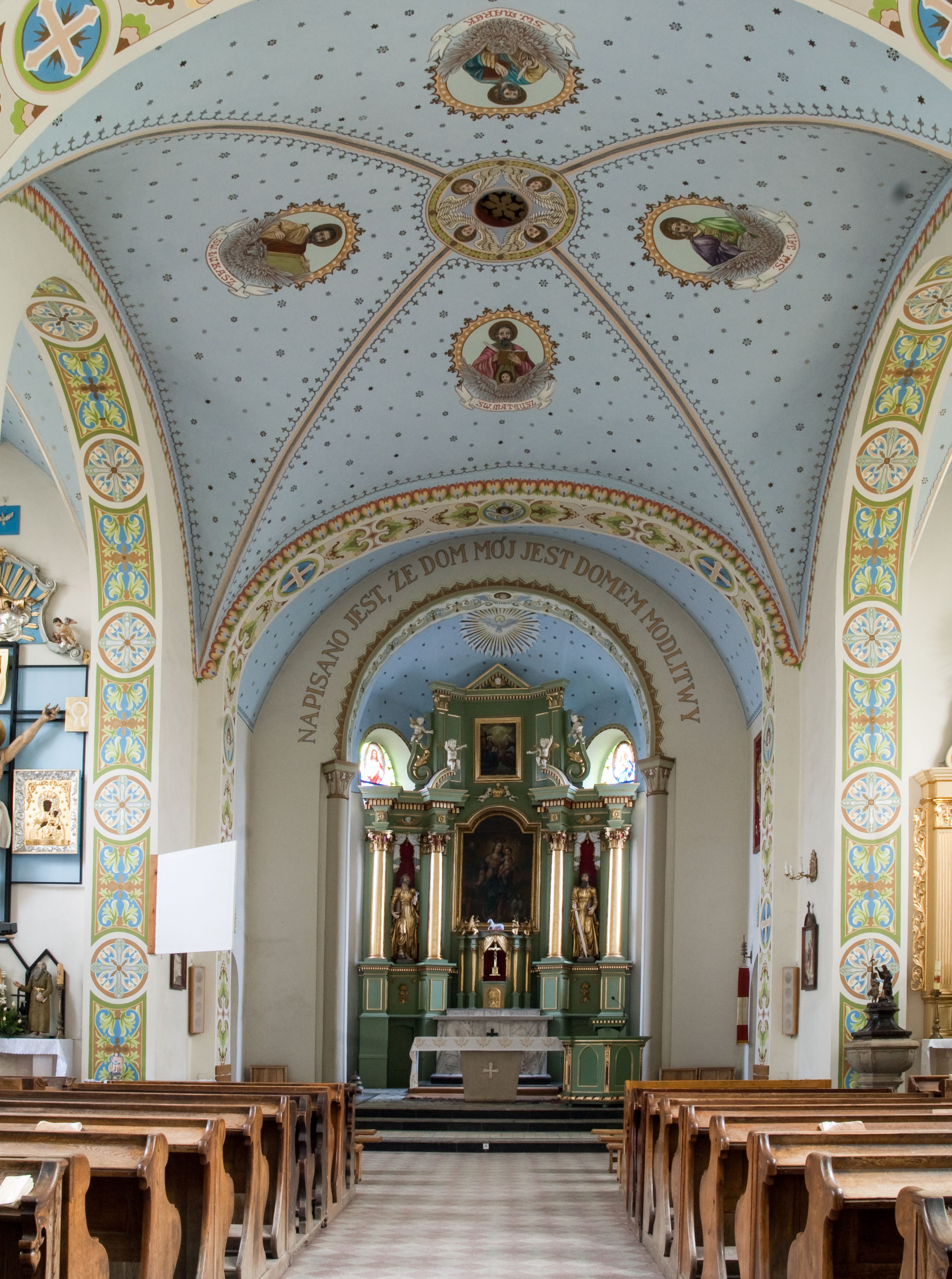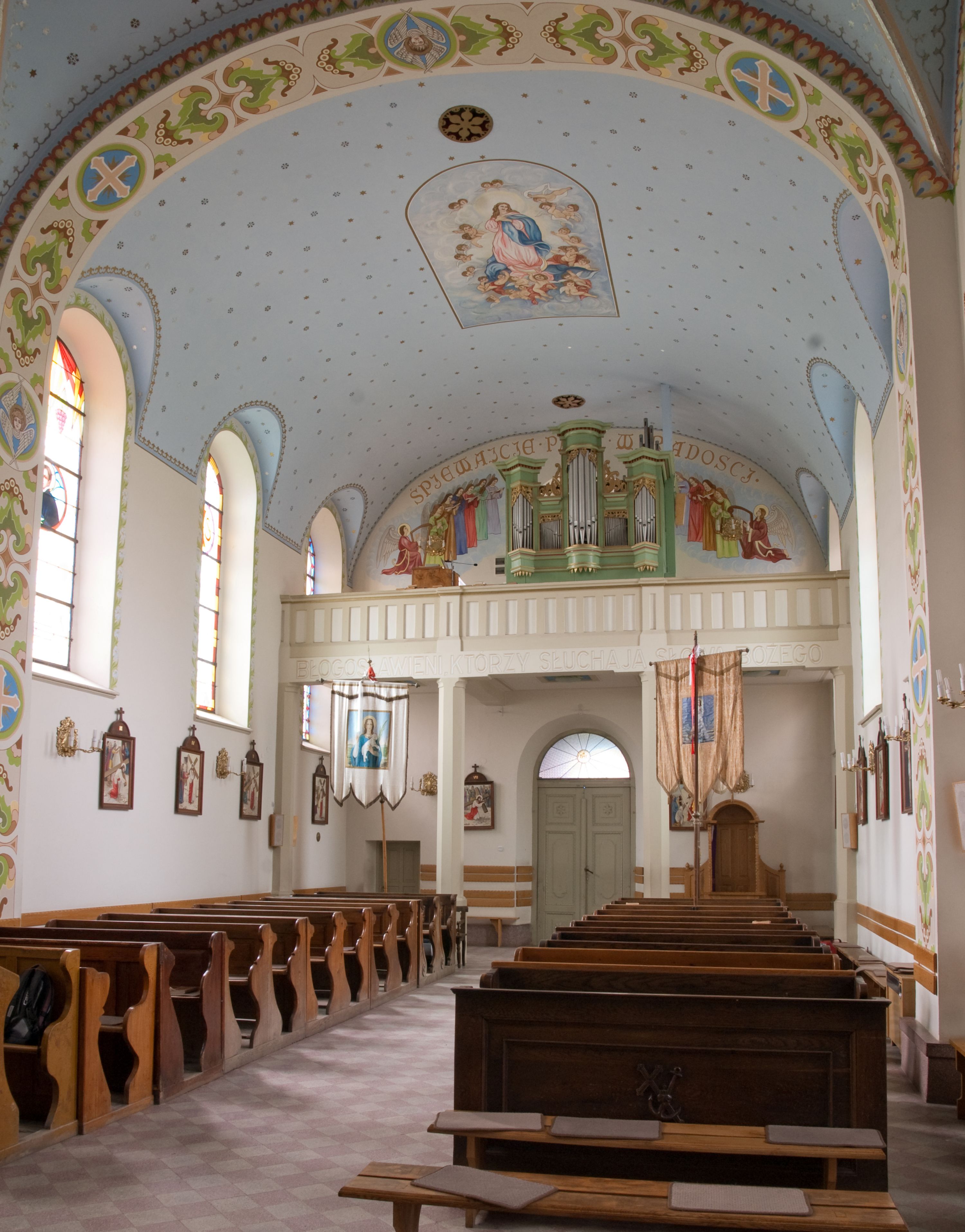 W prezbiterium do wysokości parapetów okiennych ściany malowane jednolicie w kolorze beżowym. Powyżej, na sklepieniu motyw gwiaździstego nieba z niewielkimi malowanymi złotem gwiazdkami na jasnobłękitnym tle. Ponad ołtarzem głównym gołębica Ducha Świętego na tle glorii promienistej tworzącej motyw dekoracyjnej rozety. Obramienia okienne zaznaczone geometrycznymi, złotymi lamówkami; rozglifienia okien białe. W podniebiu arkady tęczowej pas stylizowanego, symetrycznego ornamentu roślinnego w kolorach jasnoniebieskim, beżowym i jasnobrązowym. W osi uskrzydlona główka anielska. Na licu ściany tęczowej majuskułowy, złoty napis „NAPISANO JEST, ŻE DOM MÓJ JEST DOMEM MODLITWY”. W nawie głównej i transepcie ściany malowane jednolicie w kolorze beżowym. W południowym ramieniu transeptu, ponad ołtarzem motyw czteroliścia z wpisanym medalionem mieszczącym gorejące serce Jezusa, oplecione cierniową koroną i zwieńczone krzyżem. Na ścianie zachodniej, ponad chórem muzycznym dwie ustawione przeciwstawnie grupy muzykujących aniołów umieszczone na tle obłoków oraz majuskułowy, złoty napis „ŚPIEWAJCIE PANU W RADOŚCI”. Na artykułujących nawę filarach przechodzących w gurty sklepienne stylizowany, symetryczny ornament roślinny o przebiegu pasowym z wplecionymi motywami rozet z wpisanymi krzyżami równoramiennymi lub uskrzydlonymi główkami cherubinów. Ornament utrzymany w kolorach jasnozielonym, błękitnym, jasnobrązowym i beżowym. Na licu gurtu sklepiennego od strony zachodniej majuskułowy, złoty napis „NIECHAJ BĘDZIE POCHWALONY PRZENAJŚWIĘTSZY SAKRAMENT”. Sklepienie krzyżowe na przecięciu naw i ramionach transeptu oraz kolebkowe w nawie głównej malowane kolorem jasnobłękitnym w motyw złoconych gwiazd i rozetek. W wysklepkach, na przecięciu naw medaliony z popiersiami czterech ewangelistów. Od strony prezbiterium św. Mateusz ukazany jako dojrzały, ciemnowłosy mężczyzna piszący piórem w otwartej księdze, ubrany w czerwono-zielone szaty. Poniżej anioł – symbol św. Mateusza oraz banderola z napisem „ŚW(IĘTY) MATEUSZ”. Od południa medalion z popiersiem św. Jana ukazanego jako jasnowłosy młodzieniec, ubrany w zielono-fioletowe szaty, trzymający w ręku kielich. Poniżej orzeł o szeroko rozpostartych skrzydłach – symbol św. Jana oraz banderola z napisem „ŚW(IĘTY) JAN”. Od strony zachodniej medalion mieszczący popiersie św. Marka przedstawionego jako dojrzały mężczyzna o krótkich, ciemnych włosach i brodzie ubrany w żółto-niebieskie szaty. Święty trzyma w ręku zamkniętą księgę. Poniżej uskrzydlony lew – symbol św. Marka oraz banderola z napisem „ŚW(IĘTY) MAREK”. Od północy medalion z popiersiem św. Łukasza ukazanego jako dojrzały mężczyzna o krótkich, ciemnych włosach i brodzie trzymający w ręku obraz oraz laskę. Poniżej uskrzydlony byk oraz banderola z napisem „ŚW(IĘTY) ŁUKASZ”. W części centralnej tego przęsła medalion z czterema uskrzydlonymi główkami anielskimi. W centrum kolebkowego sklepienia ponad nawą główną pole w kształcie stojącego prostokąta zamkniętego łukiem półkolistym mieszczące przedstawienie Matki Boskiej Niepokalanie Poczętej na tle obłoków oraz aniołów i uskrzydlonych główek anielskich. Maria została przedstawiona jako młoda, jasnowłosa kobieta z rękami skrzyżowanymi na piersi, ubrana w jasnoróżową suknię oraz błękitny płaszcz. Pod jej stopami ukazano sierp księżyca.