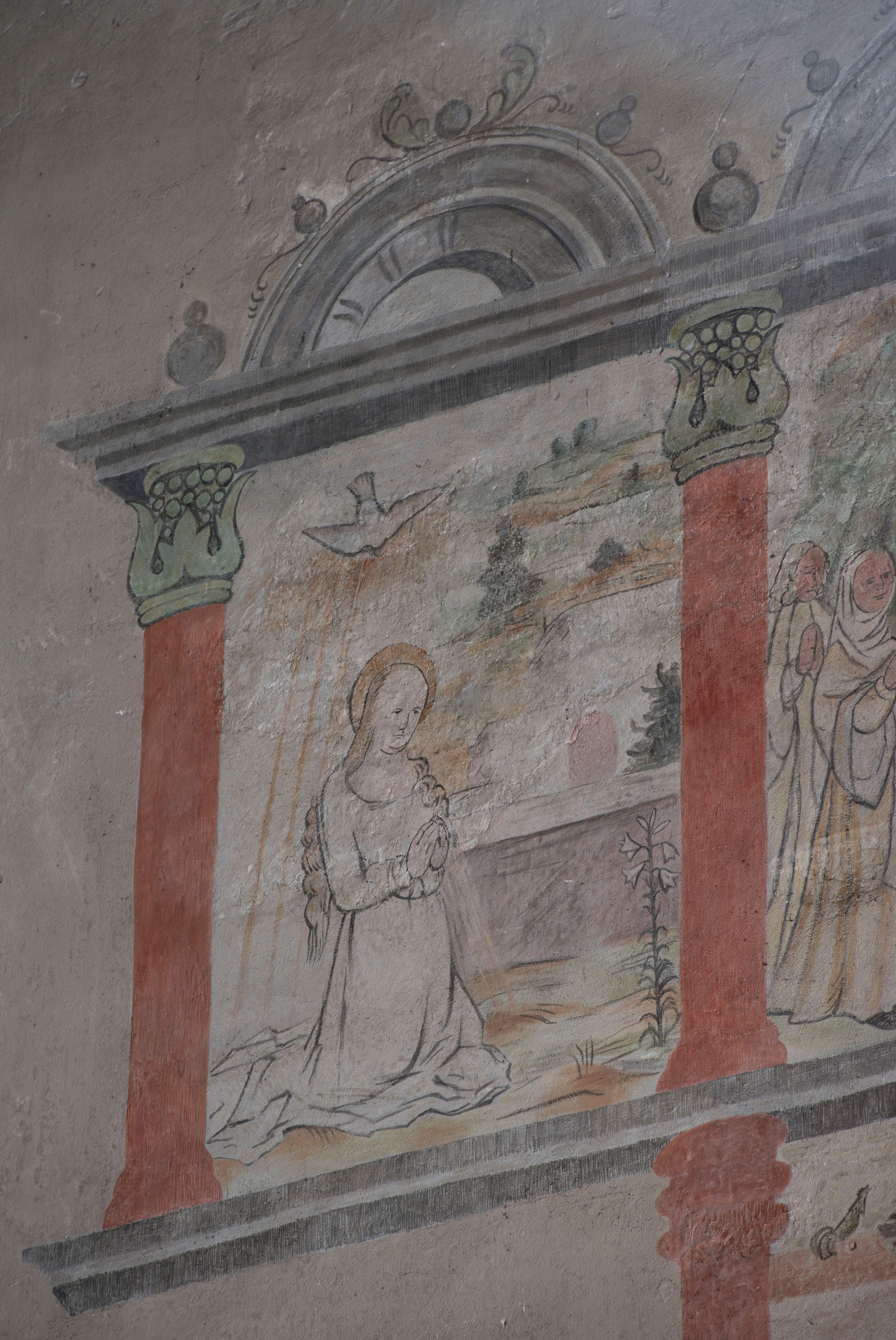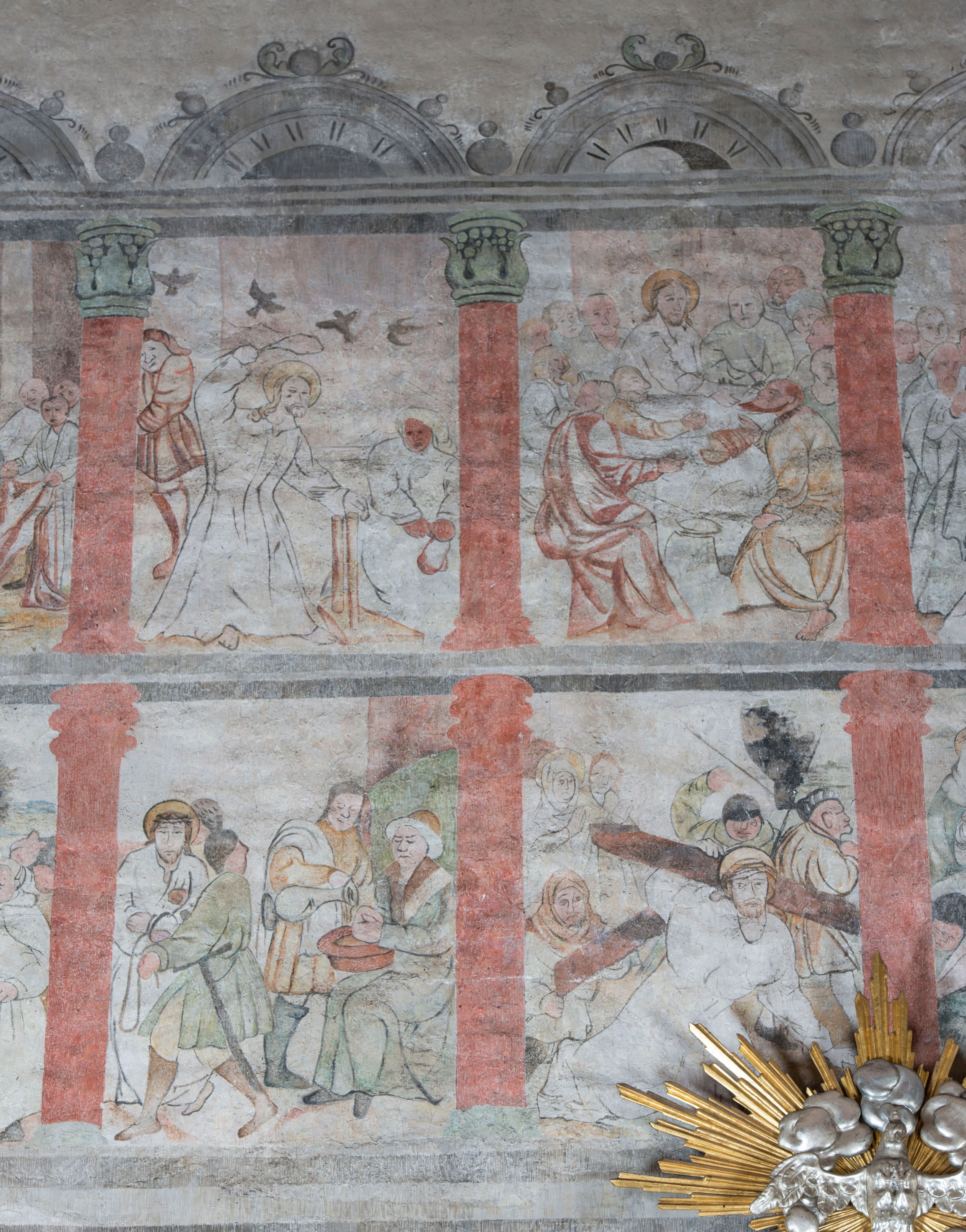 W górnej części ściany północnej nawy dwustrefowy cykl ze scenami z życia i męki Chrystusa. Sceny w iluzjonistycznych obramieniach, w dwóch pasach, utworzonych z szarych cokołów z czerwonymi kolumienkami wydzielającymi kwatery. Górny pas na każdej osi zwieńczony jest szarym, półkolistym tympanonem, dekorowanym ornamentem roślinnym. Sceny w górnym pasie, od lewej: Zwiastowanie, Małżeństwo Marii z Józefem, Pokłon trzech króli, Nauczanie, Wjazd do Jerozolimy, Wypędzenie przekupniów ze świątyni, Ostatnia Wieczerza, Umywanie nóg, Modlitwa w Ogrójcu, Pojmanie i pocałunek Judasza, Jezus u Annasza, Naigrywanie, Jezus przed Piłatem. Sceny w dolnym pasie, od lewej: Zaparcie się św. Piotra, Biczowanie, Judasz oddaje 30 srebrników, Ecce Homo, Umywanie rąk przez Piłata, Droga krzyżowa, Przybicie do krzyża, Ukrzyżowanie, Zdjęcie z krzyża, Złożenie do grobu, Zmartwychwstanie, Noli me tangere (?). Kompozycje scen wielofigurowe, ukazane na tle pejzażu, czasem z widoczną w tle architekturą. Postacie malowane w sposób uproszony i płaszczyznowy, obwiedzione są czarnym konturem, wypełnionym plamą barwną. Po lewej stronie ściany tęczowej przedstawienie Sądu Ostatecznego, częściowo przesłonięte przez ołtarz. W centrum postać tronującego Chrystusa, ukazanego frontalnie, z ugiętą i uniesioną prawą ręką w geście błogosławieństwa, obie stopy opiera na globie. Ubrany jest w czerwony płaszcz, obok jego głowy miecz. Ukazany jest pośród obłoków. Po jego lewej klęczący anioł z rękami złożonymi w geście modlitwy i nadlatujący anioł dmący w trąbę. W prezbiterium wszystkie wysklepki sklepienia pokryte są polichromią, tworzącą z wzoru lilii heraldycznych obramienia, których pola wypełnione są fantazyjną wicią roślinną z kwiatami i ptakami. Wokół otworów okiennych prezbiterium i nawy namalowane są obramienia utworzone z wici roślinnej o regularnie skręconych kwiatach. Otwór tęczowy po wewnętrznej stronie posiada malowidła przedstawiające wić roślinną z dużymi kielichami niebieskich kwiatów. W nawie głównej wzdłuż krawędzi otworu tęczowego namalowano wić roślinną skręconą wokół gałązki. W nawie fryz podstropowy wzdłuż trzech ścian (oprócz północnej), z przedstawieniem wici roślinnej z fantazyjnymi kwiatami i ptakami, o regularnym przebiegu.