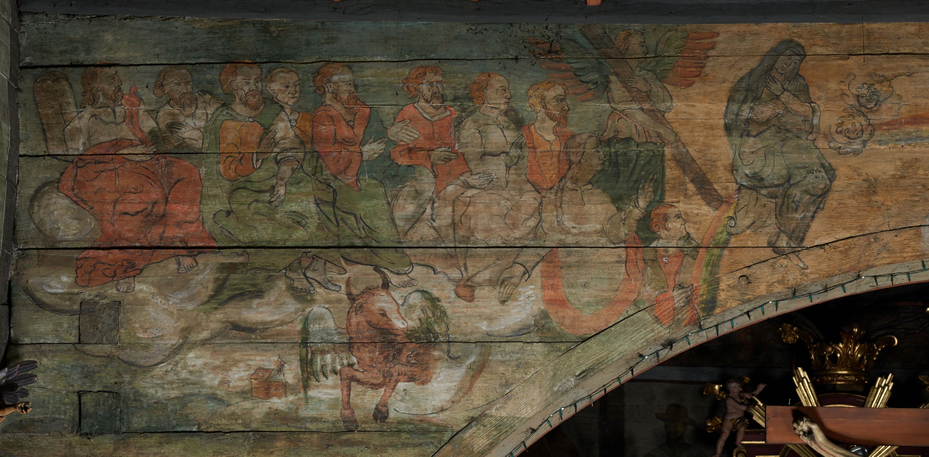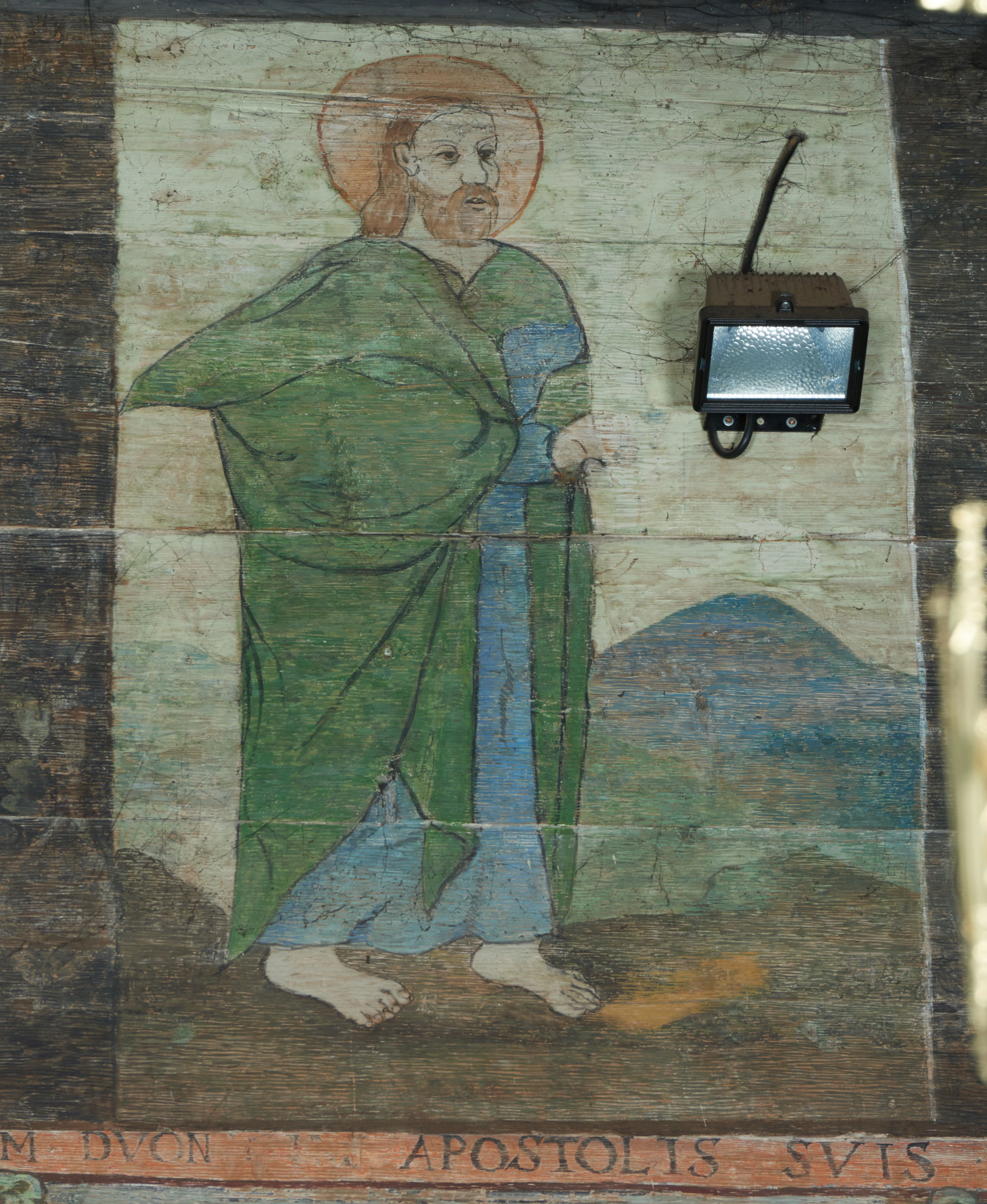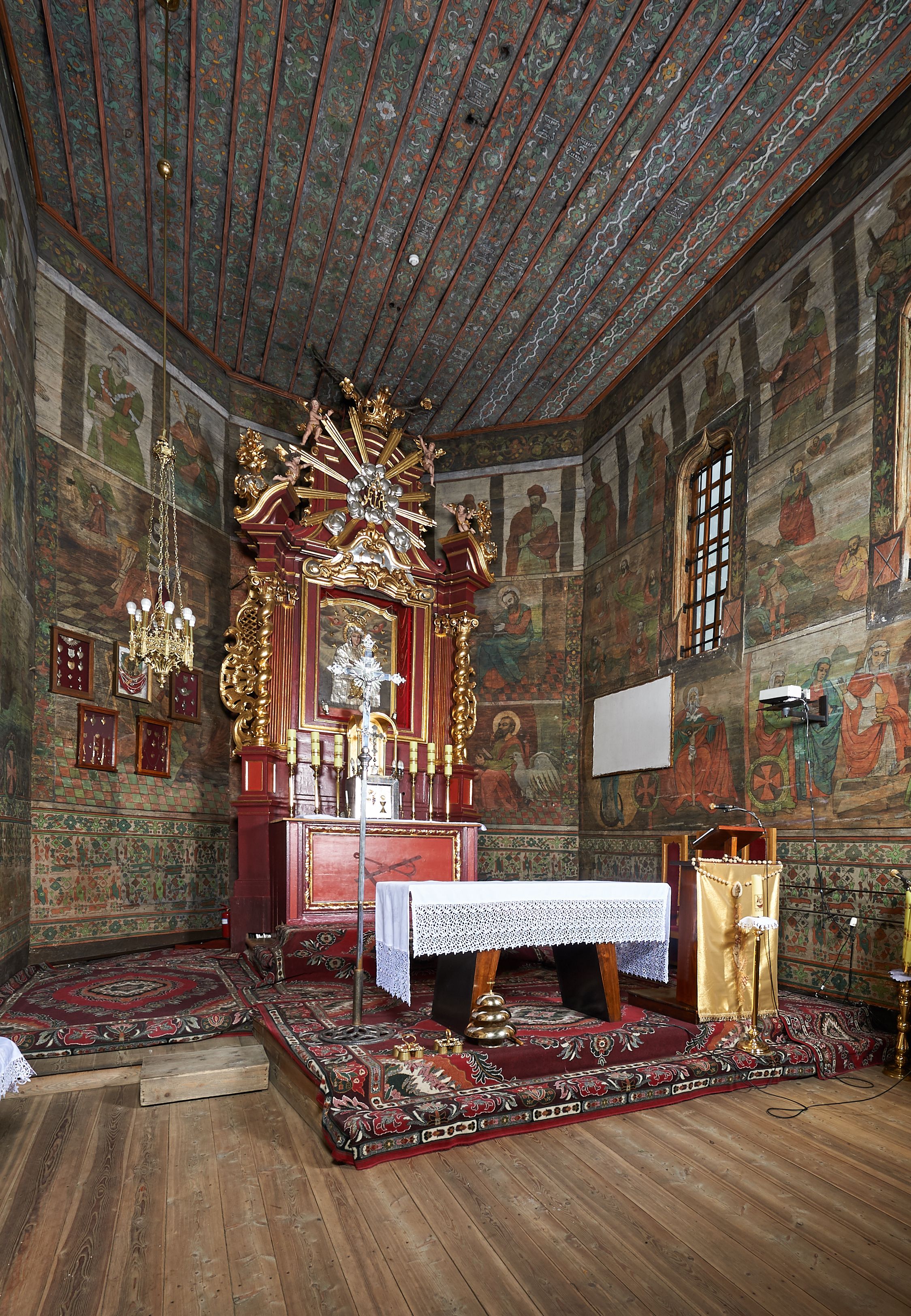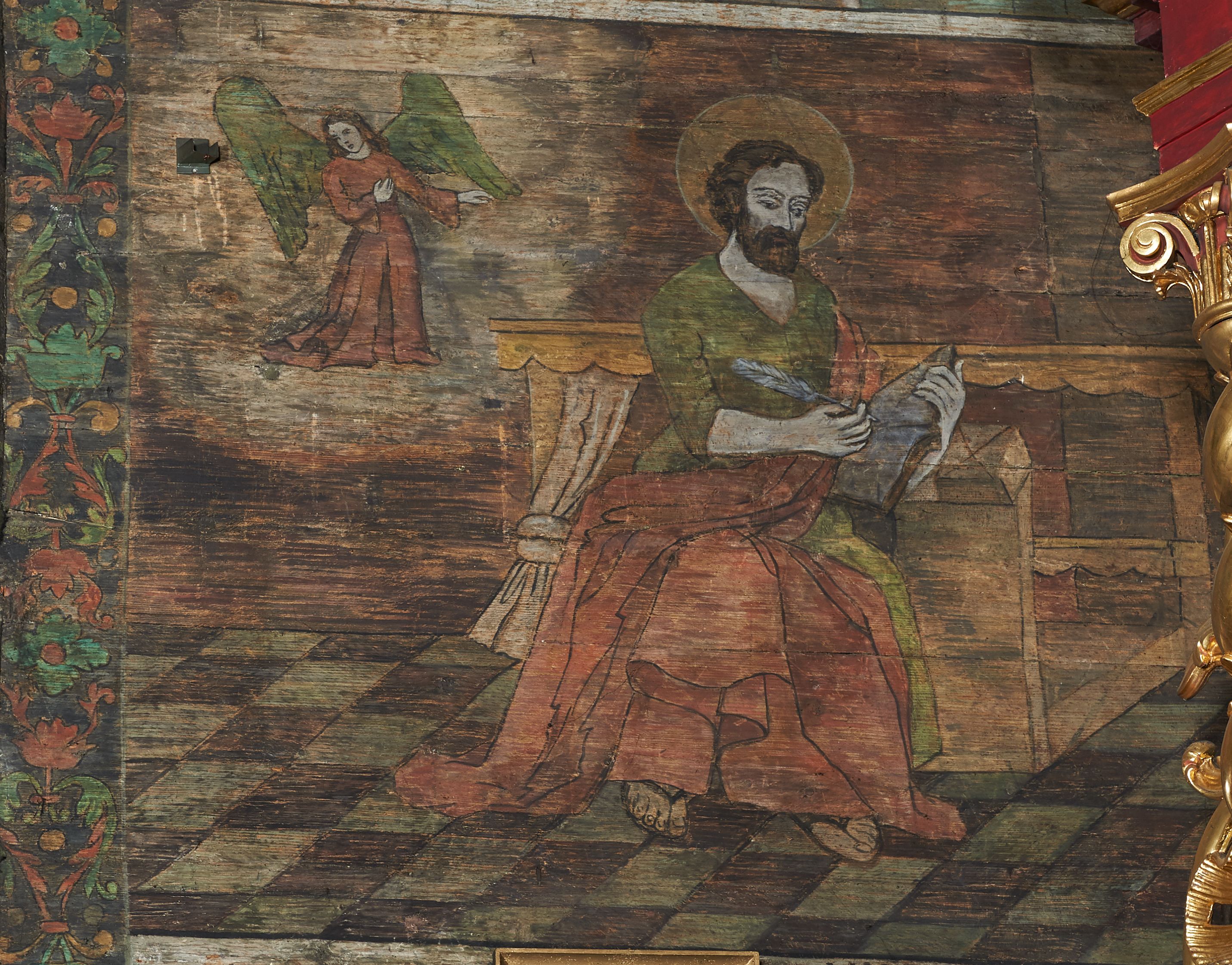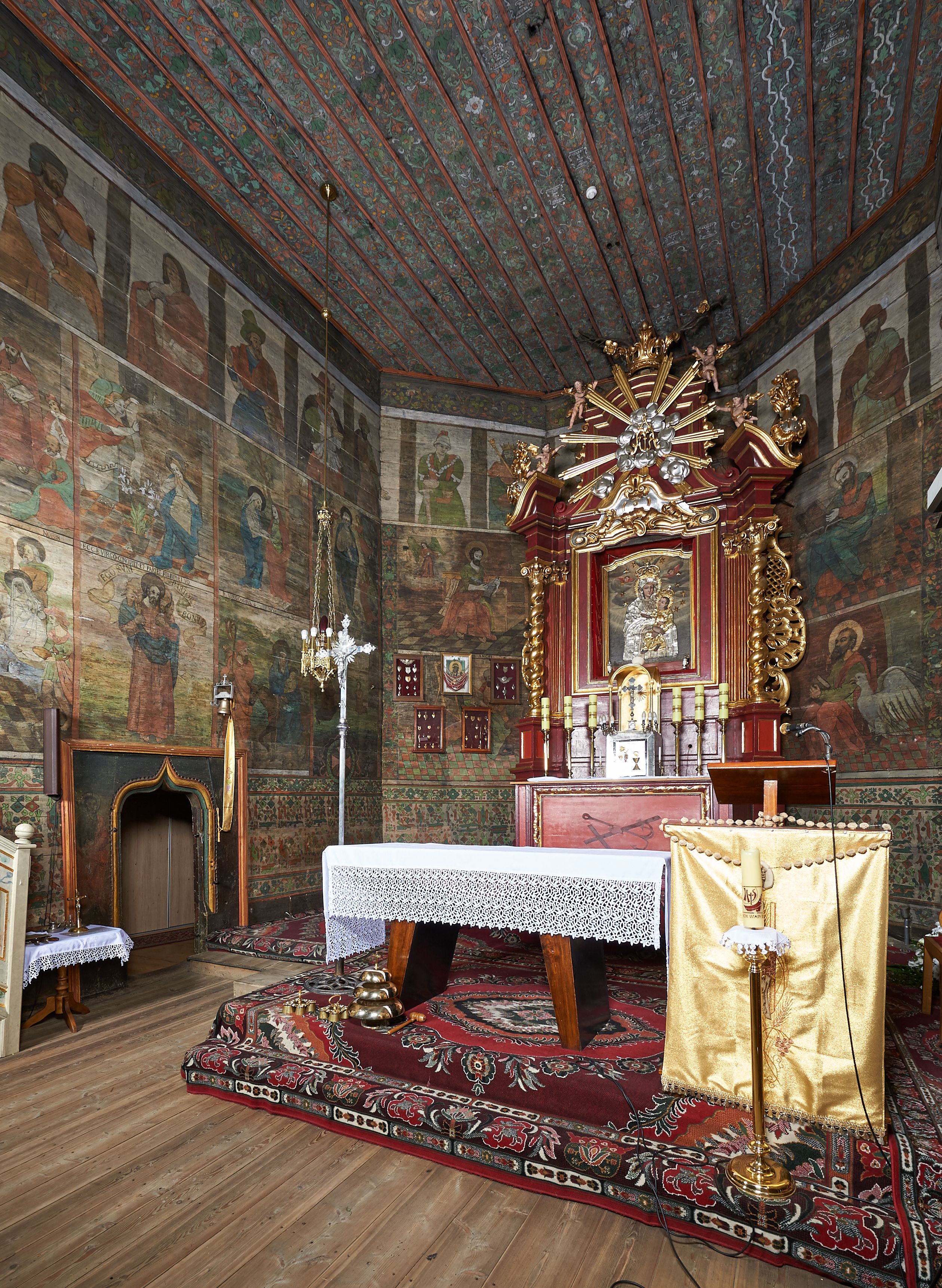 Stropy prezbiterium i korpusu nawowego, a także zaskrzynień (z wyjątkiem strony północnej, gdzie są ukazani Apostołowie), cokół w prezbiterium i korpusie pokrywa pasowa dekoracja ornamentalna umieszczona na czarnym tle. Ozdabia również obramowania okienne, a w prezbiterium tworzy fryz łączący ściany.