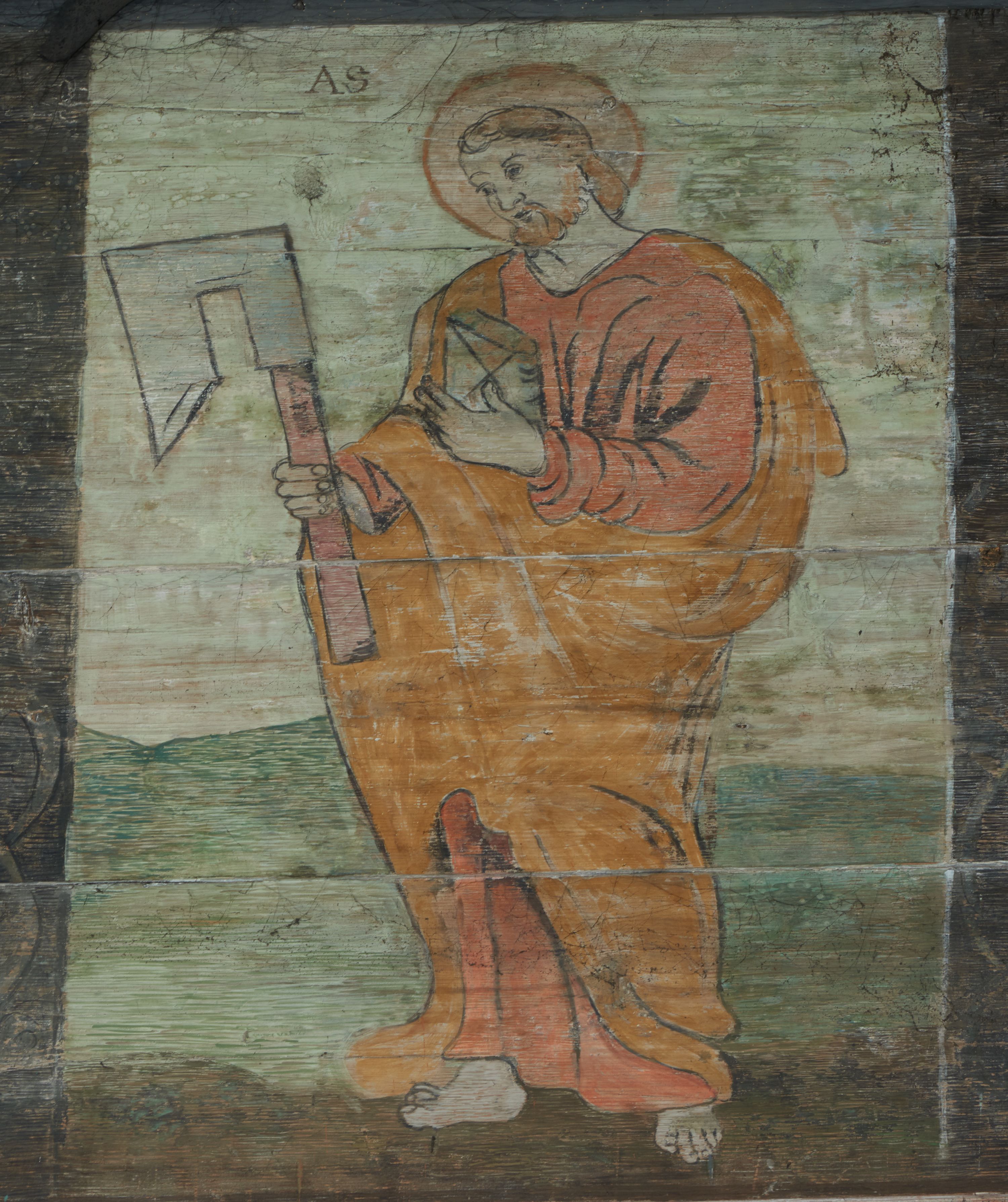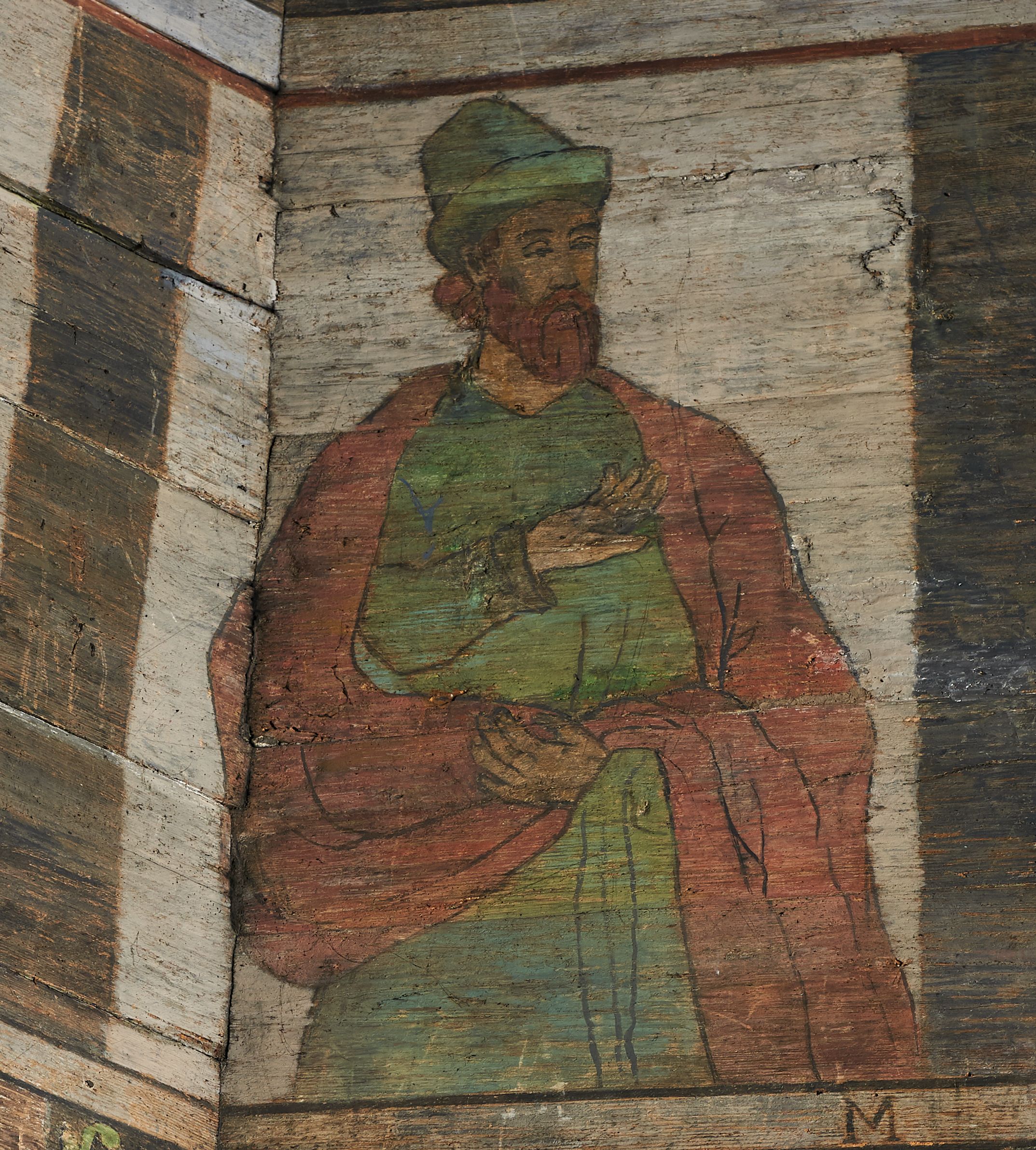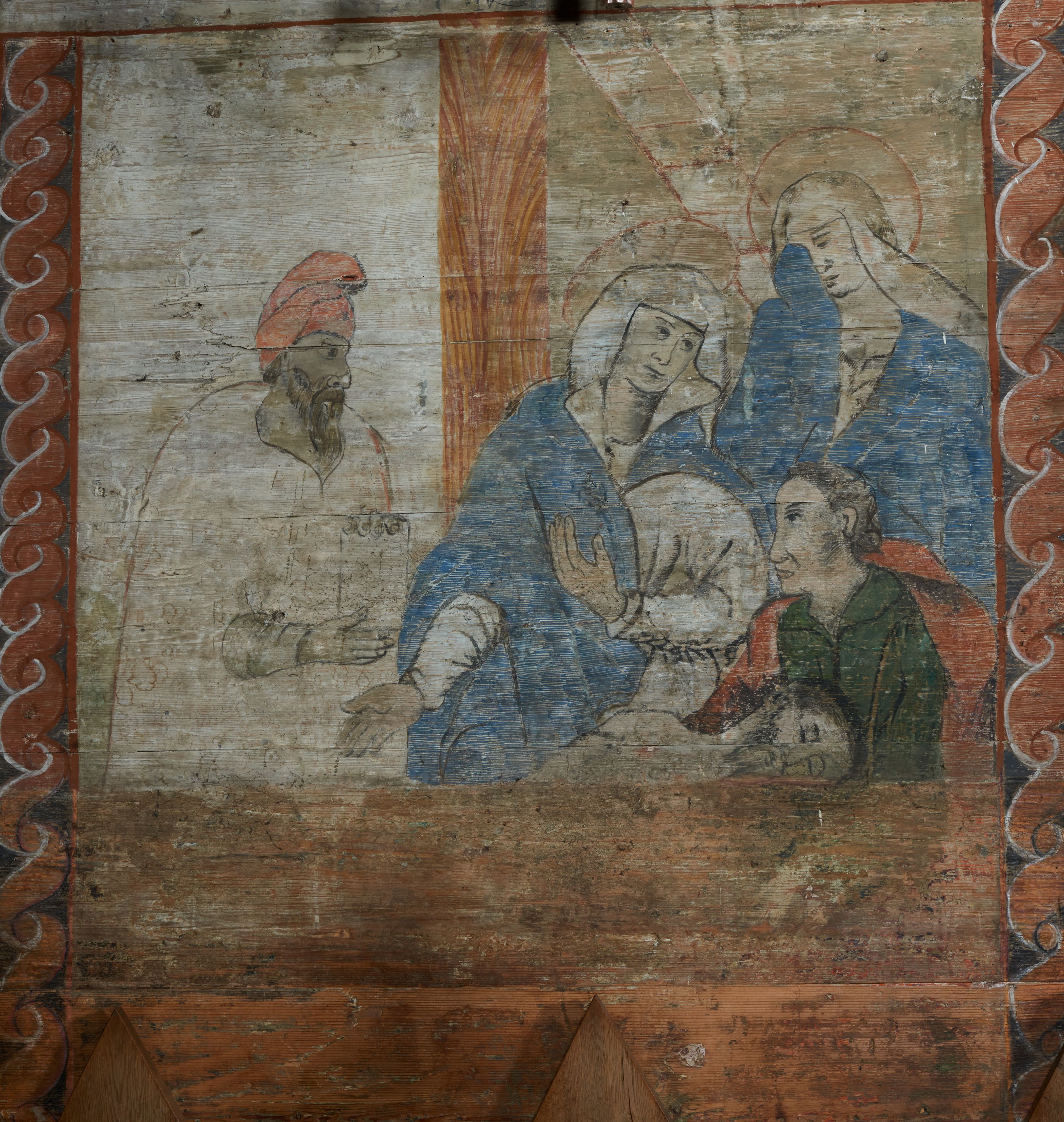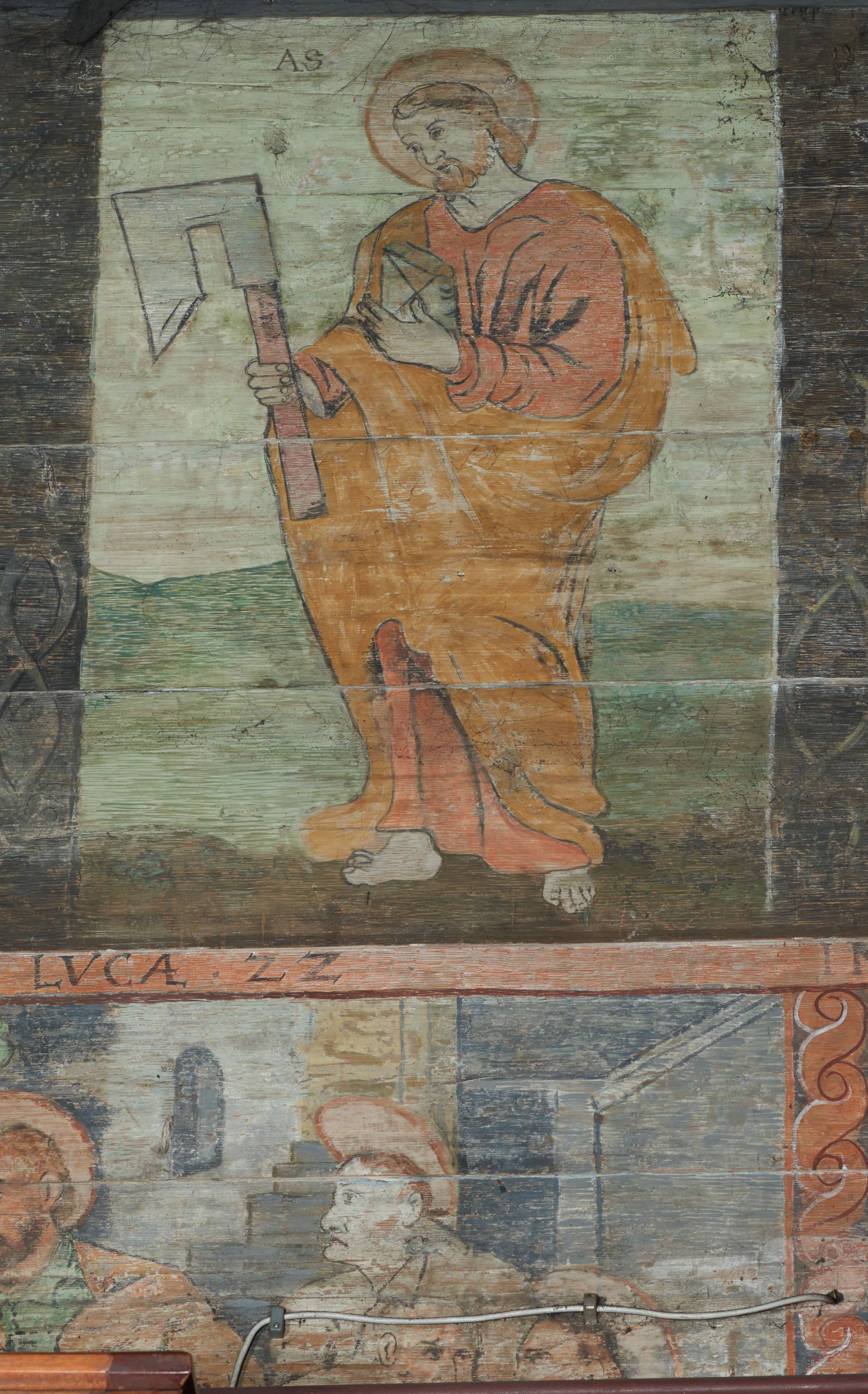 Stropy prezbiterium i korpusu nawowego, a także zaskrzynień (z wyjątkiem strony północnej, gdzie są ukazani Apostołowie), cokół w prezbiterium i korpusie pokrywa pasowa dekoracja ornamentalna umieszczona na czarnym tle. Ozdabia również obramowania okienne, a w prezbiterium tworzy fryz łączący ściany.