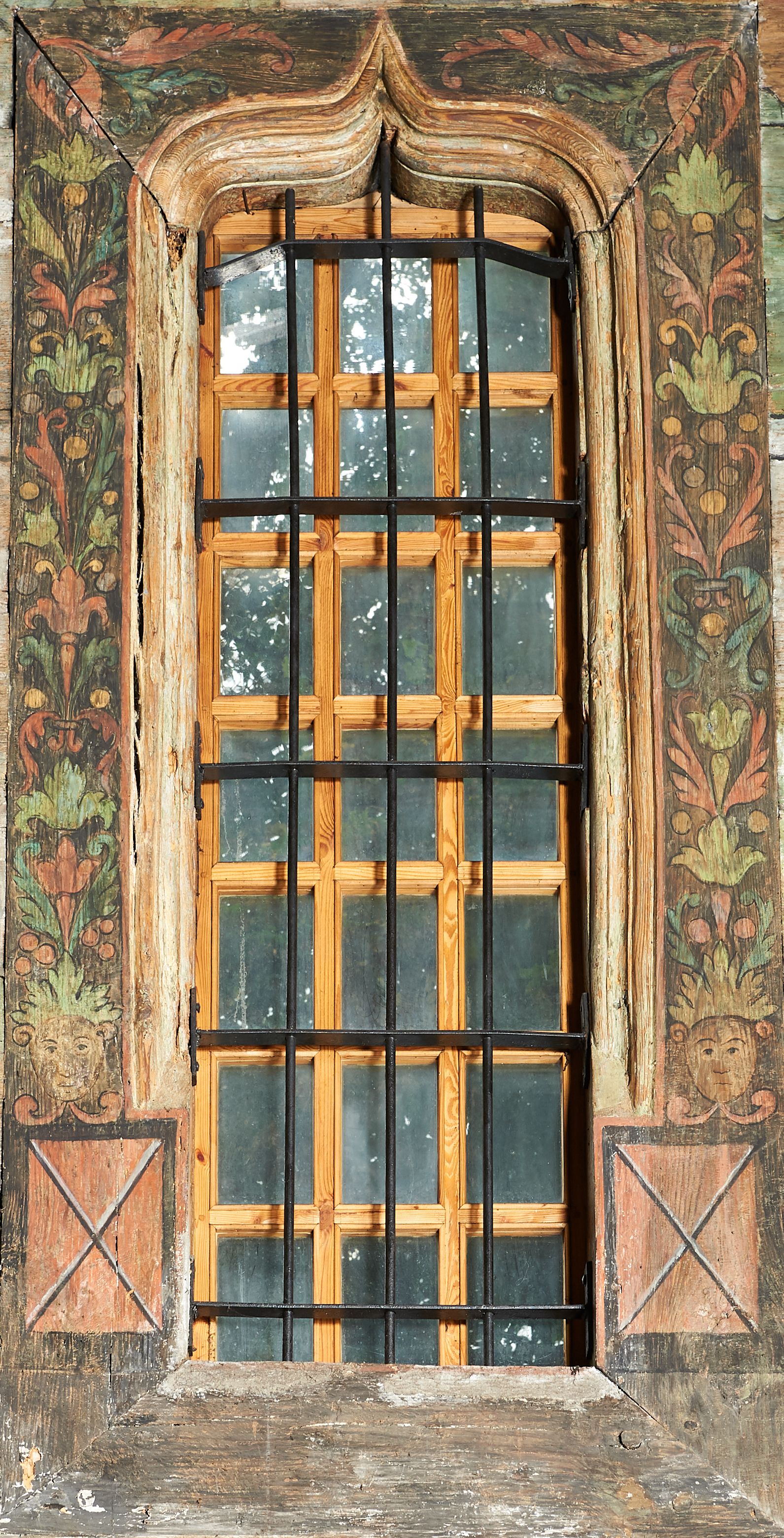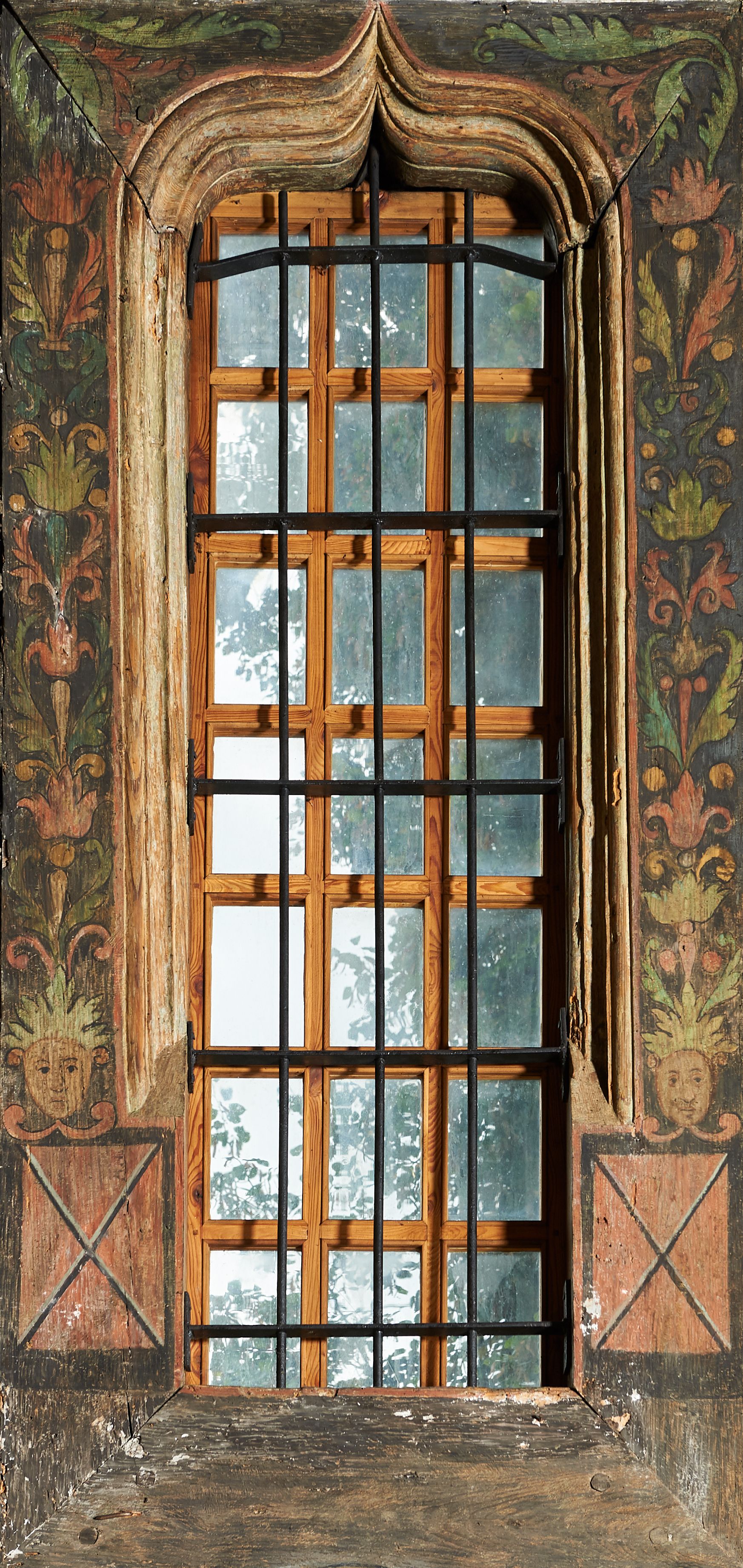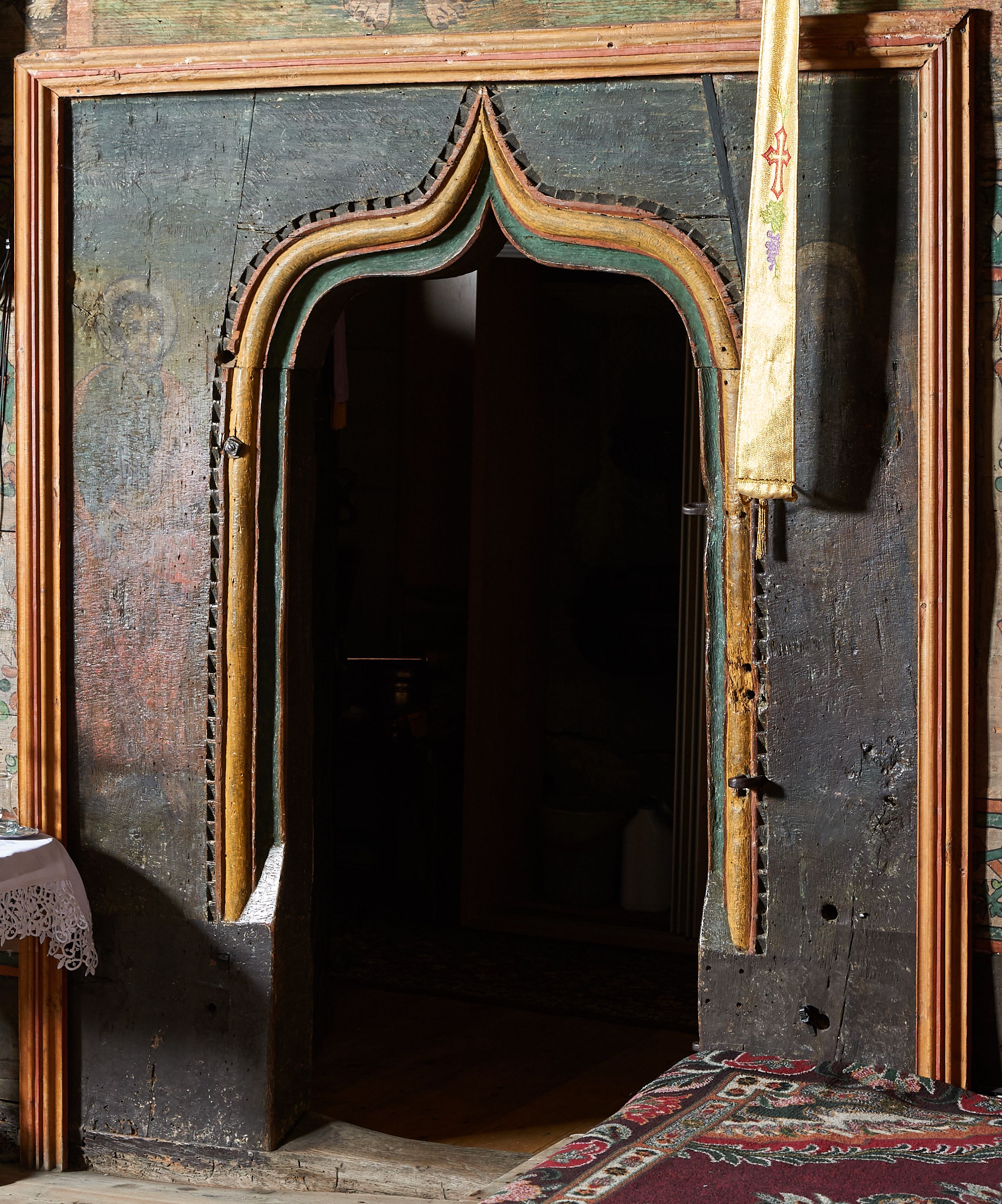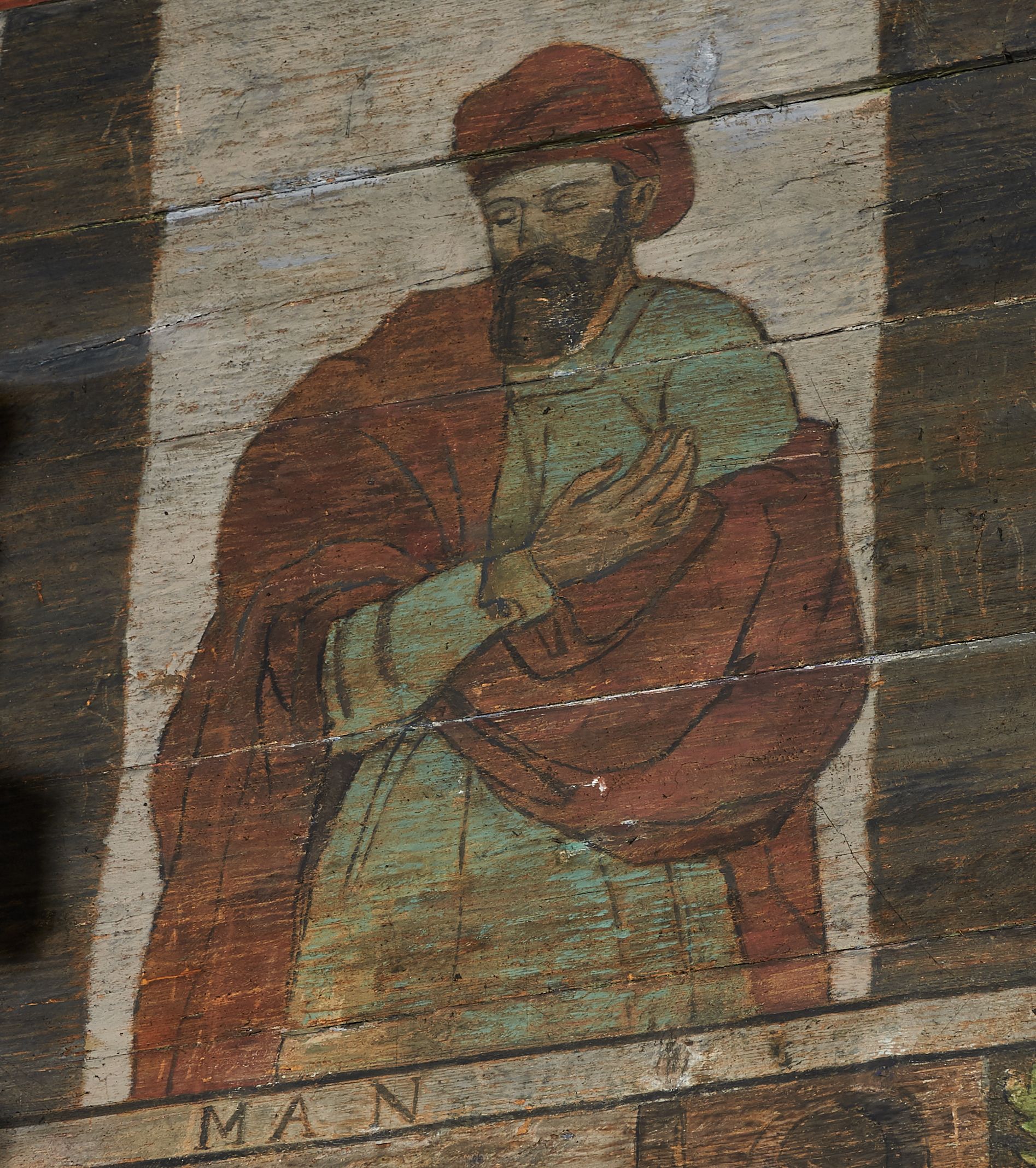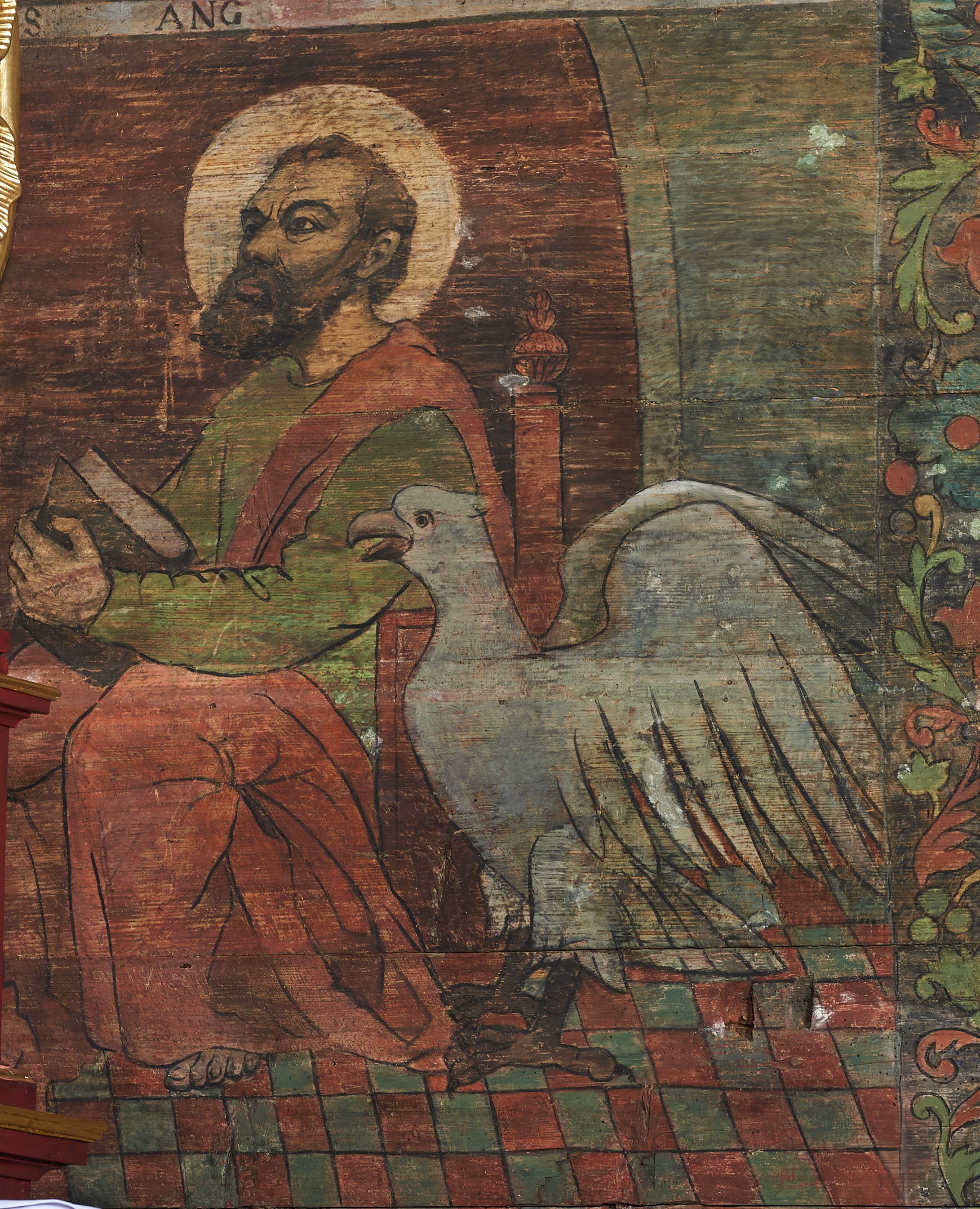 Stropy prezbiterium i korpusu nawowego, a także zaskrzynień (z wyjątkiem strony północnej, gdzie są ukazani Apostołowie), cokół w prezbiterium i korpusie pokrywa pasowa dekoracja ornamentalna umieszczona na czarnym tle. Ozdabia również obramowania okienne, a w prezbiterium tworzy fryz łączący ściany.